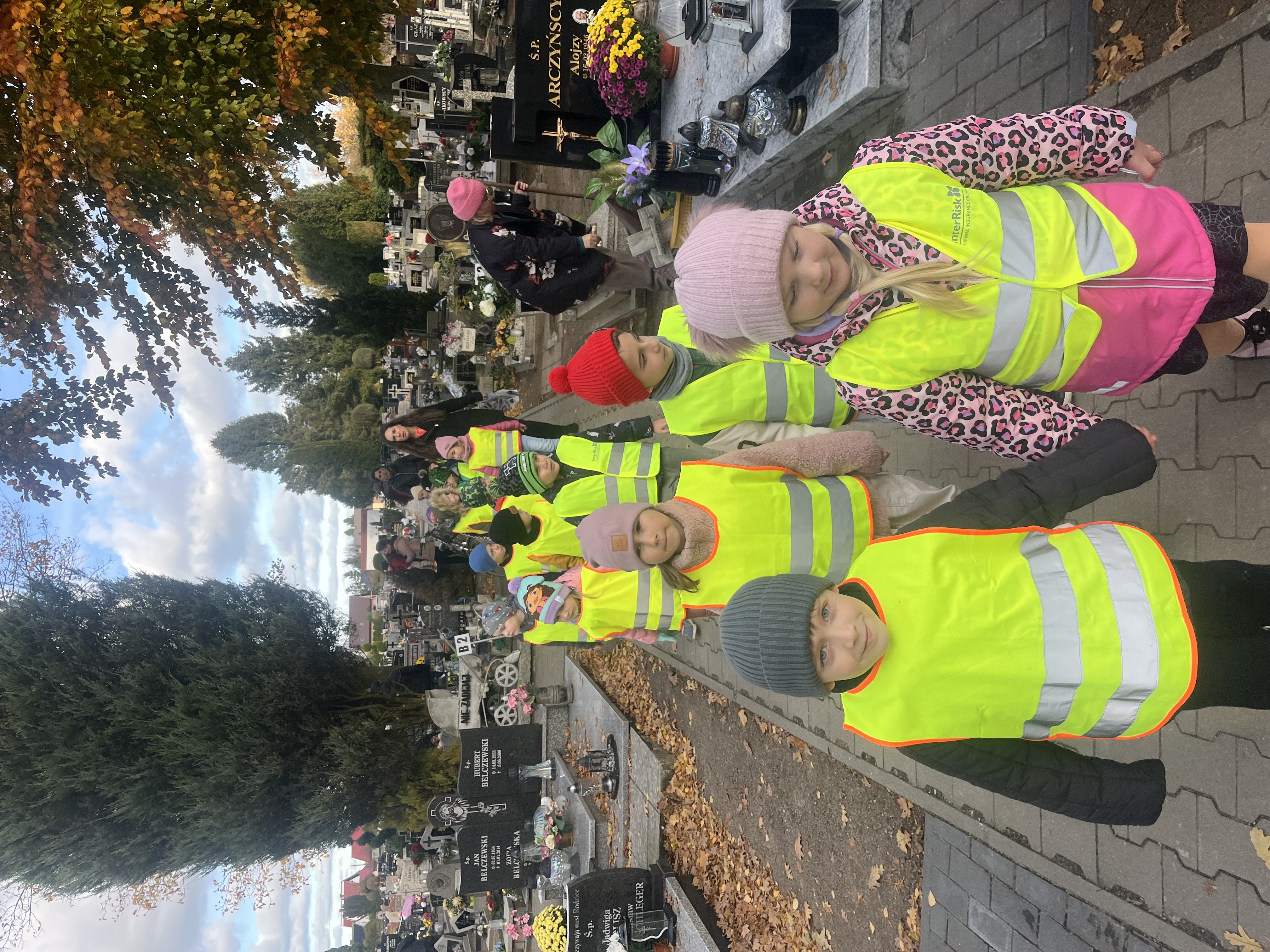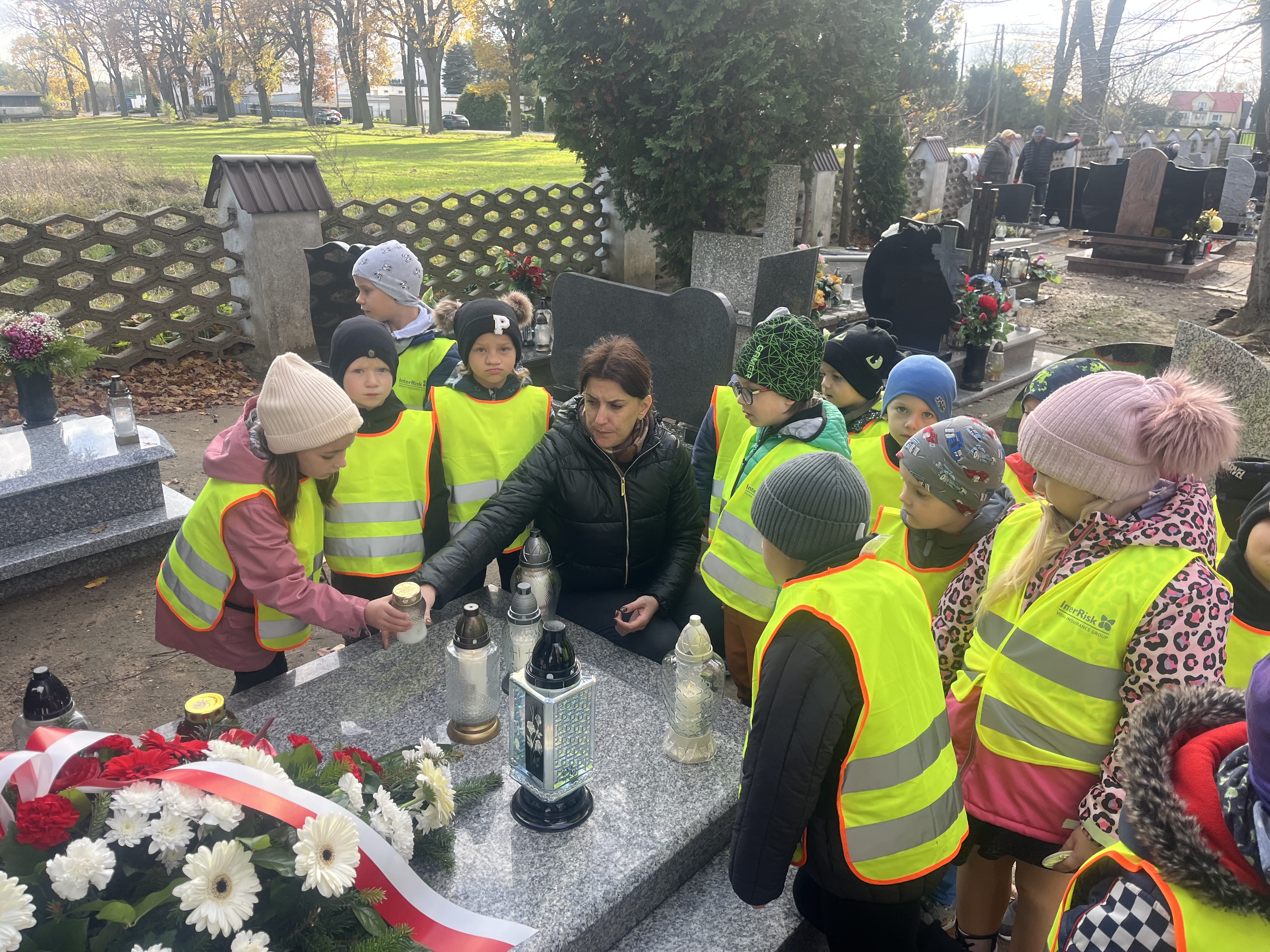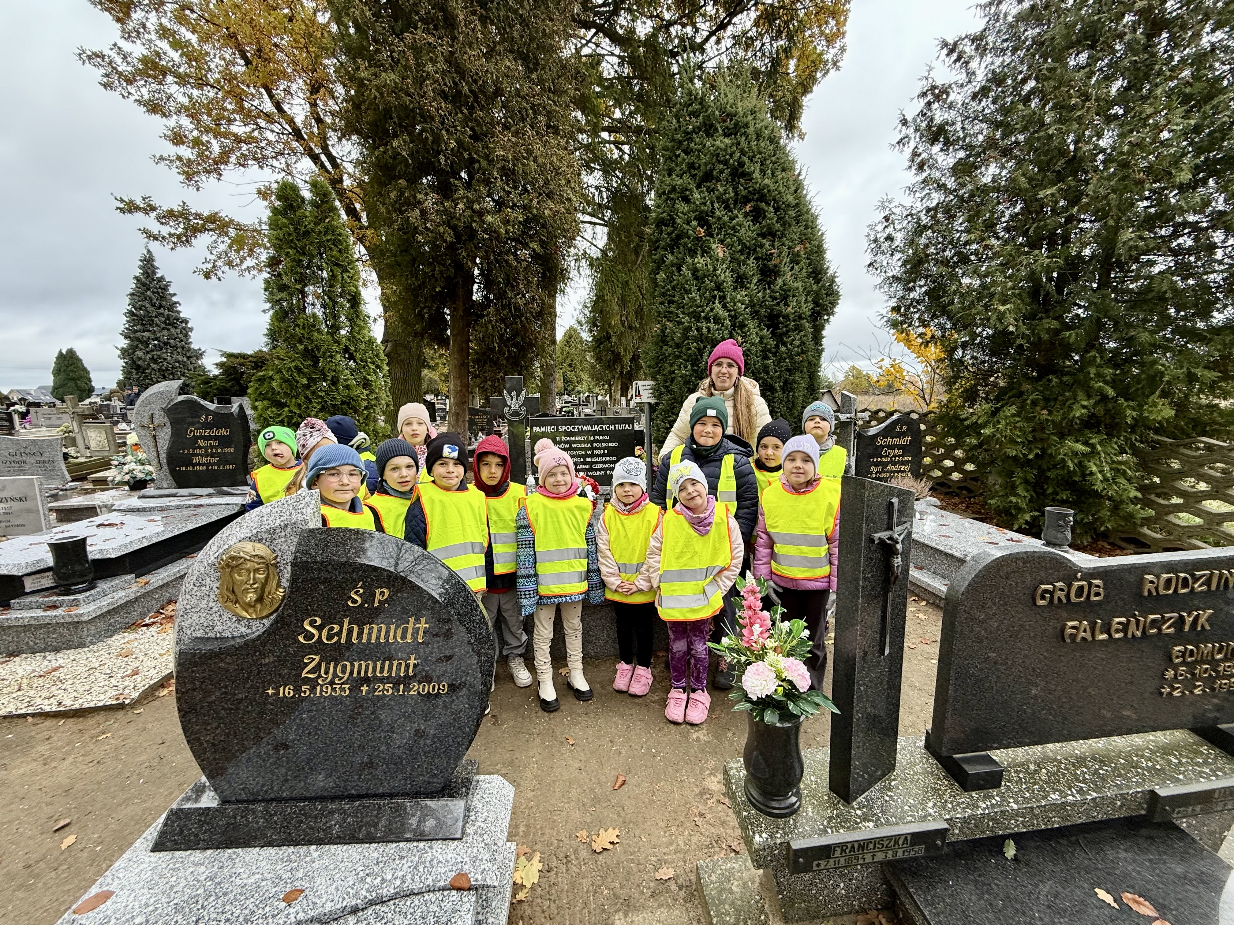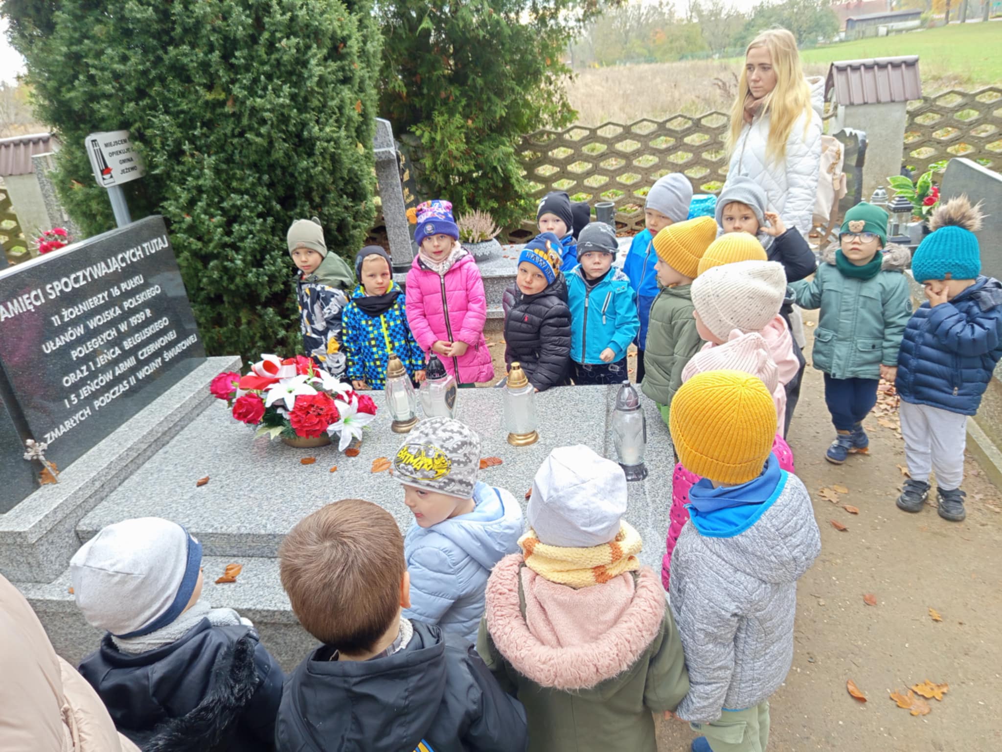 W tygodniu poprzedzającym dzień Wszystkich Świętych nasze przedszkolaki wybrały się na cmentarz parafialny, by w ciszy i zadumie zapalić znicze na grobie poległych żołnierzy. Dzieci z wielką powagą słuchały krótkiej opowieści o odwadze tych, którzy walczyli o naszą wolność. Choć były to krótkie wizyty, pozostawiły w małych sercach wiele refleksji. To ważne chwile, które uczą, że pamięć o przeszłości jest częścią naszej tożsamości.