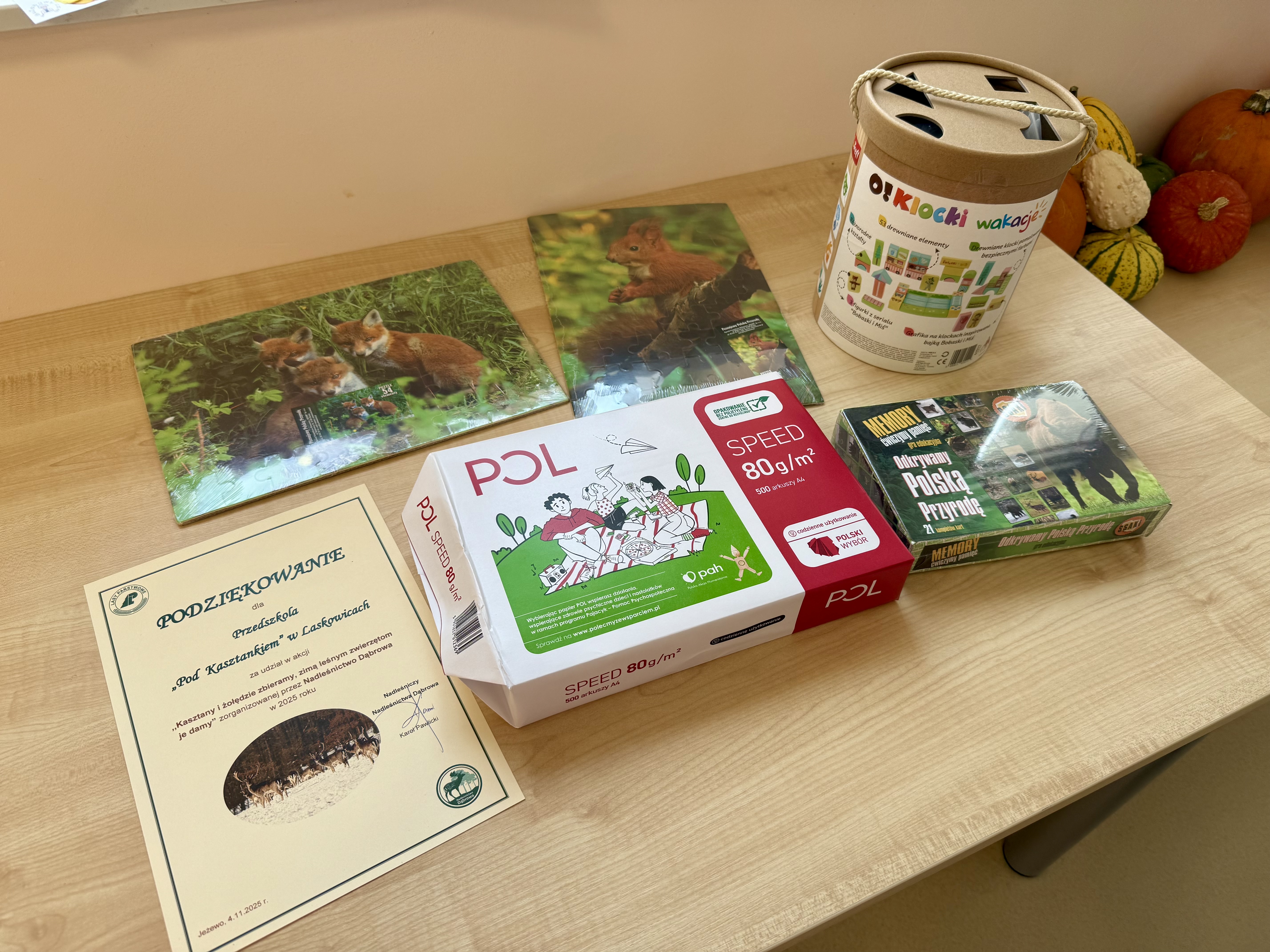 Dzięki wspólnemu wysiłkowi udało nam się zebrać aż 278 kilogramów kasztanów! To naprawdę imponujący wynik, który tej zimy pomoże wielu mieszkańcom lasu. W uznaniu za wkład i zaangażowanie w pomoc przyrodzie nasze przedszkole otrzymało podziękowanie od Nadleśnictwa Dąbrowa oraz zestaw upominków edukacyjnych, które wzbogacą nasze zabawy i zajęcia.