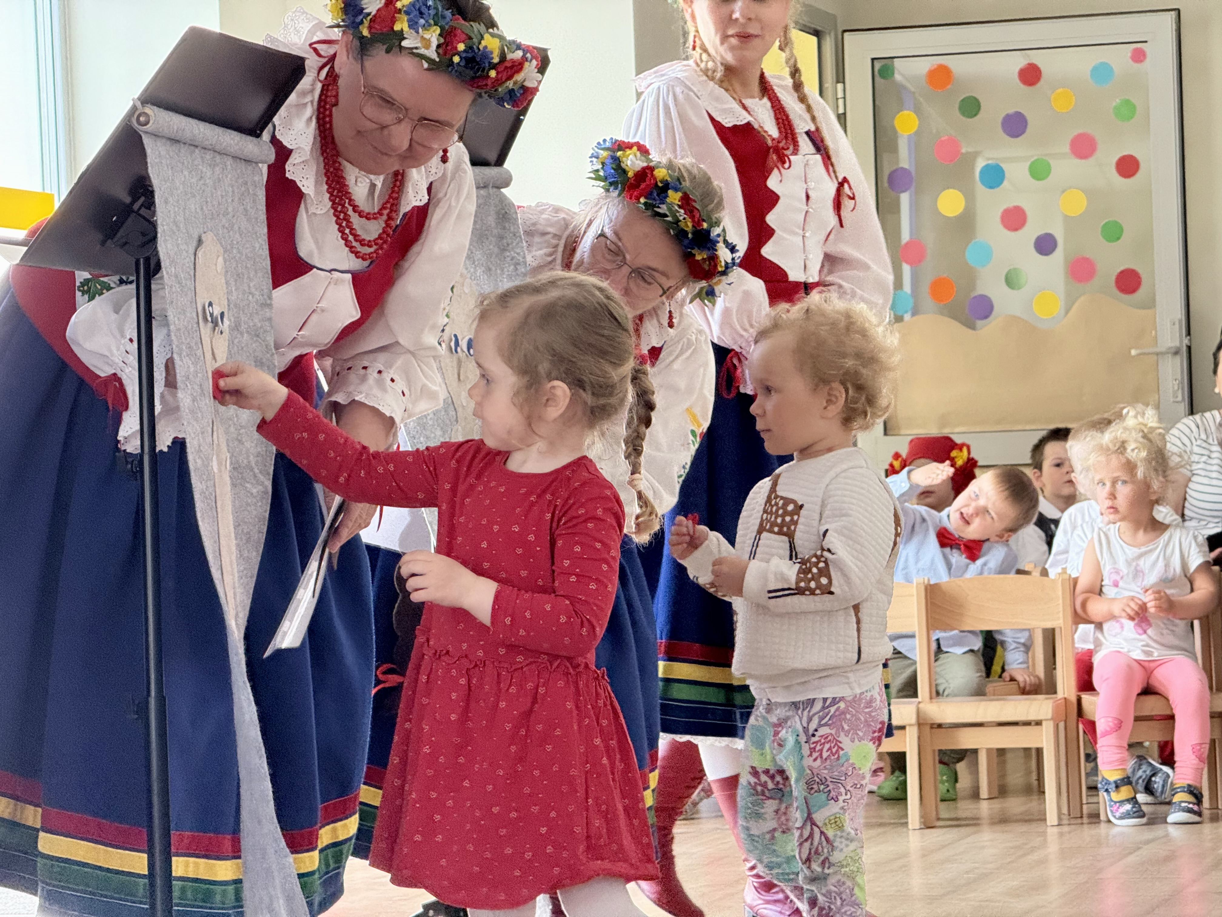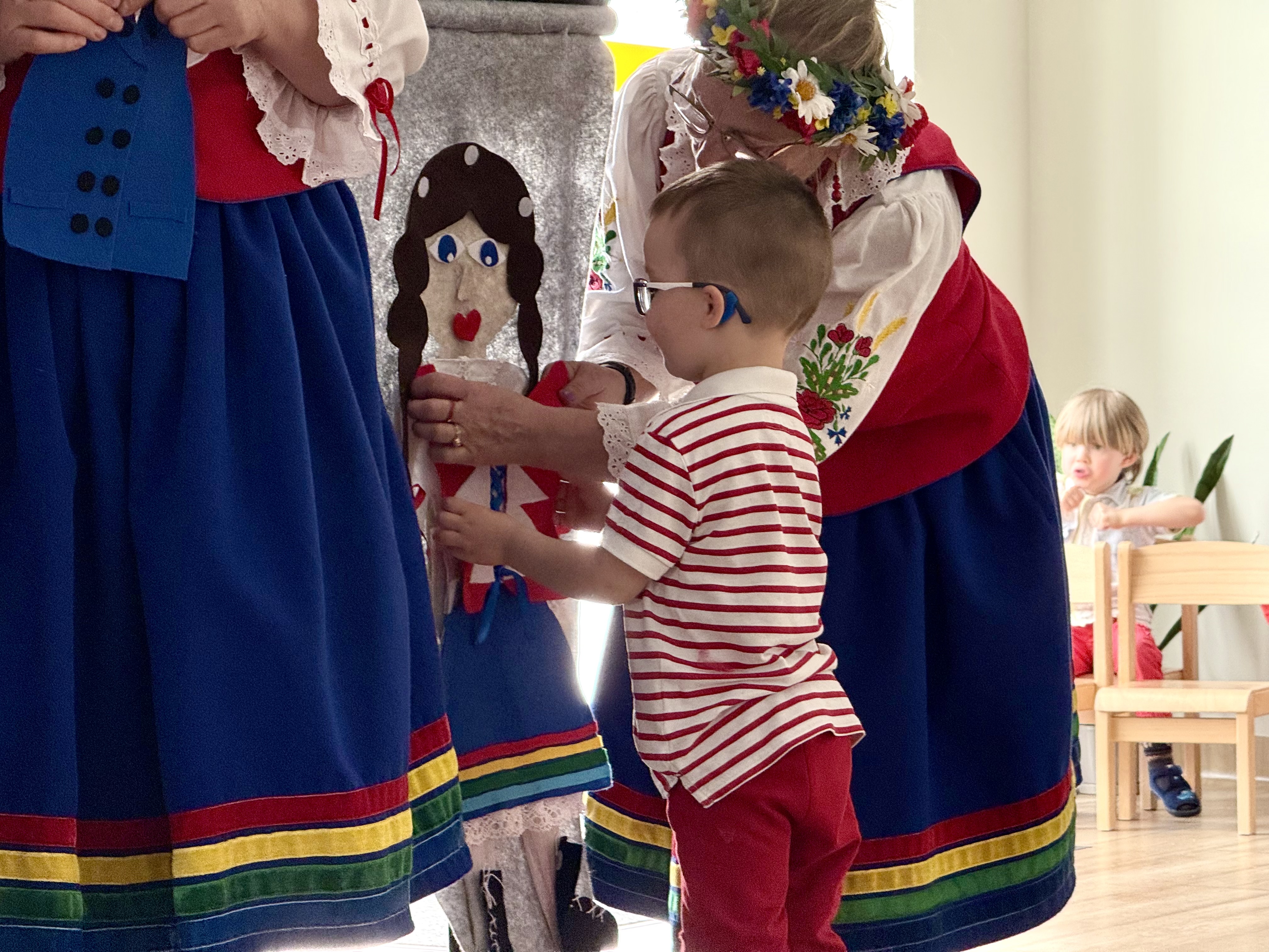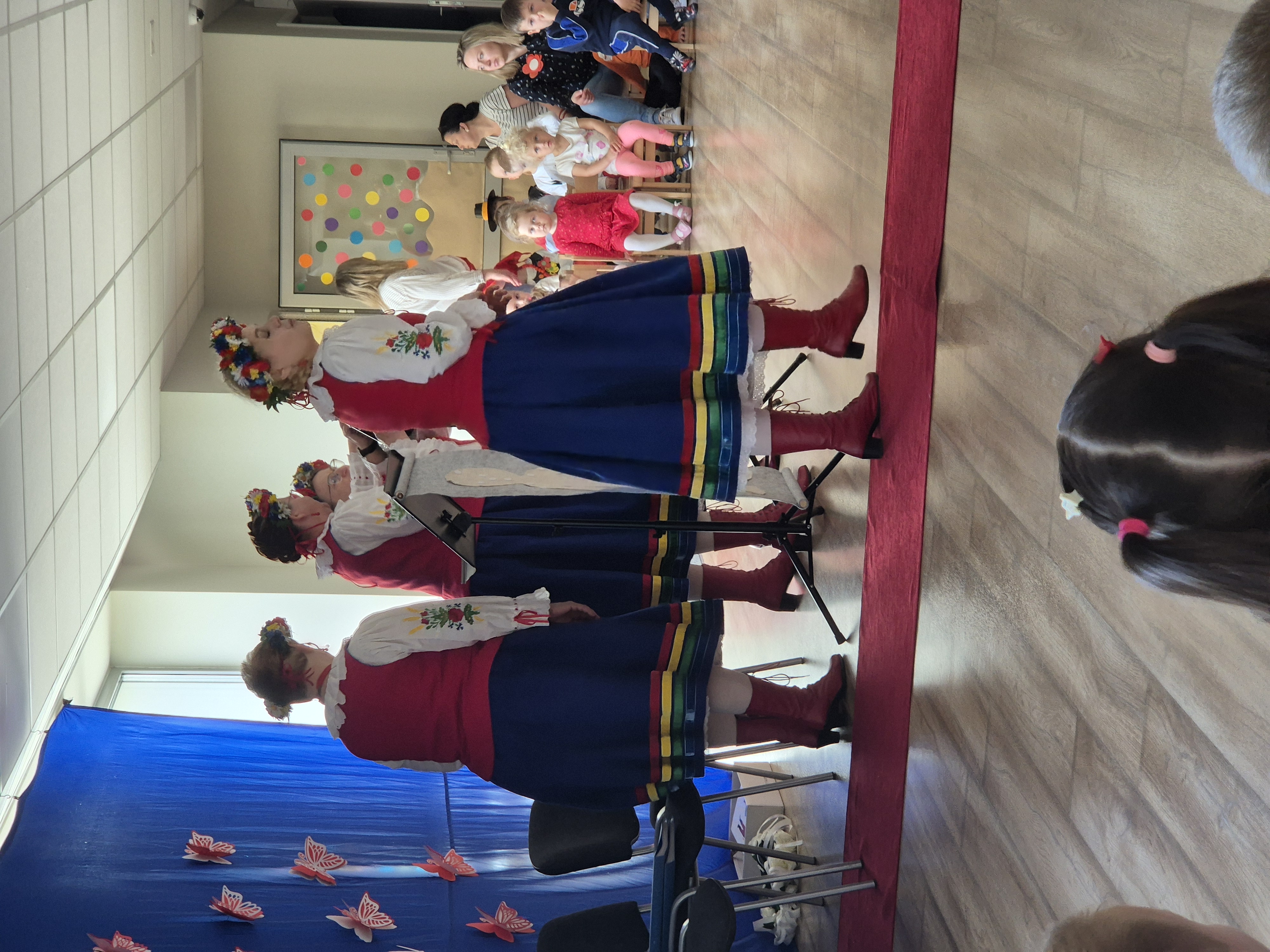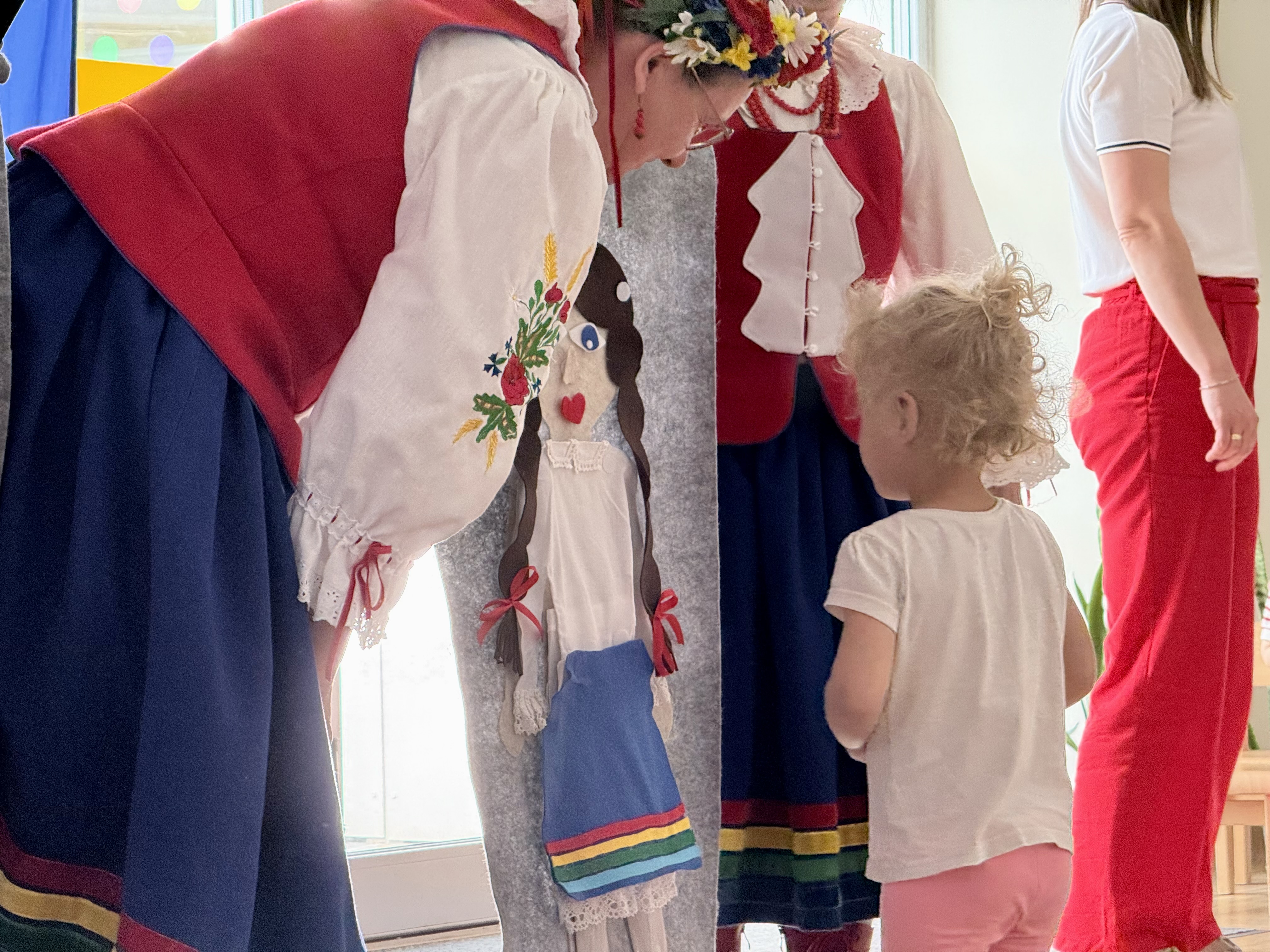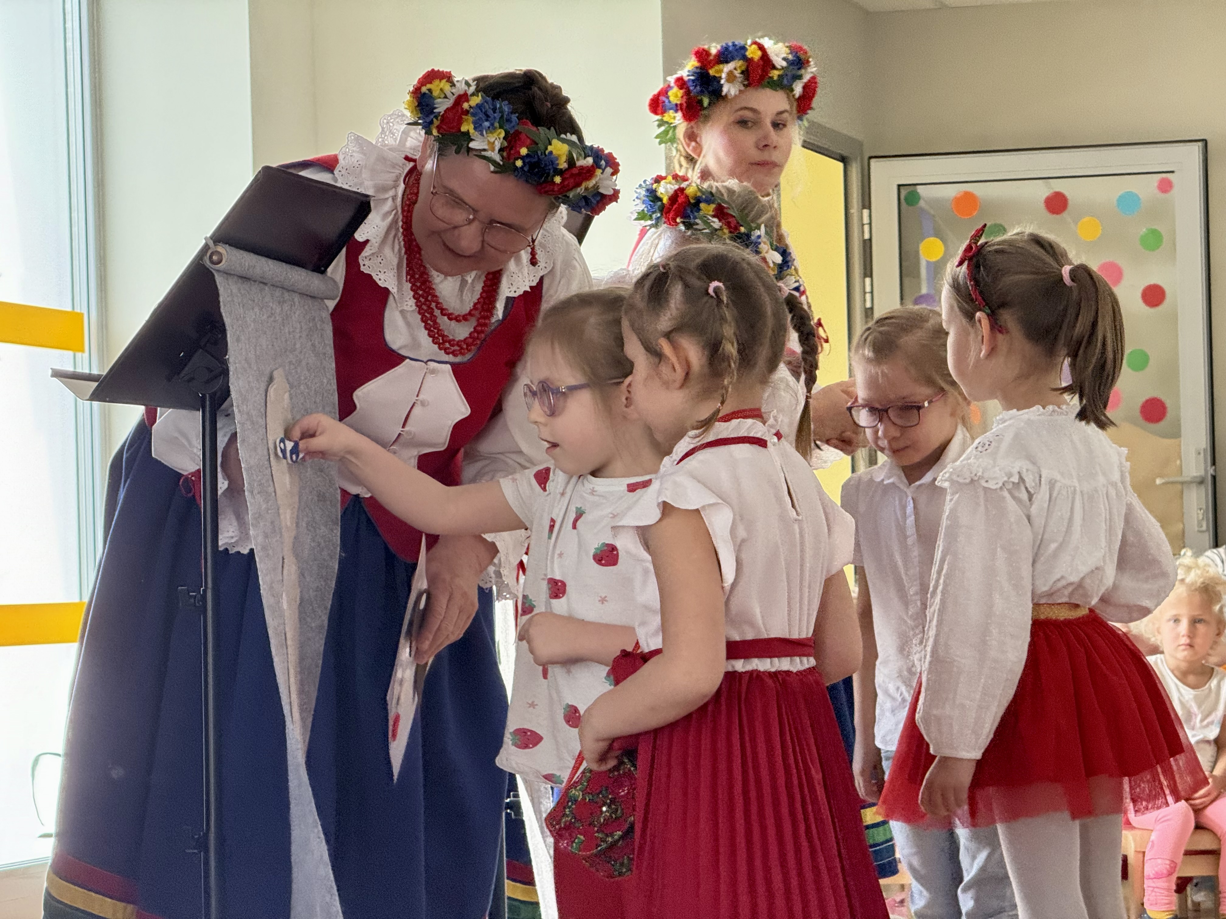 30 kwietnia 2025 r. – z okazji zbliżających się patriotycznych świąt majowych – nasze przedszkole miało zaszczyt gościć Zespół Pieśni i Tańca "Kociewianki”. Panie z zespołu wprowadziły dzieci w magiczny świat muzyki ludowej, prezentując dwa piękne utwory. Następnie, za pomocą filcowych laleczek, przybliżyły maluchom budowę tradycyjnego stroju kociewskiego (zarówno damskiego, jak i męskiego), tłumacząc szczegółowo nazewnictwo poszczególnych elementów odzieży.