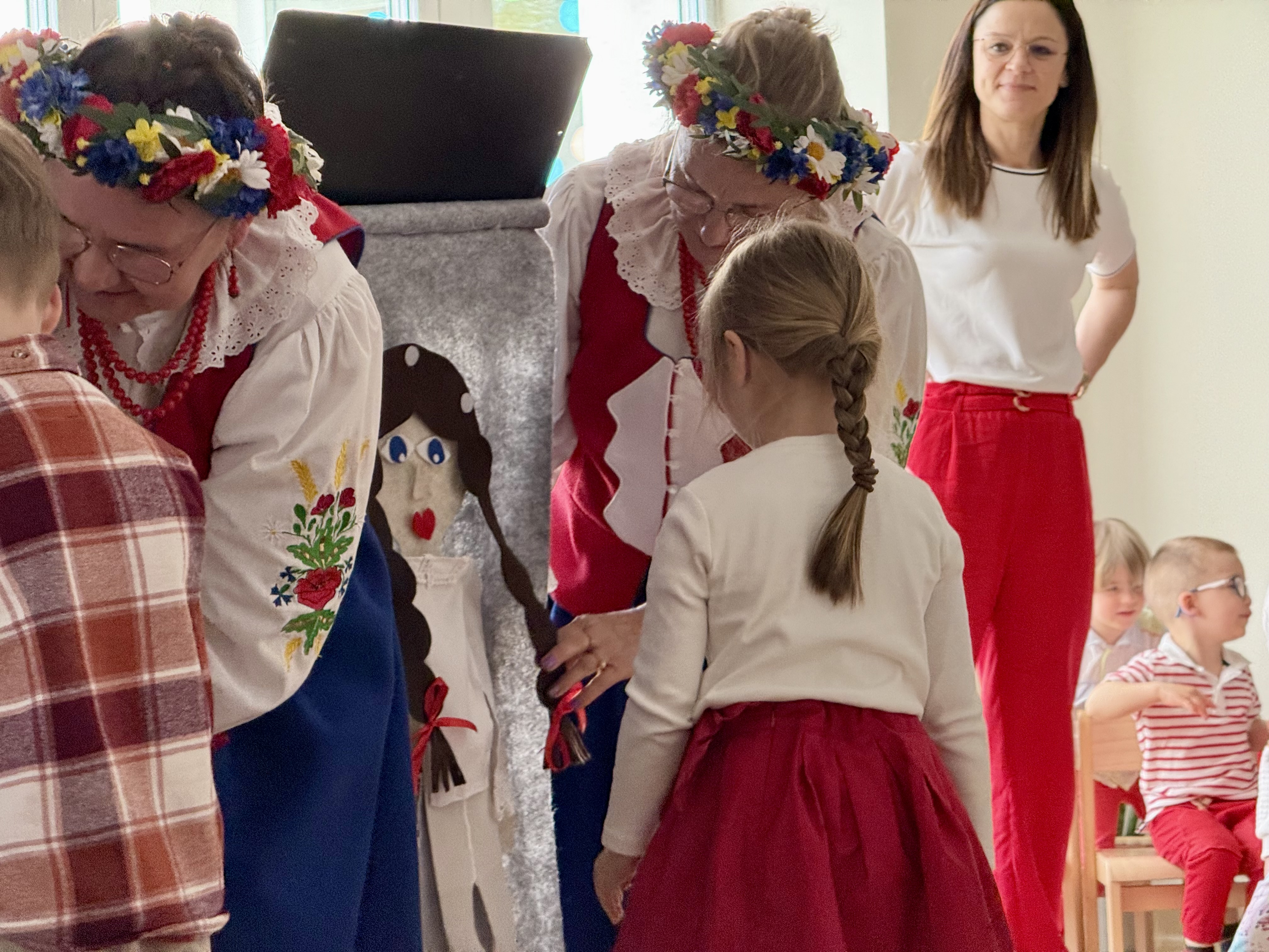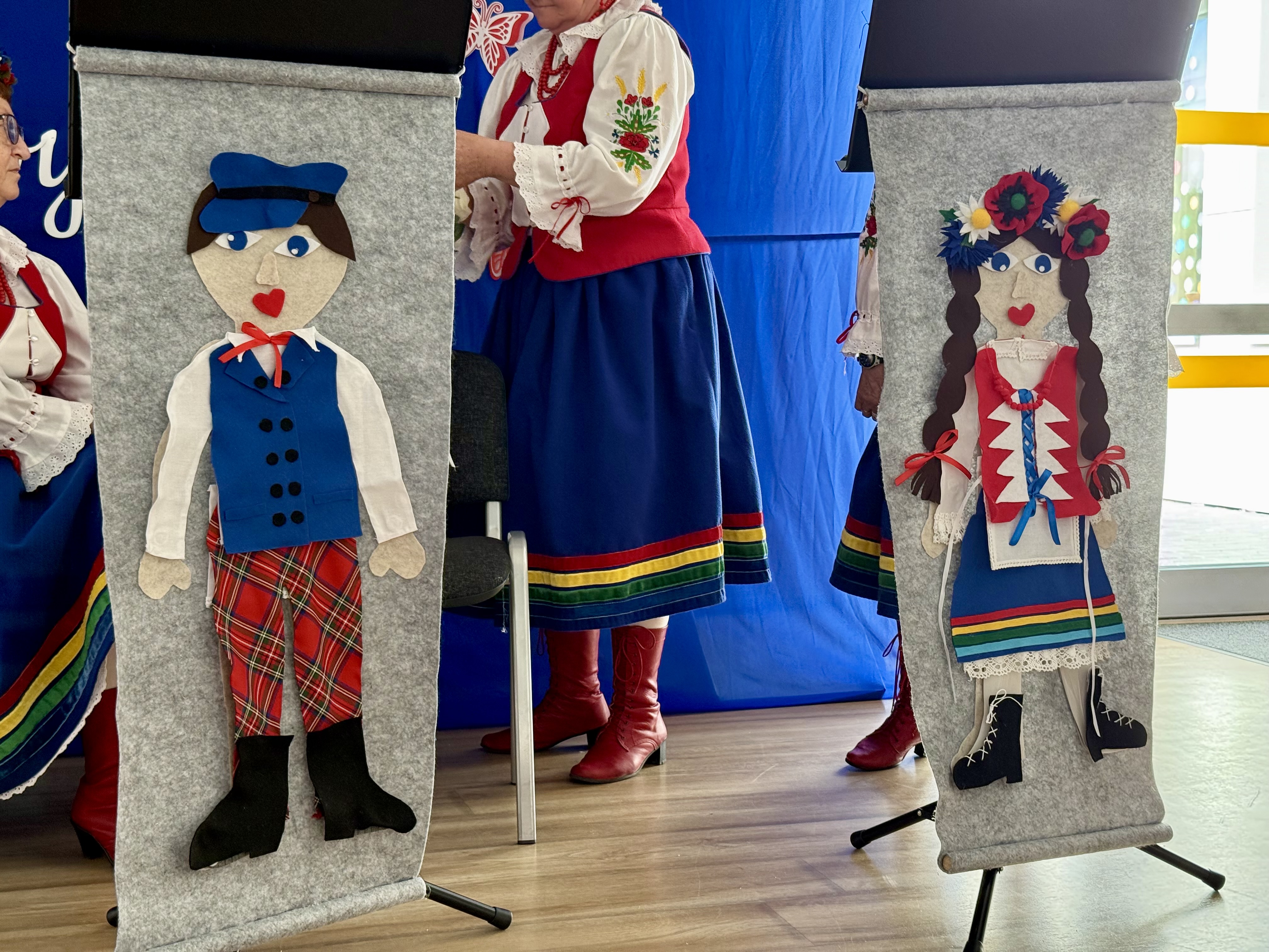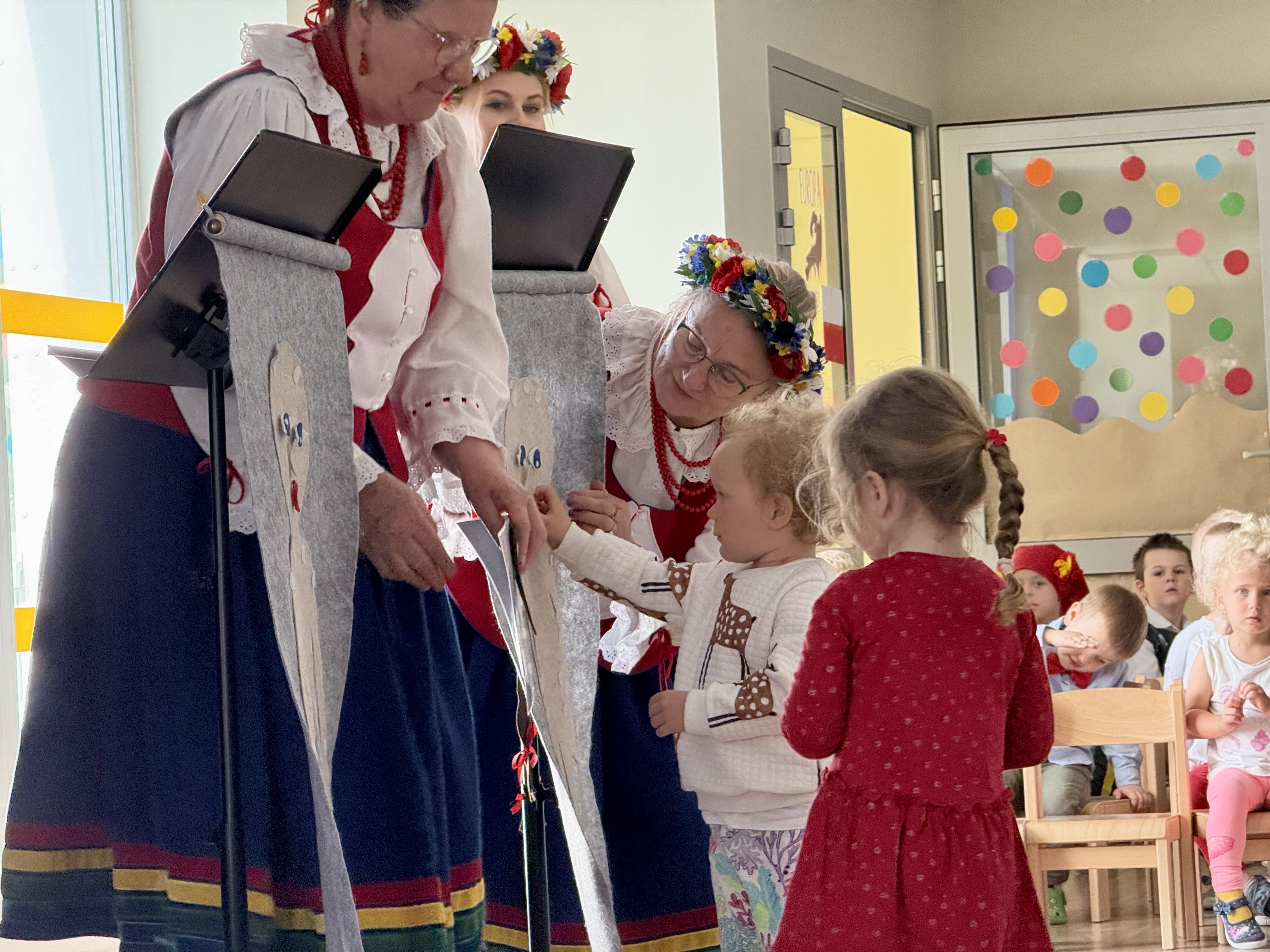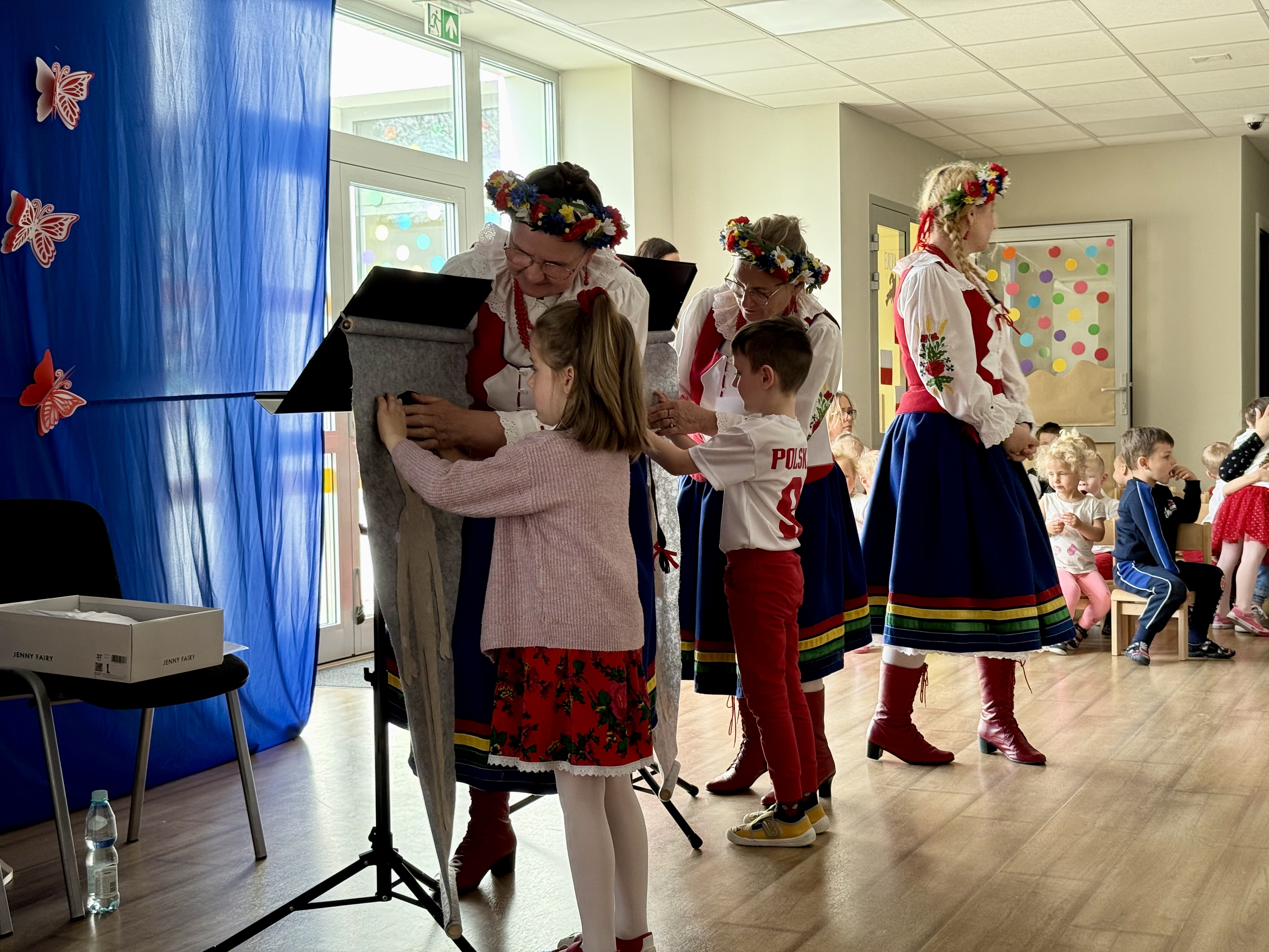 30 kwietnia 2025 r. – z okazji zbliżających się patriotycznych świąt majowych – nasze przedszkole miało zaszczyt gościć Zespół Pieśni i Tańca "Kociewianki”. Panie z zespołu wprowadziły dzieci w magiczny świat muzyki ludowej, prezentując dwa piękne utwory. Następnie, za pomocą filcowych laleczek, przybliżyły maluchom budowę tradycyjnego stroju kociewskiego (zarówno damskiego, jak i męskiego), tłumacząc szczegółowo nazewnictwo poszczególnych elementów odzieży.