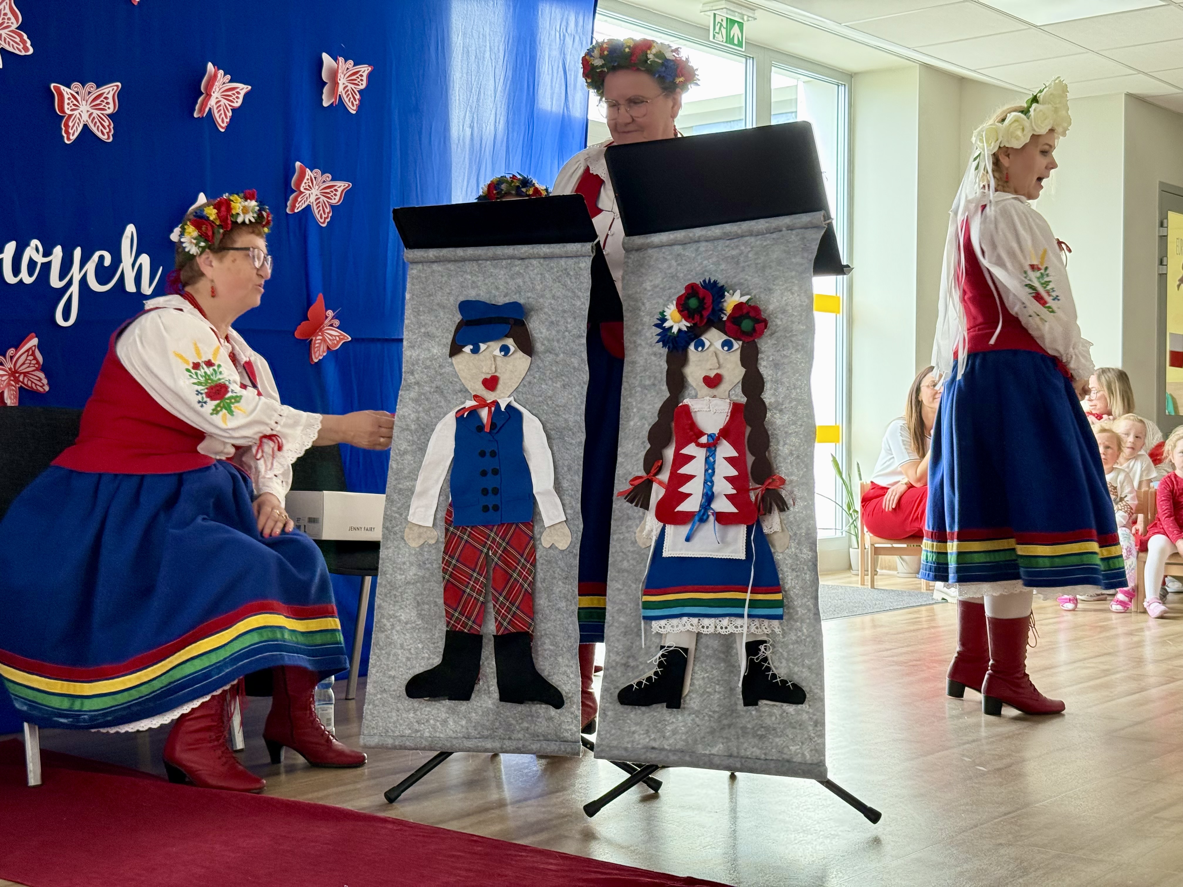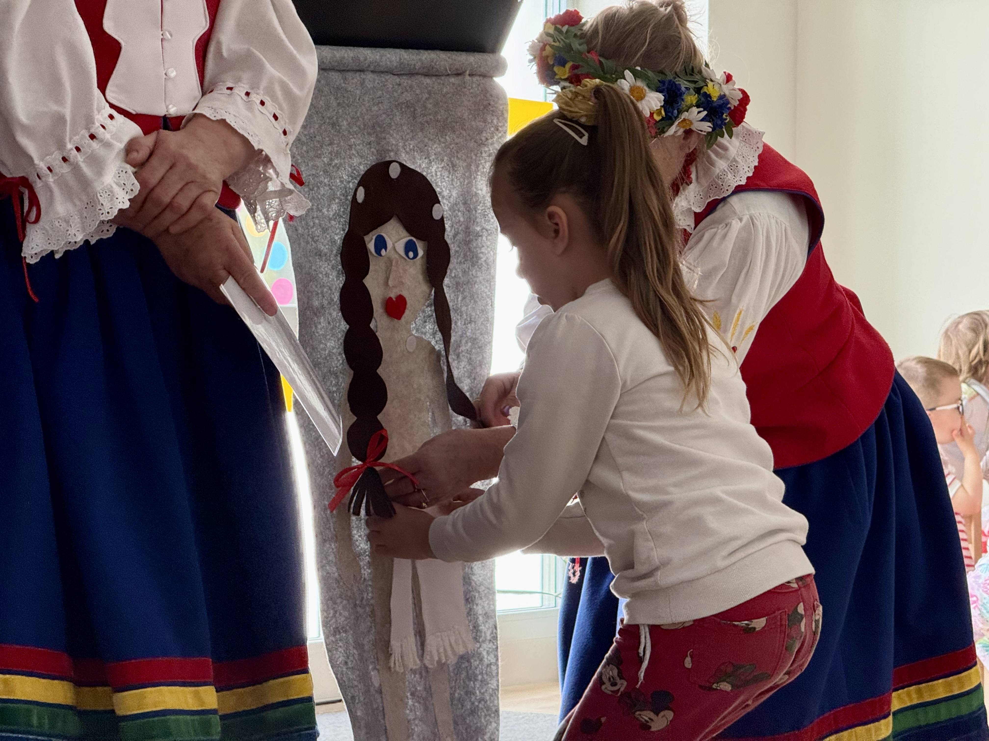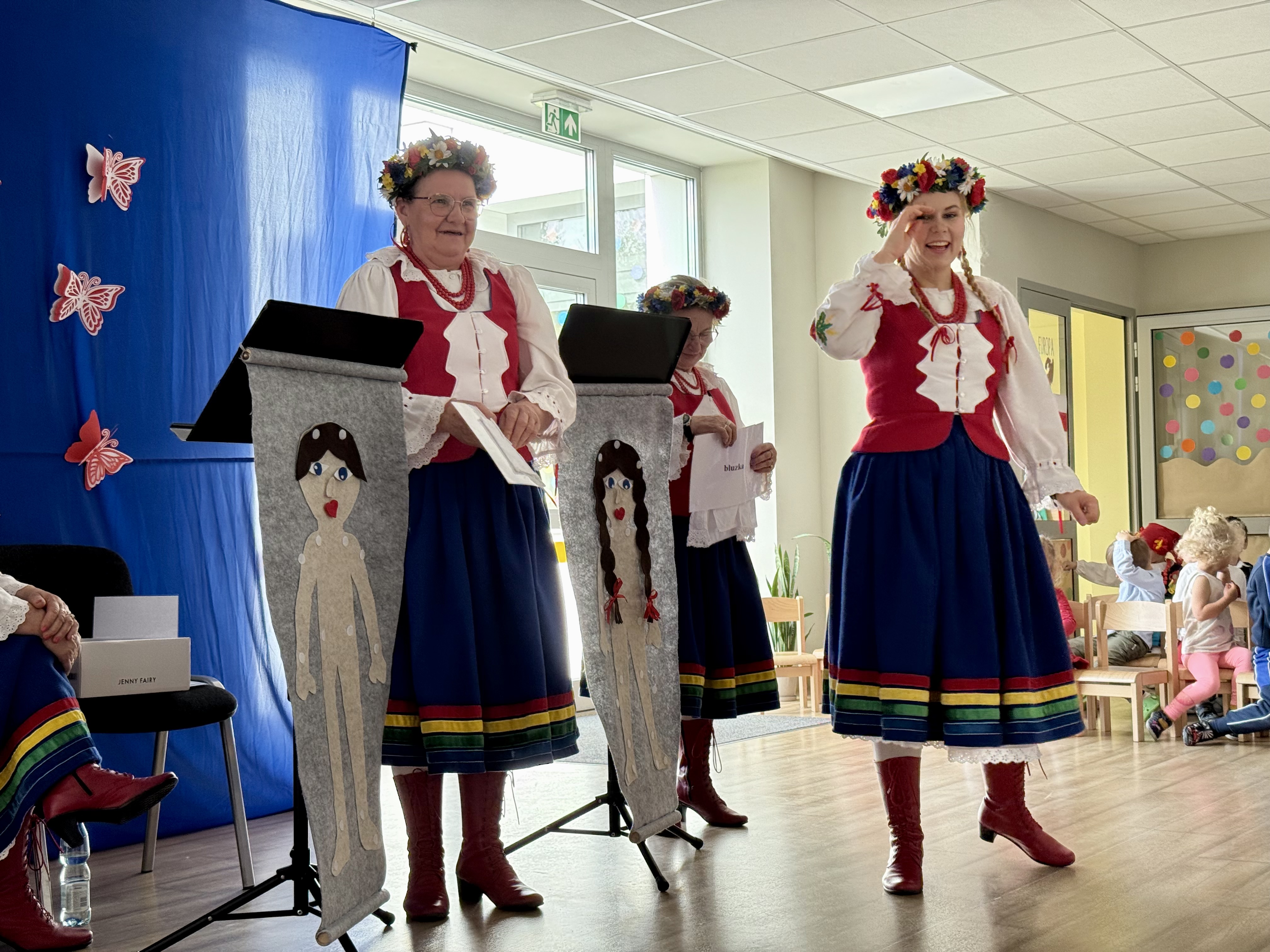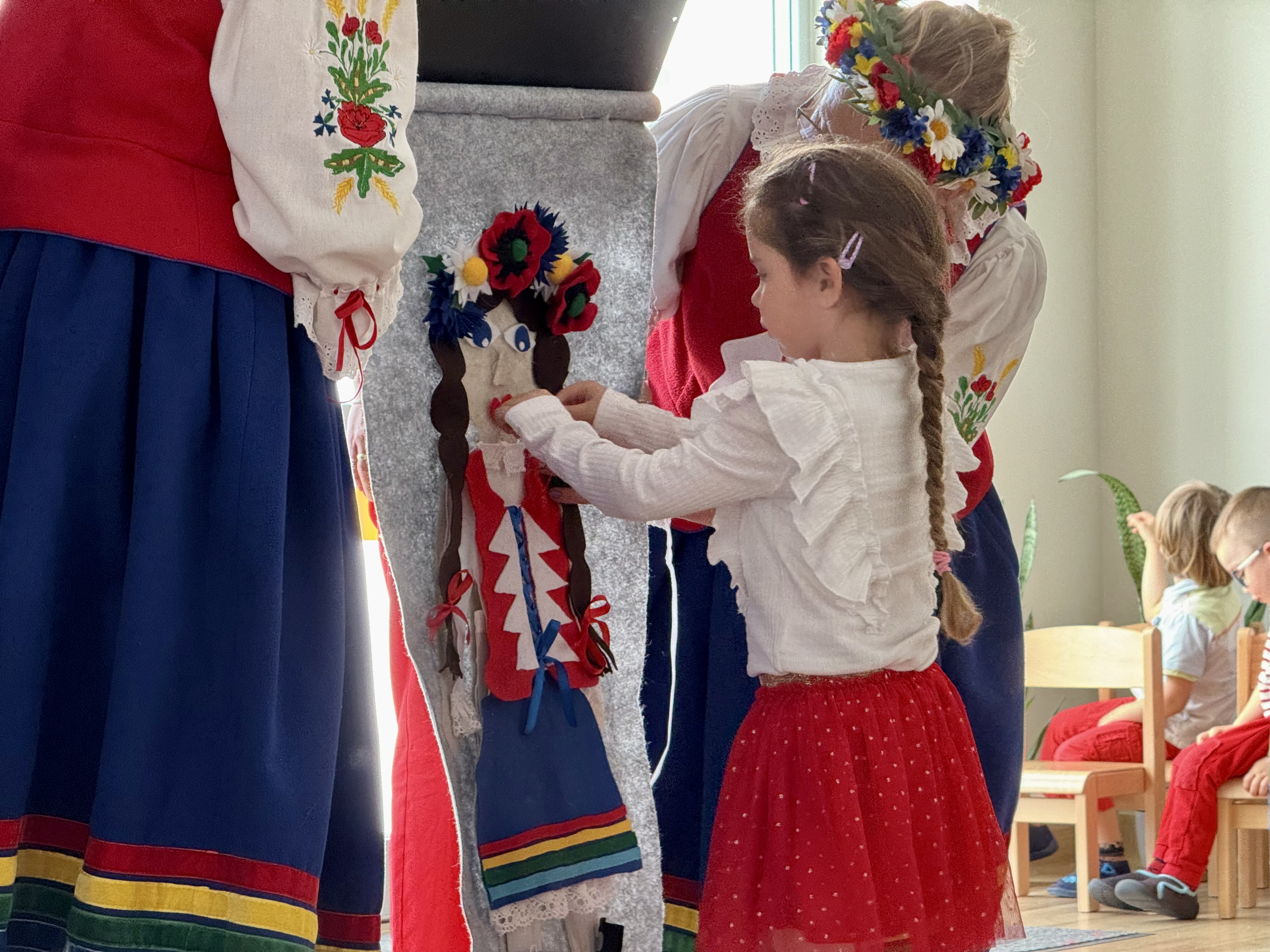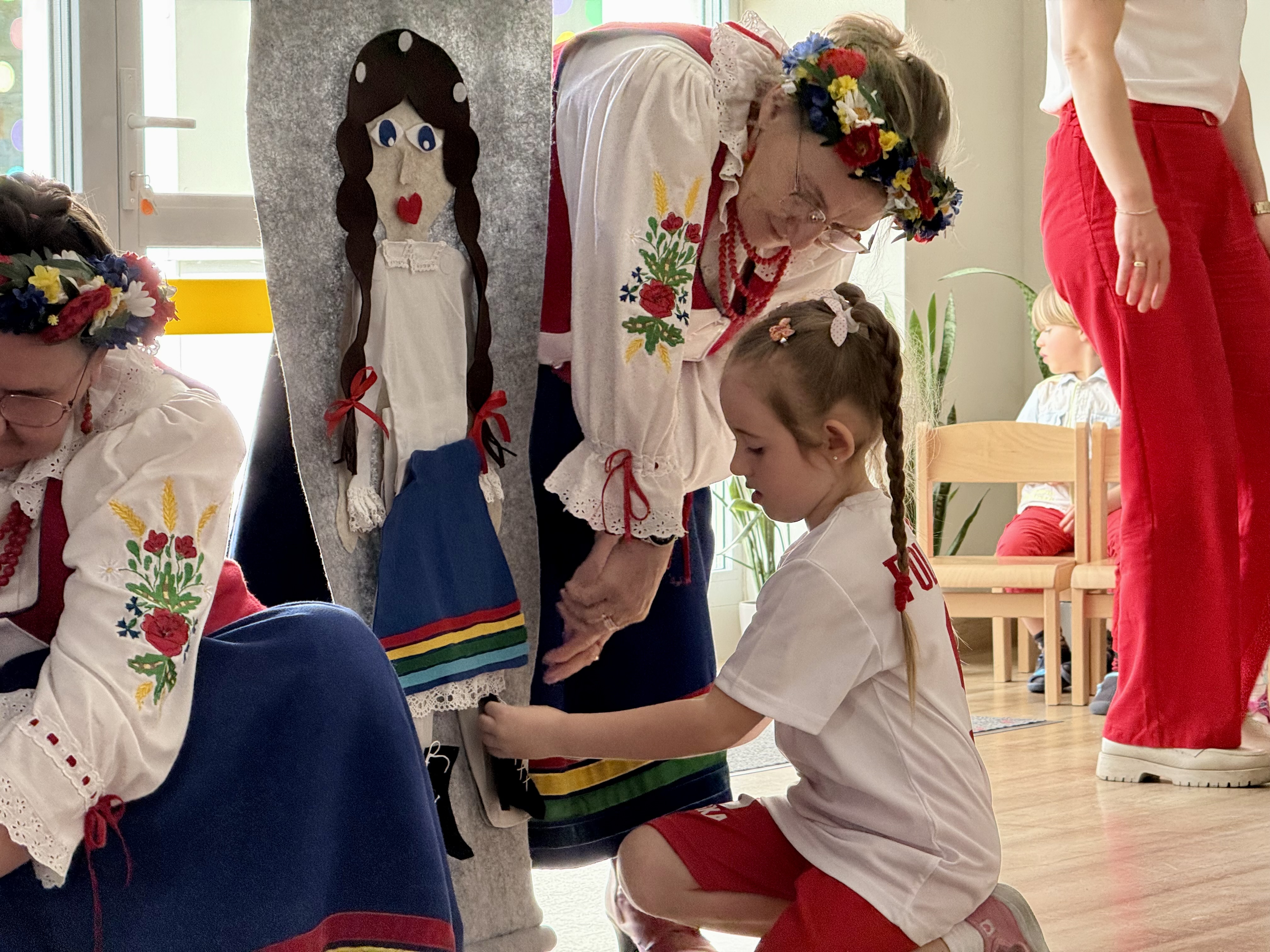 30 kwietnia 2025 r. – z okazji zbliżających się patriotycznych świąt majowych – nasze przedszkole miało zaszczyt gościć Zespół Pieśni i Tańca "Kociewianki”. Panie z zespołu wprowadziły dzieci w magiczny świat muzyki ludowej, prezentując dwa piękne utwory. Następnie, za pomocą filcowych laleczek, przybliżyły maluchom budowę tradycyjnego stroju kociewskiego (zarówno damskiego, jak i męskiego), tłumacząc szczegółowo nazewnictwo poszczególnych elementów odzieży.