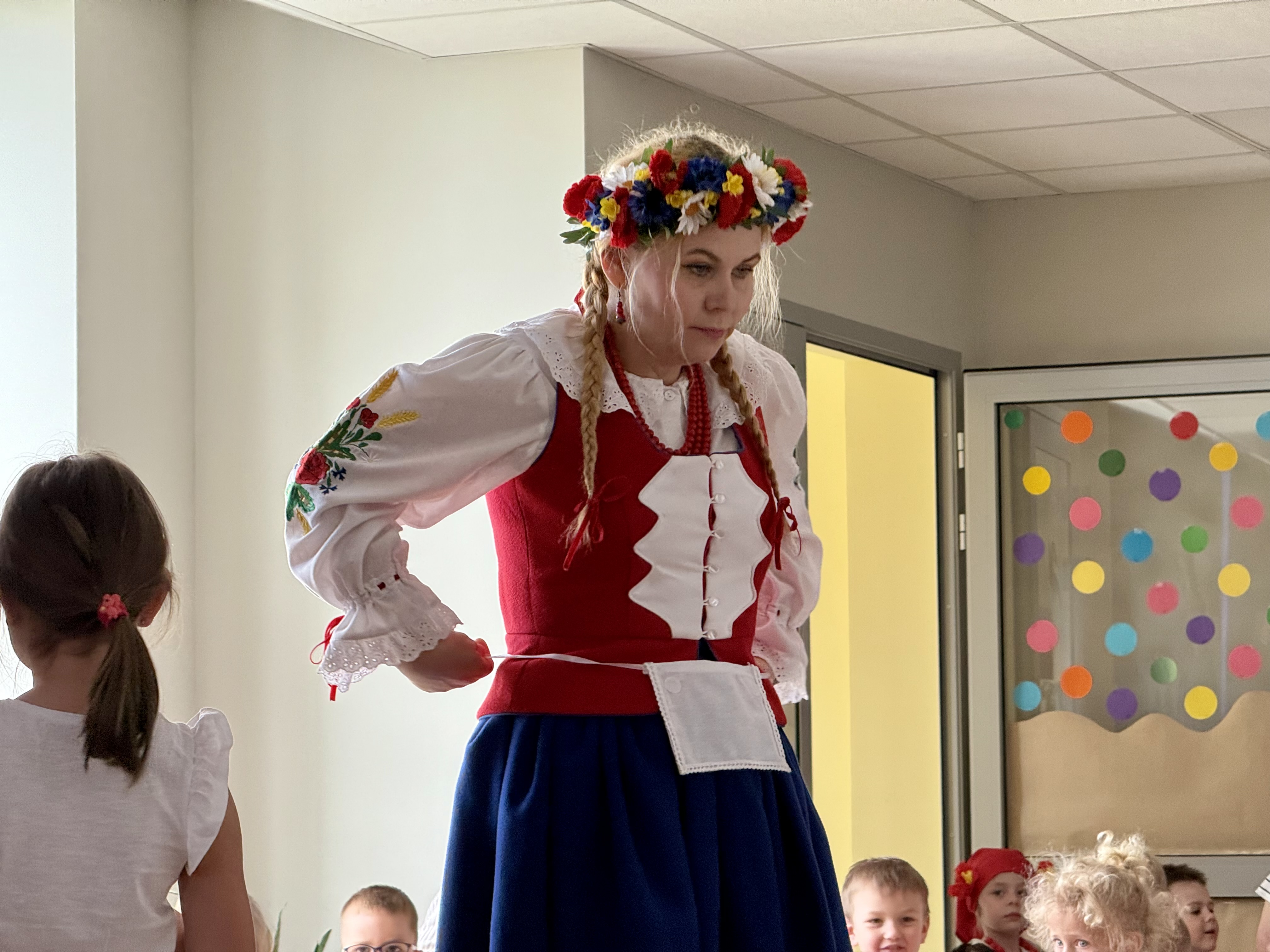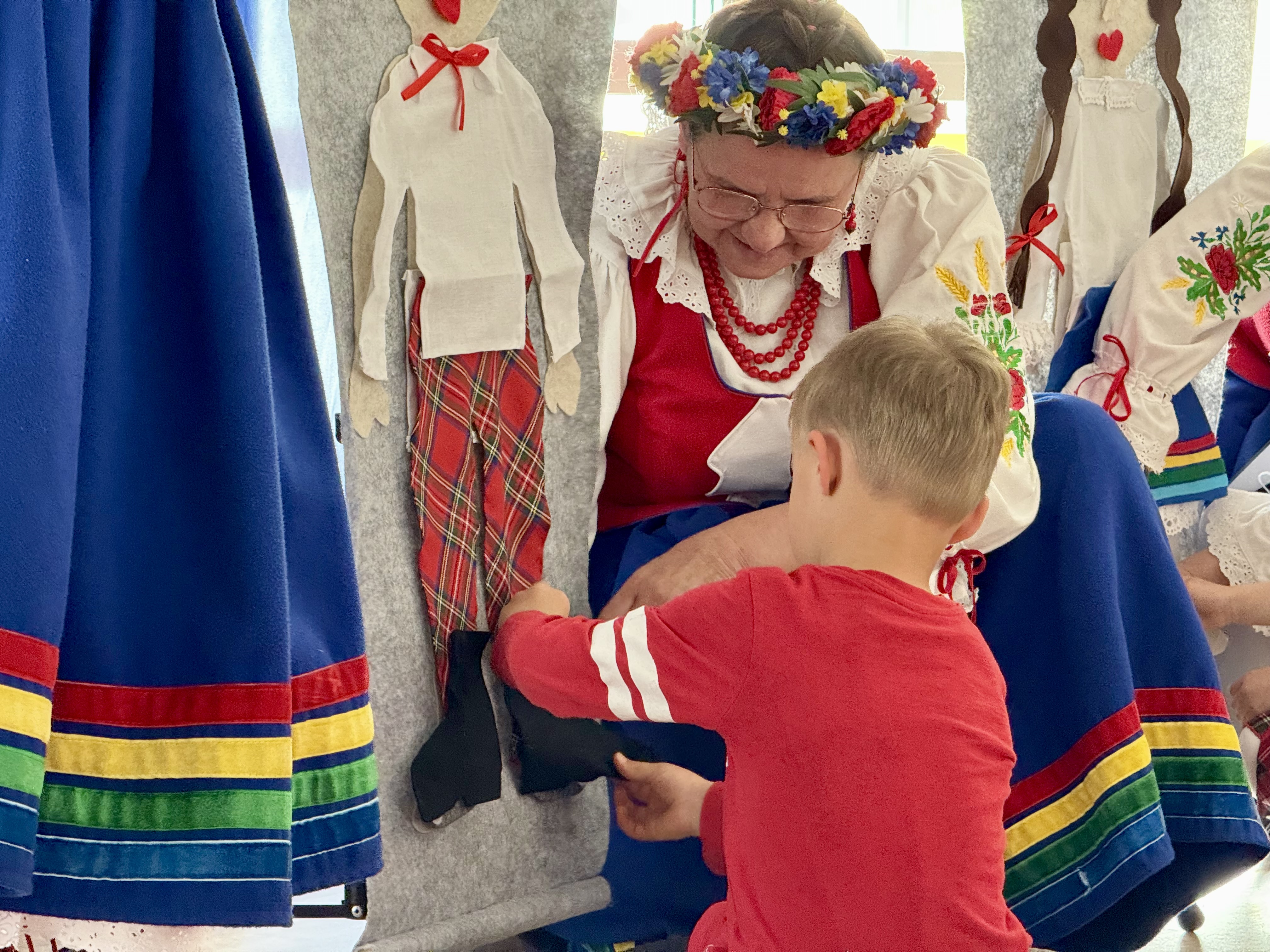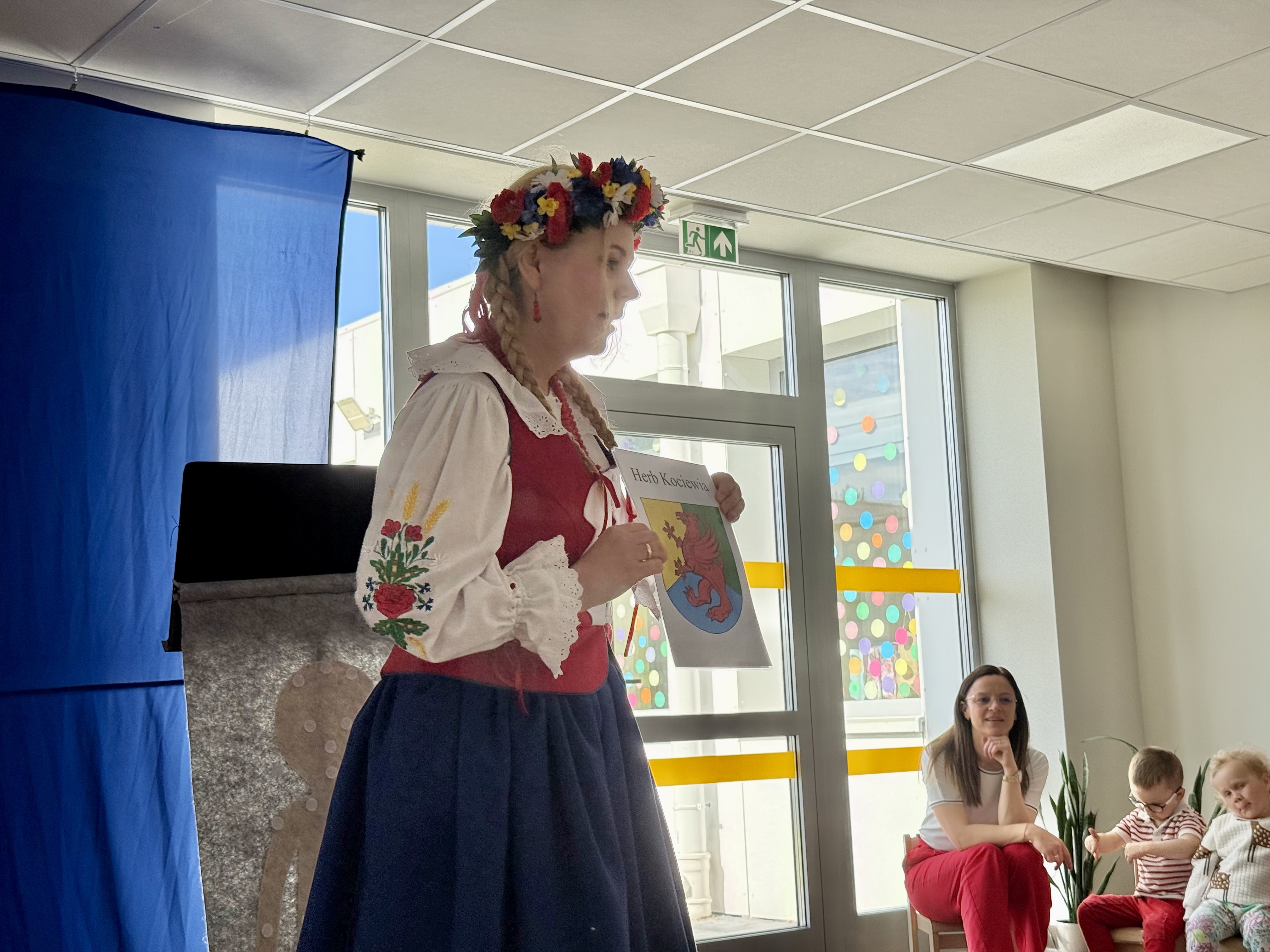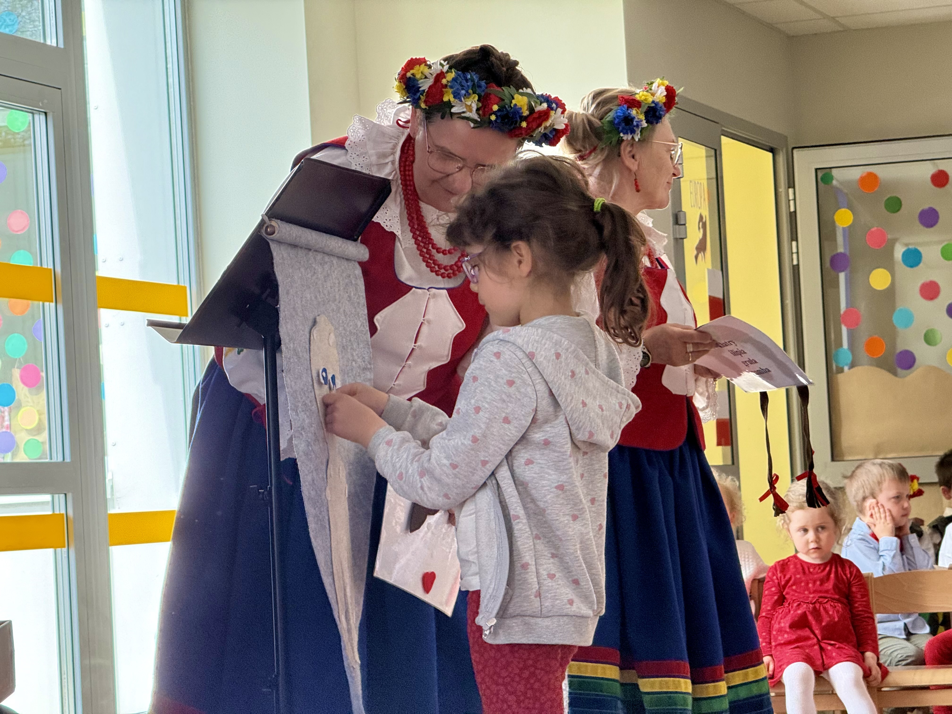 30 kwietnia 2025 r. – z okazji zbliżających się patriotycznych świąt majowych – nasze przedszkole miało zaszczyt gościć Zespół Pieśni i Tańca "Kociewianki”. Panie z zespołu wprowadziły dzieci w magiczny świat muzyki ludowej, prezentując dwa piękne utwory. Następnie, za pomocą filcowych laleczek, przybliżyły maluchom budowę tradycyjnego stroju kociewskiego (zarówno damskiego, jak i męskiego), tłumacząc szczegółowo nazewnictwo poszczególnych elementów odzieży.