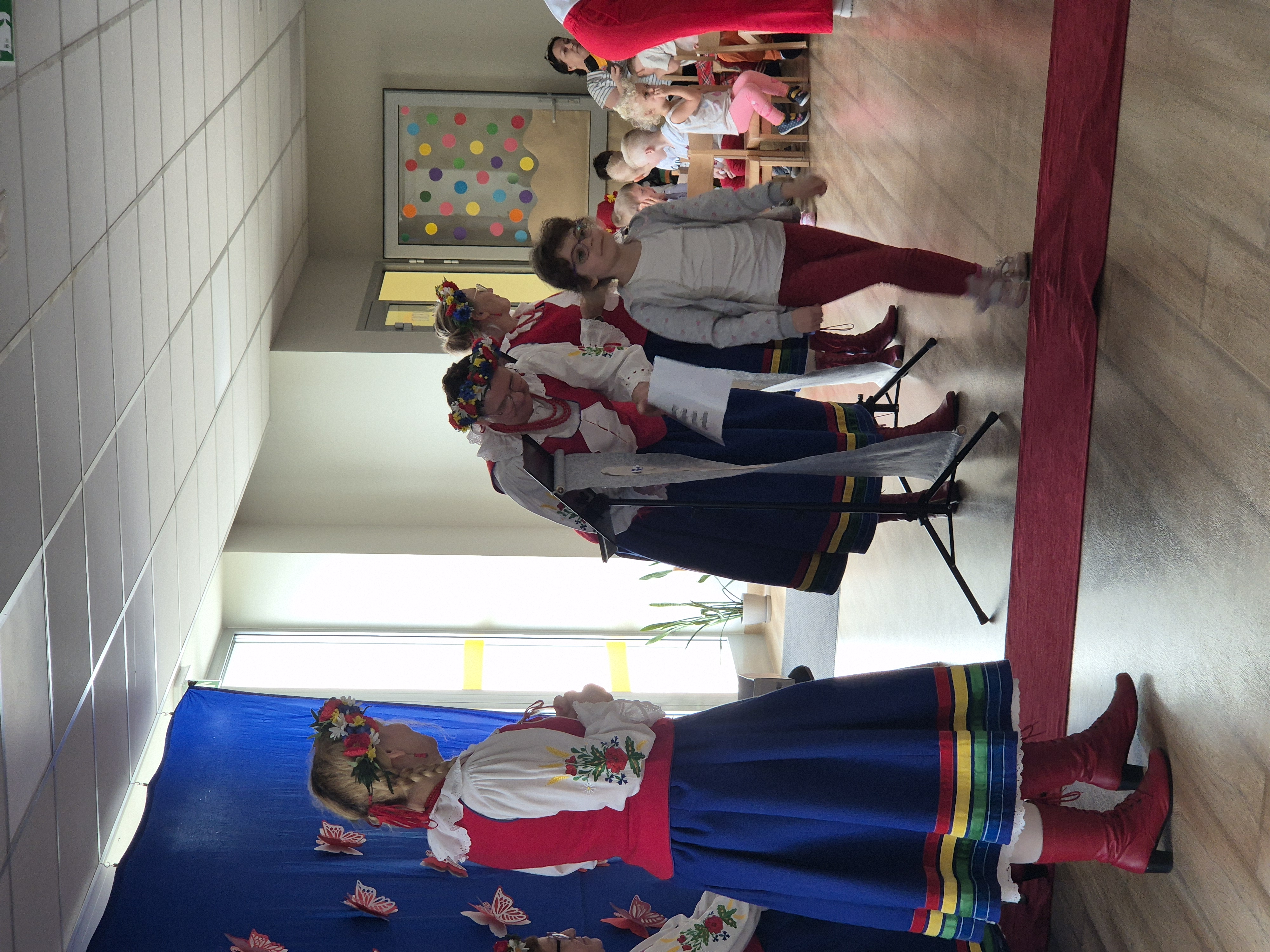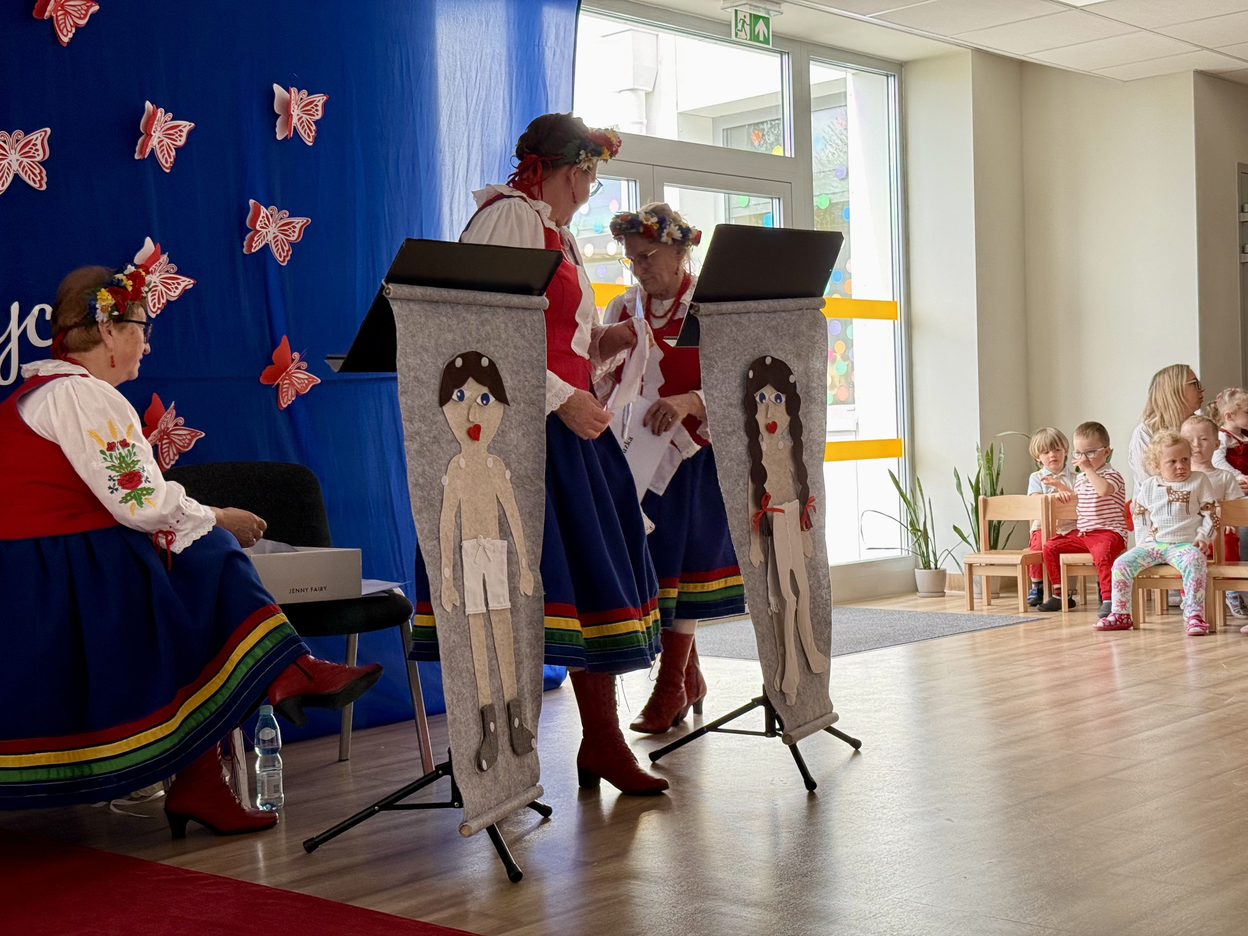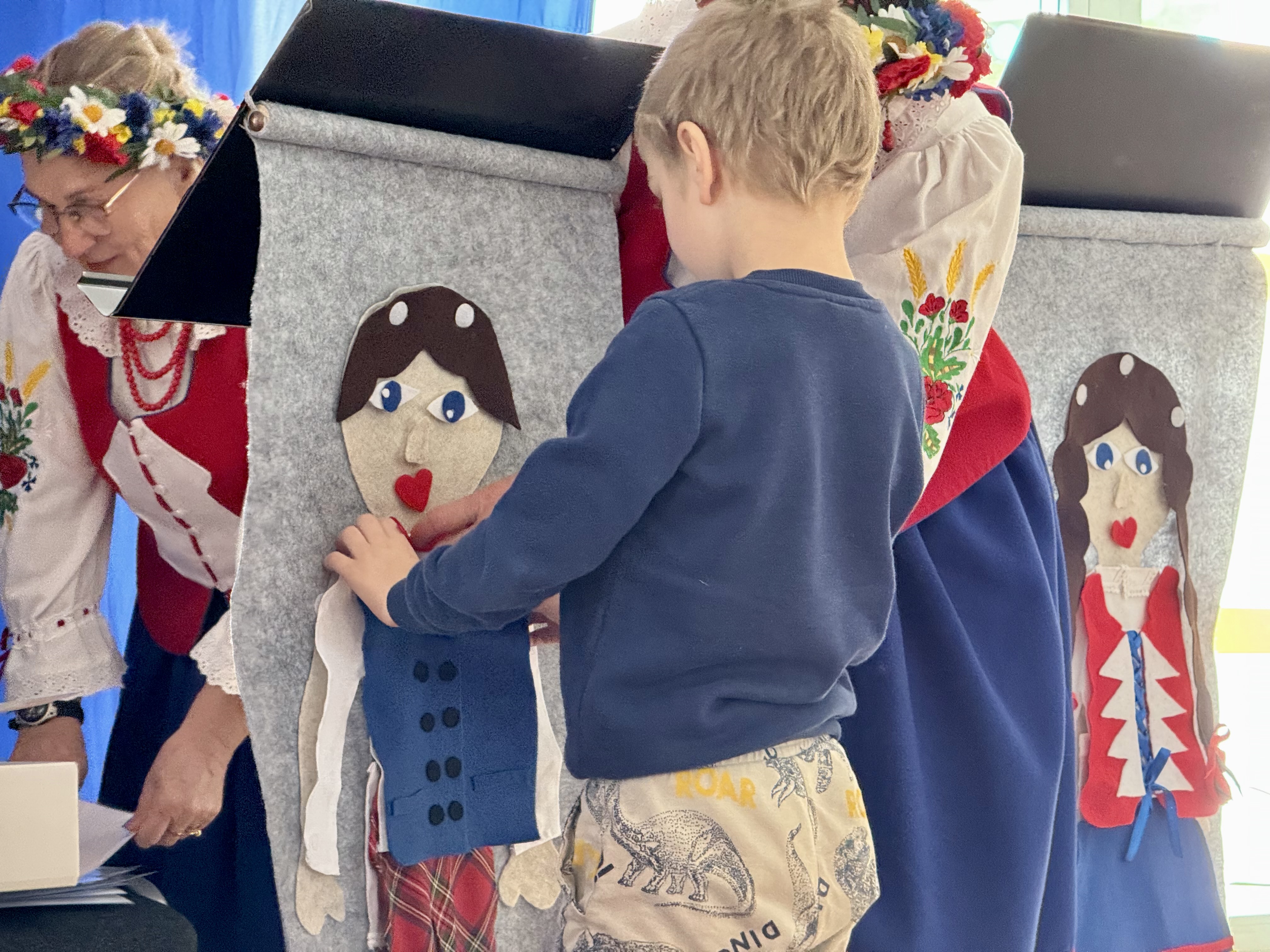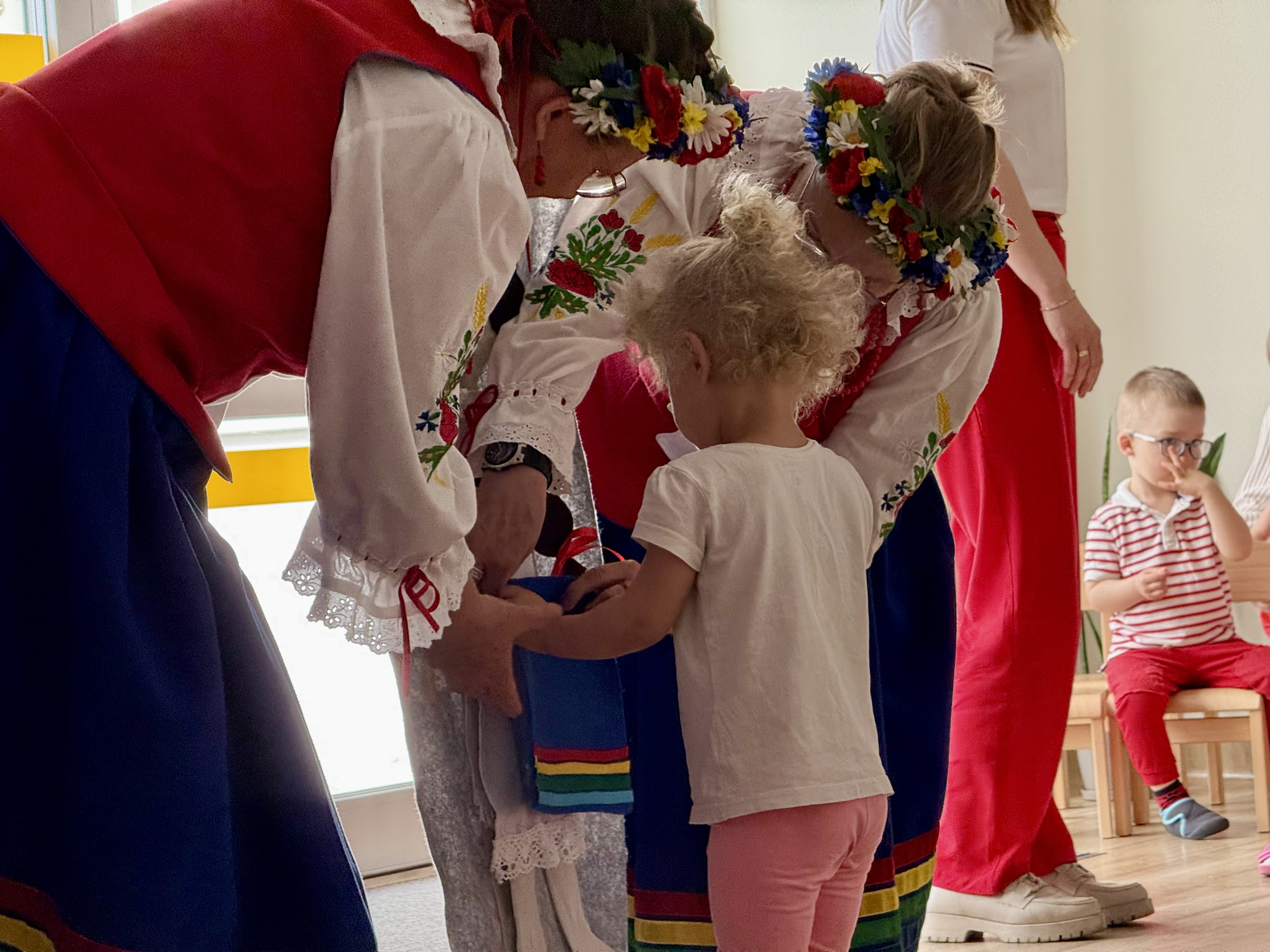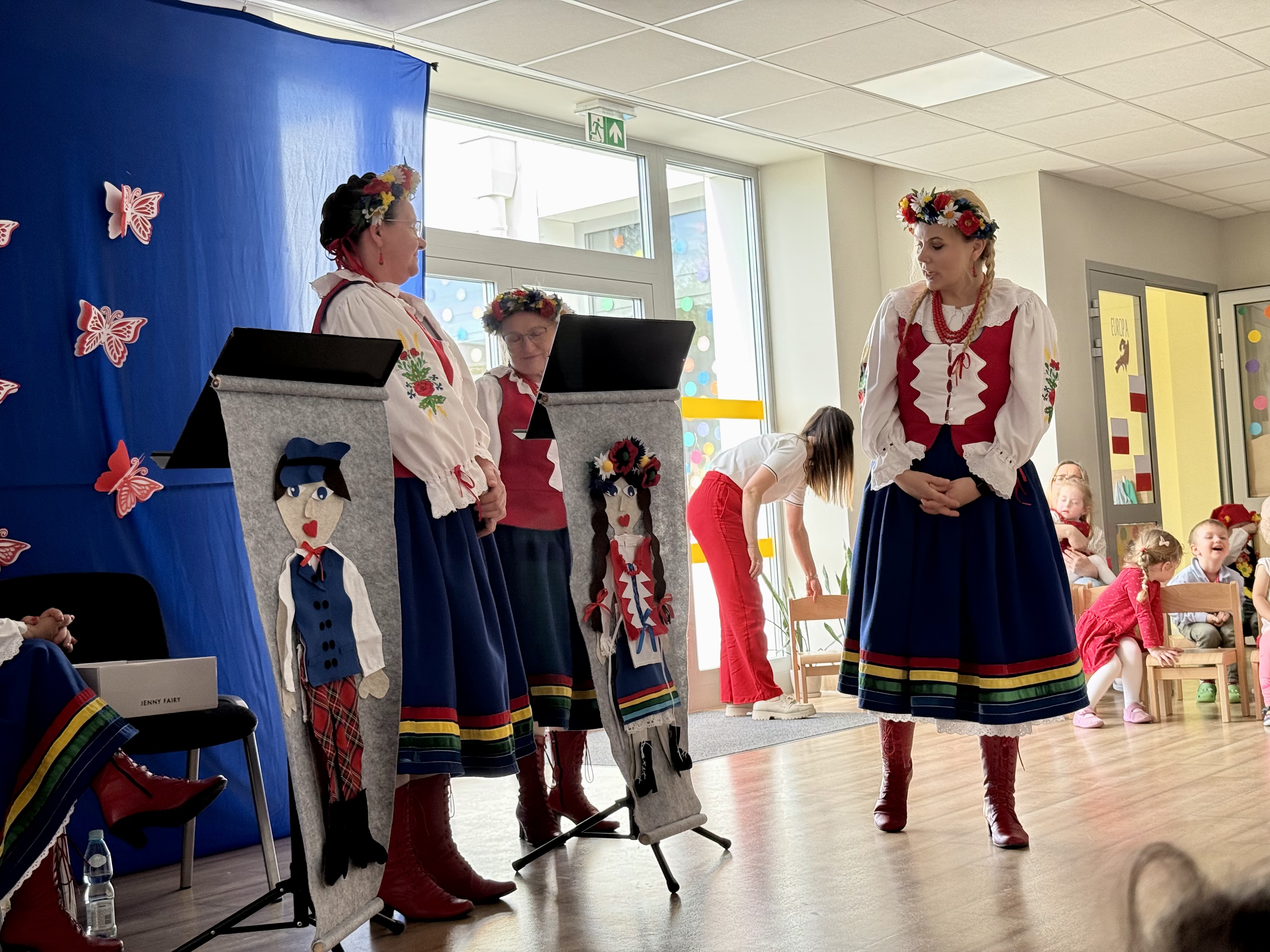 30 kwietnia 2025 r. – z okazji zbliżających się patriotycznych świąt majowych – nasze przedszkole miało zaszczyt gościć Zespół Pieśni i Tańca "Kociewianki”. Panie z zespołu wprowadziły dzieci w magiczny świat muzyki ludowej, prezentując dwa piękne utwory. Następnie, za pomocą filcowych laleczek, przybliżyły maluchom budowę tradycyjnego stroju kociewskiego (zarówno damskiego, jak i męskiego), tłumacząc szczegółowo nazewnictwo poszczególnych elementów odzieży.