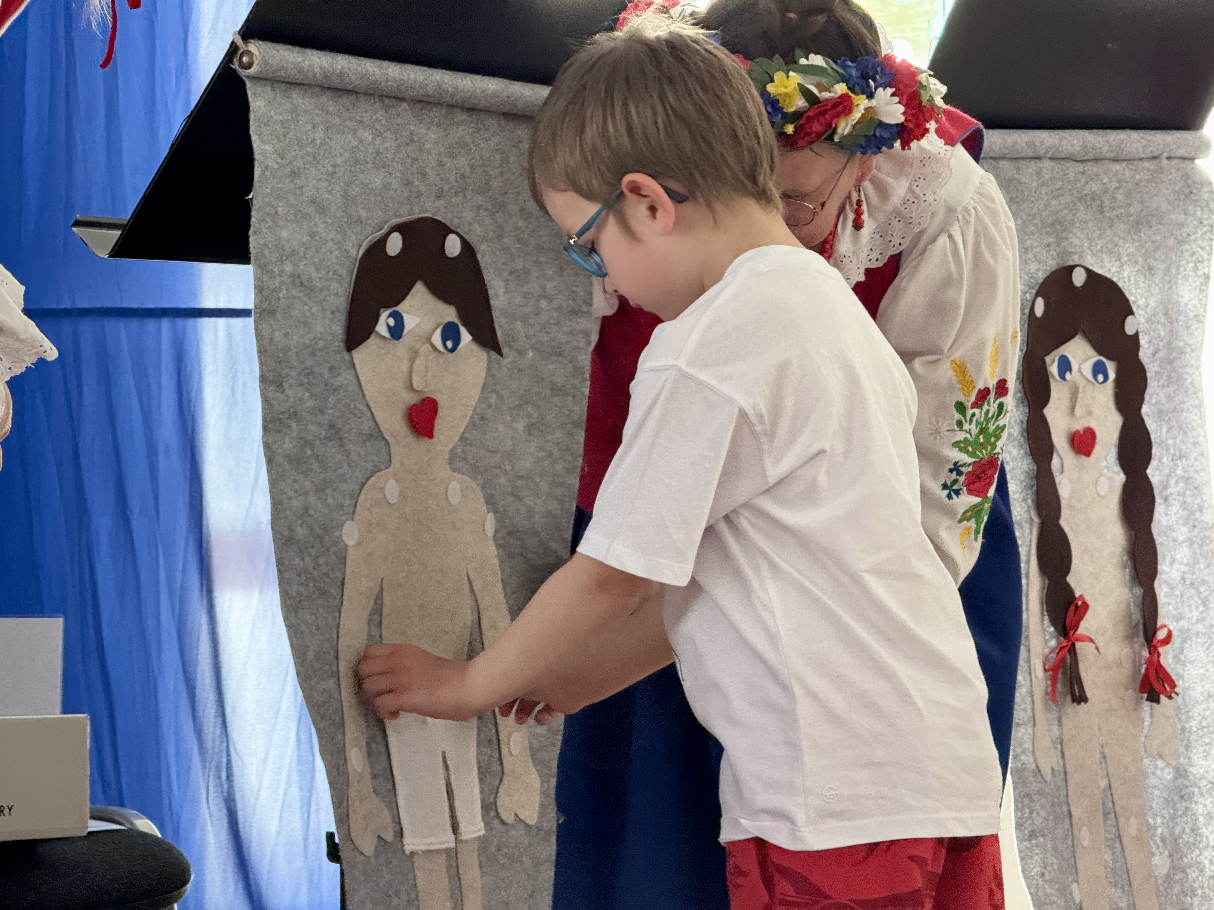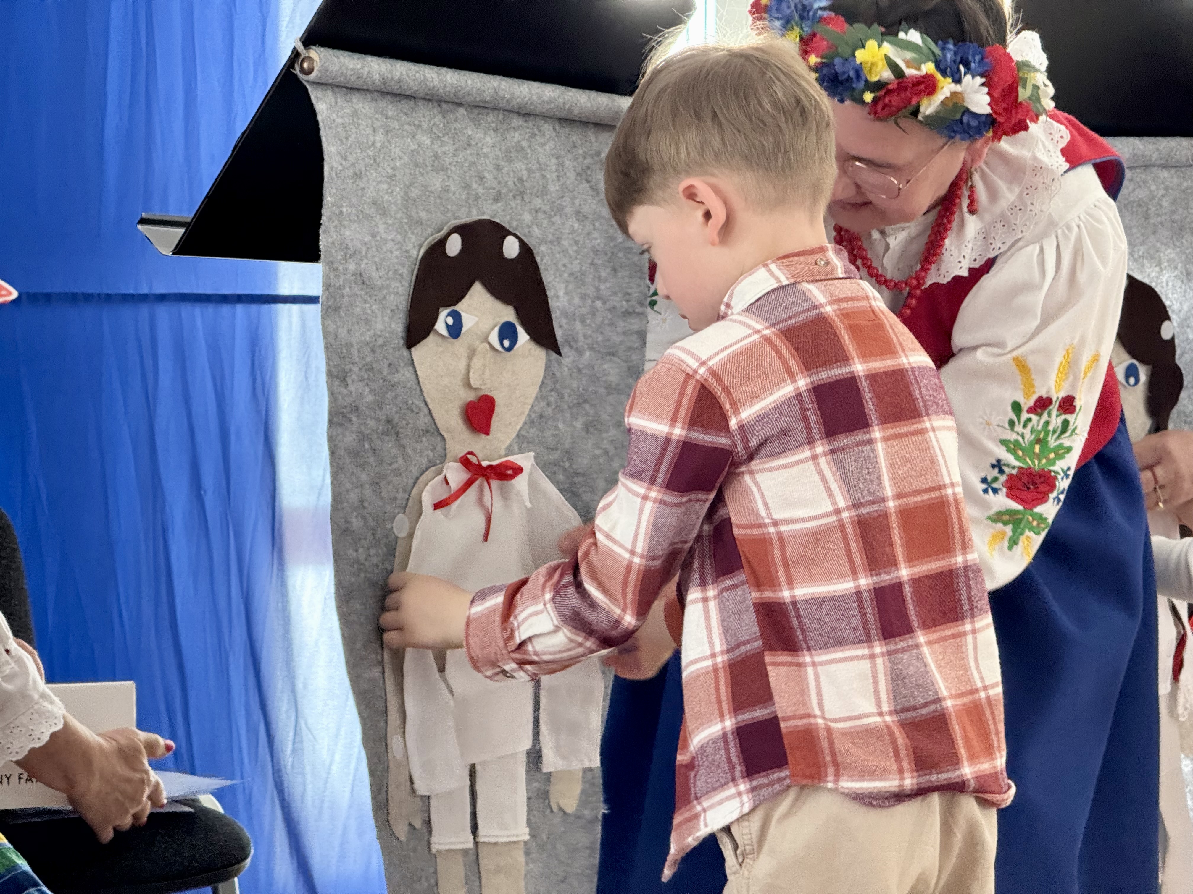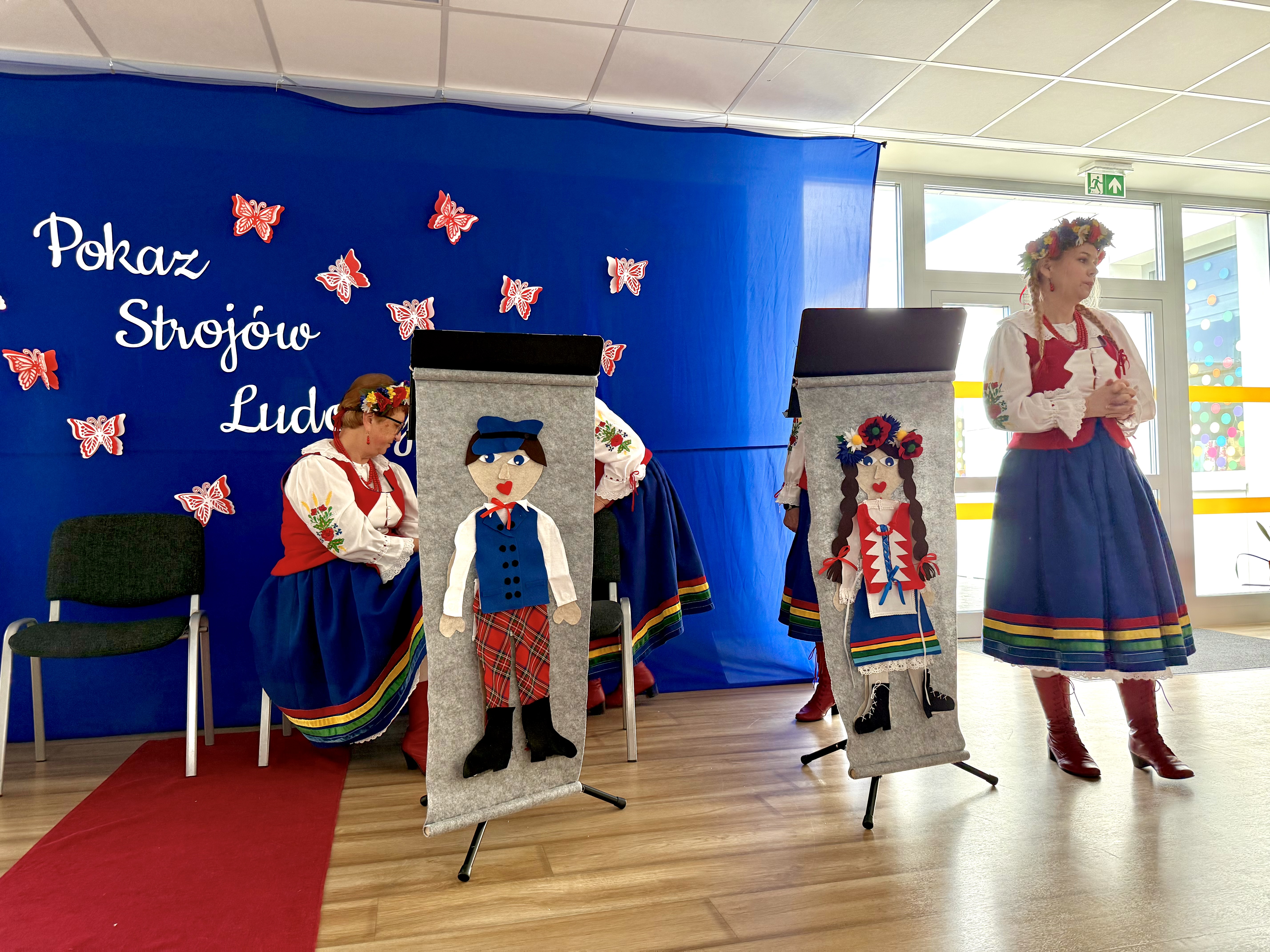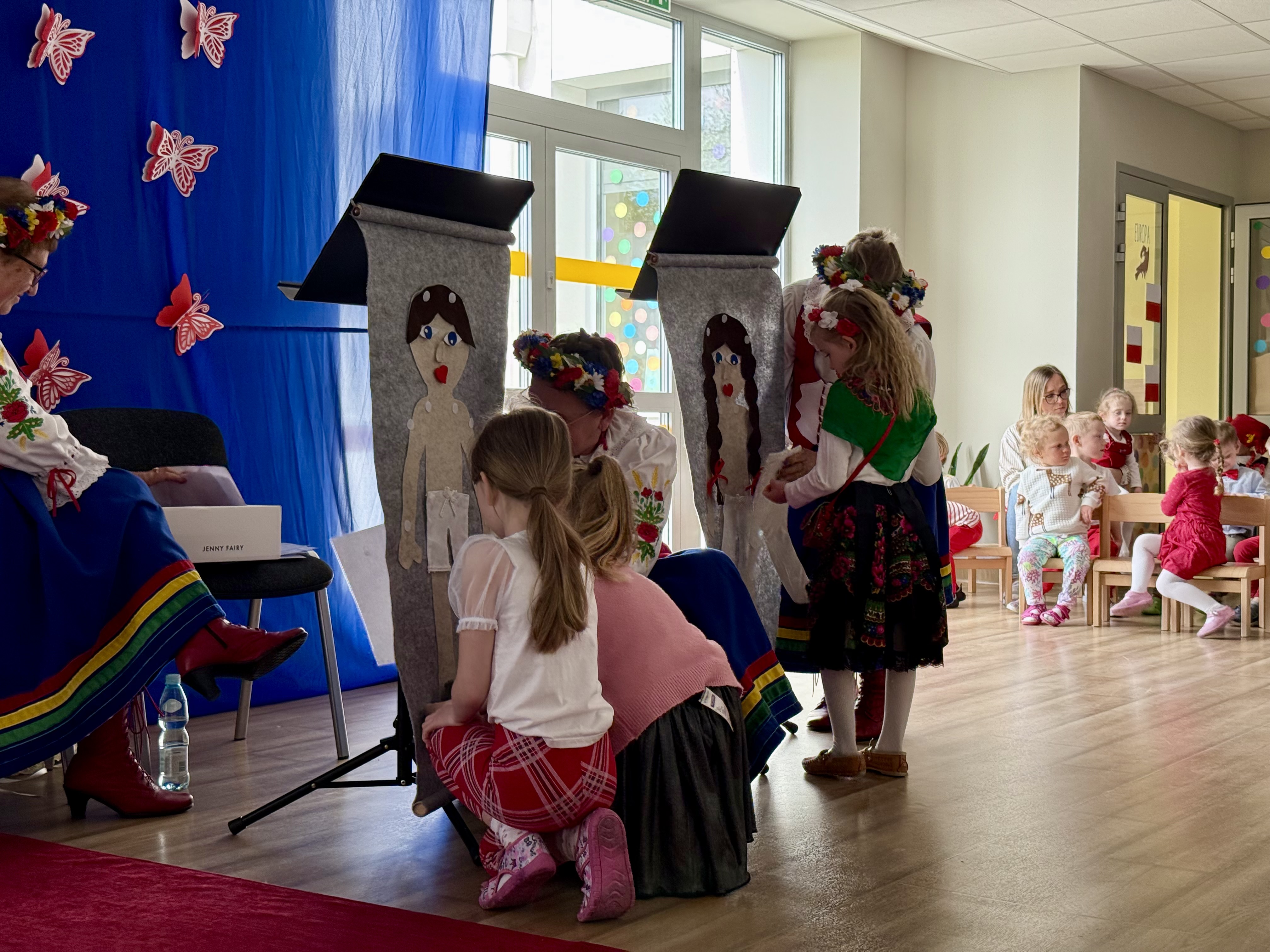 30 kwietnia 2025 r. – z okazji zbliżających się patriotycznych świąt majowych – nasze przedszkole miało zaszczyt gościć Zespół Pieśni i Tańca "Kociewianki”. Panie z zespołu wprowadziły dzieci w magiczny świat muzyki ludowej, prezentując dwa piękne utwory. Następnie, za pomocą filcowych laleczek, przybliżyły maluchom budowę tradycyjnego stroju kociewskiego (zarówno damskiego, jak i męskiego), tłumacząc szczegółowo nazewnictwo poszczególnych elementów odzieży.