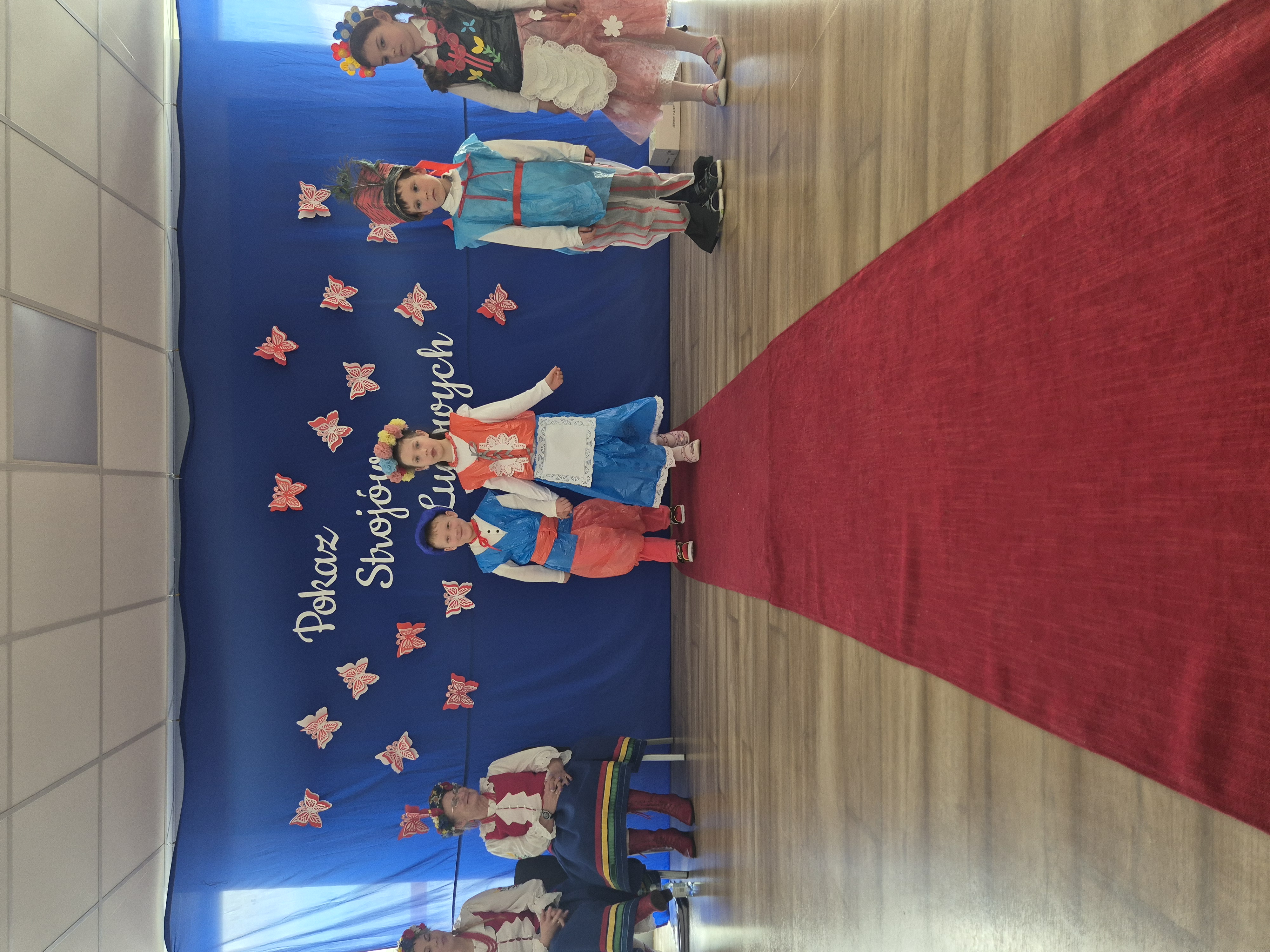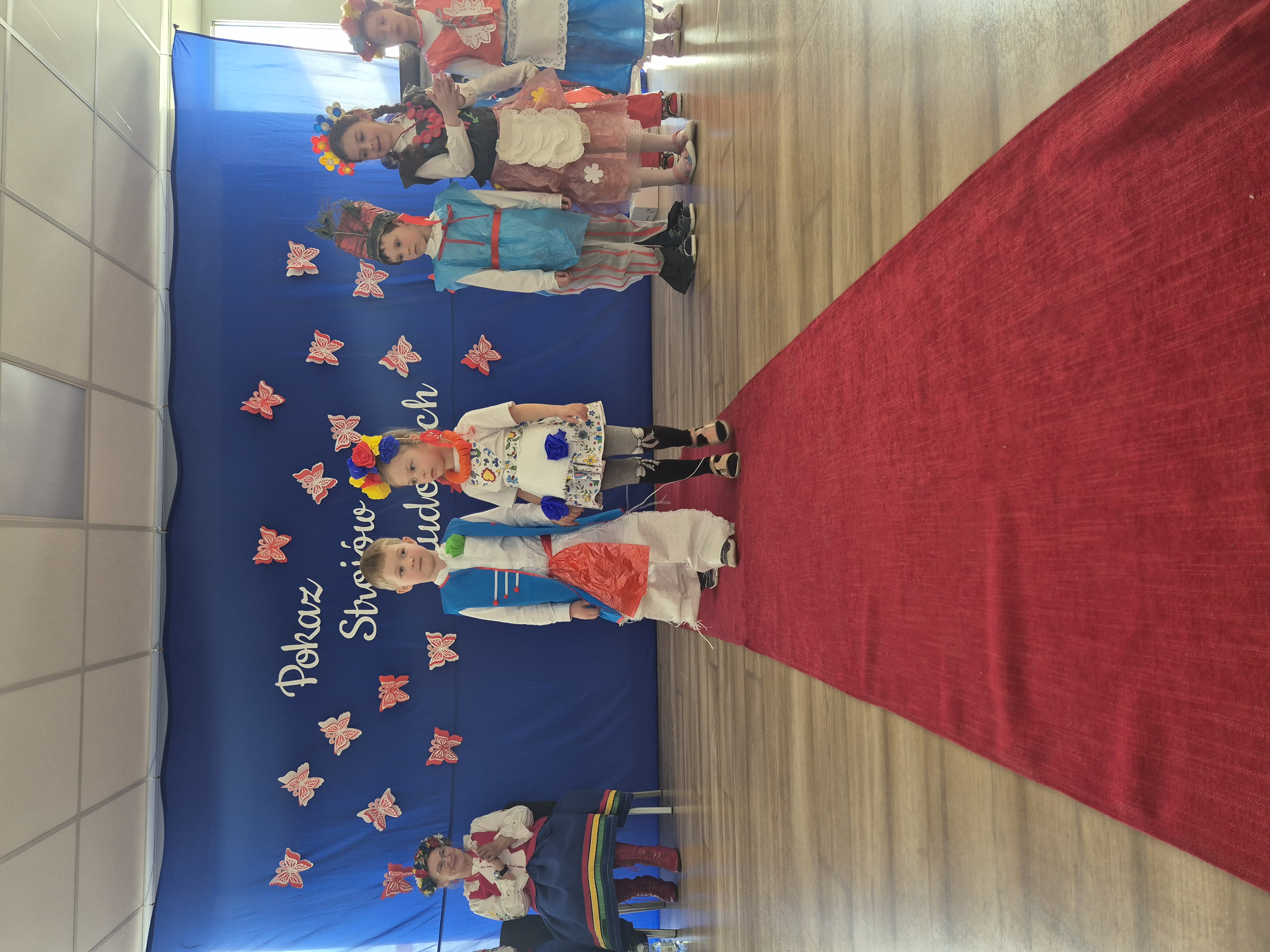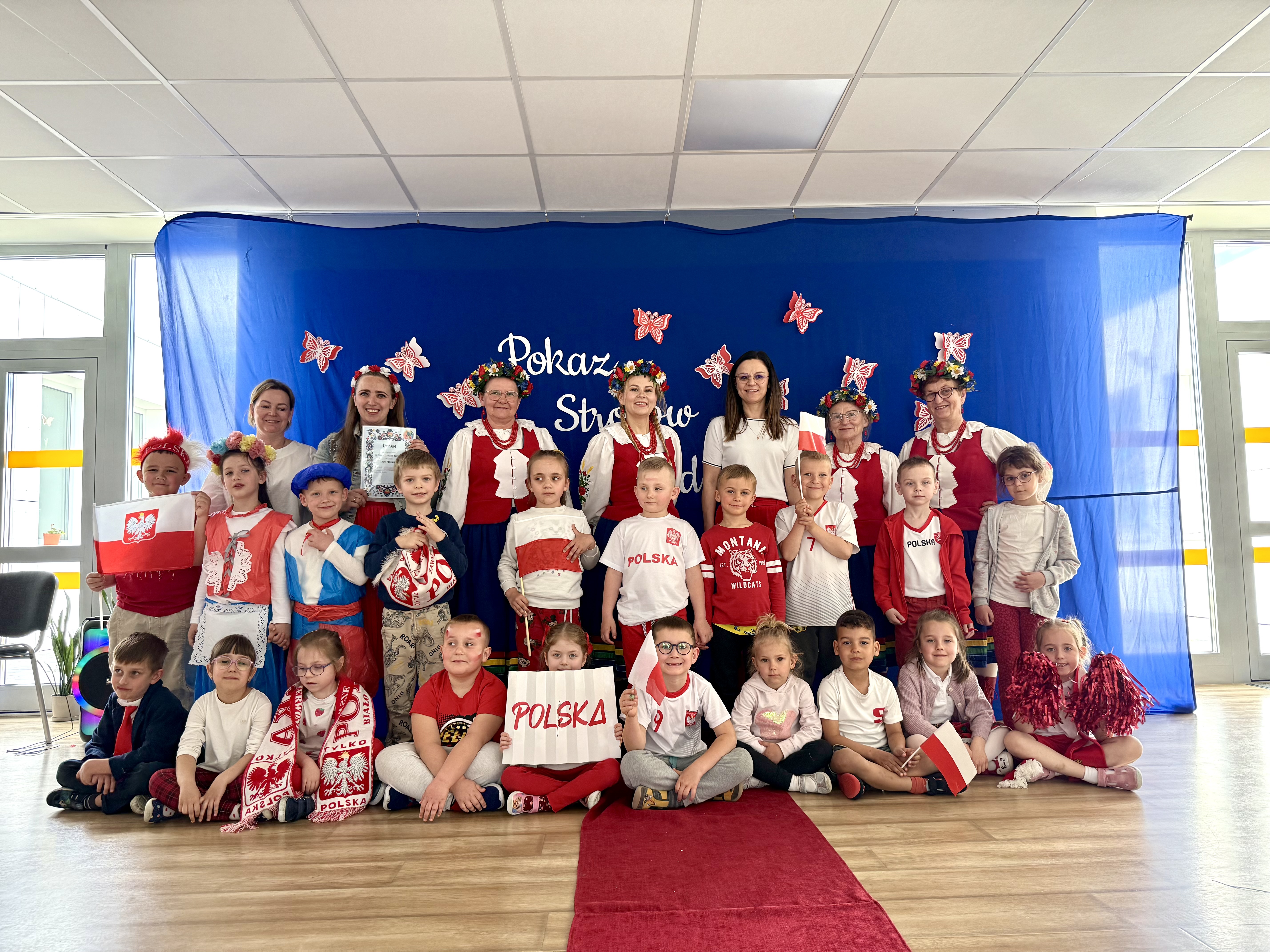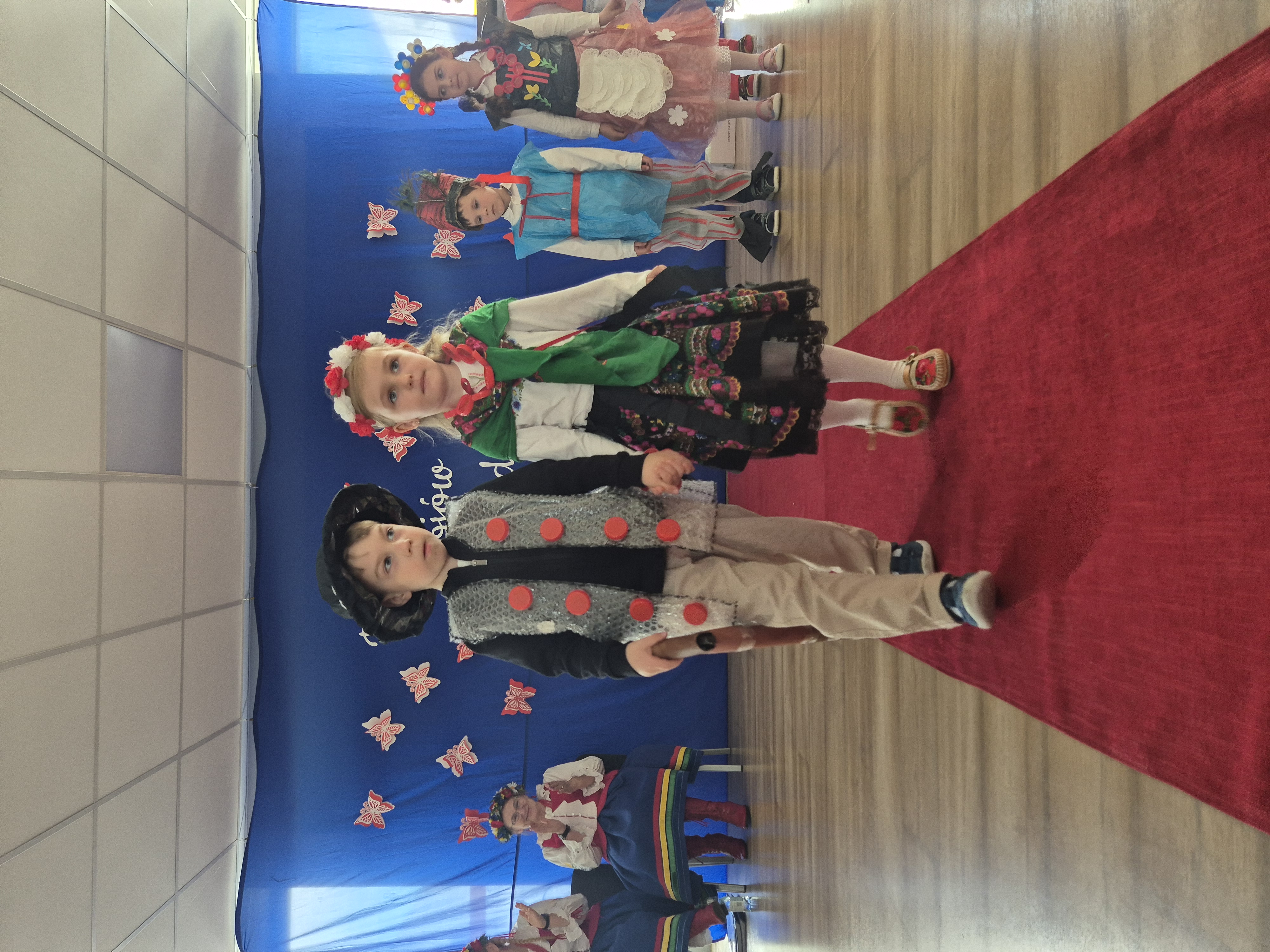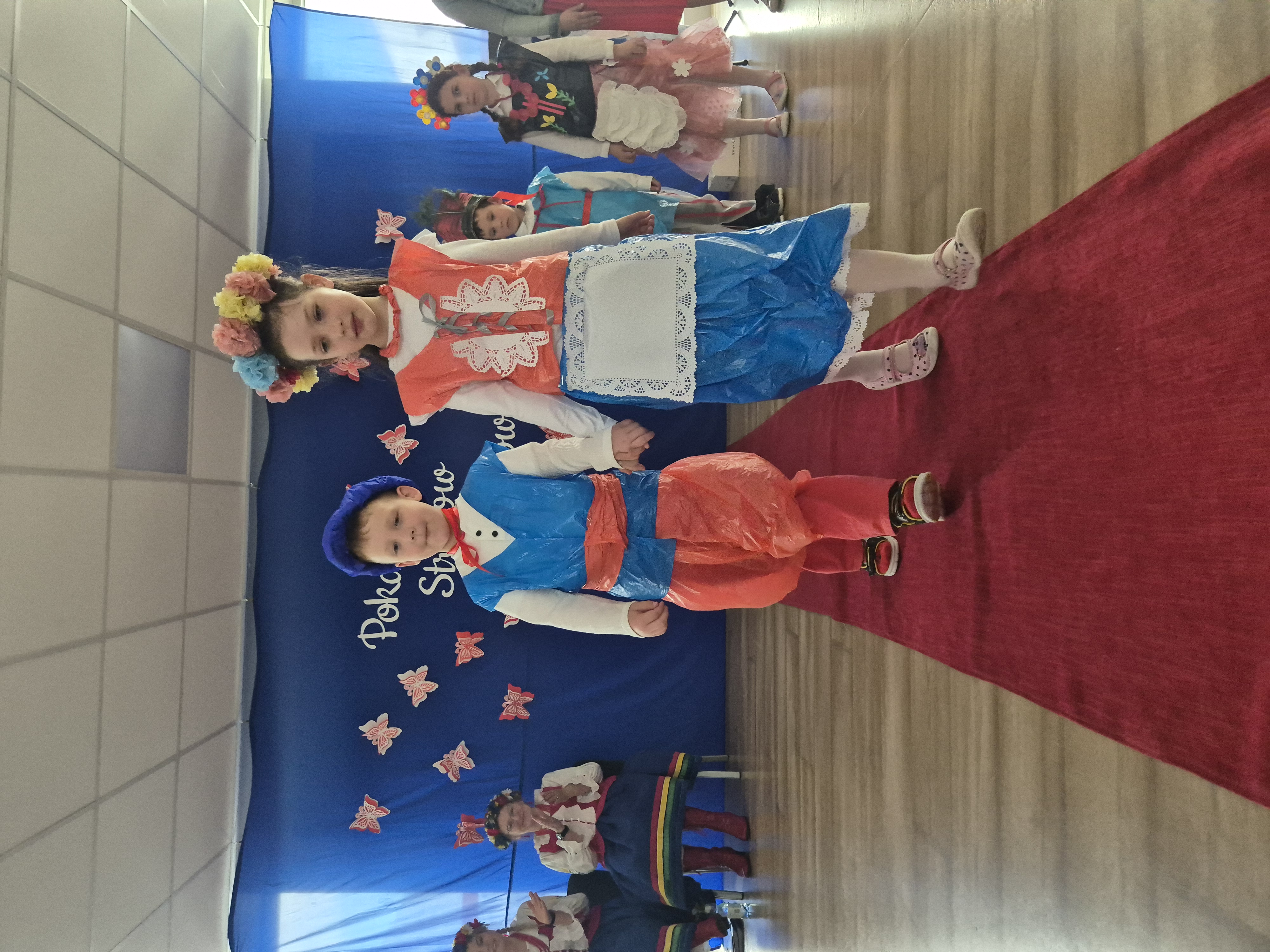 Kolejnym punktem programu był Pokaz Strojów Ludowych, który w tym roku przybrał zupełnie nową formułę. Każda grupa przedszkolna zaprezentowała strój ludowy z wylosowanego wcześniej regionu etnograficznego – Kociewia, Kujaw, Kaszub, Krakowa, Łowicza i Podhala. Co ważne – stroje te zostały wykonane własnoręcznie przez dzieci i nauczycieli z wykorzystaniem materiałów recyklingowych, takich jak: papier, worki, nakrętki, stare tkaniny, tektura czy bibuła. Reprezentanci każdej grupy – chłopiec i dziewczynka – z dumą i uśmiechem na twarzy przeszli po naszym przedszkolnym wybiegu prezentując swoje wyjątkowe kreacje. Pozostali, ubrani w stroje patriotyczne, dopingowali swoich kolegów i koleżanki. Na widowni nie brakowało biało-czerwonych koszulek, opasek, szalików i flag. Całe przedszkole tego dnia tętniło barwami narodowymi i pozytywną energią.