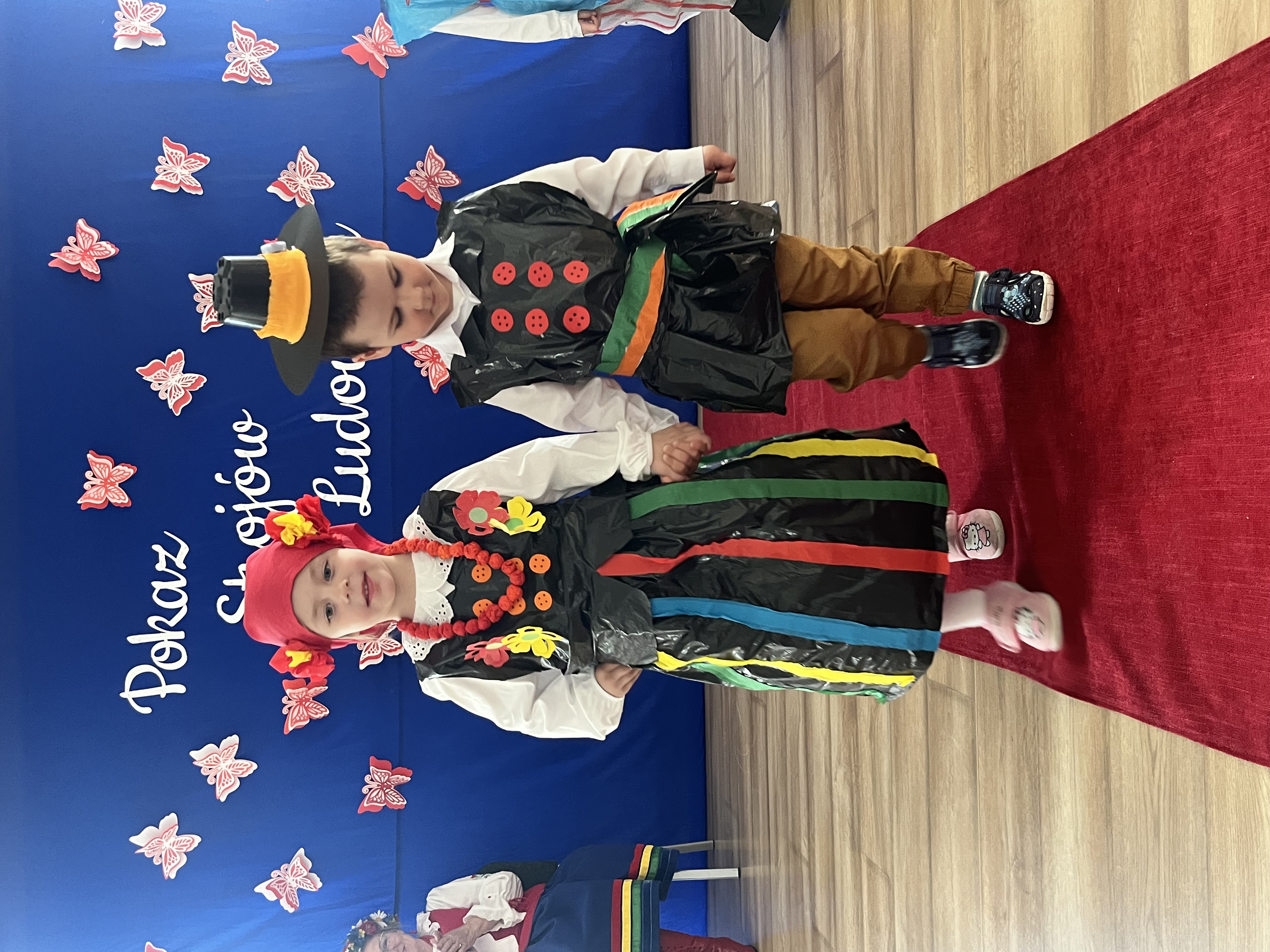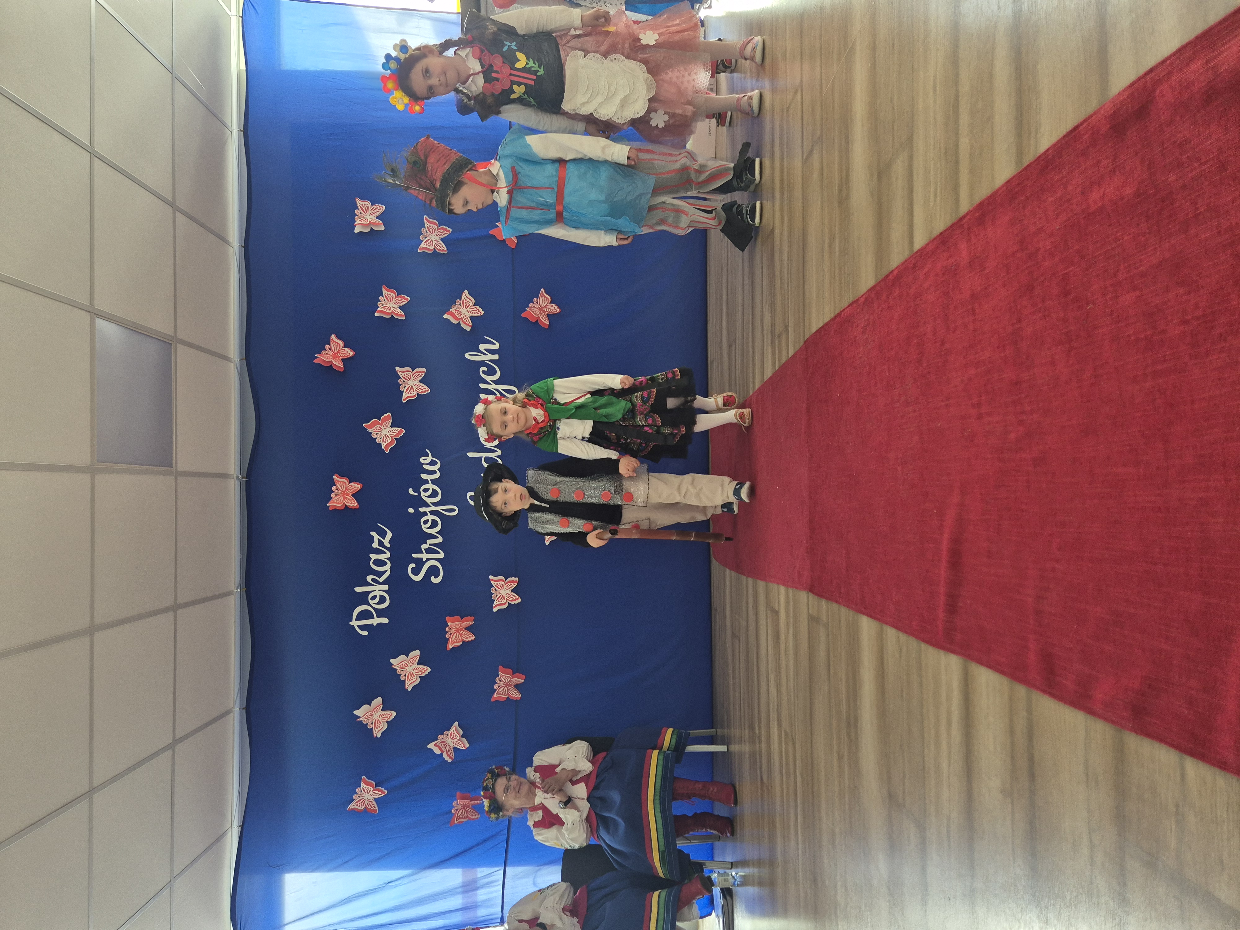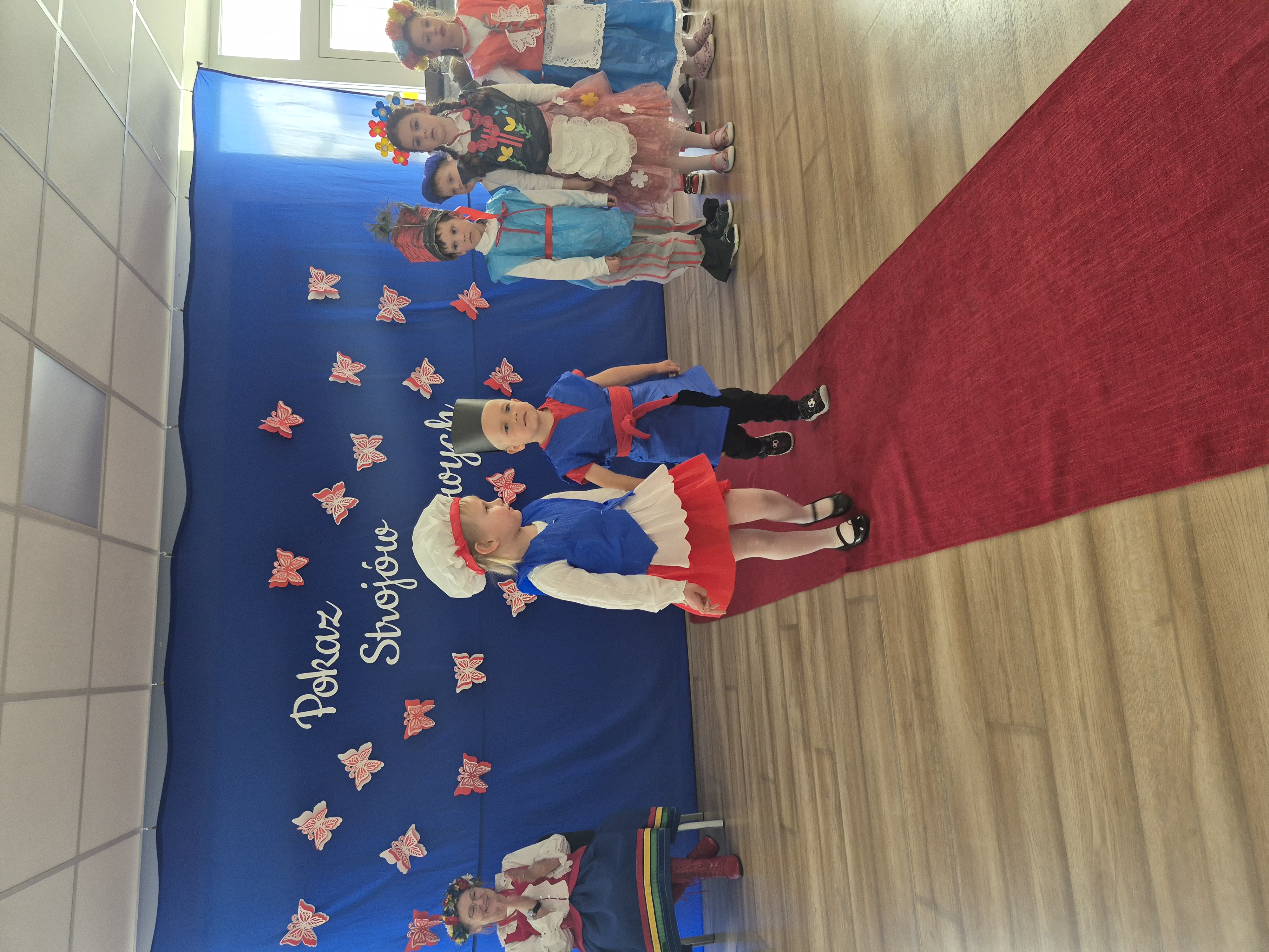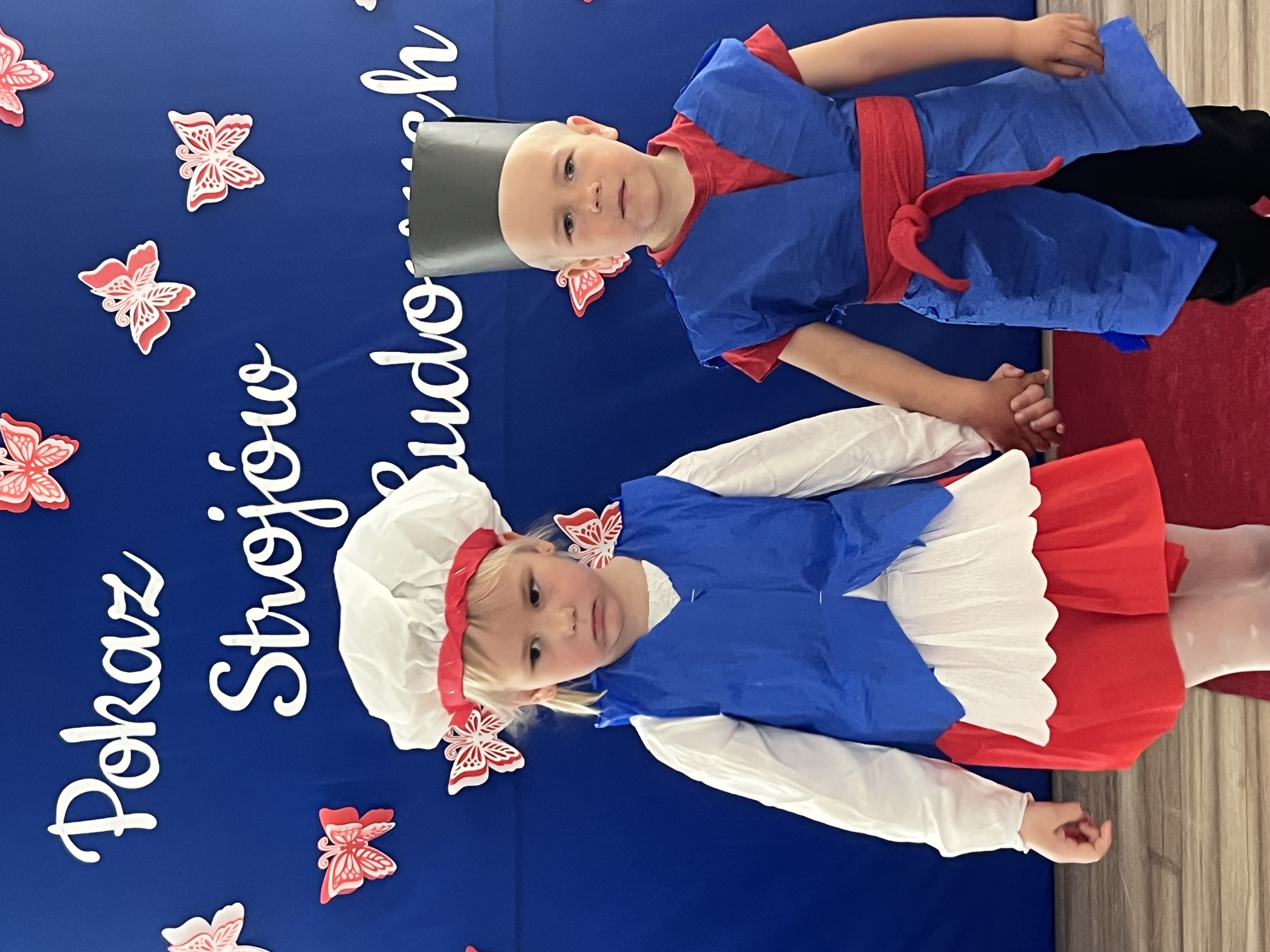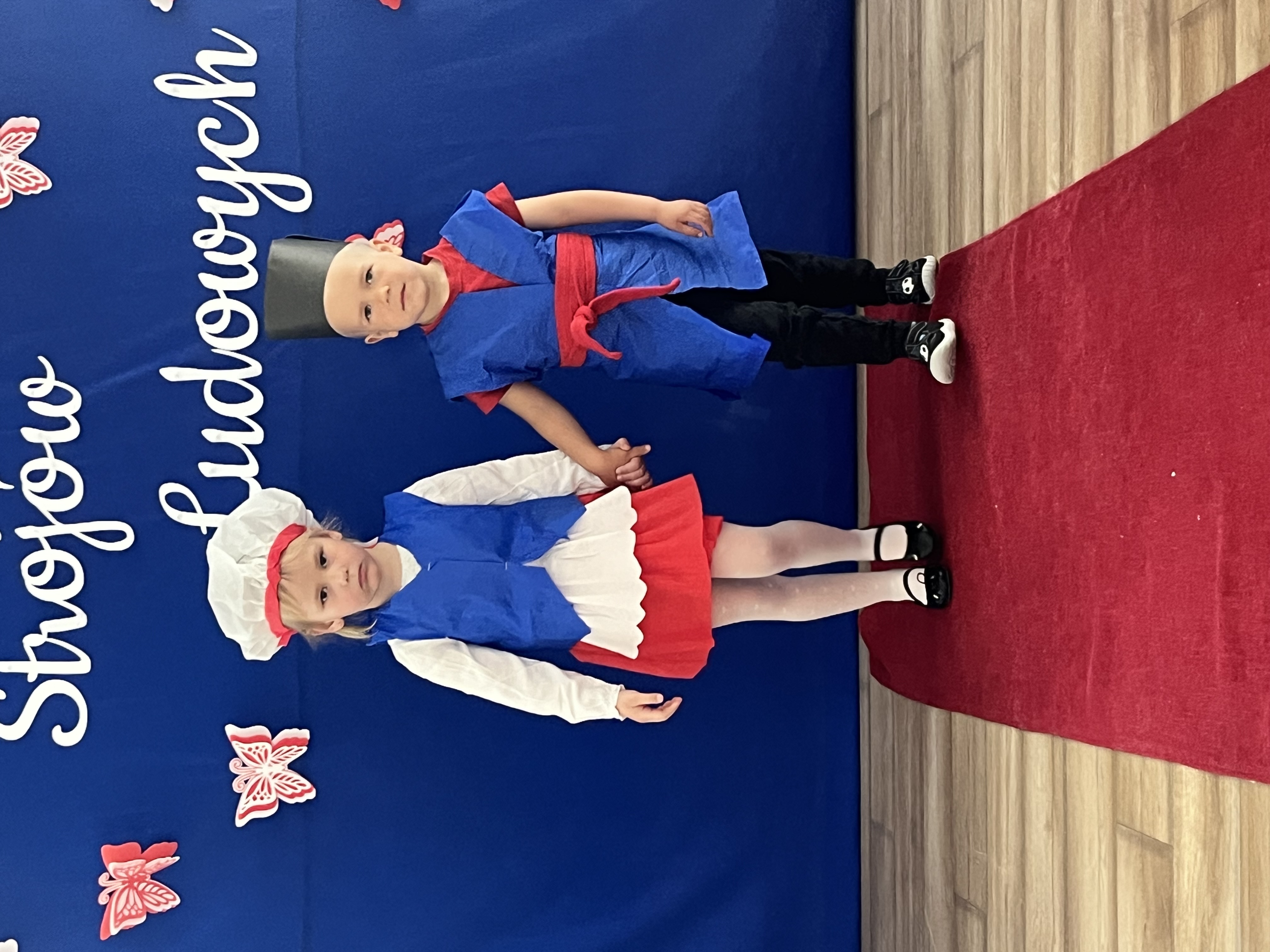 Kolejnym punktem programu był Pokaz Strojów Ludowych, który w tym roku przybrał zupełnie nową formułę. Każda grupa przedszkolna zaprezentowała strój ludowy z wylosowanego wcześniej regionu etnograficznego – Kociewia, Kujaw, Kaszub, Krakowa, Łowicza i Podhala. Co ważne – stroje te zostały wykonane własnoręcznie przez dzieci i nauczycieli z wykorzystaniem materiałów recyklingowych, takich jak: papier, worki, nakrętki, stare tkaniny, tektura czy bibuła. Reprezentanci każdej grupy – chłopiec i dziewczynka – z dumą i uśmiechem na twarzy przeszli po naszym przedszkolnym wybiegu prezentując swoje wyjątkowe kreacje. Pozostali, ubrani w stroje patriotyczne, dopingowali swoich kolegów i koleżanki. Na widowni nie brakowało biało-czerwonych koszulek, opasek, szalików i flag. Całe przedszkole tego dnia tętniło barwami narodowymi i pozytywną energią.