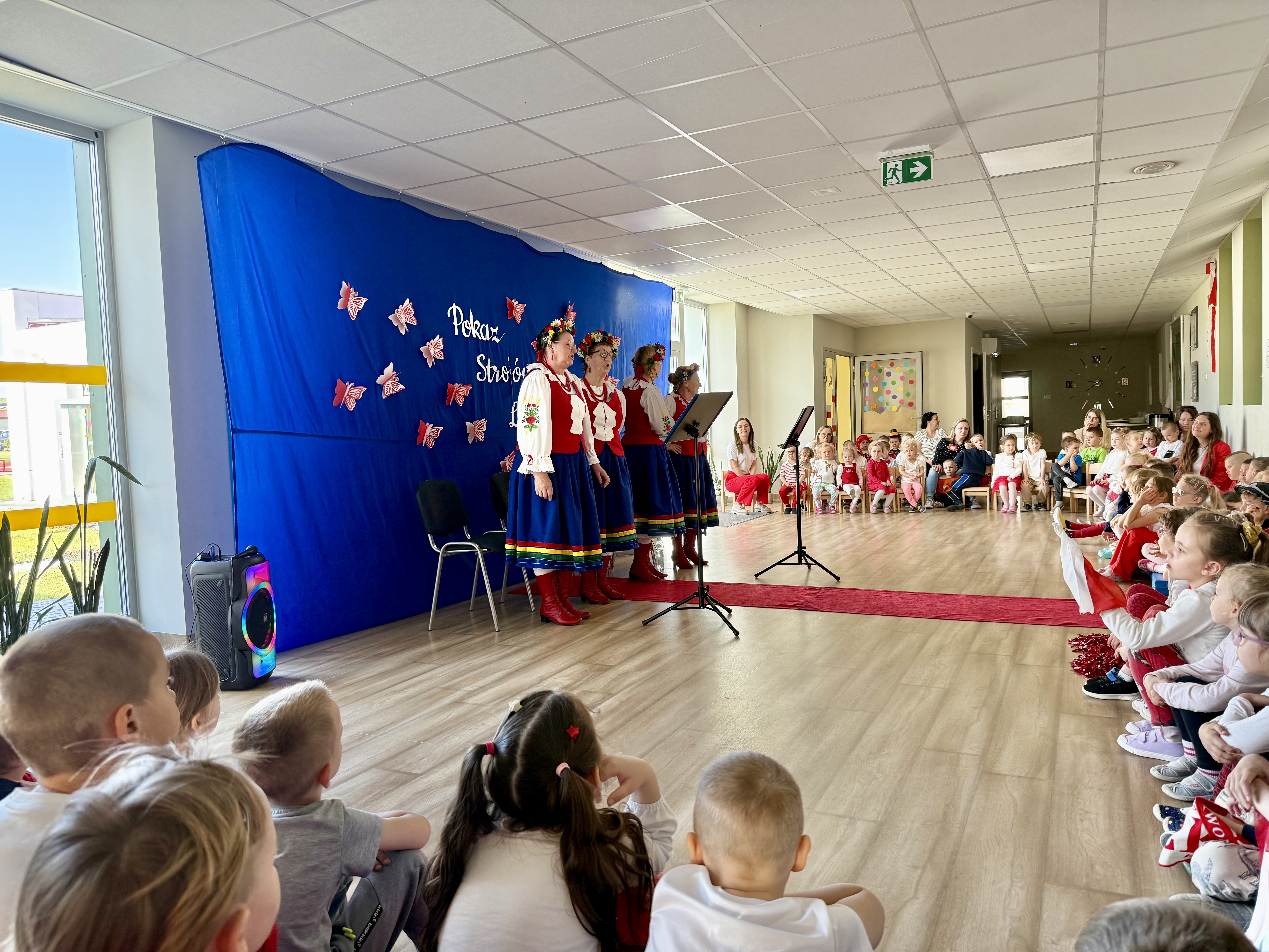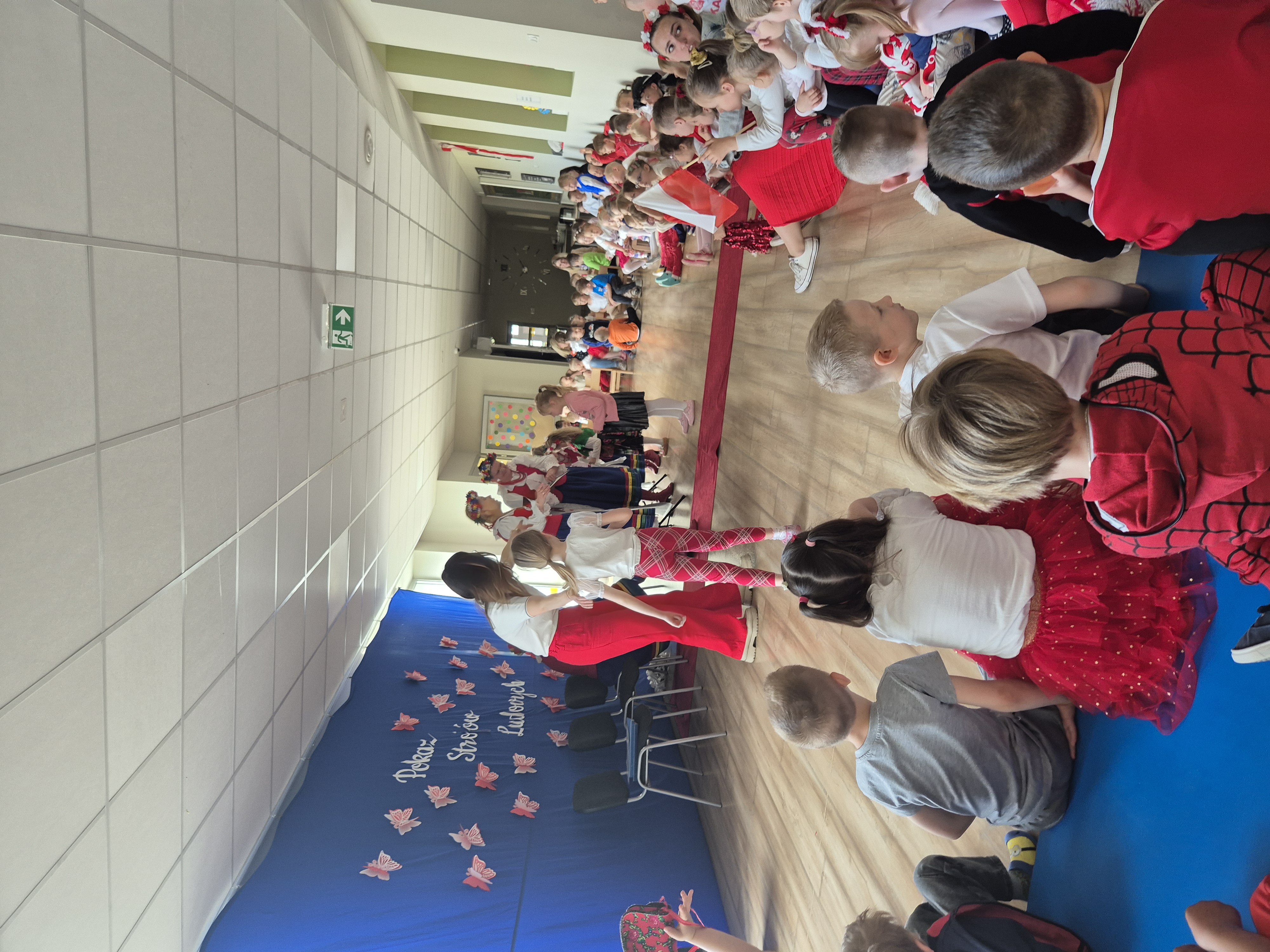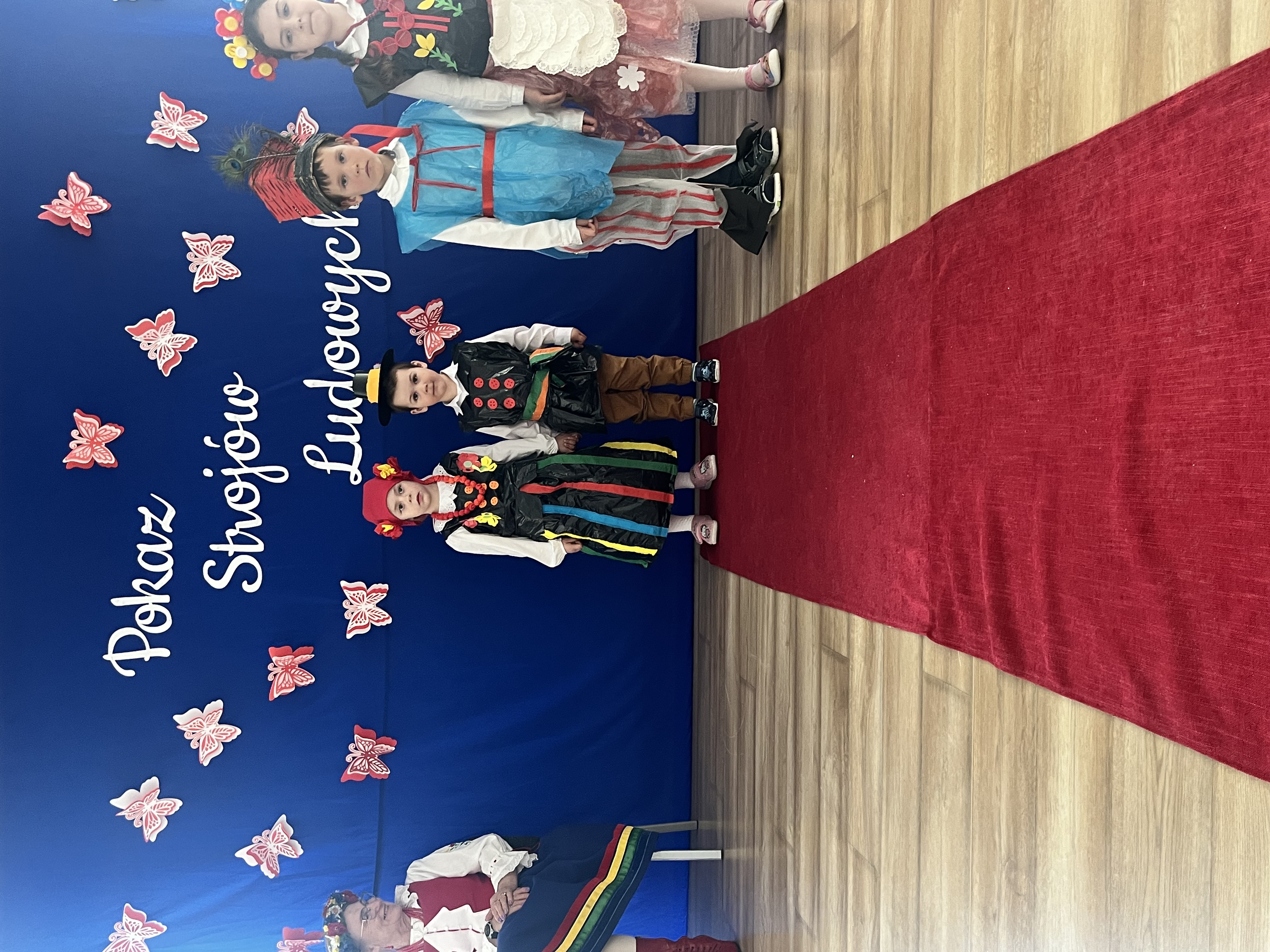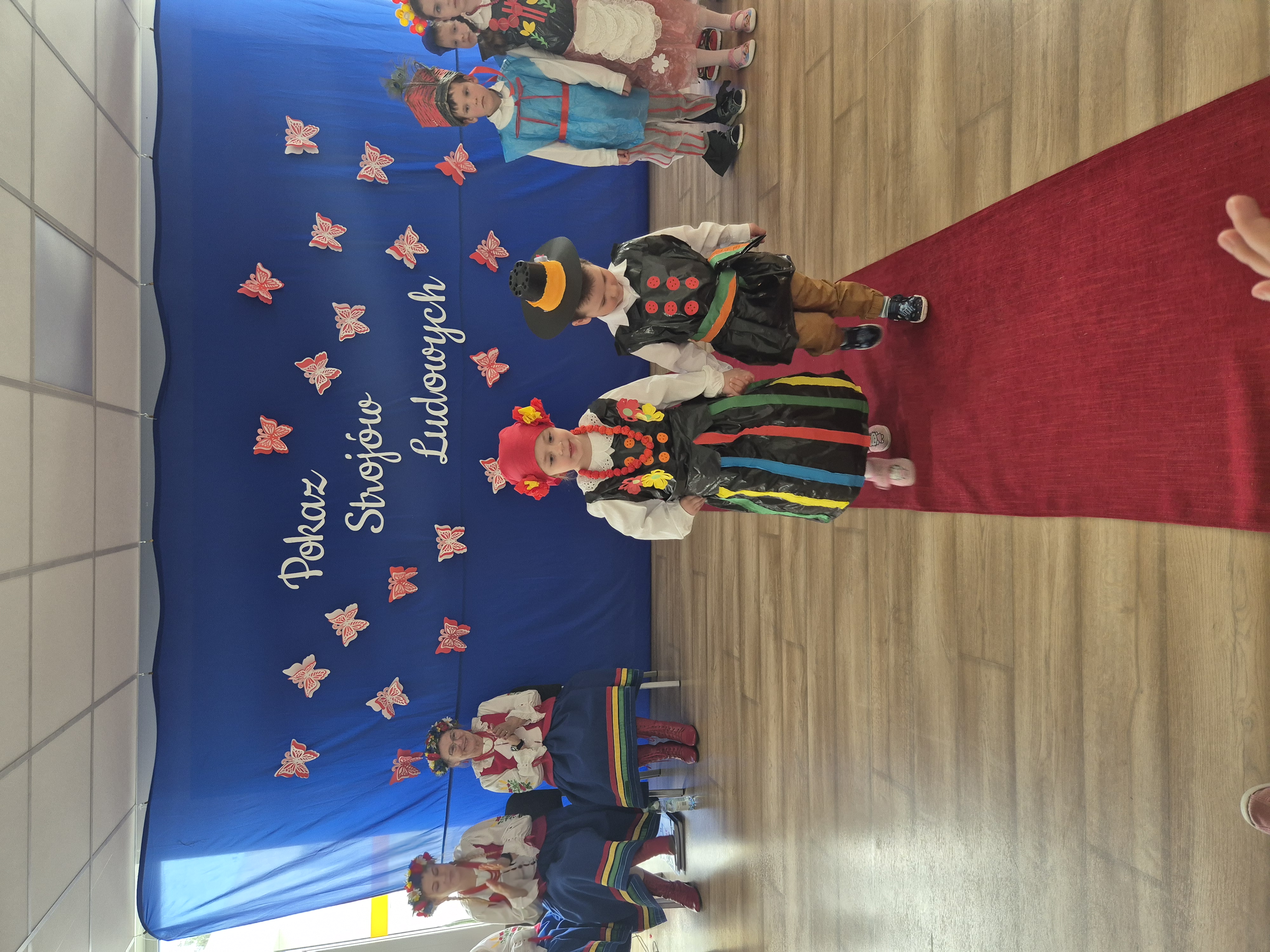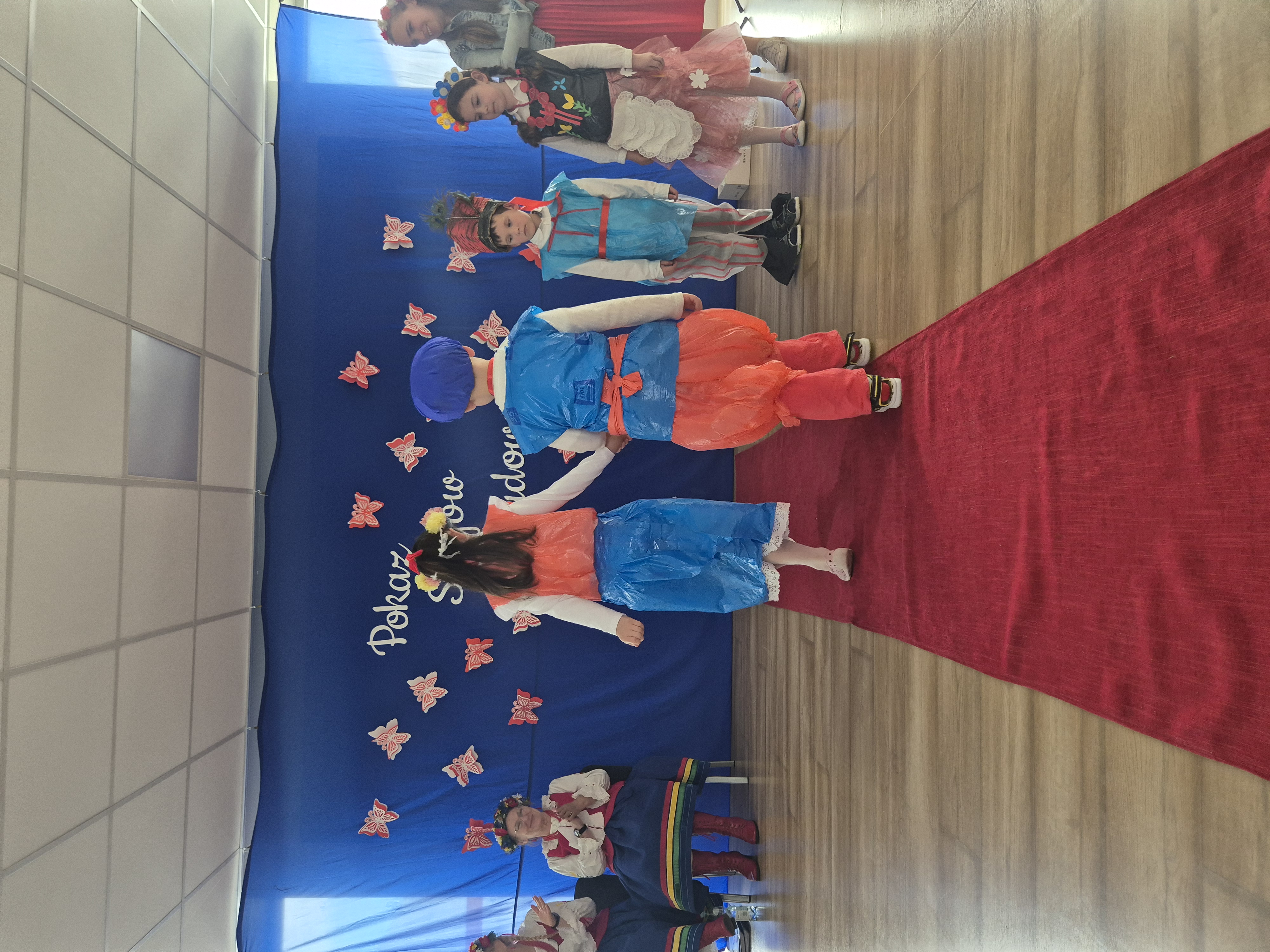 Kolejnym punktem programu był Pokaz Strojów Ludowych, który w tym roku przybrał zupełnie nową formułę. Każda grupa przedszkolna zaprezentowała strój ludowy z wylosowanego wcześniej regionu etnograficznego – Kociewia, Kujaw, Kaszub, Krakowa, Łowicza i Podhala. Co ważne – stroje te zostały wykonane własnoręcznie przez dzieci i nauczycieli z wykorzystaniem materiałów recyklingowych, takich jak: papier, worki, nakrętki, stare tkaniny, tektura czy bibuła. Reprezentanci każdej grupy – chłopiec i dziewczynka – z dumą i uśmiechem na twarzy przeszli po naszym przedszkolnym wybiegu prezentując swoje wyjątkowe kreacje. Pozostali, ubrani w stroje patriotyczne, dopingowali swoich kolegów i koleżanki. Na widowni nie brakowało biało-czerwonych koszulek, opasek, szalików i flag. Całe przedszkole tego dnia tętniło barwami narodowymi i pozytywną energią.