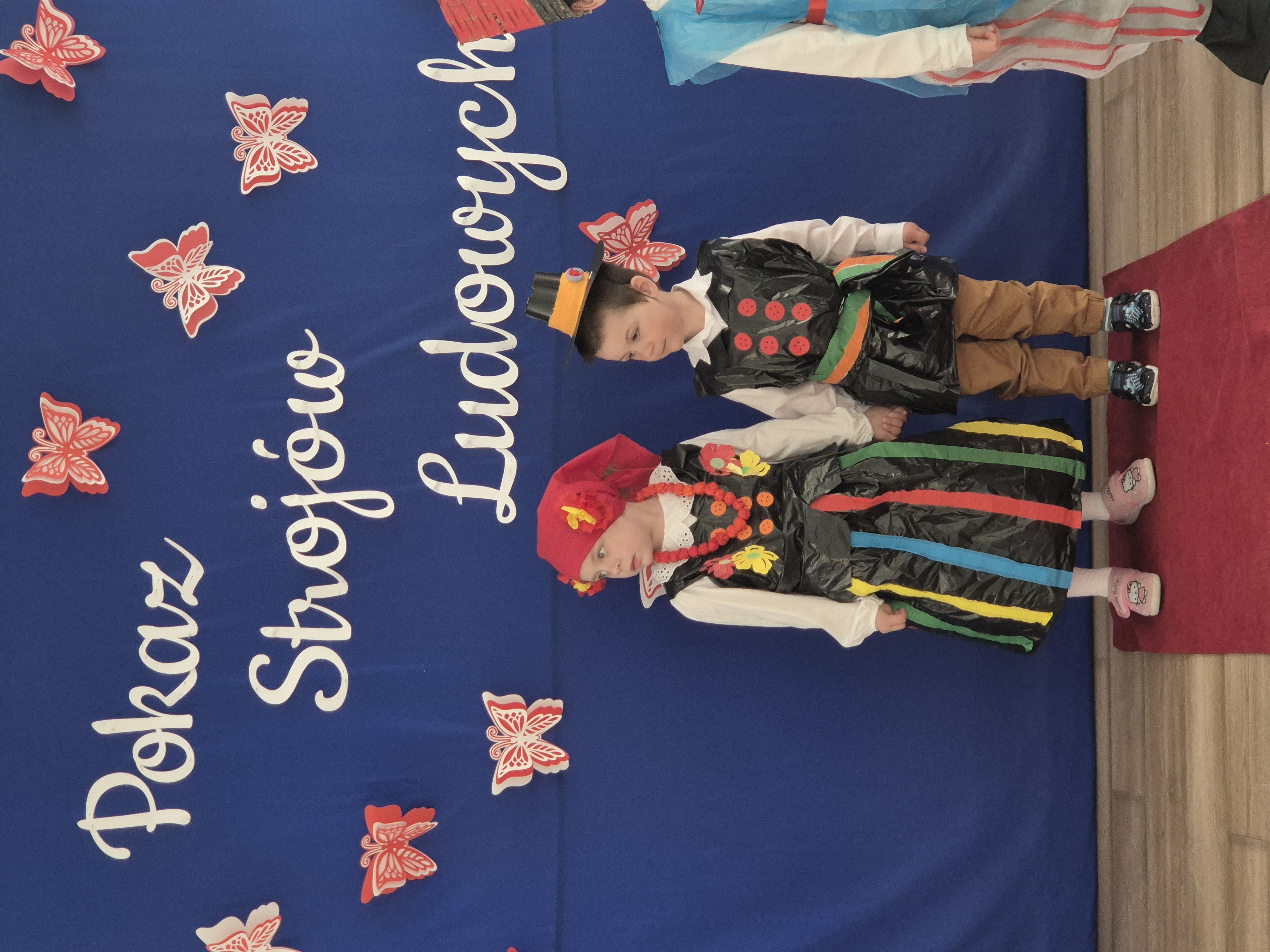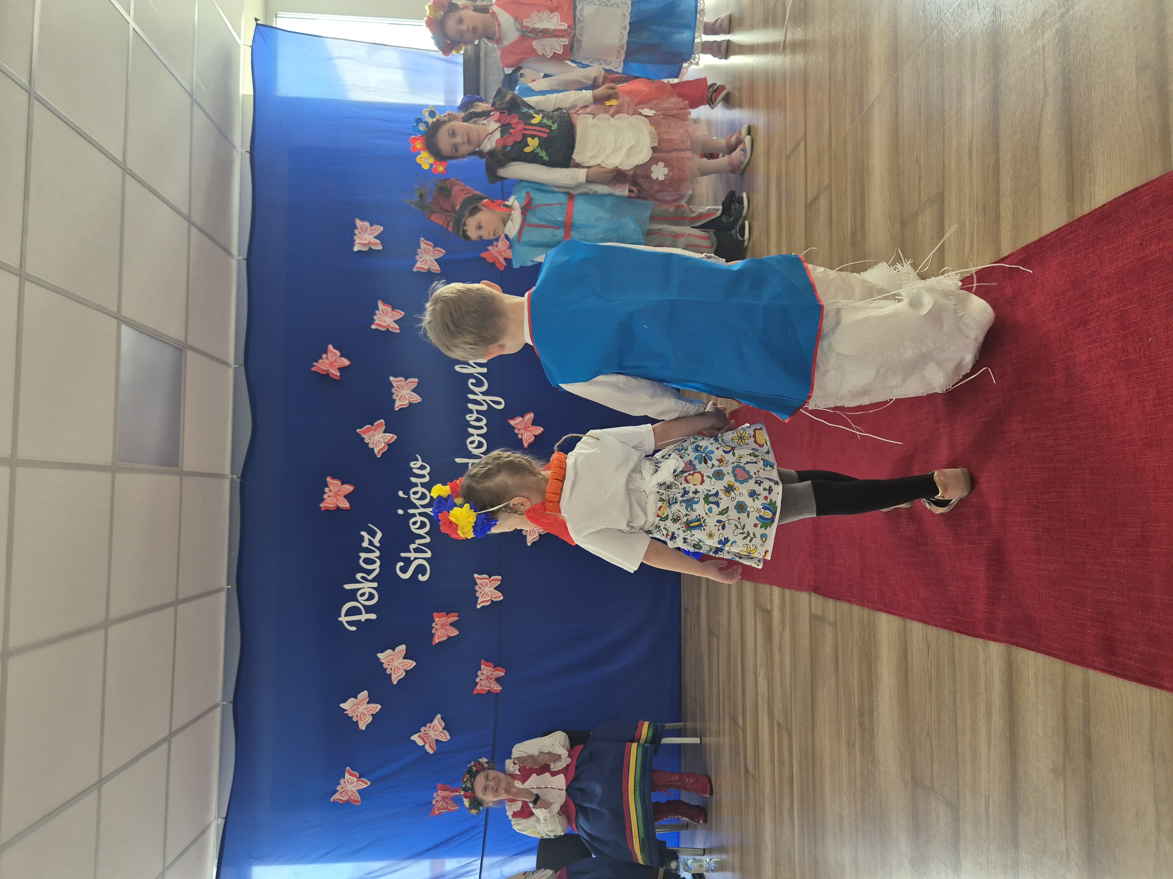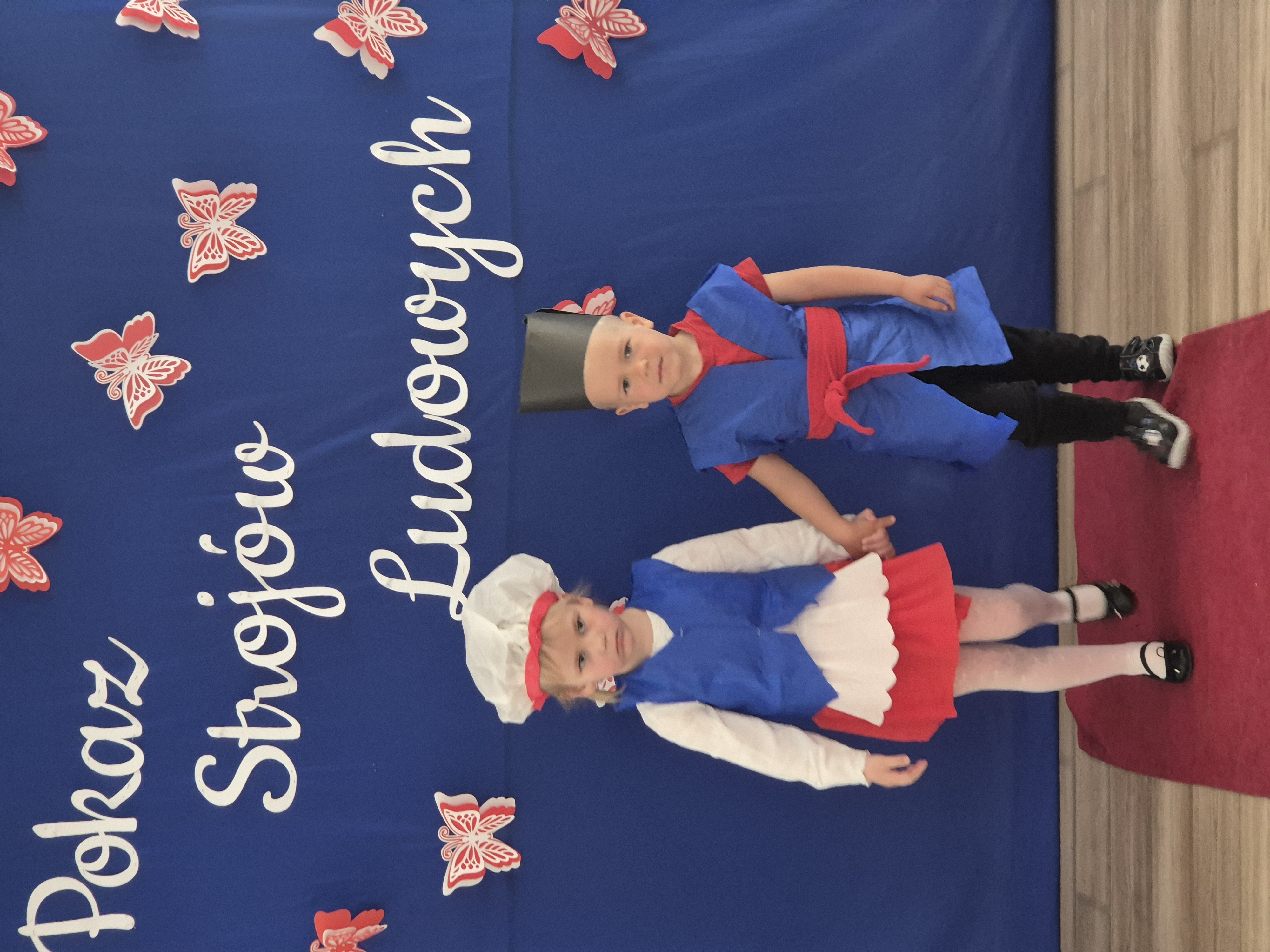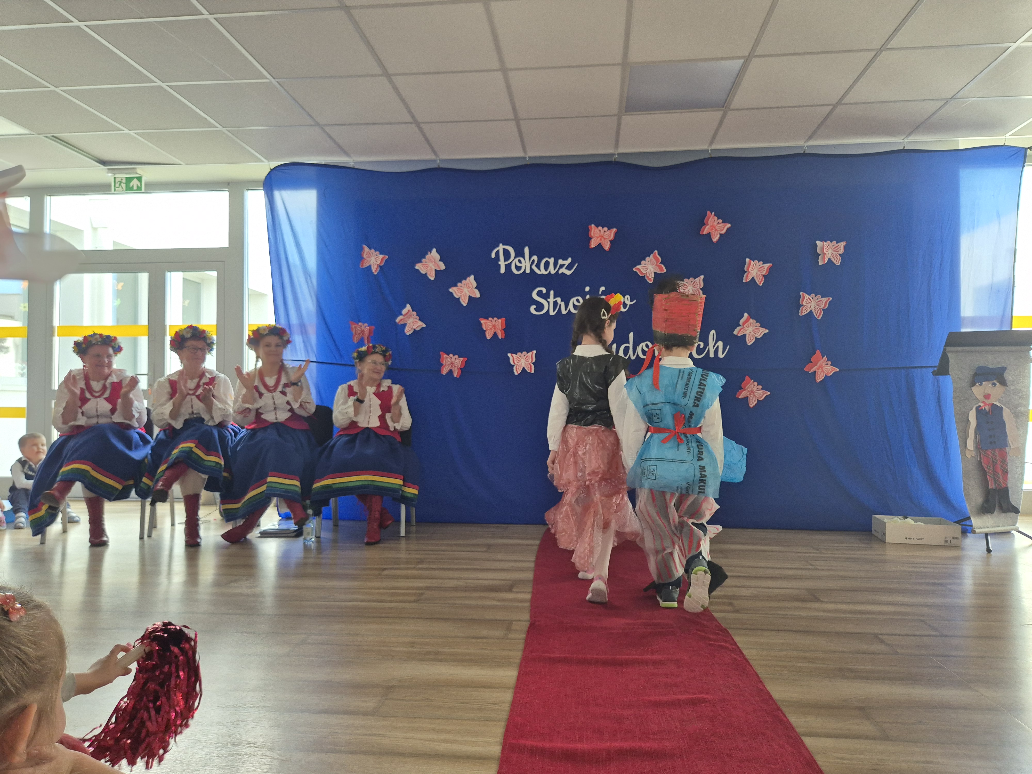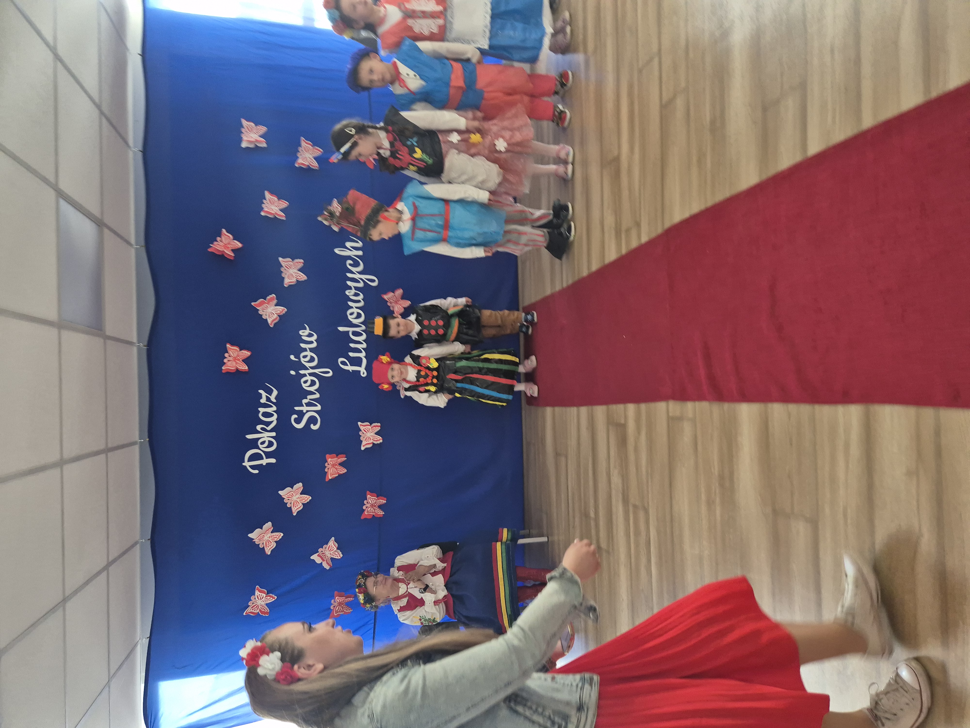 Kolejnym punktem programu był Pokaz Strojów Ludowych, który w tym roku przybrał zupełnie nową formułę. Każda grupa przedszkolna zaprezentowała strój ludowy z wylosowanego wcześniej regionu etnograficznego – Kociewia, Kujaw, Kaszub, Krakowa, Łowicza i Podhala. Co ważne – stroje te zostały wykonane własnoręcznie przez dzieci i nauczycieli z wykorzystaniem materiałów recyklingowych, takich jak: papier, worki, nakrętki, stare tkaniny, tektura czy bibuła. Reprezentanci każdej grupy – chłopiec i dziewczynka – z dumą i uśmiechem na twarzy przeszli po naszym przedszkolnym wybiegu prezentując swoje wyjątkowe kreacje. Pozostali, ubrani w stroje patriotyczne, dopingowali swoich kolegów i koleżanki. Na widowni nie brakowało biało-czerwonych koszulek, opasek, szalików i flag. Całe przedszkole tego dnia tętniło barwami narodowymi i pozytywną energią.