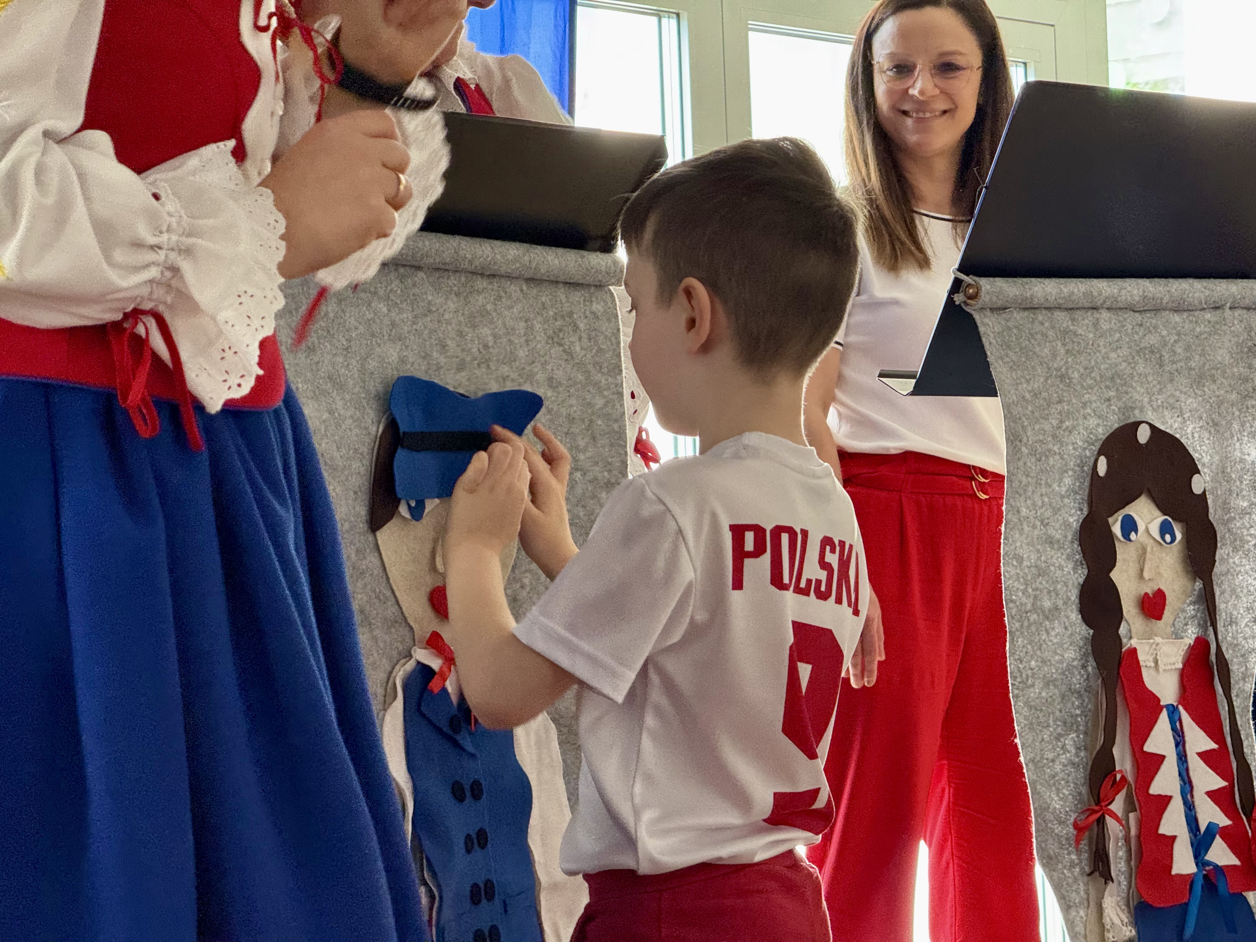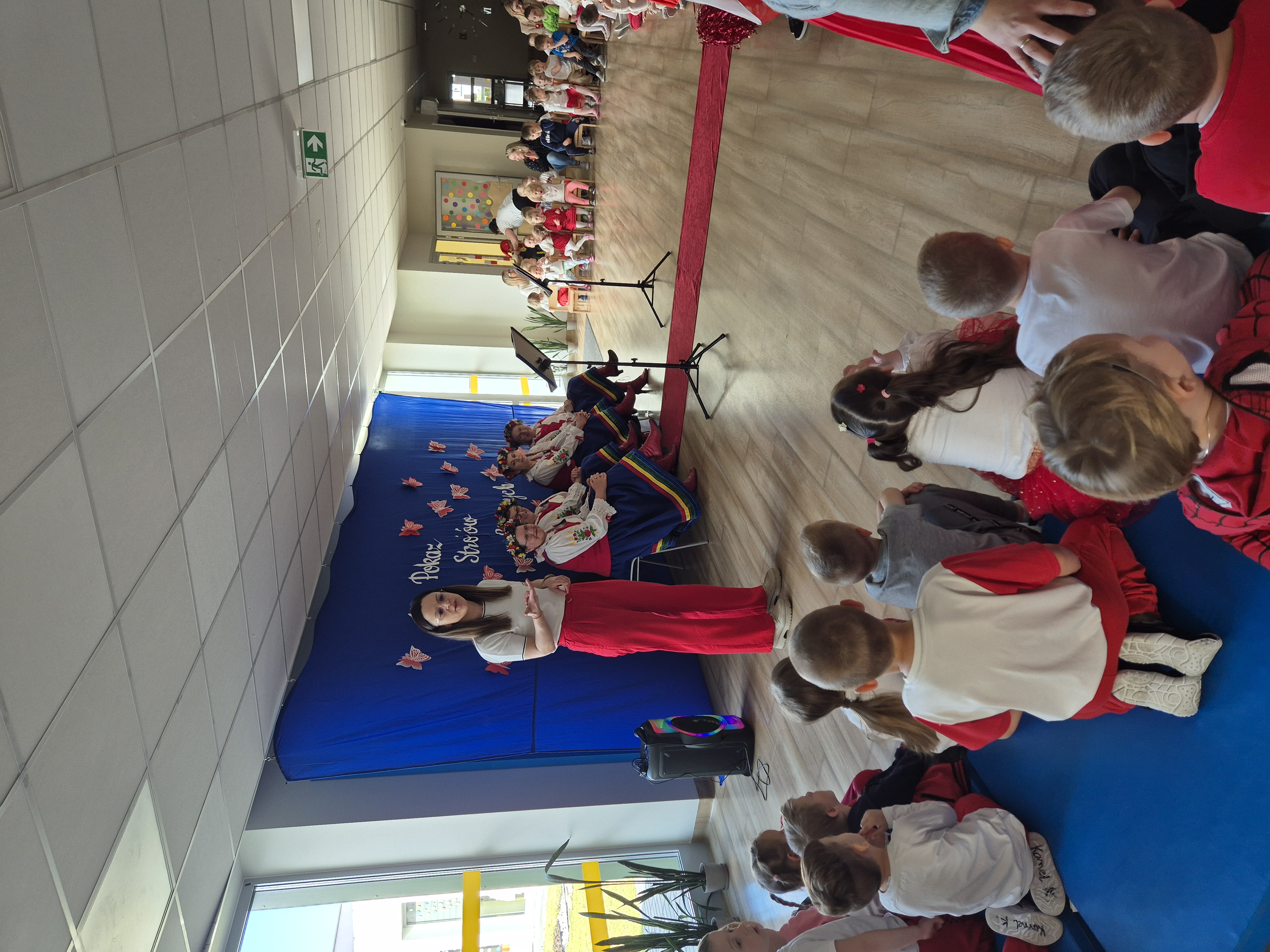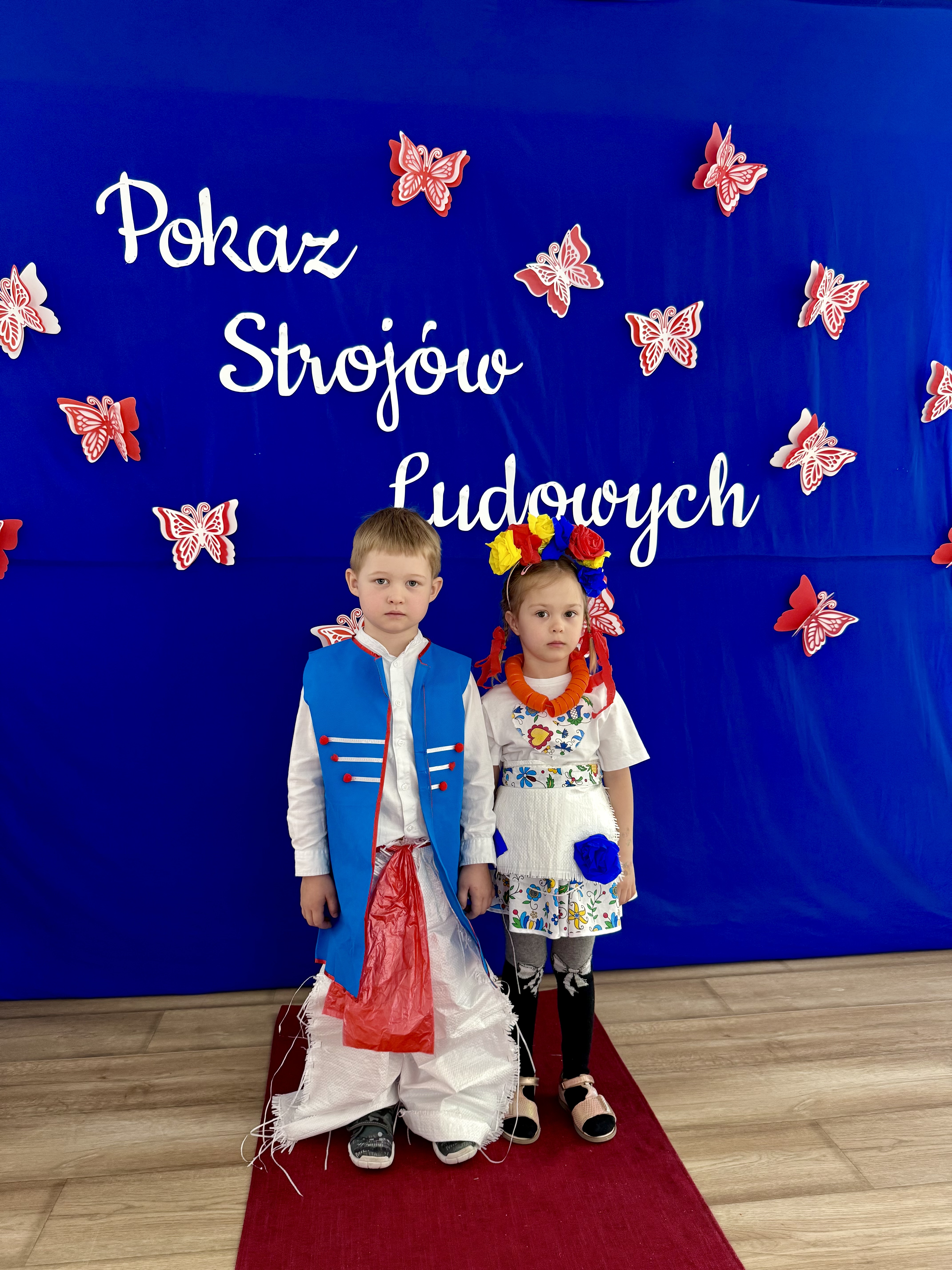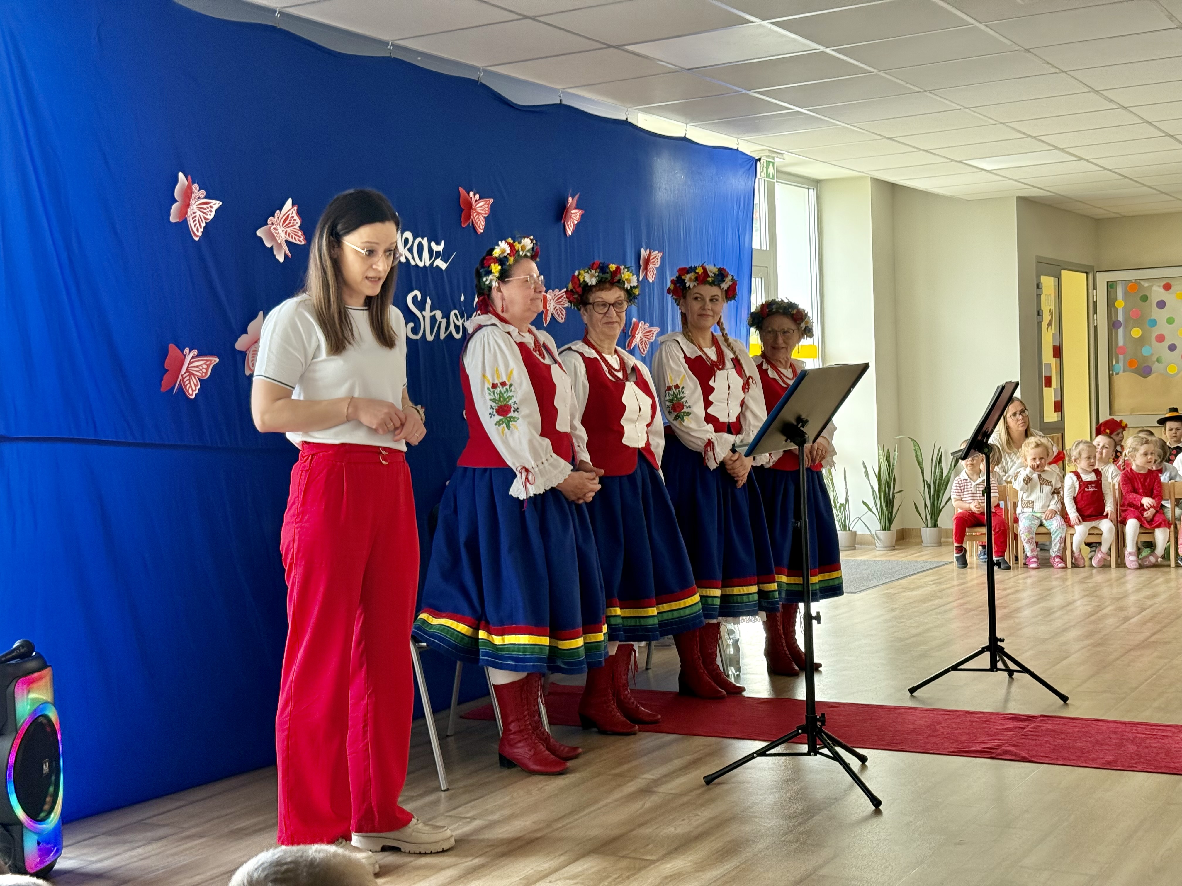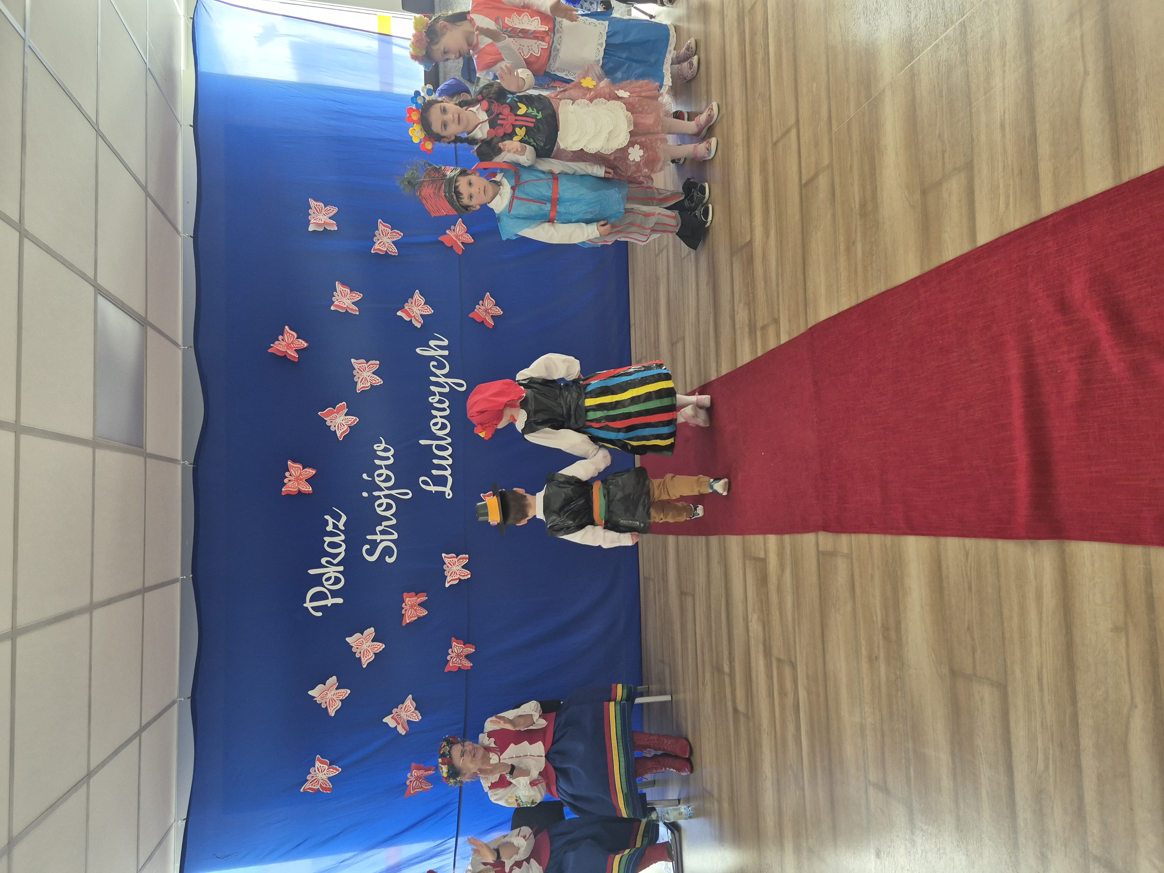 Kolejnym punktem programu był Pokaz Strojów Ludowych, który w tym roku przybrał zupełnie nową formułę. Każda grupa przedszkolna zaprezentowała strój ludowy z wylosowanego wcześniej regionu etnograficznego – Kociewia, Kujaw, Kaszub, Krakowa, Łowicza i Podhala. Co ważne – stroje te zostały wykonane własnoręcznie przez dzieci i nauczycieli z wykorzystaniem materiałów recyklingowych, takich jak: papier, worki, nakrętki, stare tkaniny, tektura czy bibuła. Reprezentanci każdej grupy – chłopiec i dziewczynka – z dumą i uśmiechem na twarzy przeszli po naszym przedszkolnym wybiegu prezentując swoje wyjątkowe kreacje. Pozostali, ubrani w stroje patriotyczne, dopingowali swoich kolegów i koleżanki. Na widowni nie brakowało biało-czerwonych koszulek, opasek, szalików i flag. Całe przedszkole tego dnia tętniło barwami narodowymi i pozytywną energią.