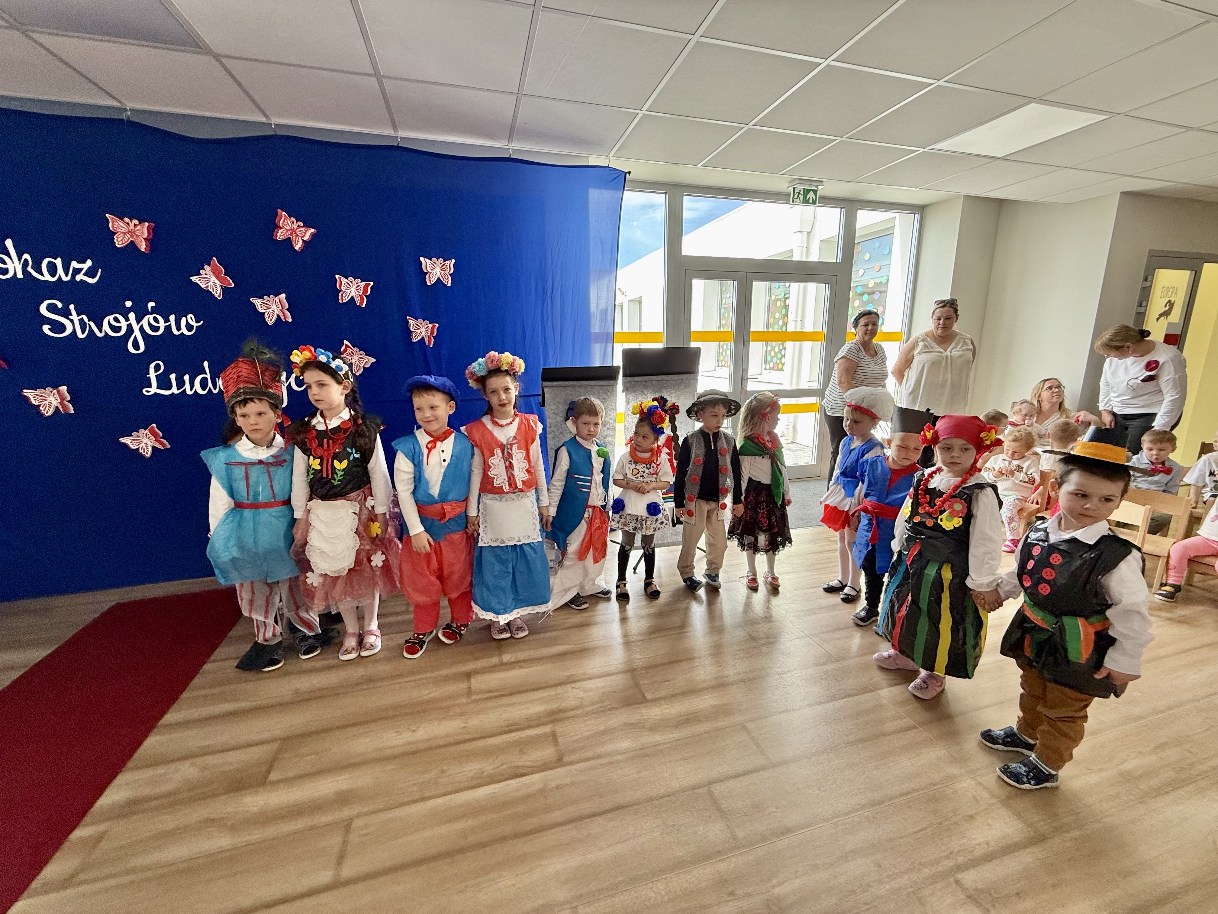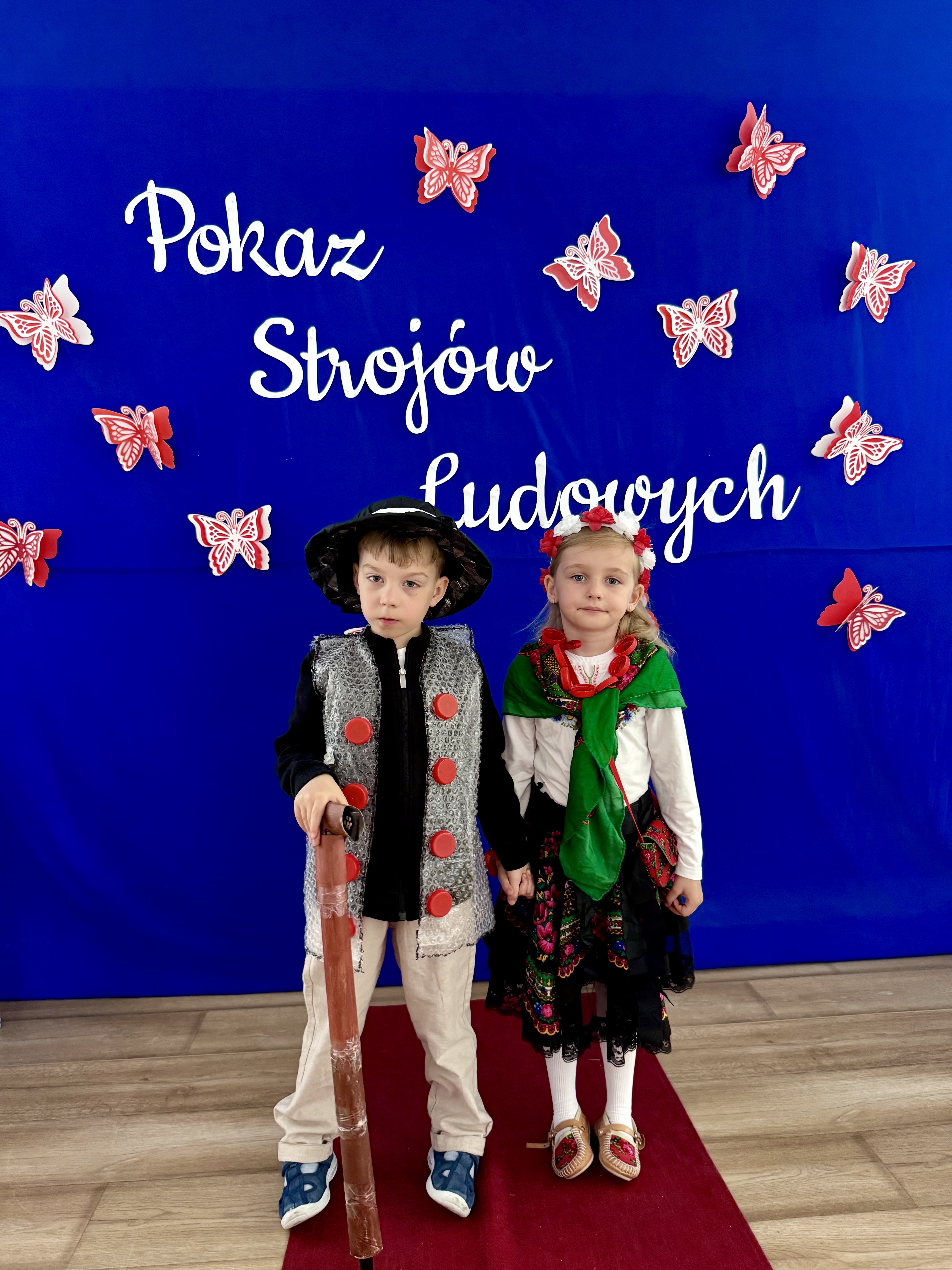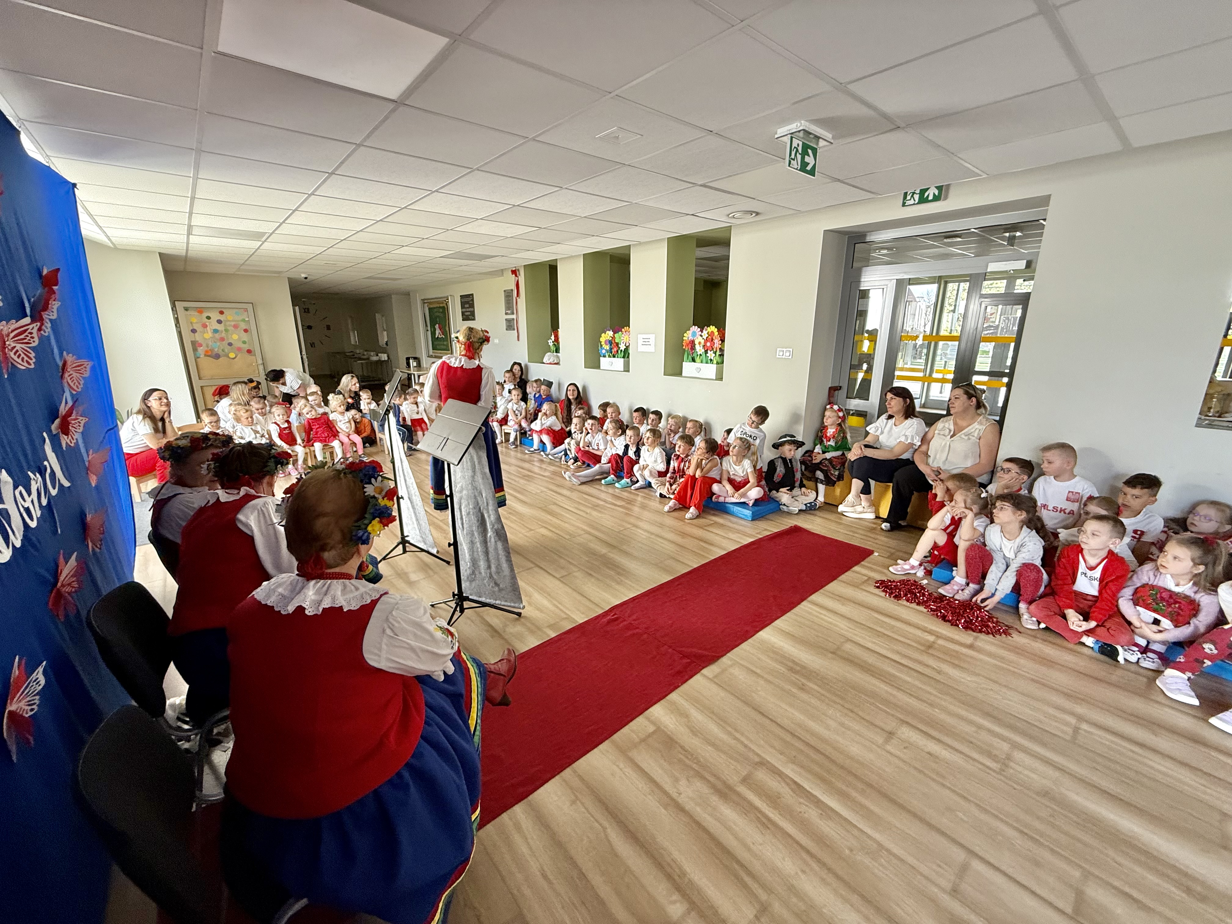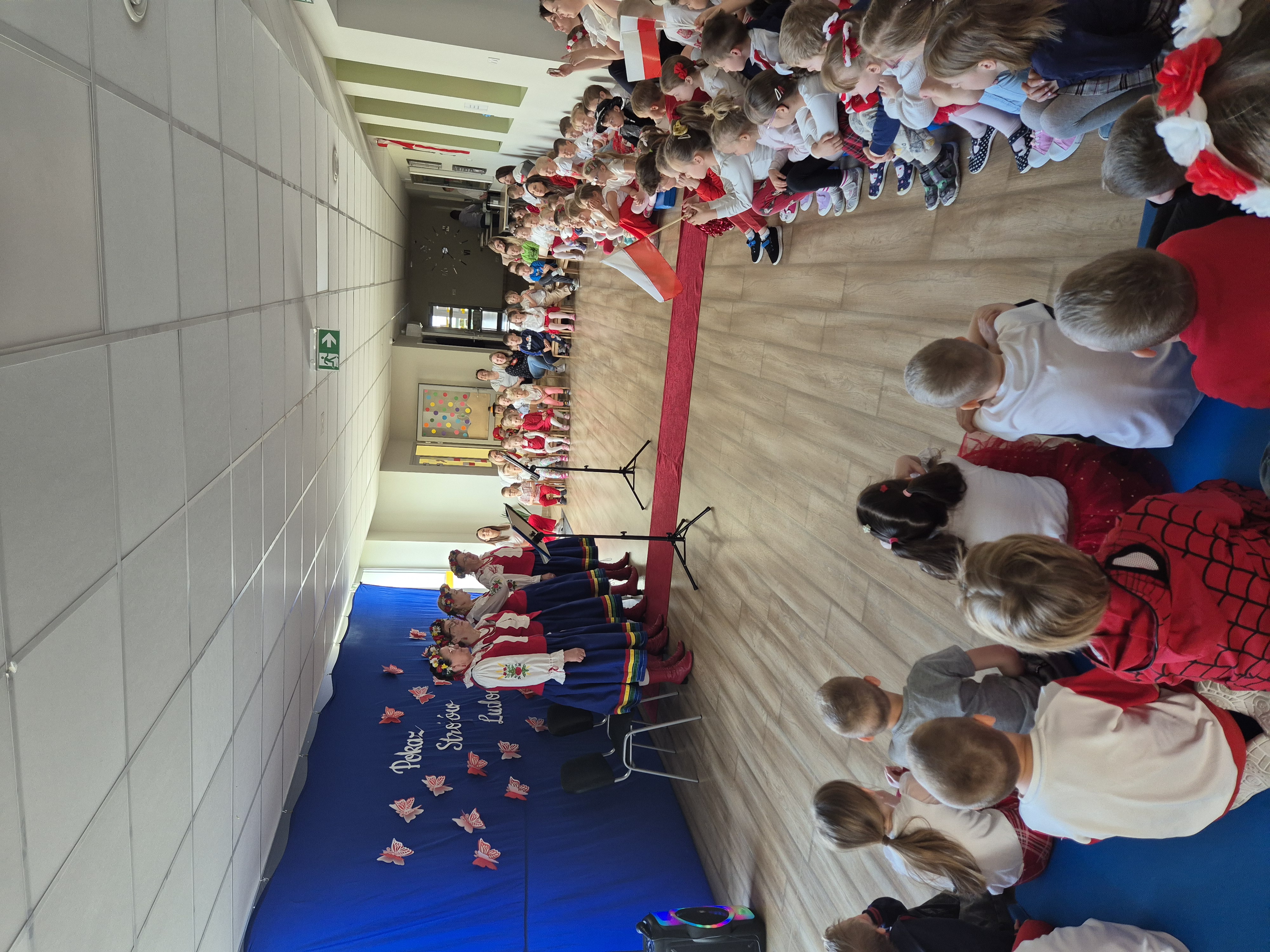 Kolejnym punktem programu był Pokaz Strojów Ludowych, który w tym roku przybrał zupełnie nową formułę. Każda grupa przedszkolna zaprezentowała strój ludowy z wylosowanego wcześniej regionu etnograficznego – Kociewia, Kujaw, Kaszub, Krakowa, Łowicza i Podhala. Co ważne – stroje te zostały wykonane własnoręcznie przez dzieci i nauczycieli z wykorzystaniem materiałów recyklingowych, takich jak: papier, worki, nakrętki, stare tkaniny, tektura czy bibuła. Reprezentanci każdej grupy – chłopiec i dziewczynka – z dumą i uśmiechem na twarzy przeszli po naszym przedszkolnym wybiegu prezentując swoje wyjątkowe kreacje. Pozostali, ubrani w stroje patriotyczne, dopingowali swoich kolegów i koleżanki. Na widowni nie brakowało biało-czerwonych koszulek, opasek, szalików i flag. Całe przedszkole tego dnia tętniło barwami narodowymi i pozytywną energią.