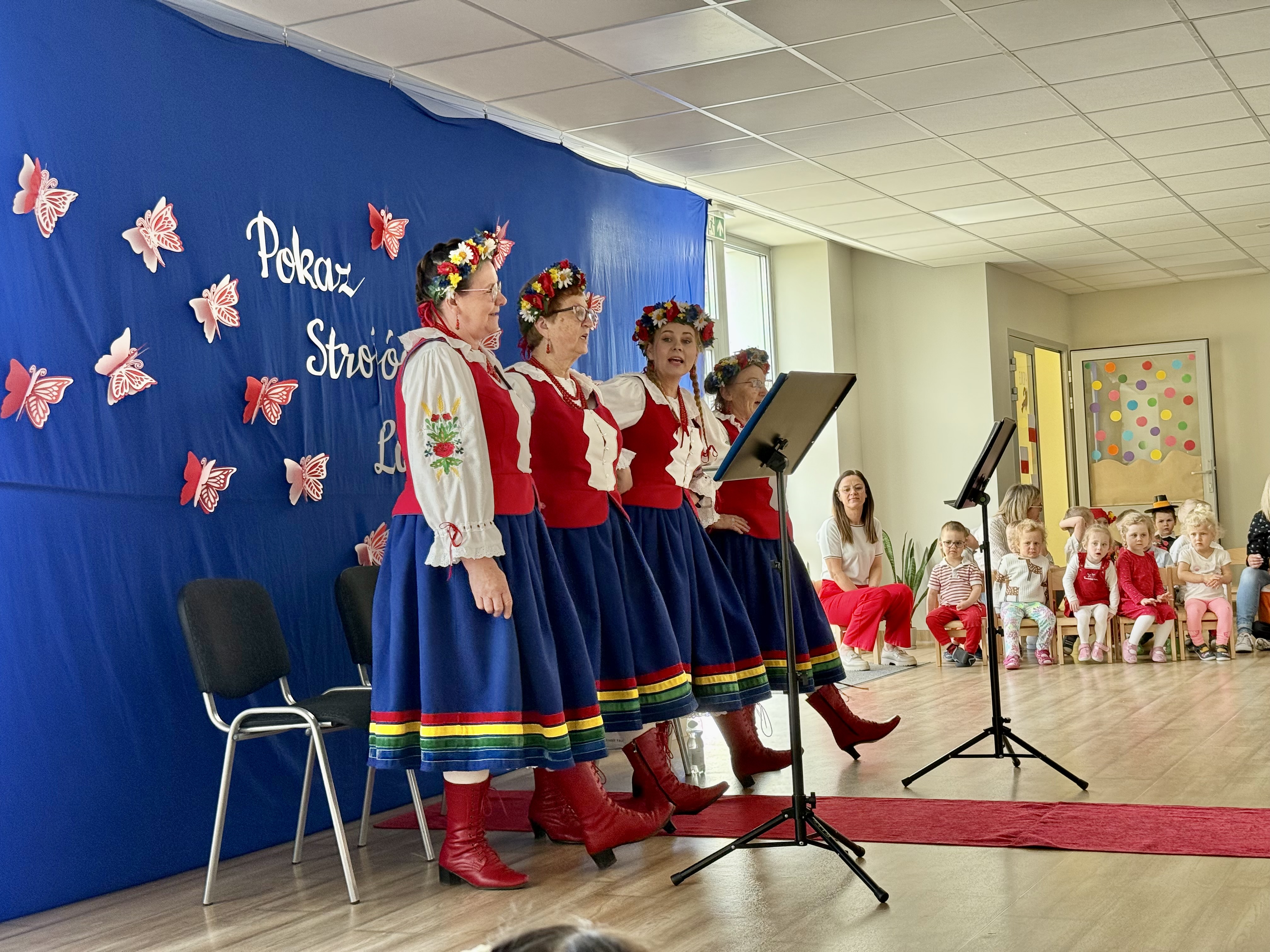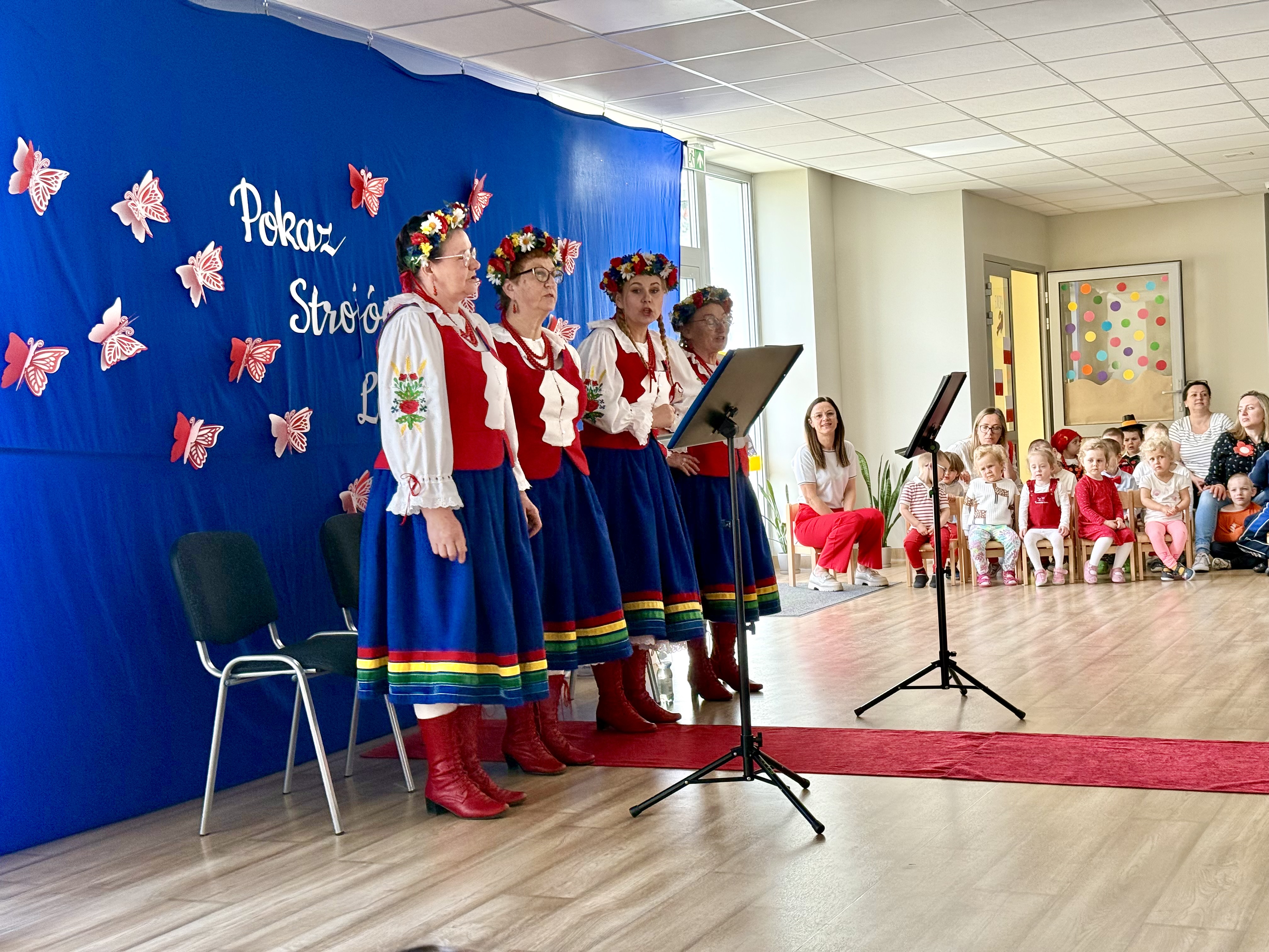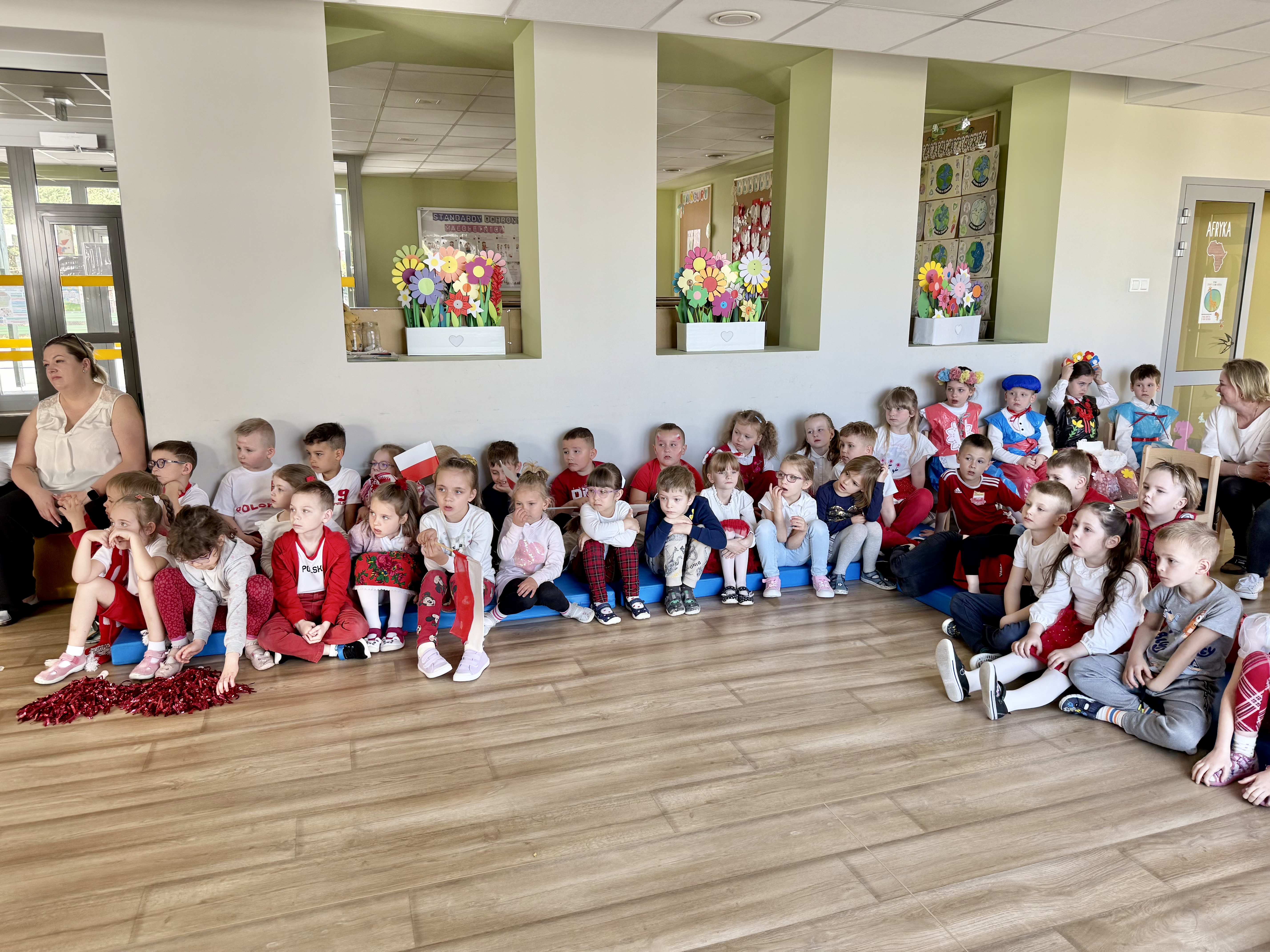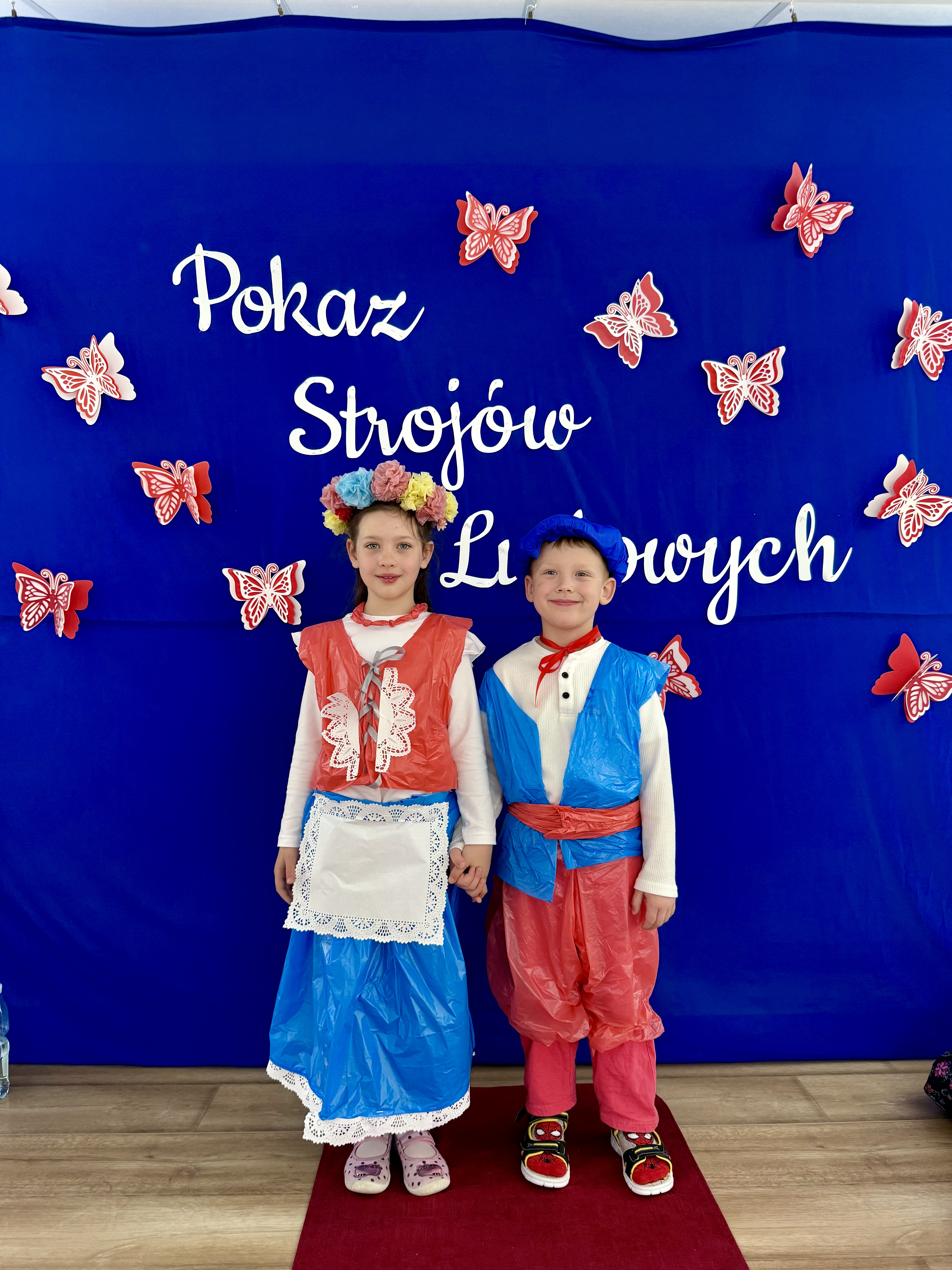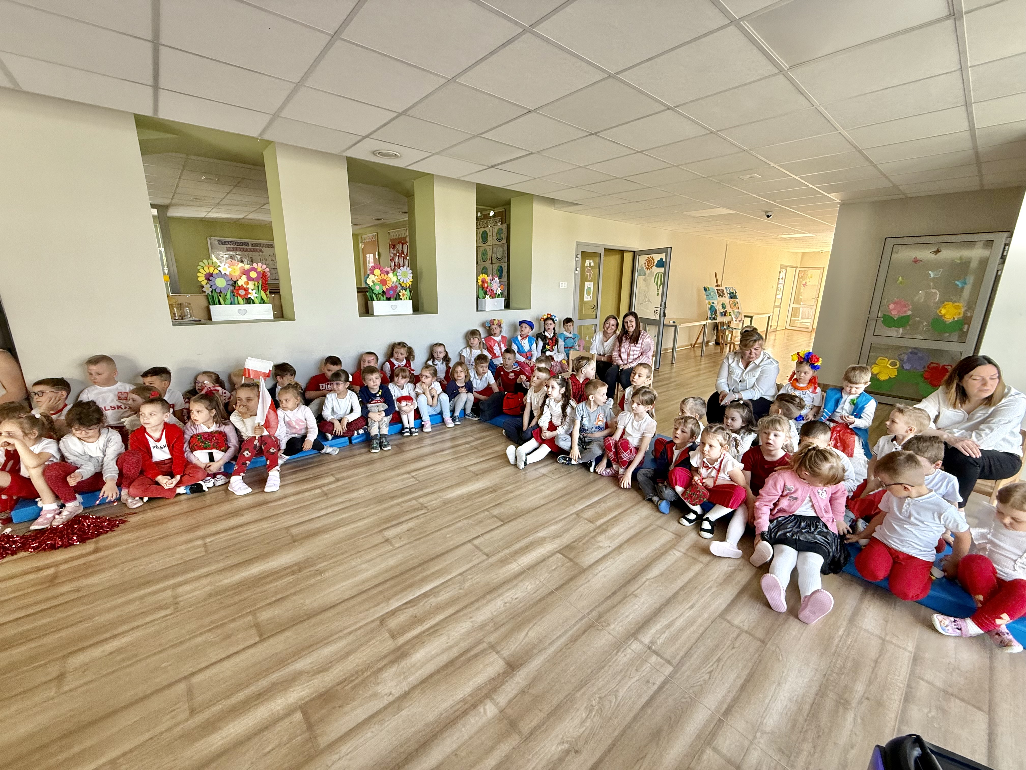 Kolejnym punktem programu był Pokaz Strojów Ludowych, który w tym roku przybrał zupełnie nową formułę. Każda grupa przedszkolna zaprezentowała strój ludowy z wylosowanego wcześniej regionu etnograficznego – Kociewia, Kujaw, Kaszub, Krakowa, Łowicza i Podhala. Co ważne – stroje te zostały wykonane własnoręcznie przez dzieci i nauczycieli z wykorzystaniem materiałów recyklingowych, takich jak: papier, worki, nakrętki, stare tkaniny, tektura czy bibuła. Reprezentanci każdej grupy – chłopiec i dziewczynka – z dumą i uśmiechem na twarzy przeszli po naszym przedszkolnym wybiegu prezentując swoje wyjątkowe kreacje. Pozostali, ubrani w stroje patriotyczne, dopingowali swoich kolegów i koleżanki. Na widowni nie brakowało biało-czerwonych koszulek, opasek, szalików i flag. Całe przedszkole tego dnia tętniło barwami narodowymi i pozytywną energią.