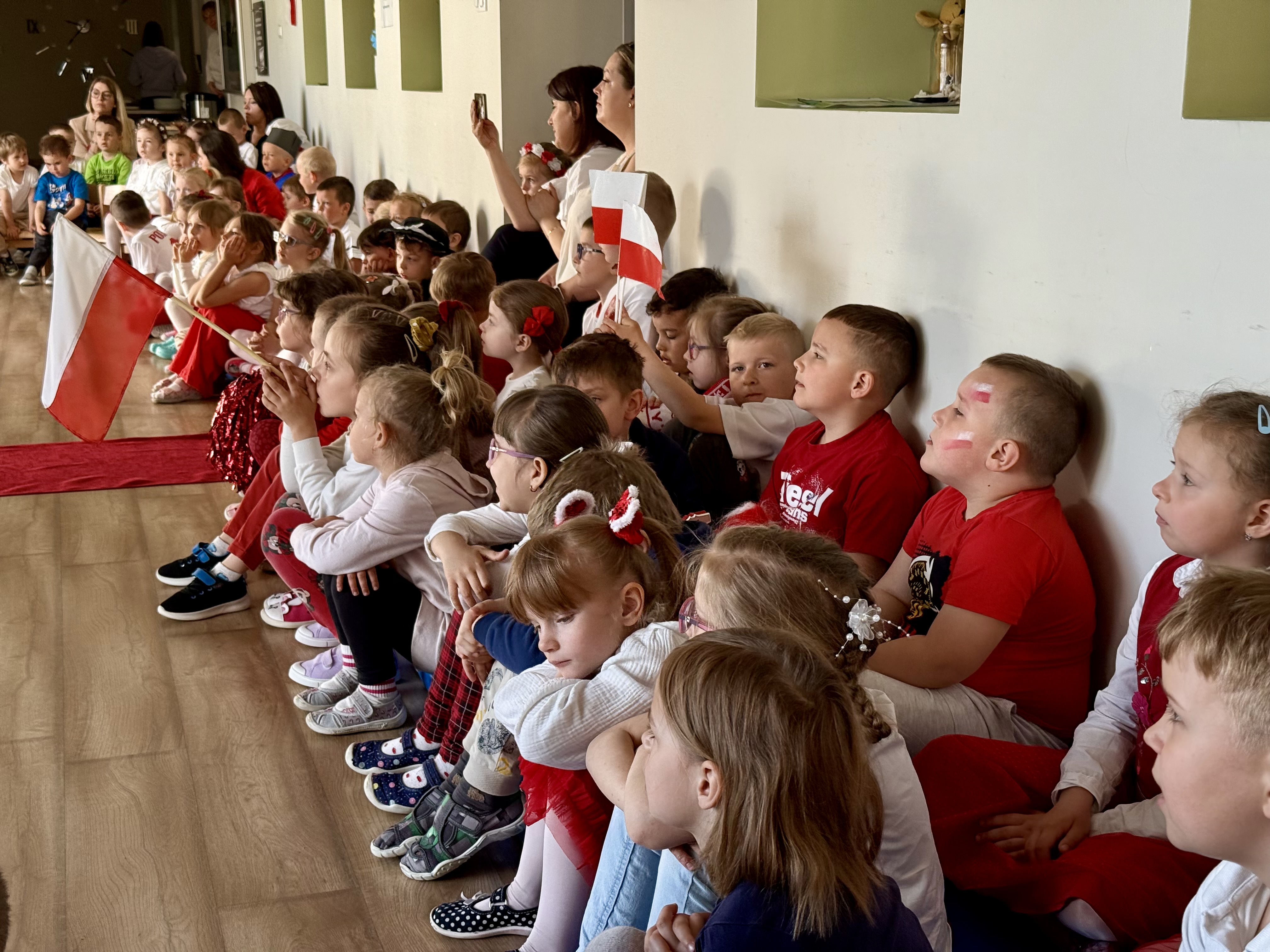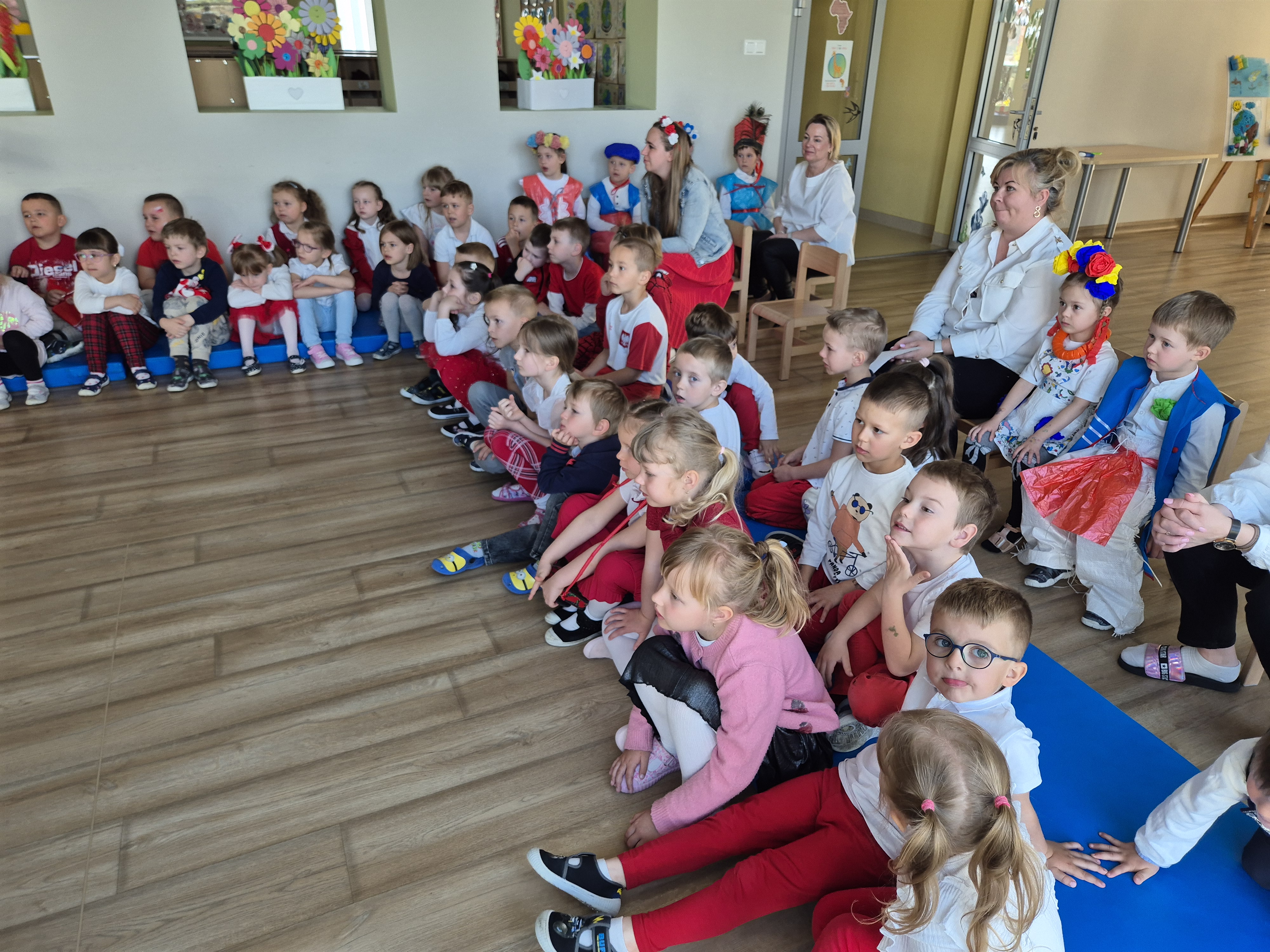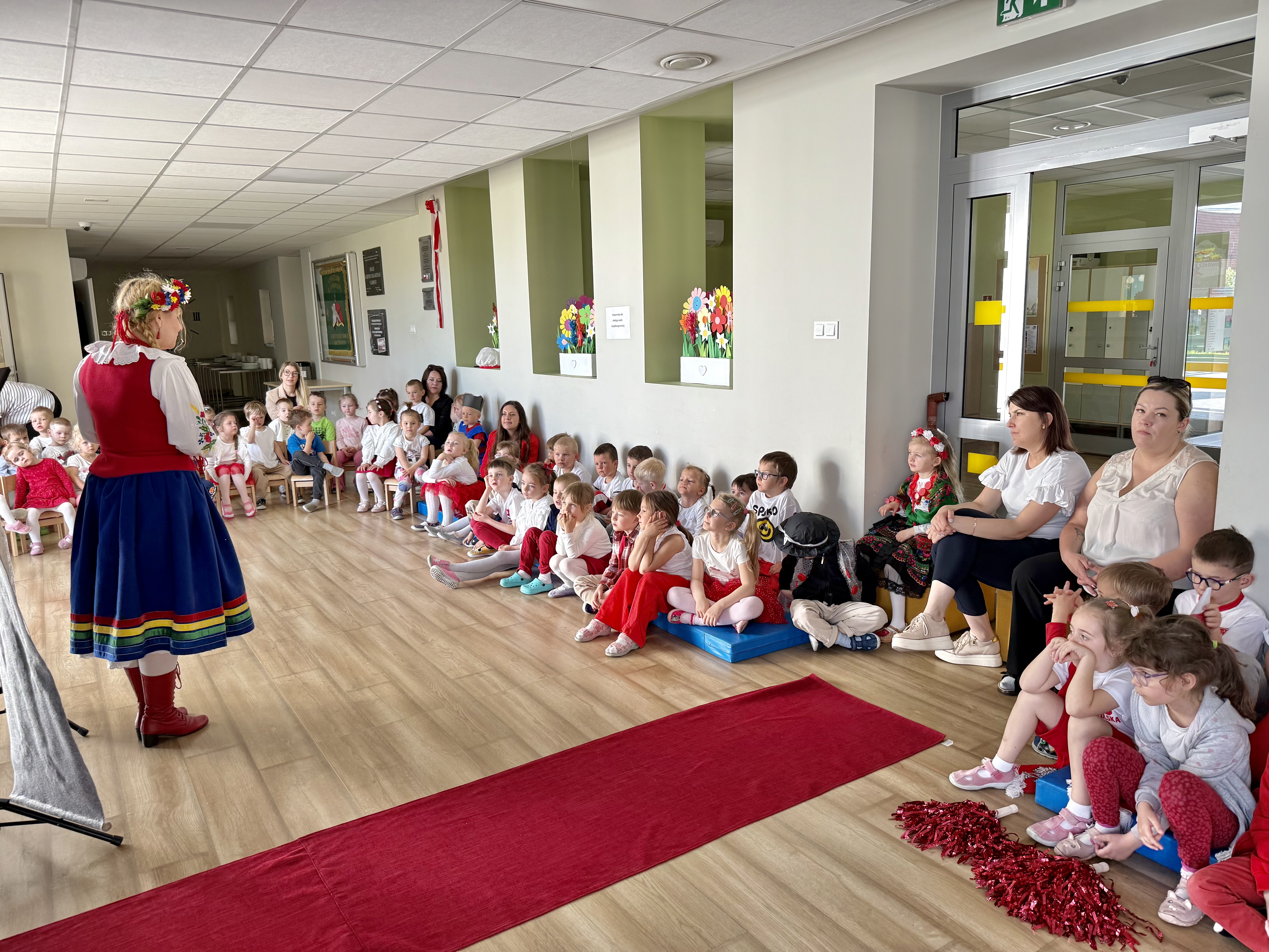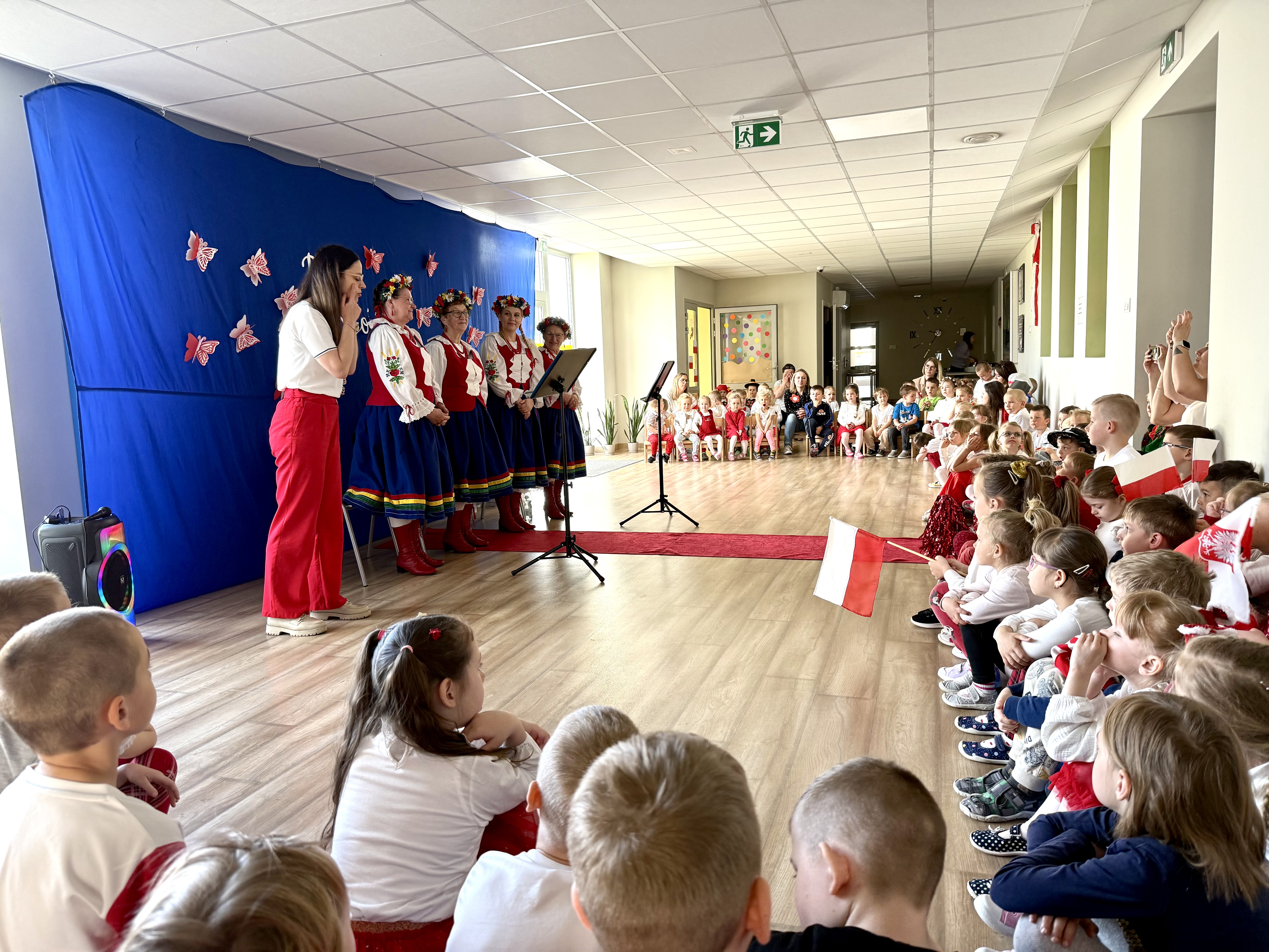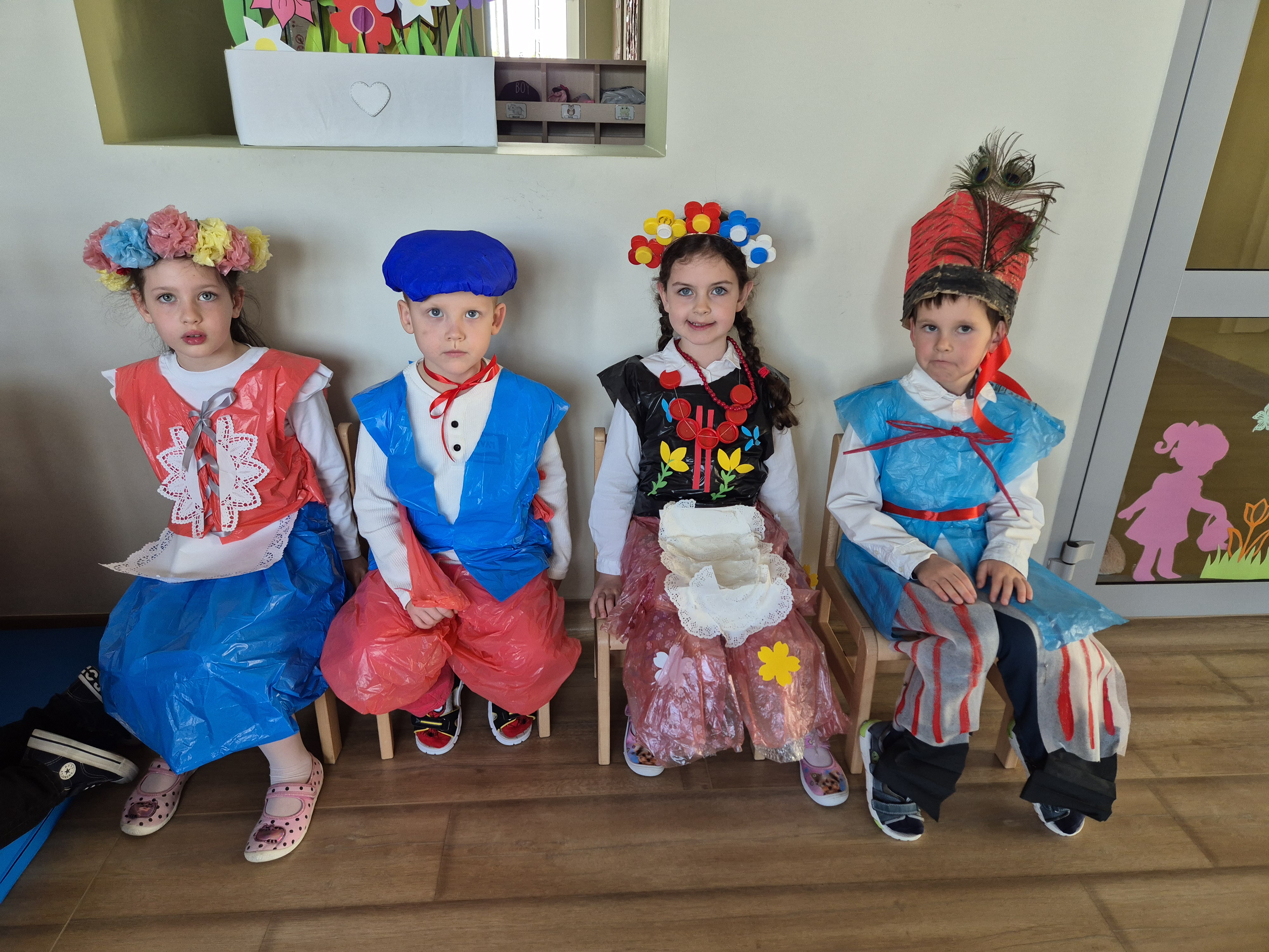 Kolejnym punktem programu był Pokaz Strojów Ludowych, który w tym roku przybrał zupełnie nową formułę. Każda grupa przedszkolna zaprezentowała strój ludowy z wylosowanego wcześniej regionu etnograficznego – Kociewia, Kujaw, Kaszub, Krakowa, Łowicza i Podhala. Co ważne – stroje te zostały wykonane własnoręcznie przez dzieci i nauczycieli z wykorzystaniem materiałów recyklingowych, takich jak: papier, worki, nakrętki, stare tkaniny, tektura czy bibuła. Reprezentanci każdej grupy – chłopiec i dziewczynka – z dumą i uśmiechem na twarzy przeszli po naszym przedszkolnym wybiegu prezentując swoje wyjątkowe kreacje. Pozostali, ubrani w stroje patriotyczne, dopingowali swoich kolegów i koleżanki. Na widowni nie brakowało biało-czerwonych koszulek, opasek, szalików i flag. Całe przedszkole tego dnia tętniło barwami narodowymi i pozytywną energią.