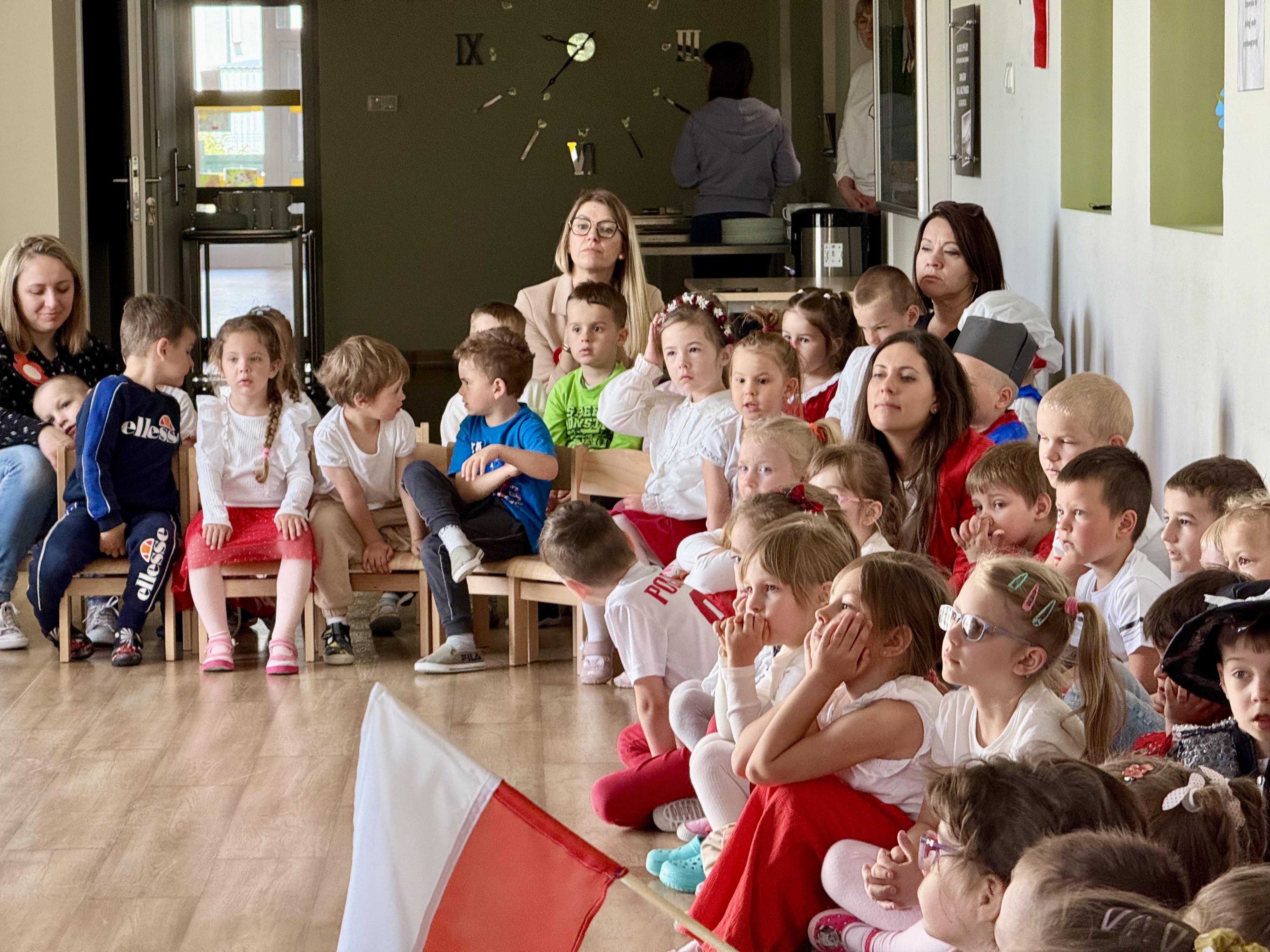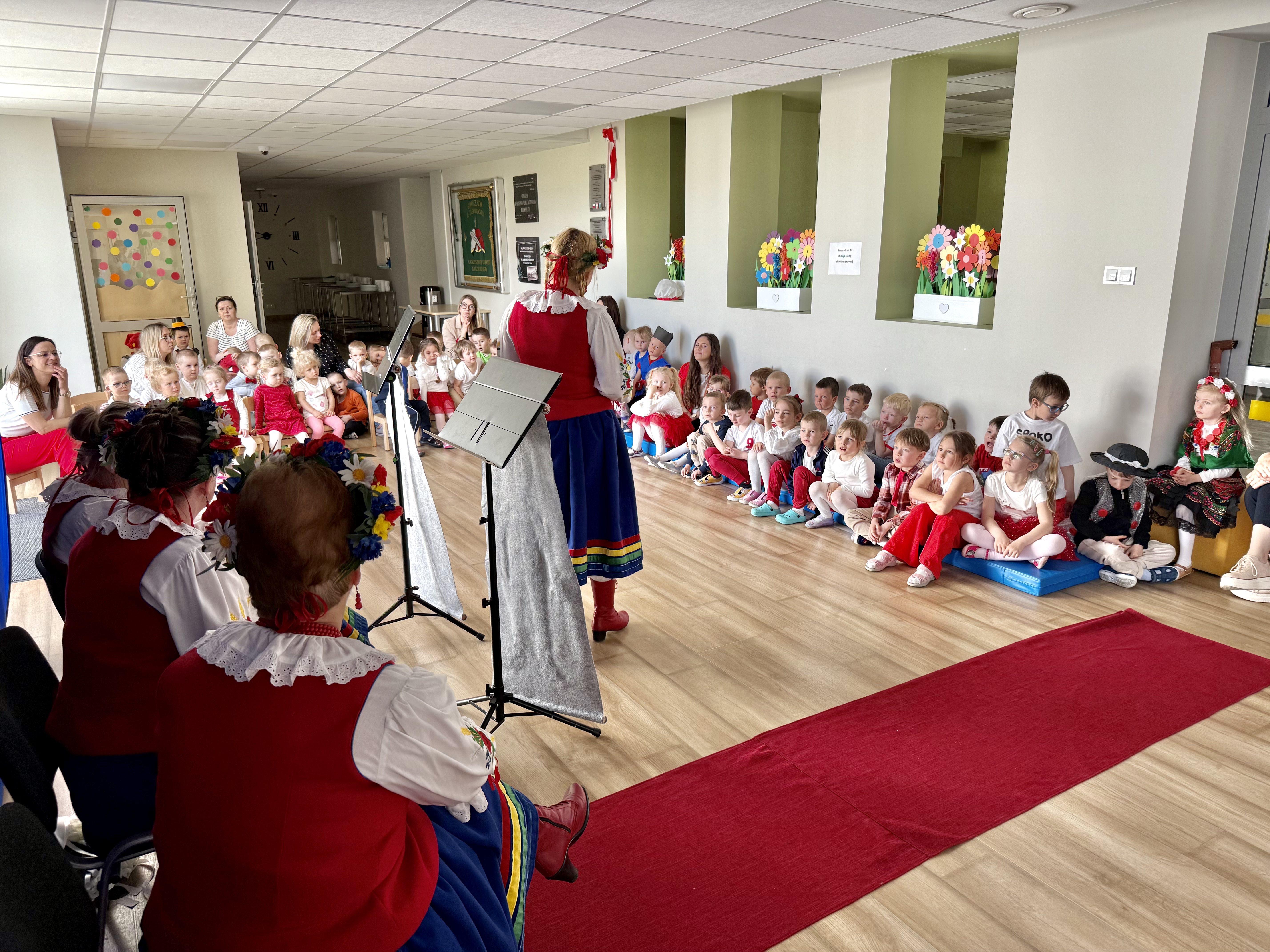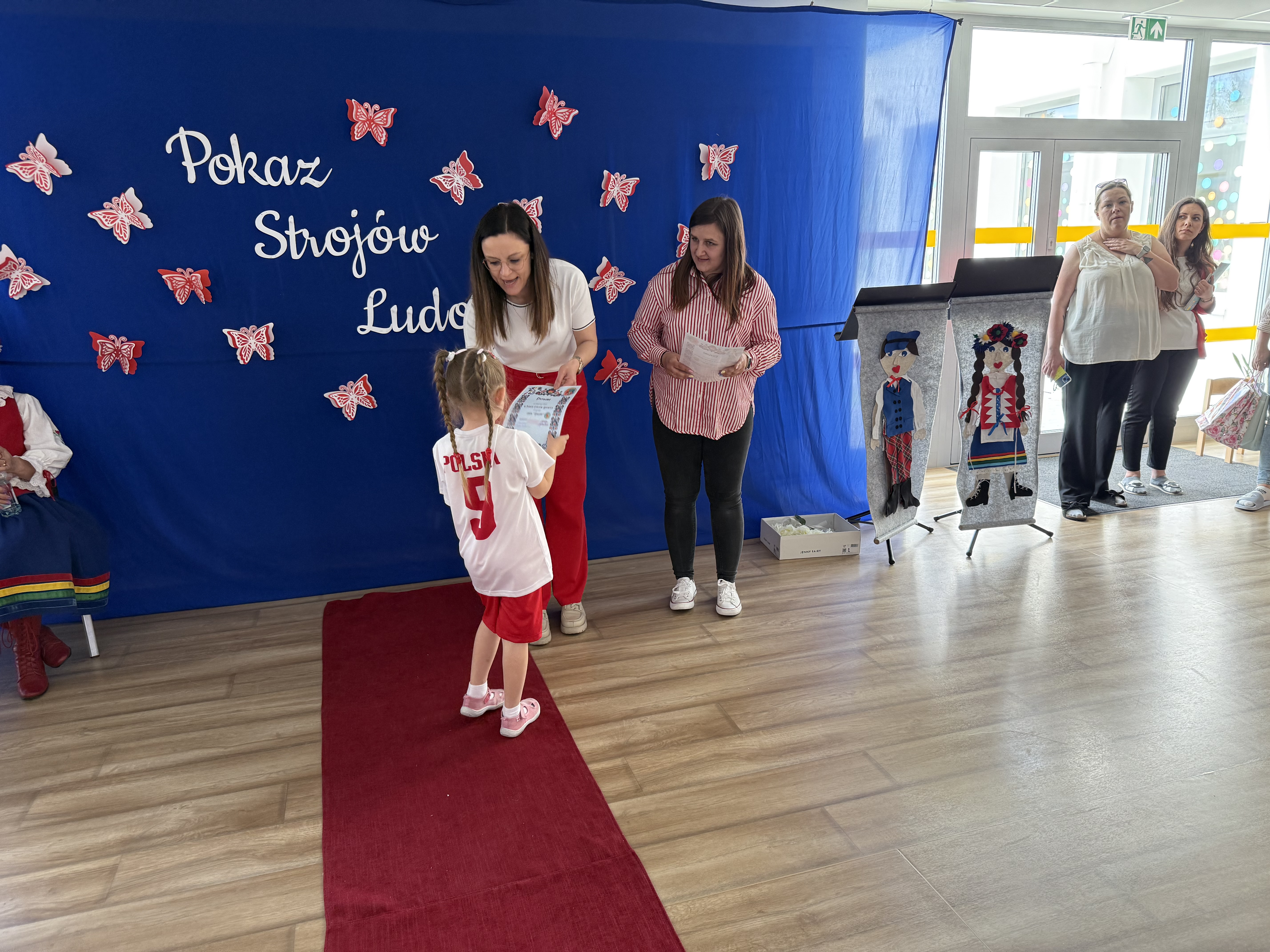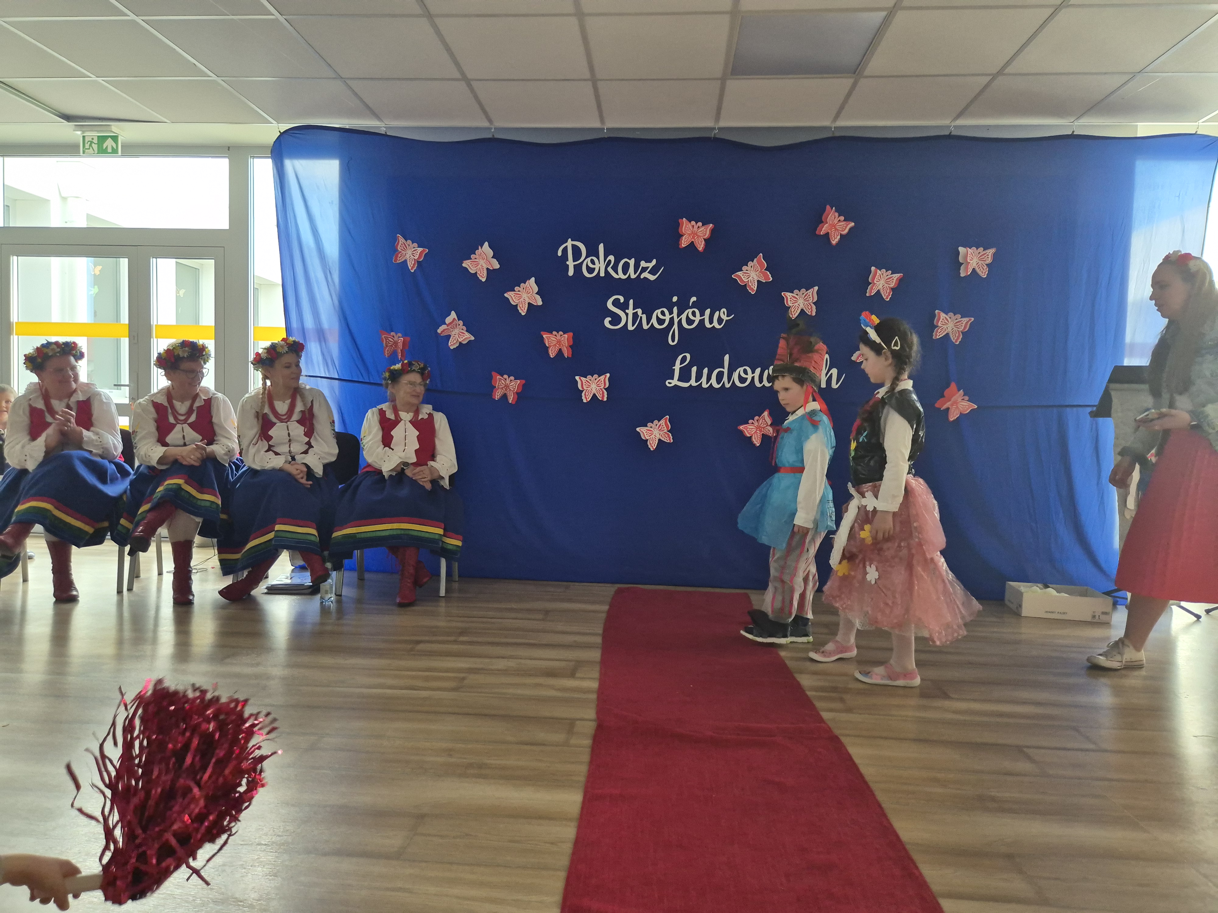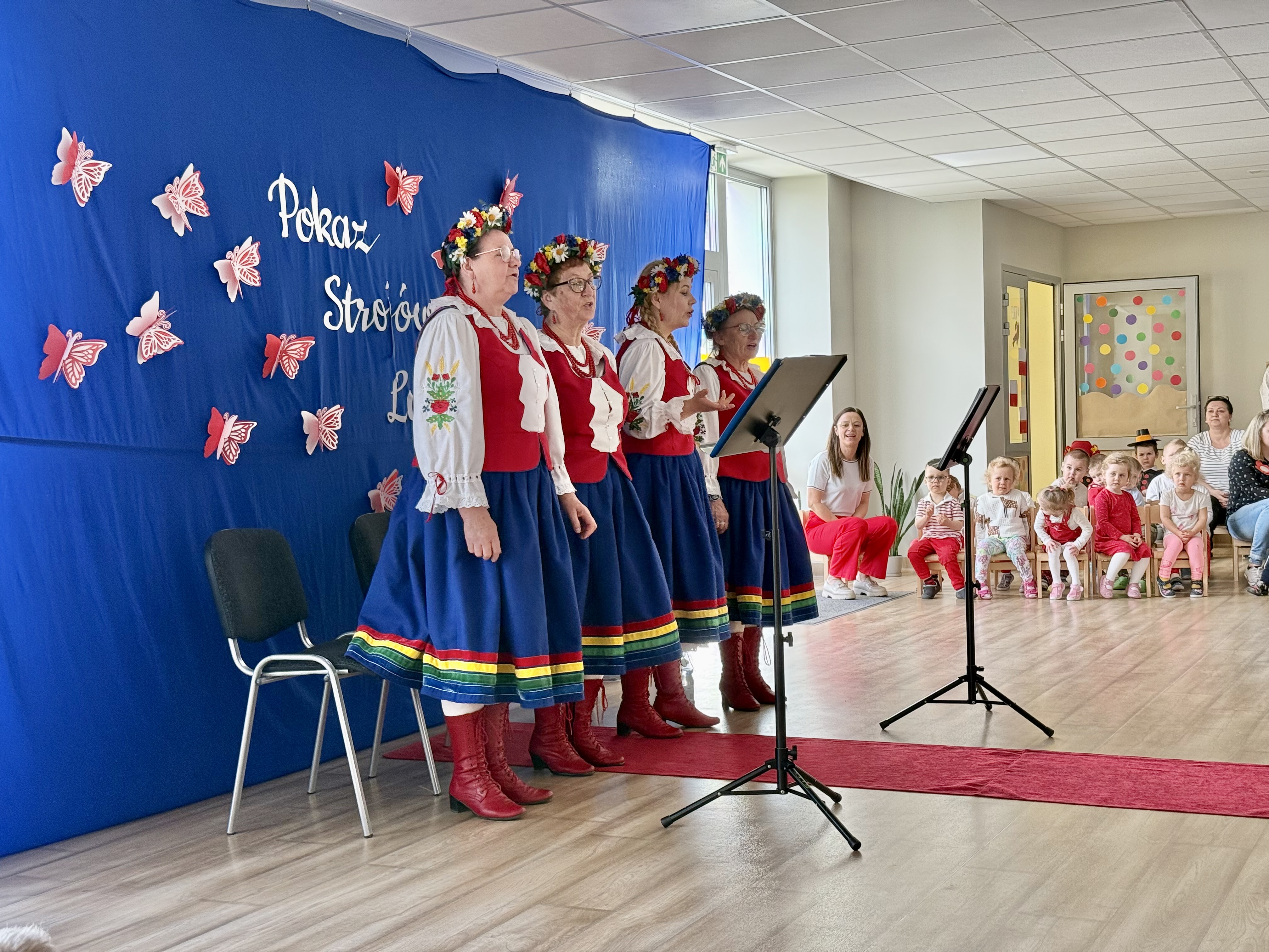 Kolejnym punktem programu był Pokaz Strojów Ludowych, który w tym roku przybrał zupełnie nową formułę. Każda grupa przedszkolna zaprezentowała strój ludowy z wylosowanego wcześniej regionu etnograficznego – Kociewia, Kujaw, Kaszub, Krakowa, Łowicza i Podhala. Co ważne – stroje te zostały wykonane własnoręcznie przez dzieci i nauczycieli z wykorzystaniem materiałów recyklingowych, takich jak: papier, worki, nakrętki, stare tkaniny, tektura czy bibuła. Reprezentanci każdej grupy – chłopiec i dziewczynka – z dumą i uśmiechem na twarzy przeszli po naszym przedszkolnym wybiegu prezentując swoje wyjątkowe kreacje. Pozostali, ubrani w stroje patriotyczne, dopingowali swoich kolegów i koleżanki. Na widowni nie brakowało biało-czerwonych koszulek, opasek, szalików i flag. Całe przedszkole tego dnia tętniło barwami narodowymi i pozytywną energią.