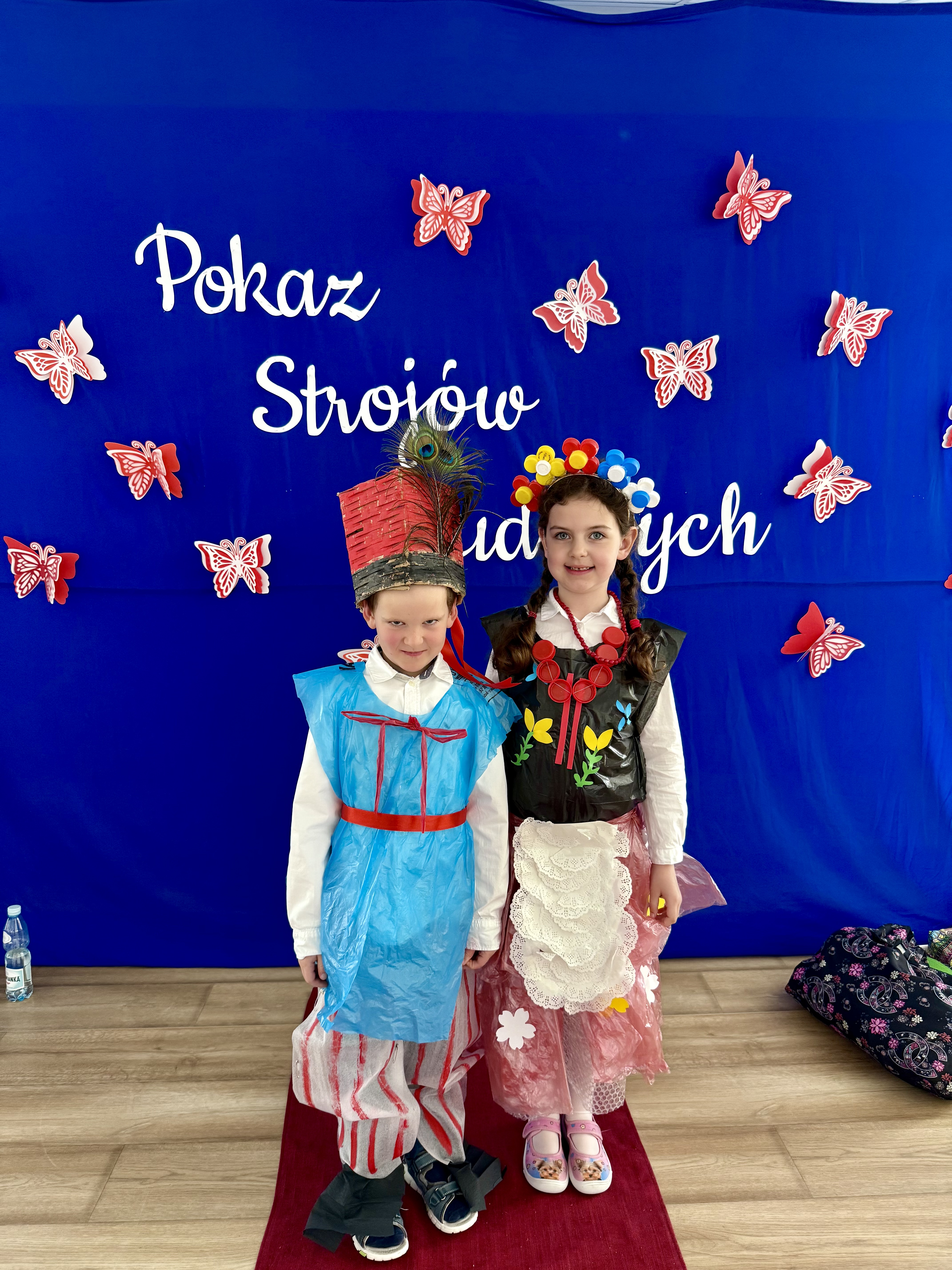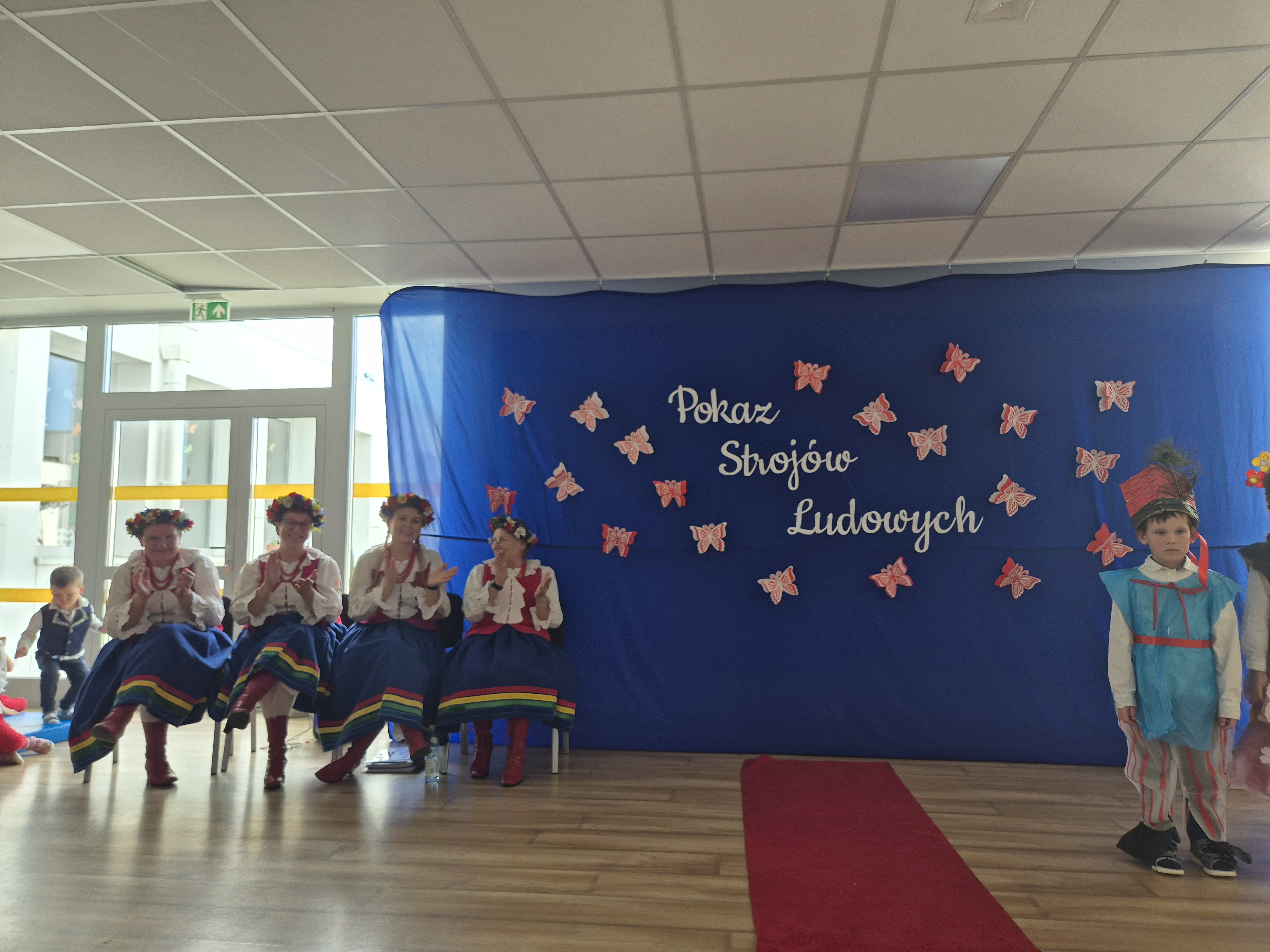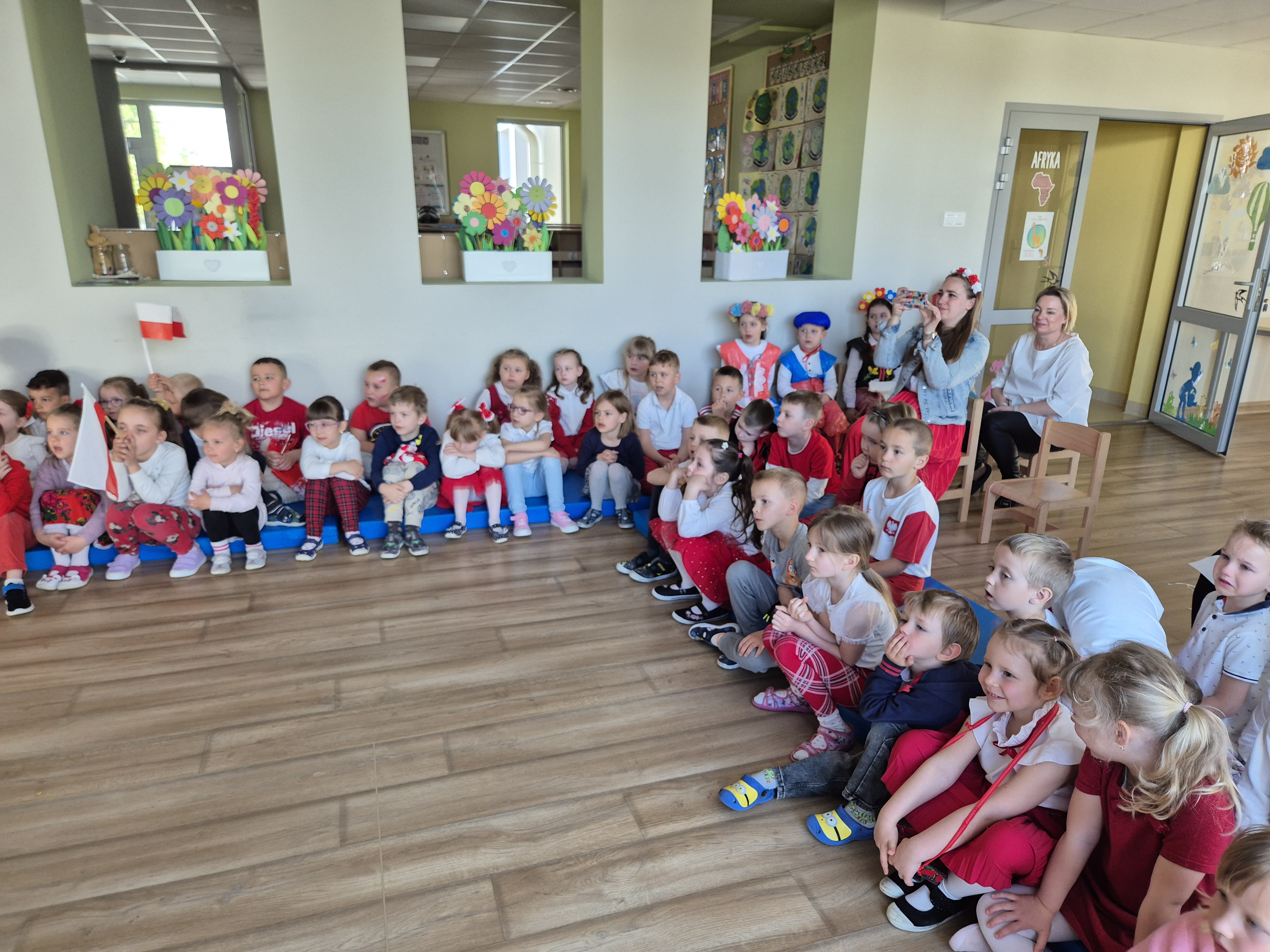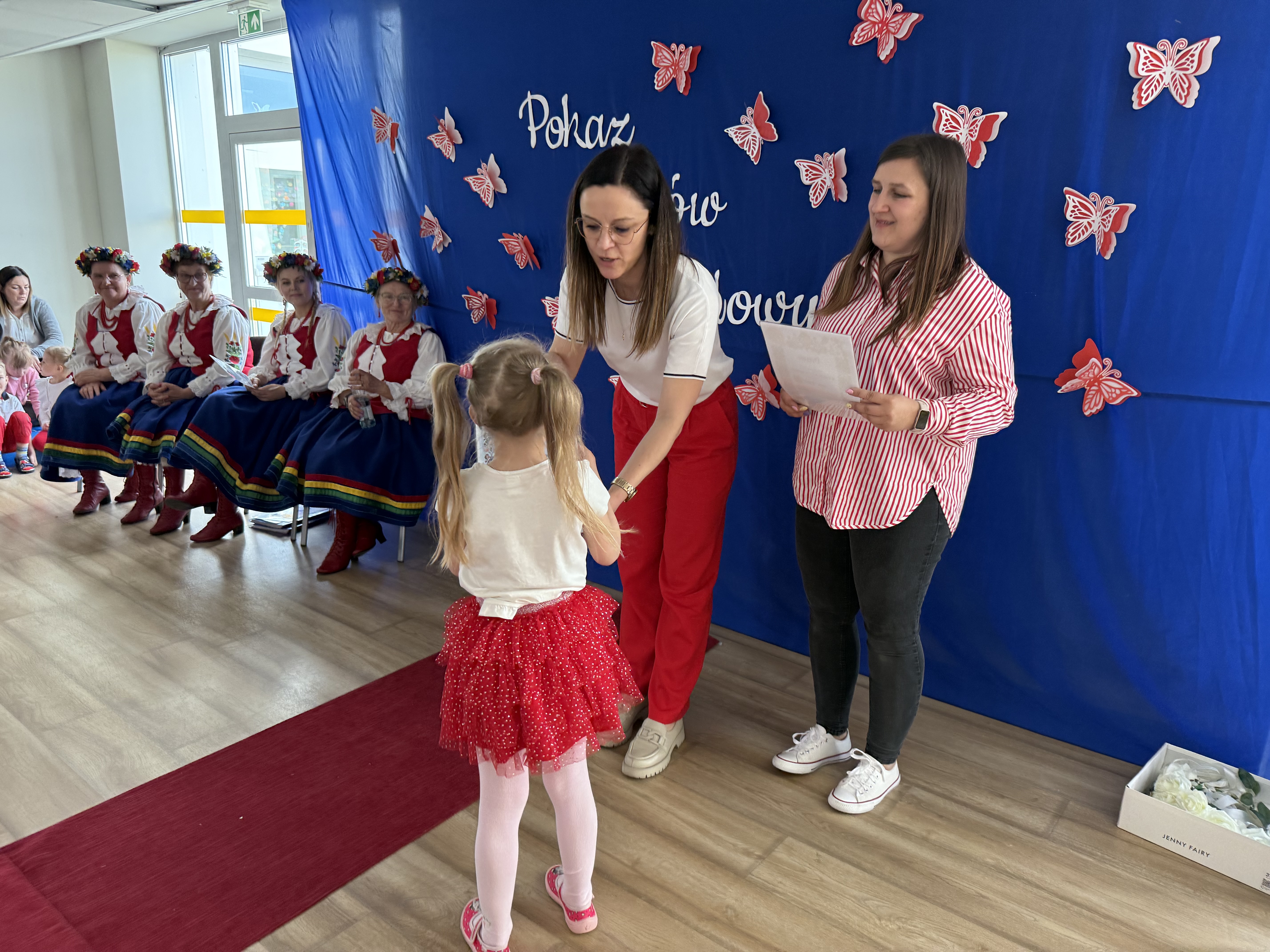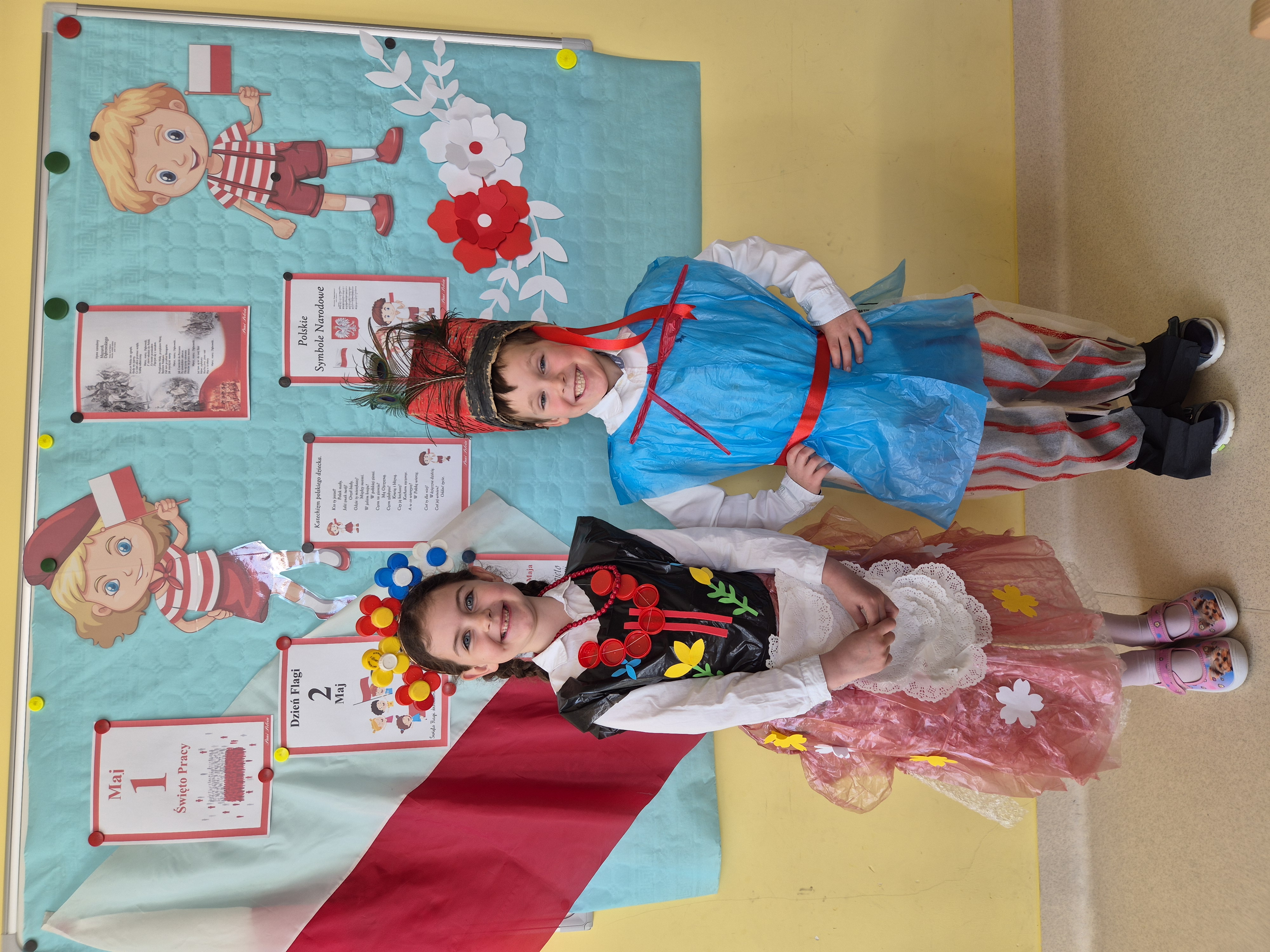 Kolejnym punktem programu był Pokaz Strojów Ludowych, który w tym roku przybrał zupełnie nową formułę. Każda grupa przedszkolna zaprezentowała strój ludowy z wylosowanego wcześniej regionu etnograficznego – Kociewia, Kujaw, Kaszub, Krakowa, Łowicza i Podhala. Co ważne – stroje te zostały wykonane własnoręcznie przez dzieci i nauczycieli z wykorzystaniem materiałów recyklingowych, takich jak: papier, worki, nakrętki, stare tkaniny, tektura czy bibuła. Reprezentanci każdej grupy – chłopiec i dziewczynka – z dumą i uśmiechem na twarzy przeszli po naszym przedszkolnym wybiegu prezentując swoje wyjątkowe kreacje. Pozostali, ubrani w stroje patriotyczne, dopingowali swoich kolegów i koleżanki. Na widowni nie brakowało biało-czerwonych koszulek, opasek, szalików i flag. Całe przedszkole tego dnia tętniło barwami narodowymi i pozytywną energią.
