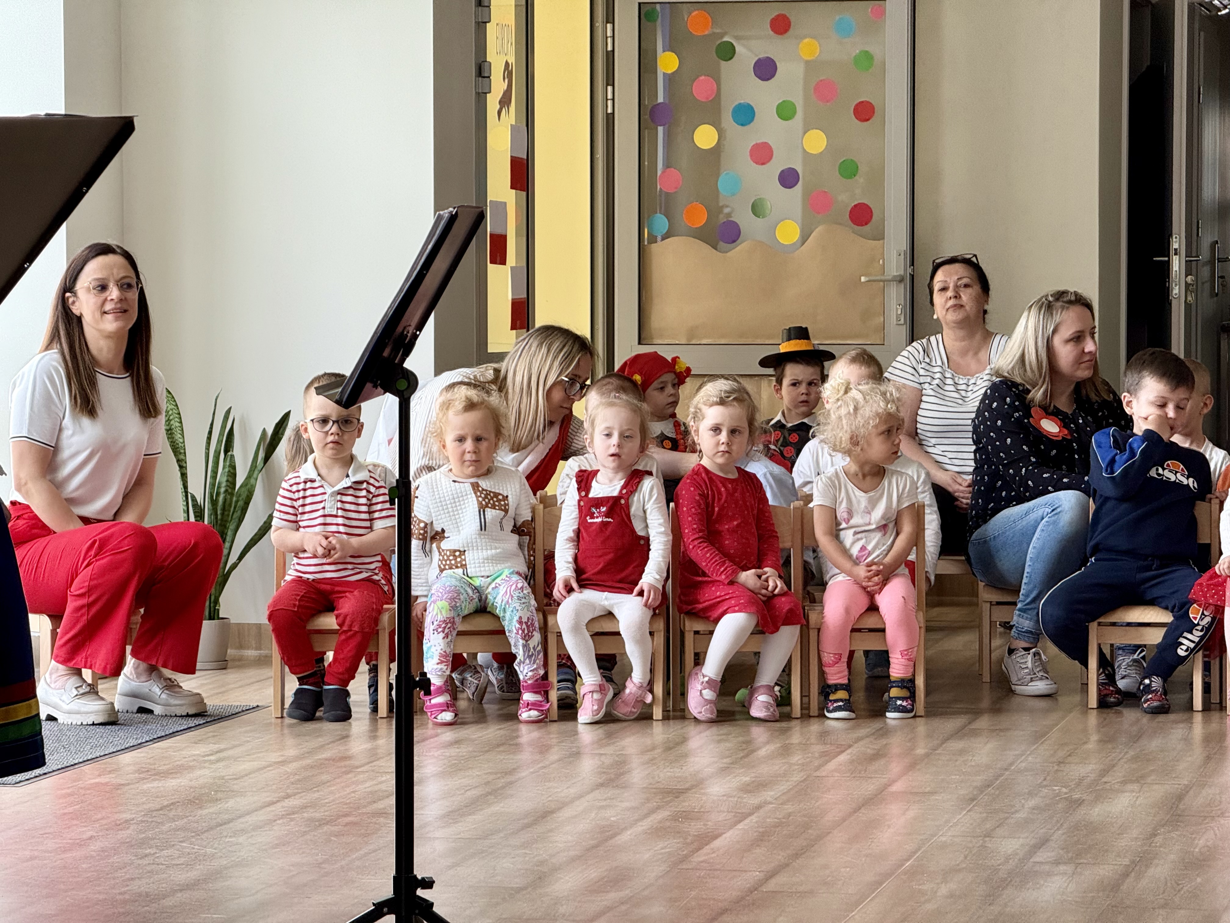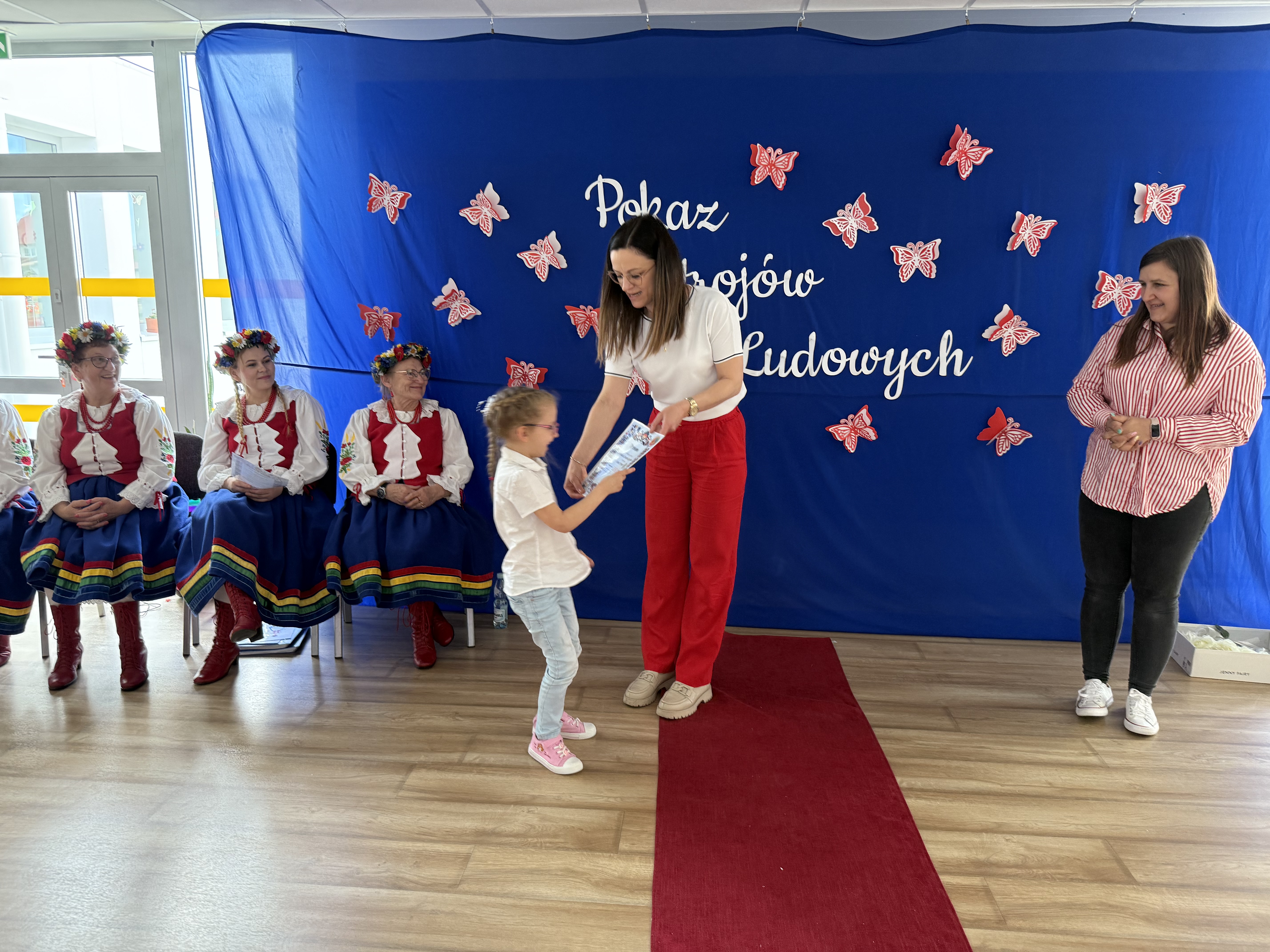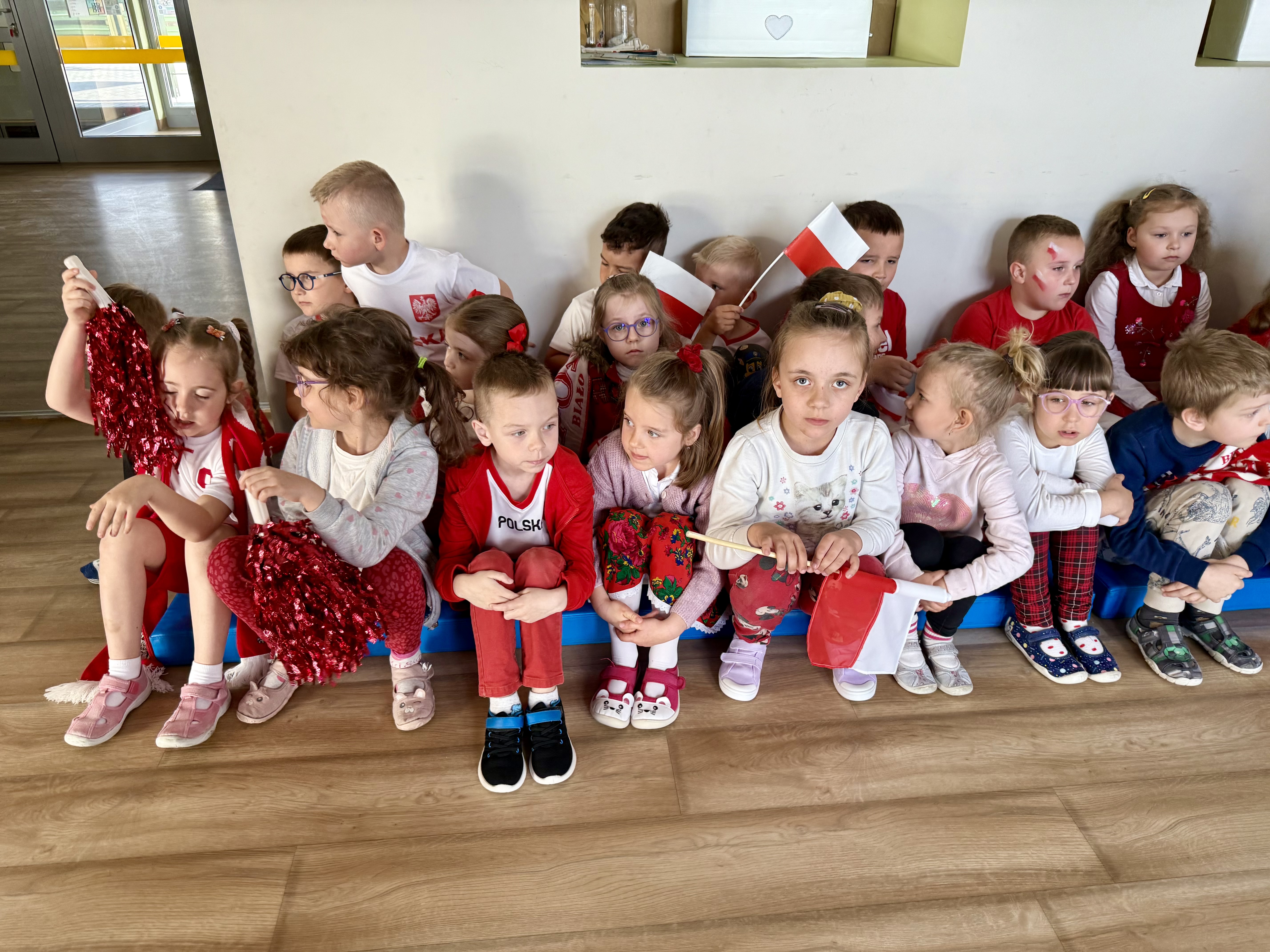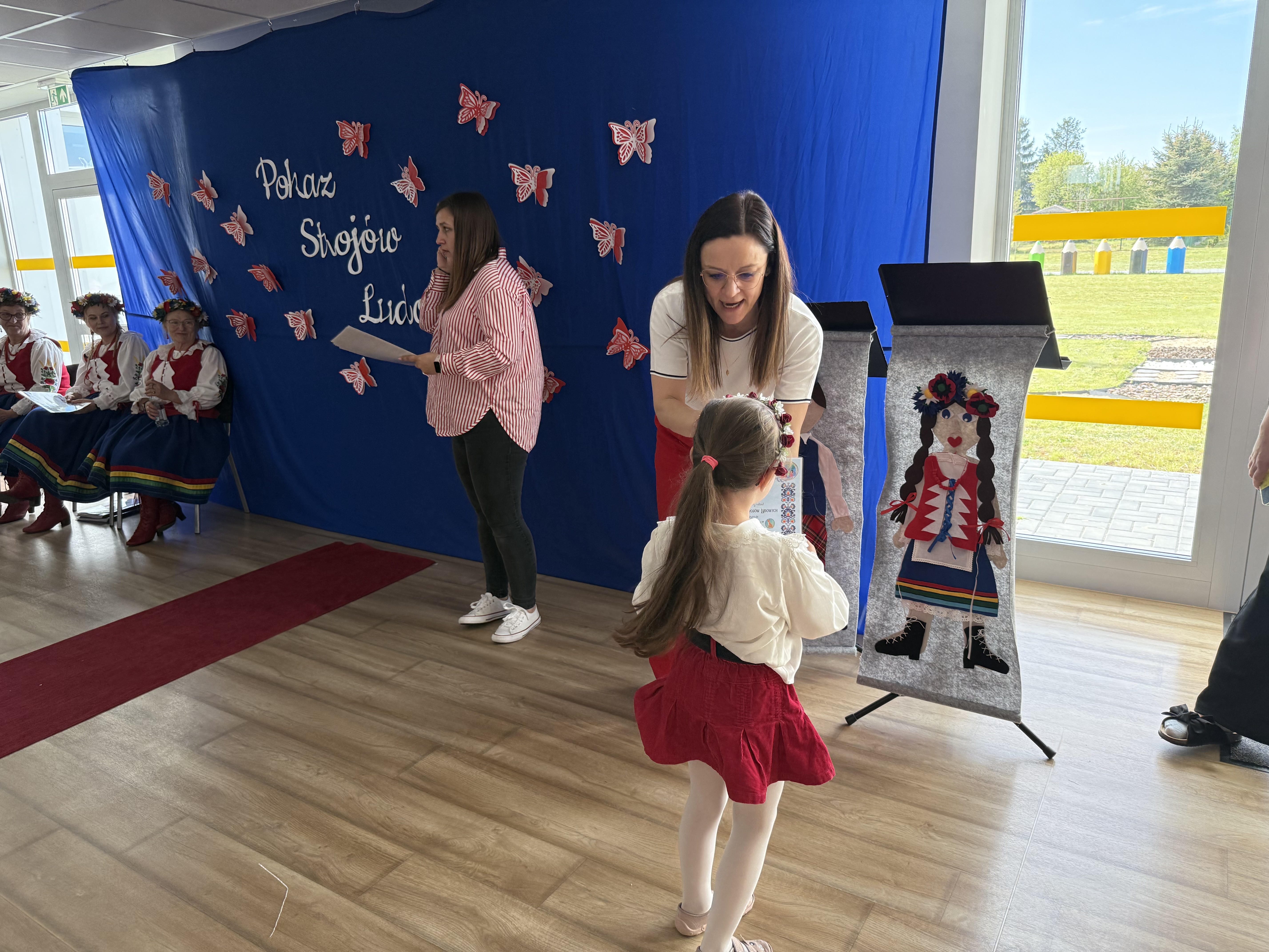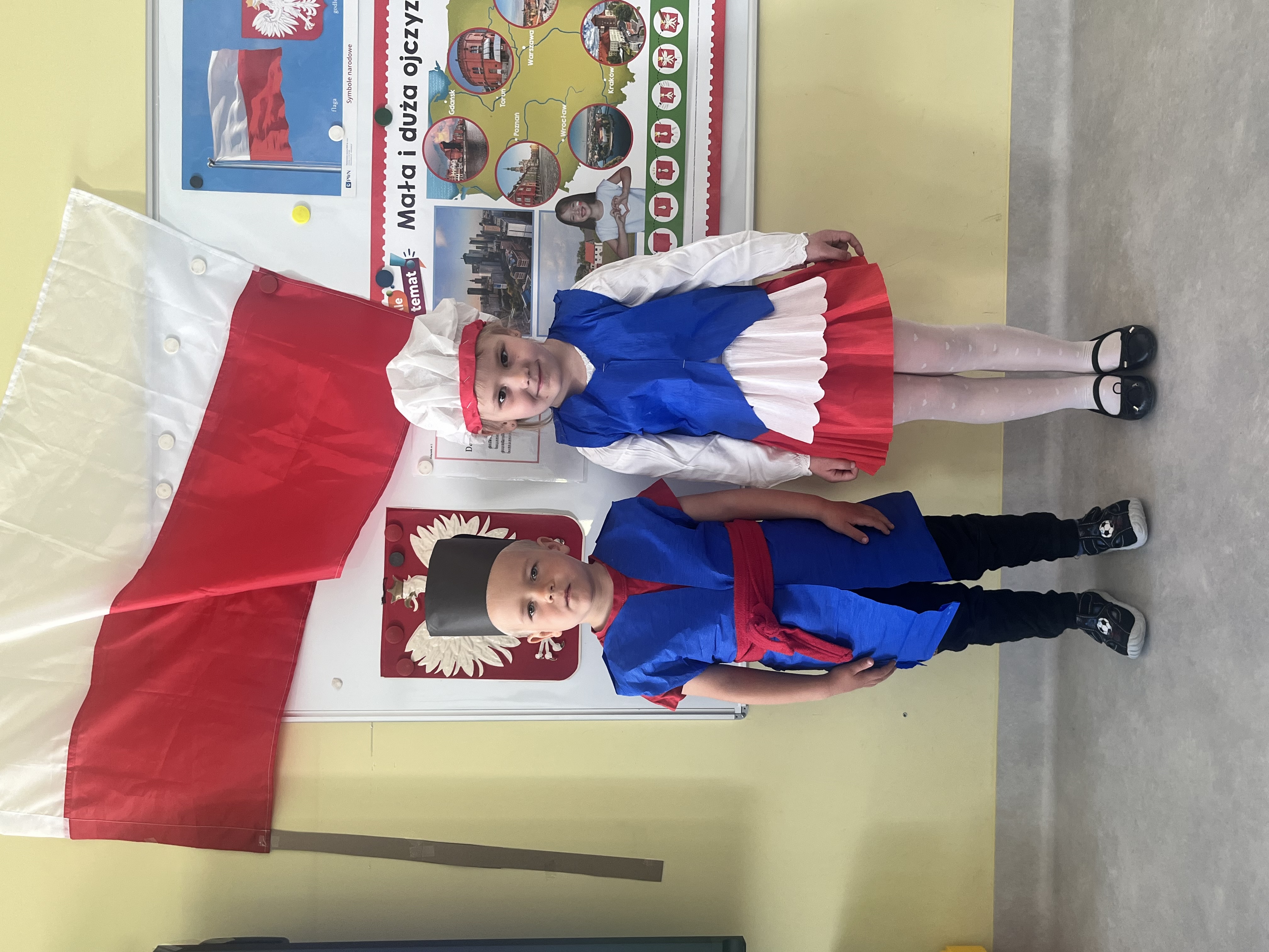 Kolejnym punktem programu był Pokaz Strojów Ludowych, który w tym roku przybrał zupełnie nową formułę. Każda grupa przedszkolna zaprezentowała strój ludowy z wylosowanego wcześniej regionu etnograficznego – Kociewia, Kujaw, Kaszub, Krakowa, Łowicza i Podhala. Co ważne – stroje te zostały wykonane własnoręcznie przez dzieci i nauczycieli z wykorzystaniem materiałów recyklingowych, takich jak: papier, worki, nakrętki, stare tkaniny, tektura czy bibuła. Reprezentanci każdej grupy – chłopiec i dziewczynka – z dumą i uśmiechem na twarzy przeszli po naszym przedszkolnym wybiegu prezentując swoje wyjątkowe kreacje. Pozostali, ubrani w stroje patriotyczne, dopingowali swoich kolegów i koleżanki. Na widowni nie brakowało biało-czerwonych koszulek, opasek, szalików i flag. Całe przedszkole tego dnia tętniło barwami narodowymi i pozytywną energią.