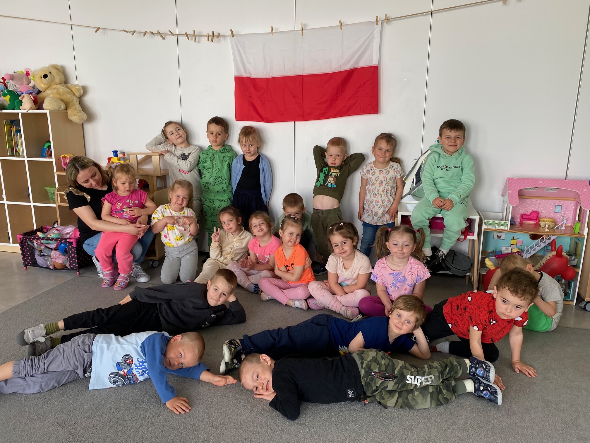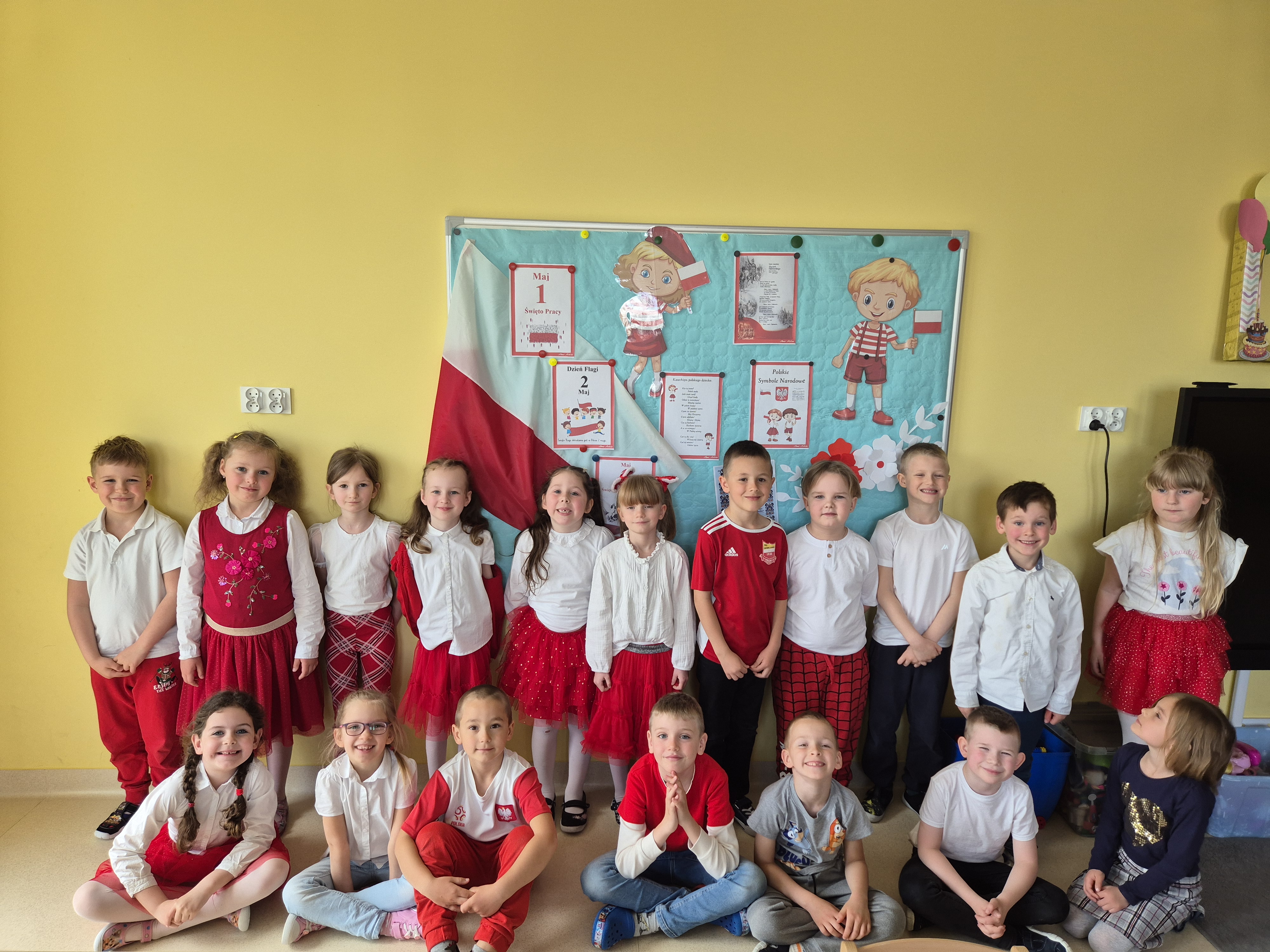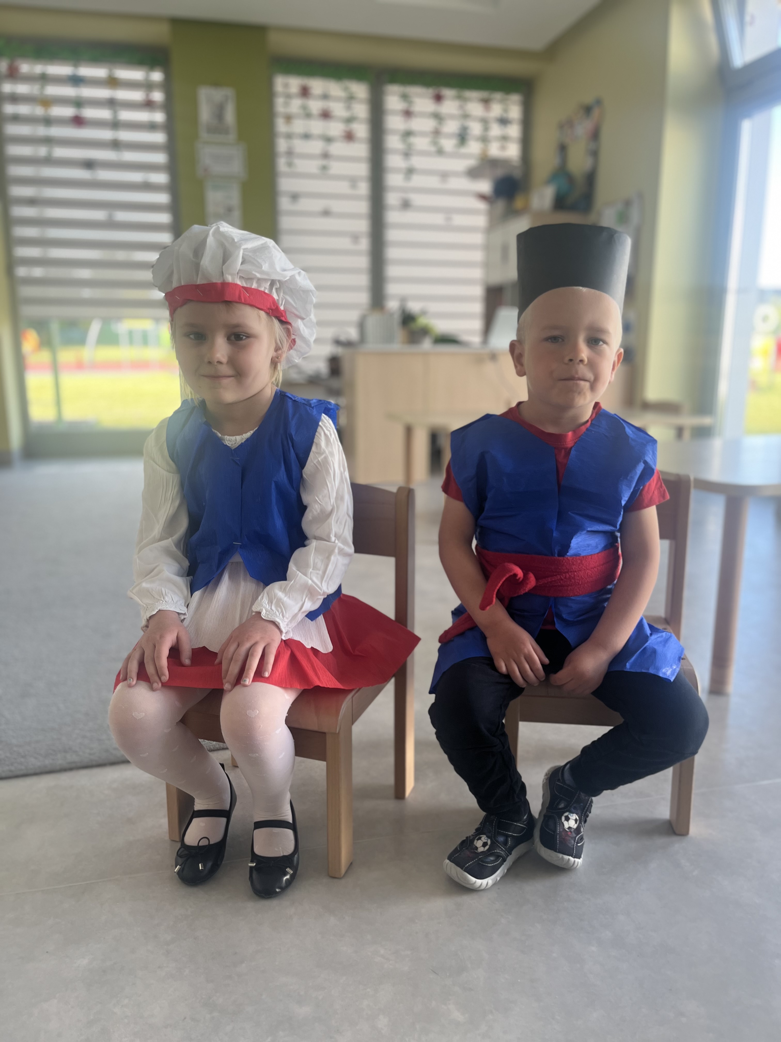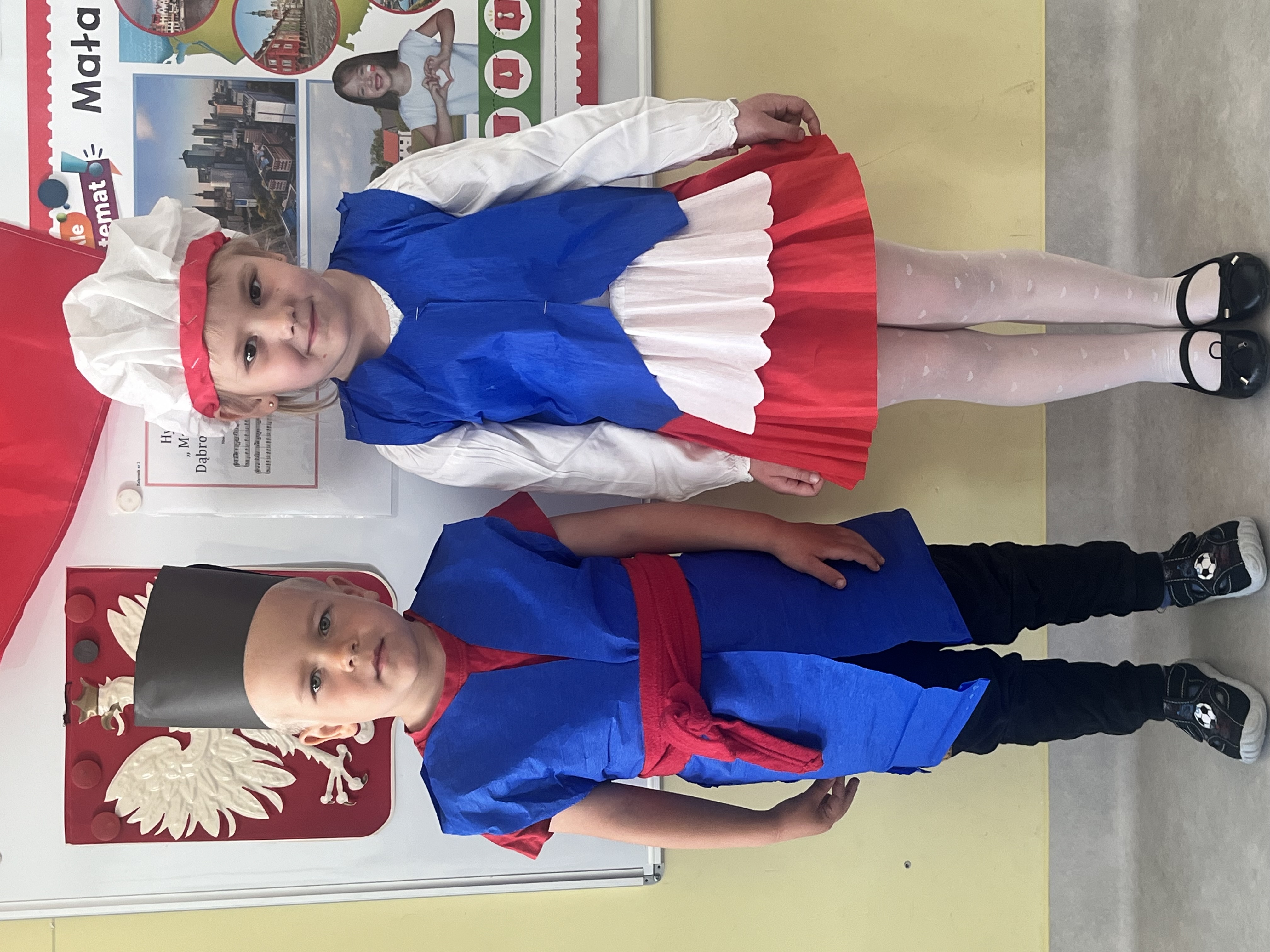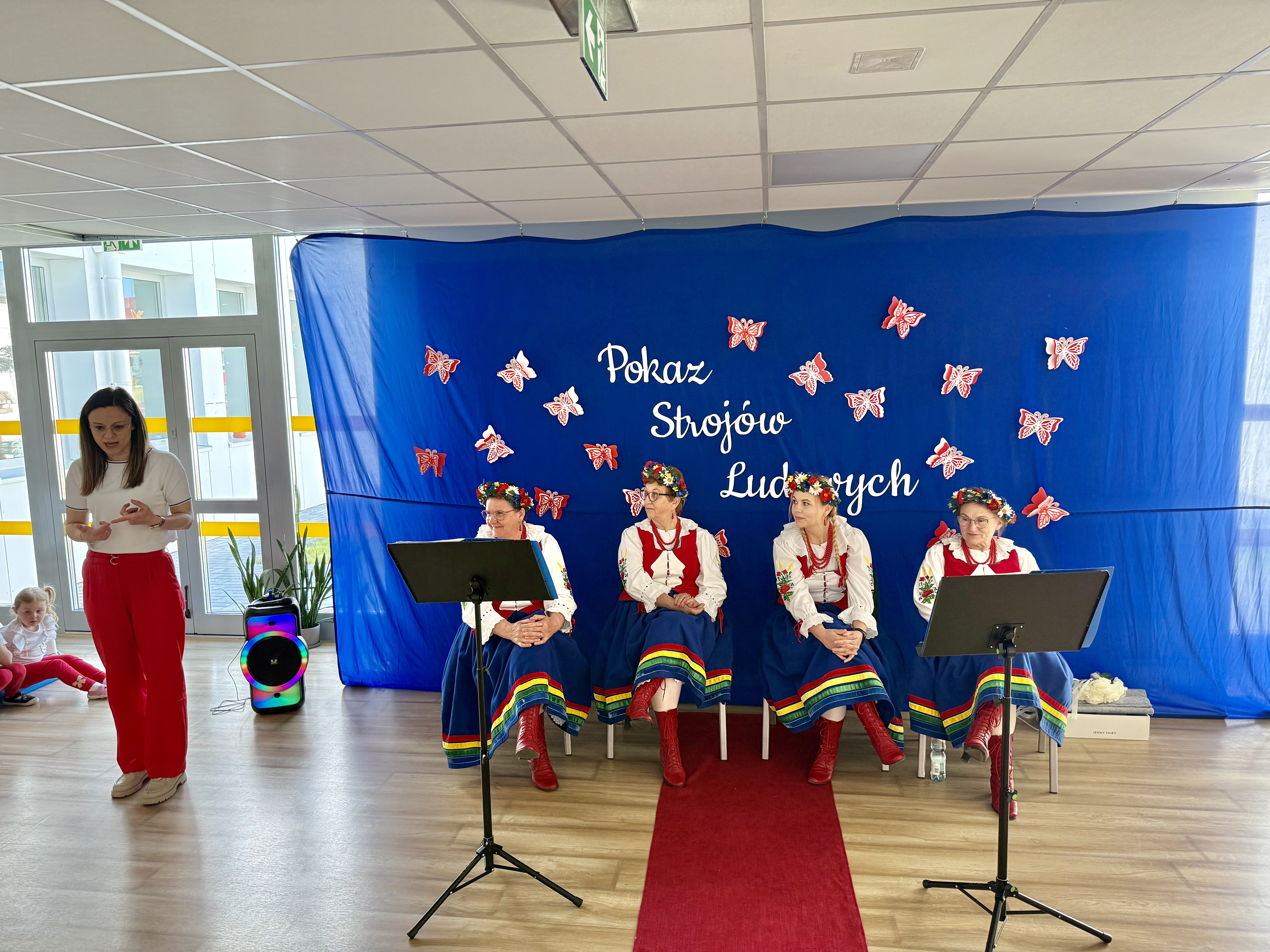 Kolejnym punktem programu był Pokaz Strojów Ludowych, który w tym roku przybrał zupełnie nową formułę. Każda grupa przedszkolna zaprezentowała strój ludowy z wylosowanego wcześniej regionu etnograficznego – Kociewia, Kujaw, Kaszub, Krakowa, Łowicza i Podhala. Co ważne – stroje te zostały wykonane własnoręcznie przez dzieci i nauczycieli z wykorzystaniem materiałów recyklingowych, takich jak: papier, worki, nakrętki, stare tkaniny, tektura czy bibuła. Reprezentanci każdej grupy – chłopiec i dziewczynka – z dumą i uśmiechem na twarzy przeszli po naszym przedszkolnym wybiegu prezentując swoje wyjątkowe kreacje. Pozostali, ubrani w stroje patriotyczne, dopingowali swoich kolegów i koleżanki. Na widowni nie brakowało biało-czerwonych koszulek, opasek, szalików i flag. Całe przedszkole tego dnia tętniło barwami narodowymi i pozytywną energią.