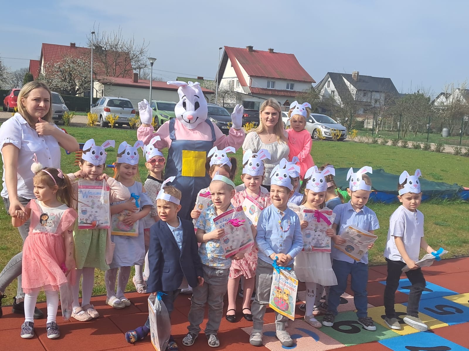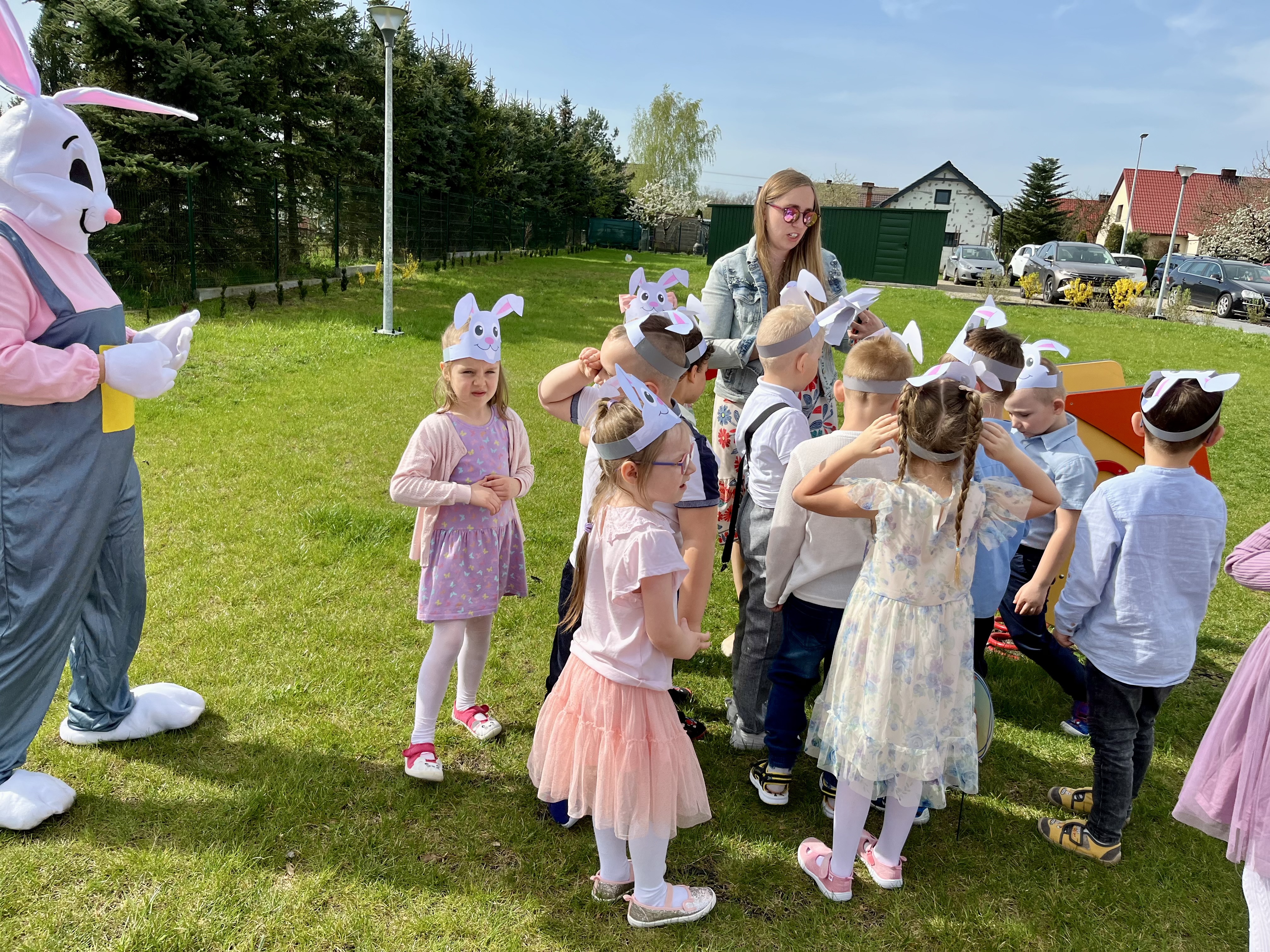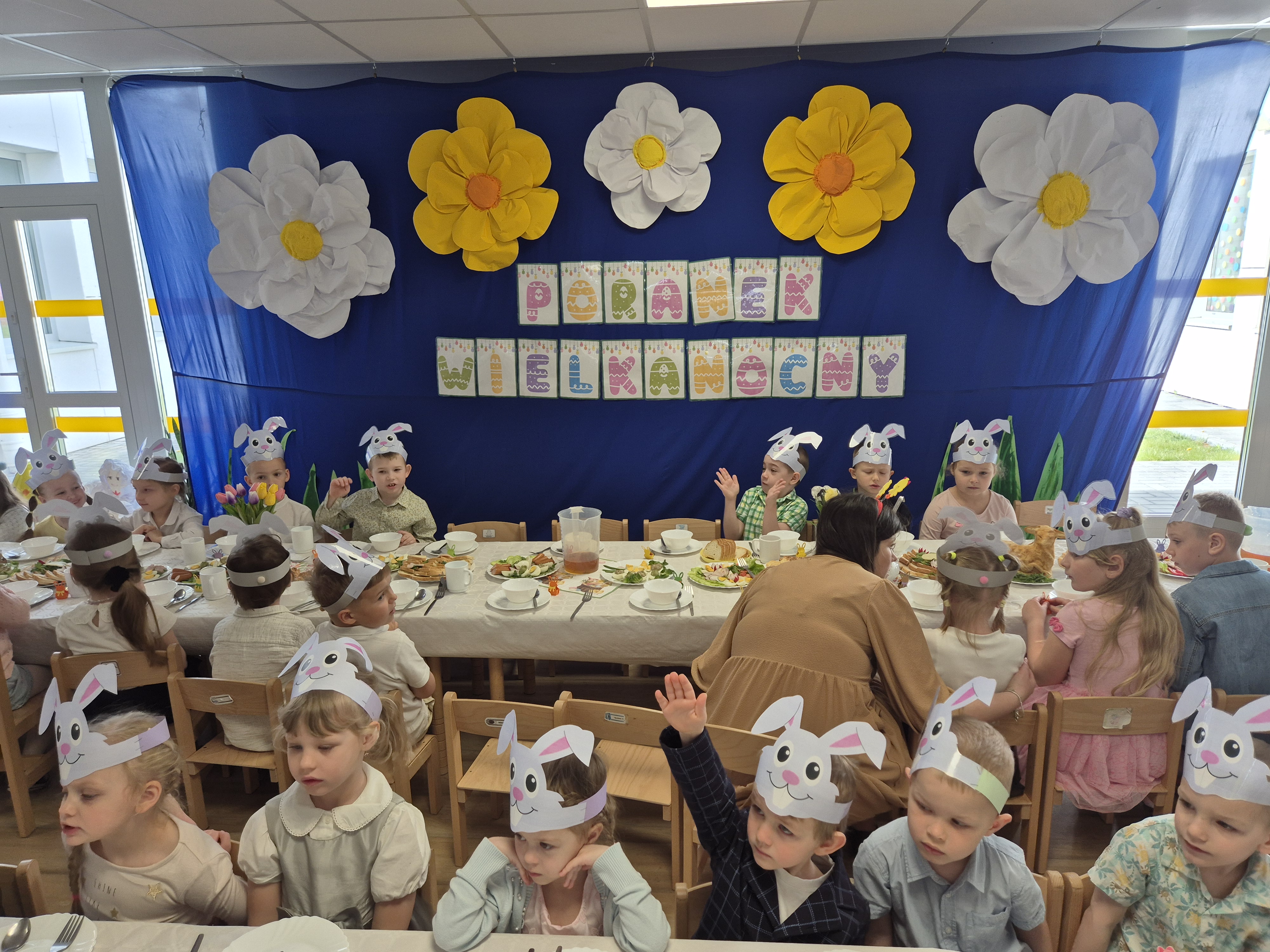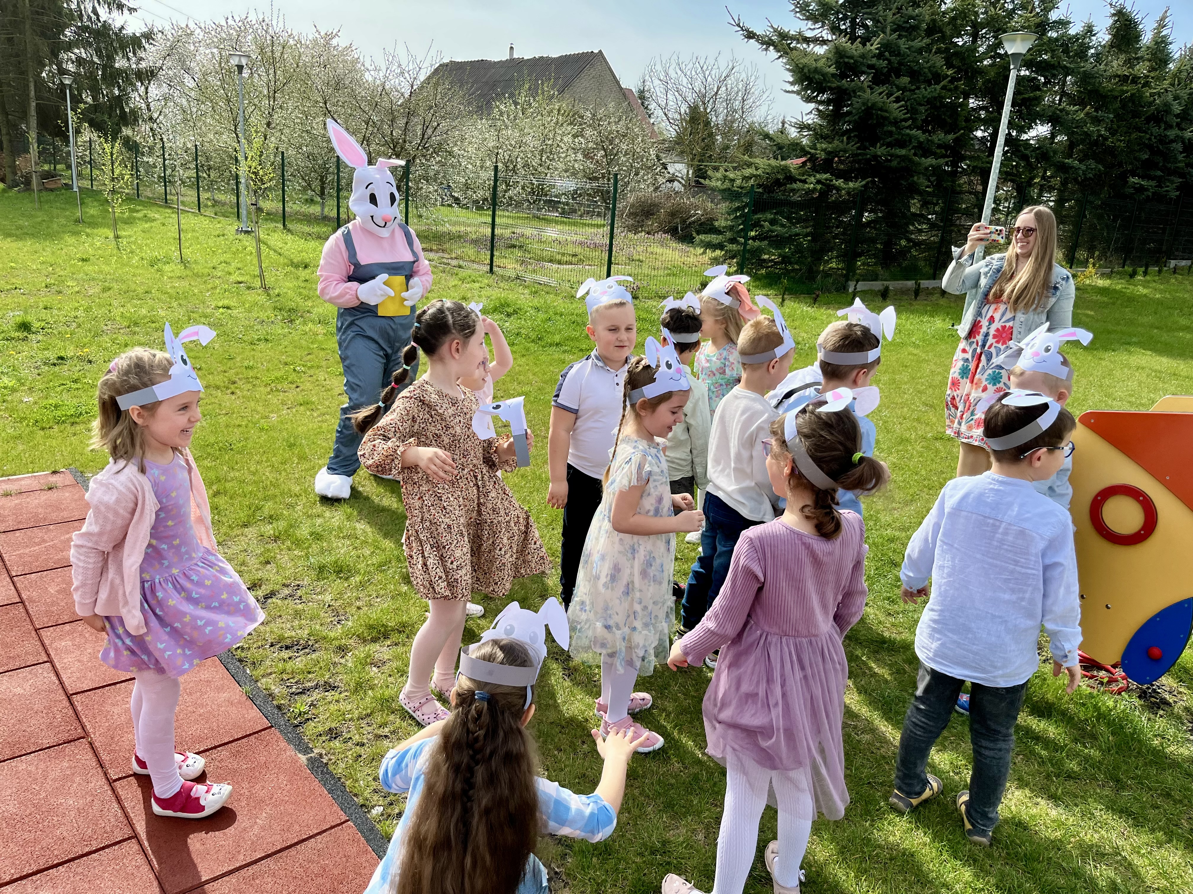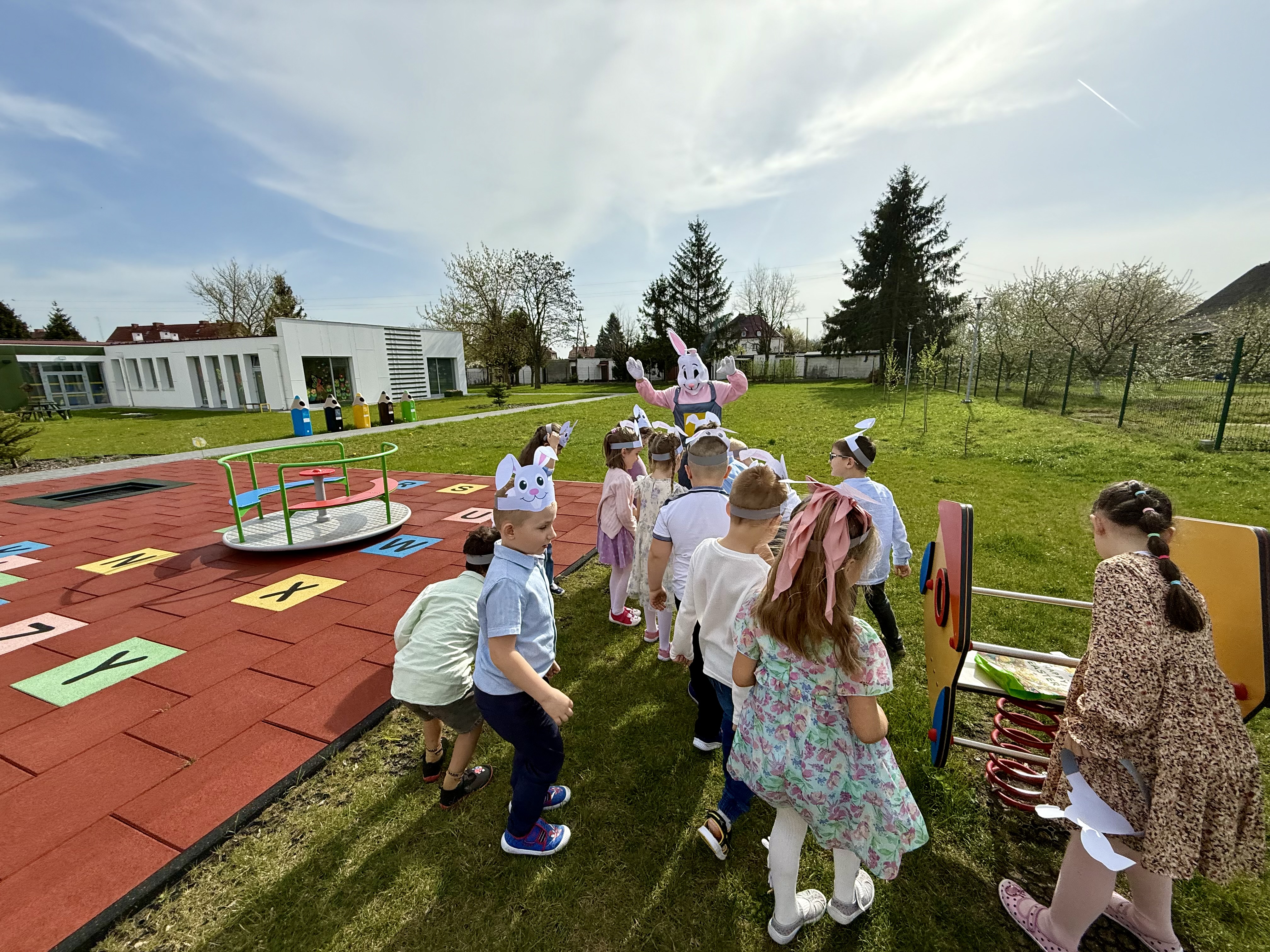 Wielkanoc to święto pełne tradycji i obyczajów. Tradycje wielkanocne sprawiają, że to święto staje się wyjątkowe, a świąteczne dni są pełne radości. Dnia 17 kwietnia w naszym przedszkolu odbył się uroczysty Poranek Wielkanocny. Dzieci wraz z wychowawcami zebrały się na holu, gdzie wspólnie zasiadły do świątecznego śniadanka. Na świątecznym stole nie zabrakło jajka, żurku, szynki i baranka. Pani Dyrektor powitała wszystkich i złożyła serdeczne wielkanocne życzenia. Po śniadaniu pojawił się wyjątkowy gość – Zajączek Wielkanocny. Dzieci z radością przywitały go piosenką. Następnie wszyscy udaliśmy się do ogrodu, gdzie Zajączek przygotował specjalne zadania do rozwiązania oraz pochował prezenty. Dzieci z wielkim zaangażowaniem szukały ukrytych niespodzianek. Na zakończenie pełnego emocji poranka wszyscy zrobili sobie wspólne pamiątkowe zdjęcie z zajączkiem. To był radosny czas pełen uśmiechu, zabawy i świątecznej atmosfery!