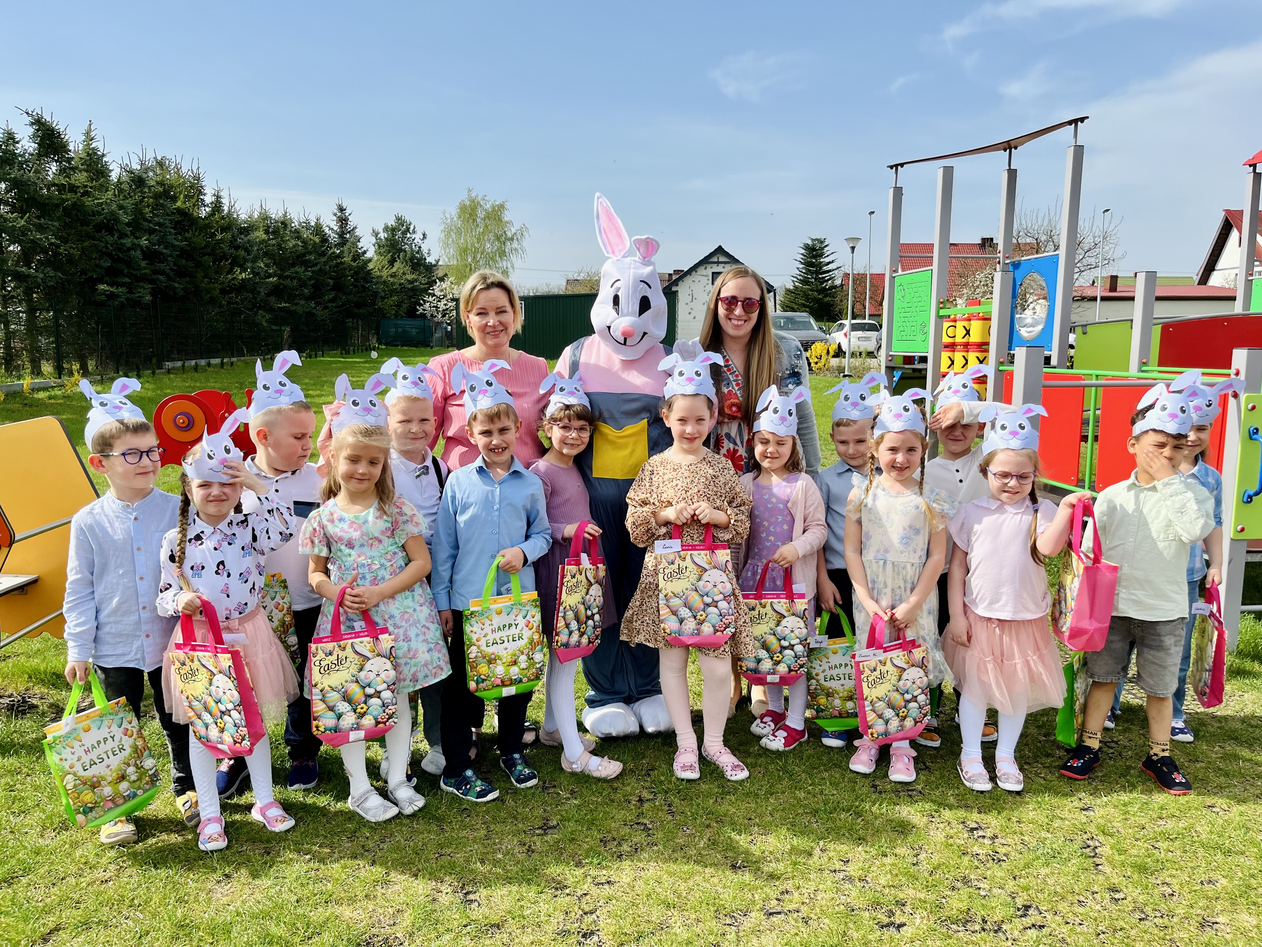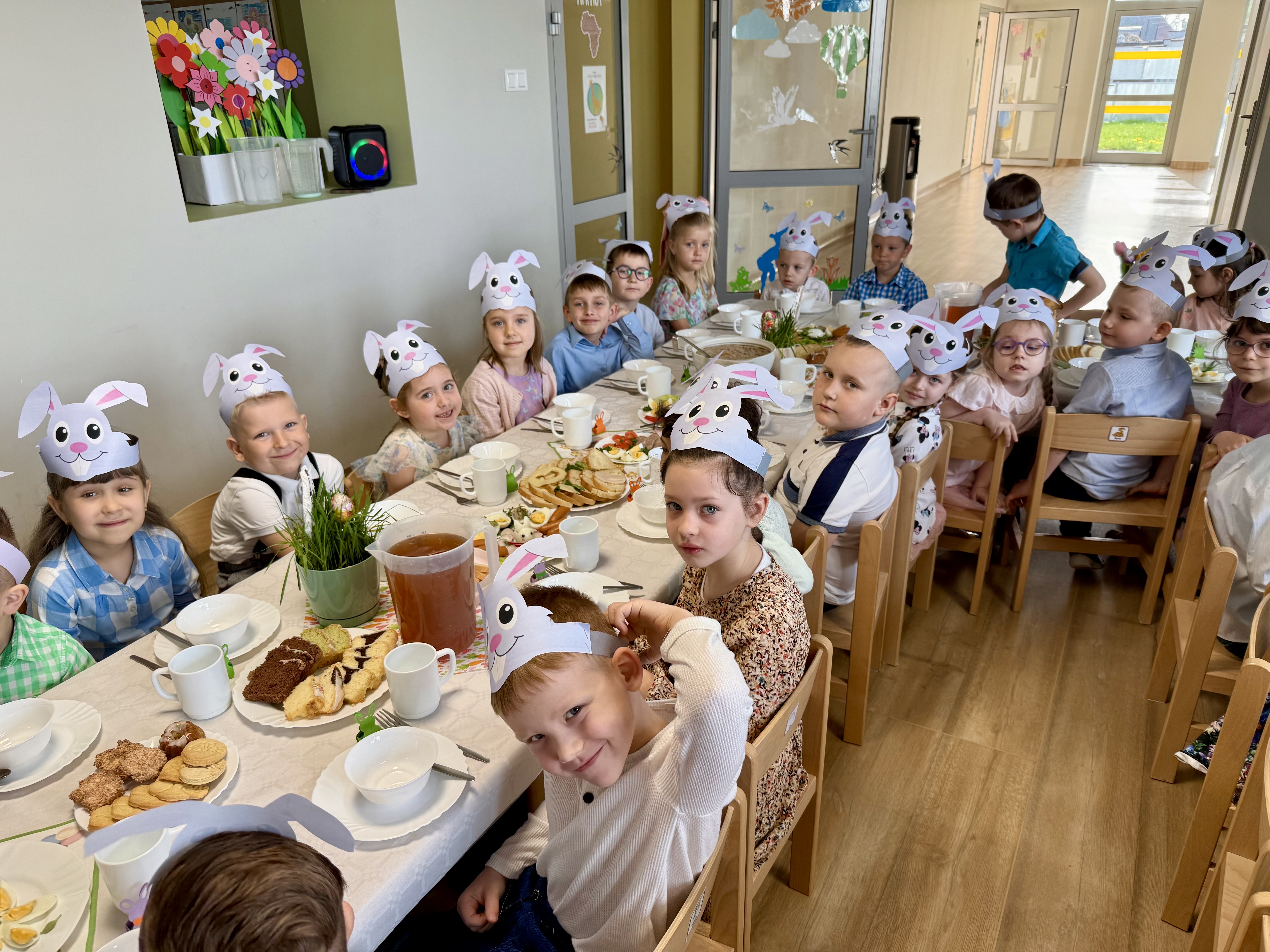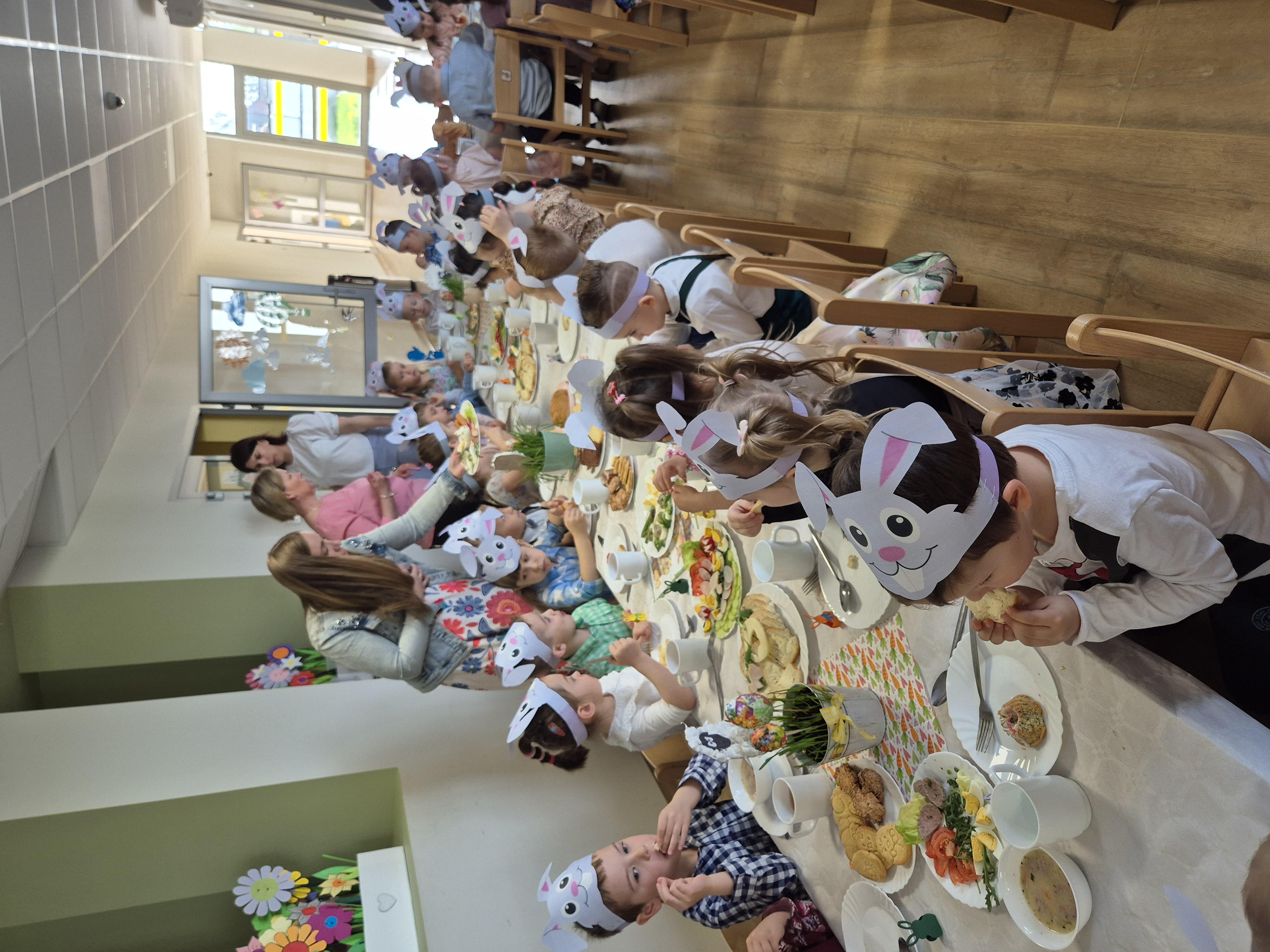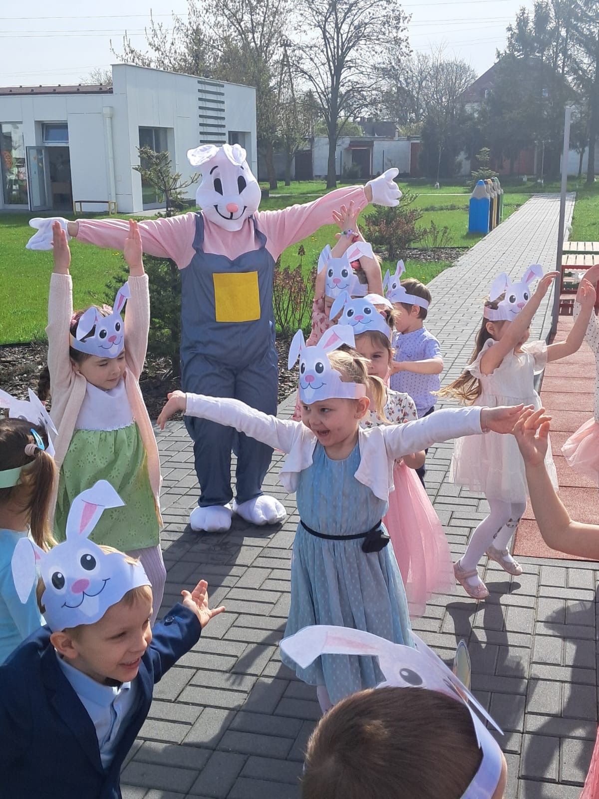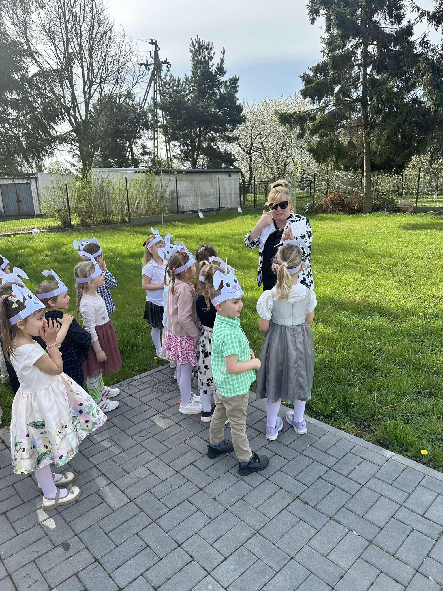 Wielkanoc to święto pełne tradycji i obyczajów. Tradycje wielkanocne sprawiają, że to święto staje się wyjątkowe, a świąteczne dni są pełne radości. Dnia 17 kwietnia w naszym przedszkolu odbył się uroczysty Poranek Wielkanocny. Dzieci wraz z wychowawcami zebrały się na holu, gdzie wspólnie zasiadły do świątecznego śniadanka. Na świątecznym stole nie zabrakło jajka, żurku, szynki i baranka. Pani Dyrektor powitała wszystkich i złożyła serdeczne wielkanocne życzenia. Po śniadaniu pojawił się wyjątkowy gość – Zajączek Wielkanocny. Dzieci z radością przywitały go piosenką. Następnie wszyscy udaliśmy się do ogrodu, gdzie Zajączek przygotował specjalne zadania do rozwiązania oraz pochował prezenty. Dzieci z wielkim zaangażowaniem szukały ukrytych niespodzianek. Na zakończenie pełnego emocji poranka wszyscy zrobili sobie wspólne pamiątkowe zdjęcie z zajączkiem. To był radosny czas pełen uśmiechu, zabawy i świątecznej atmosfery!