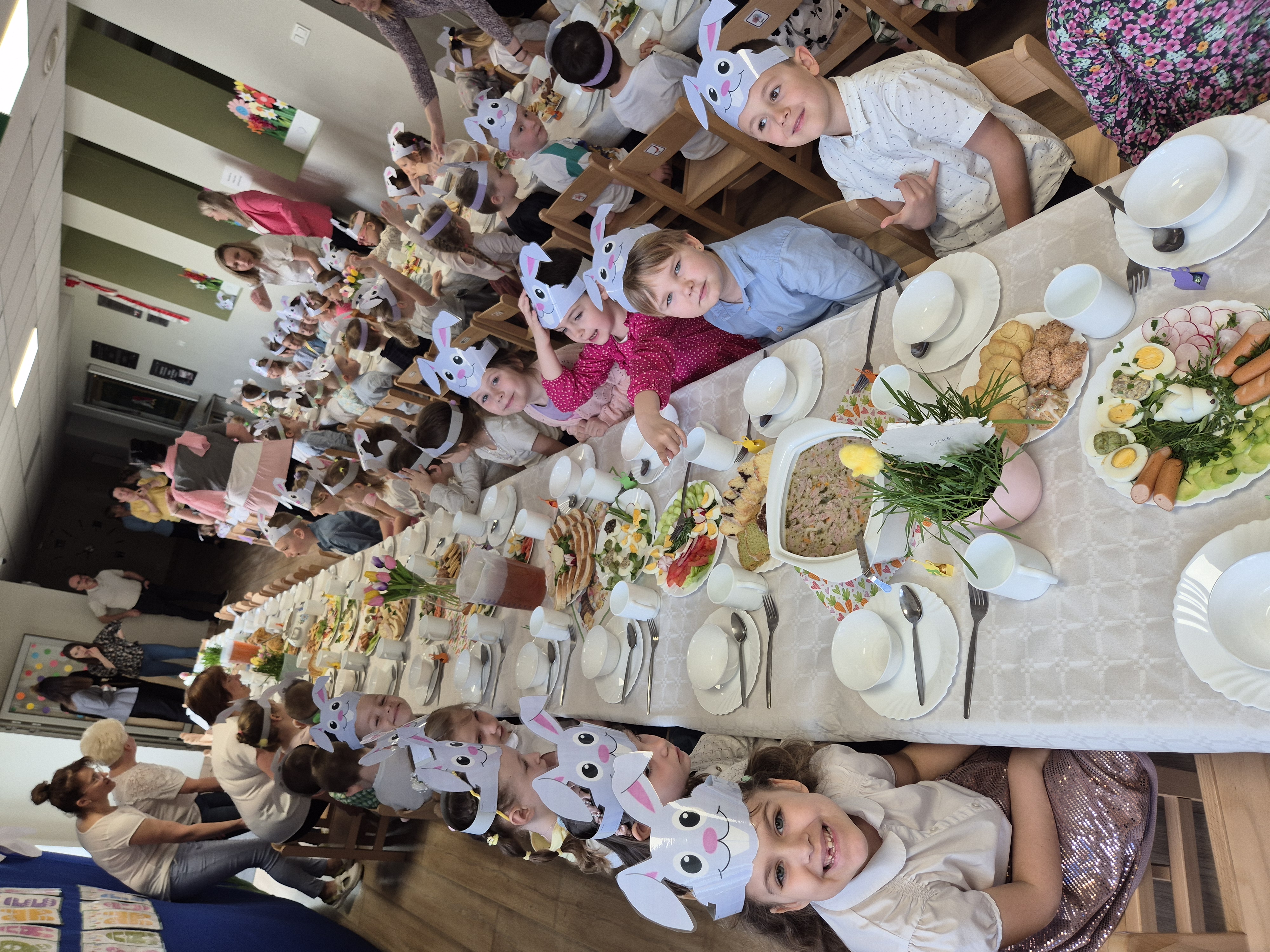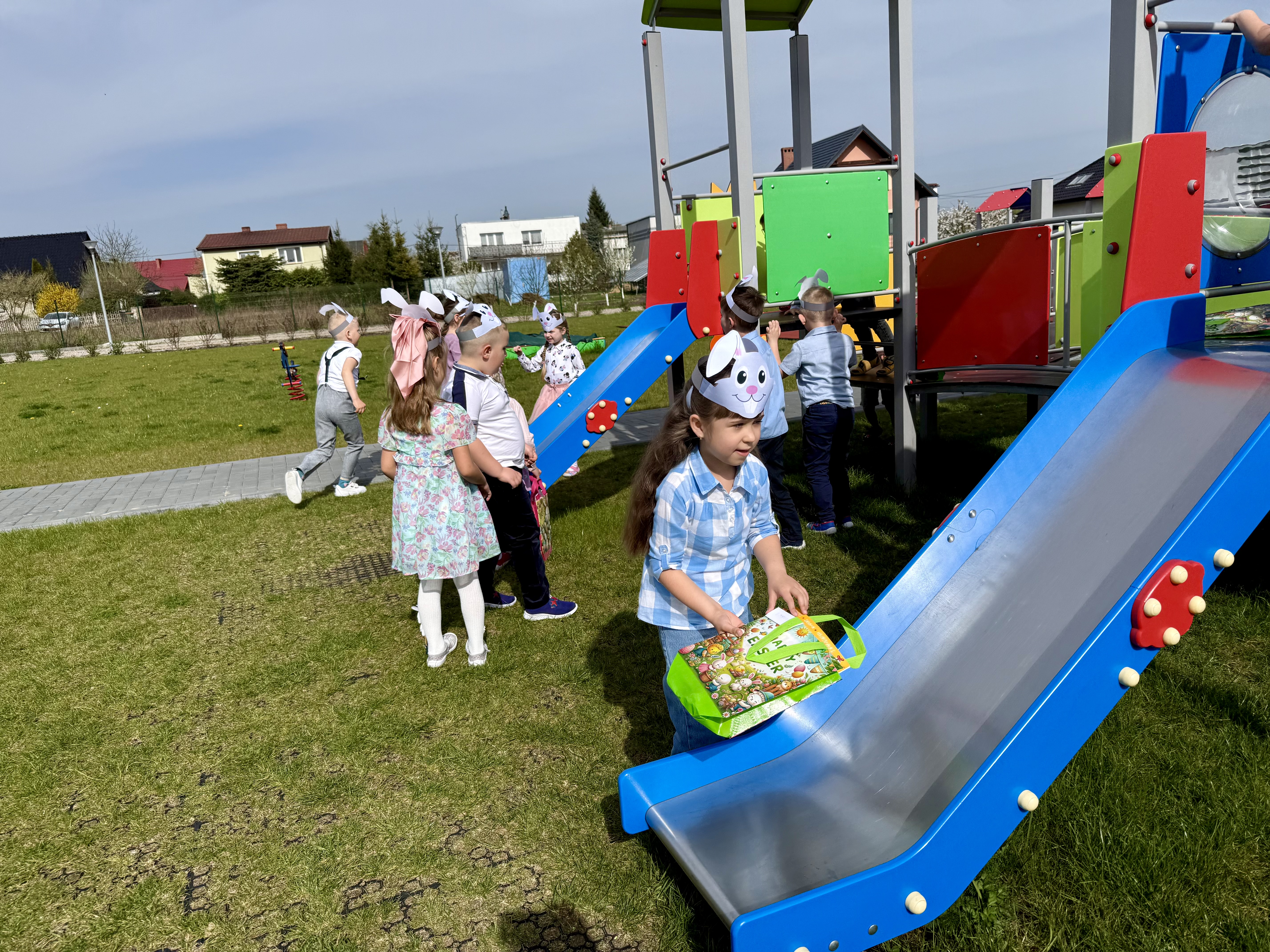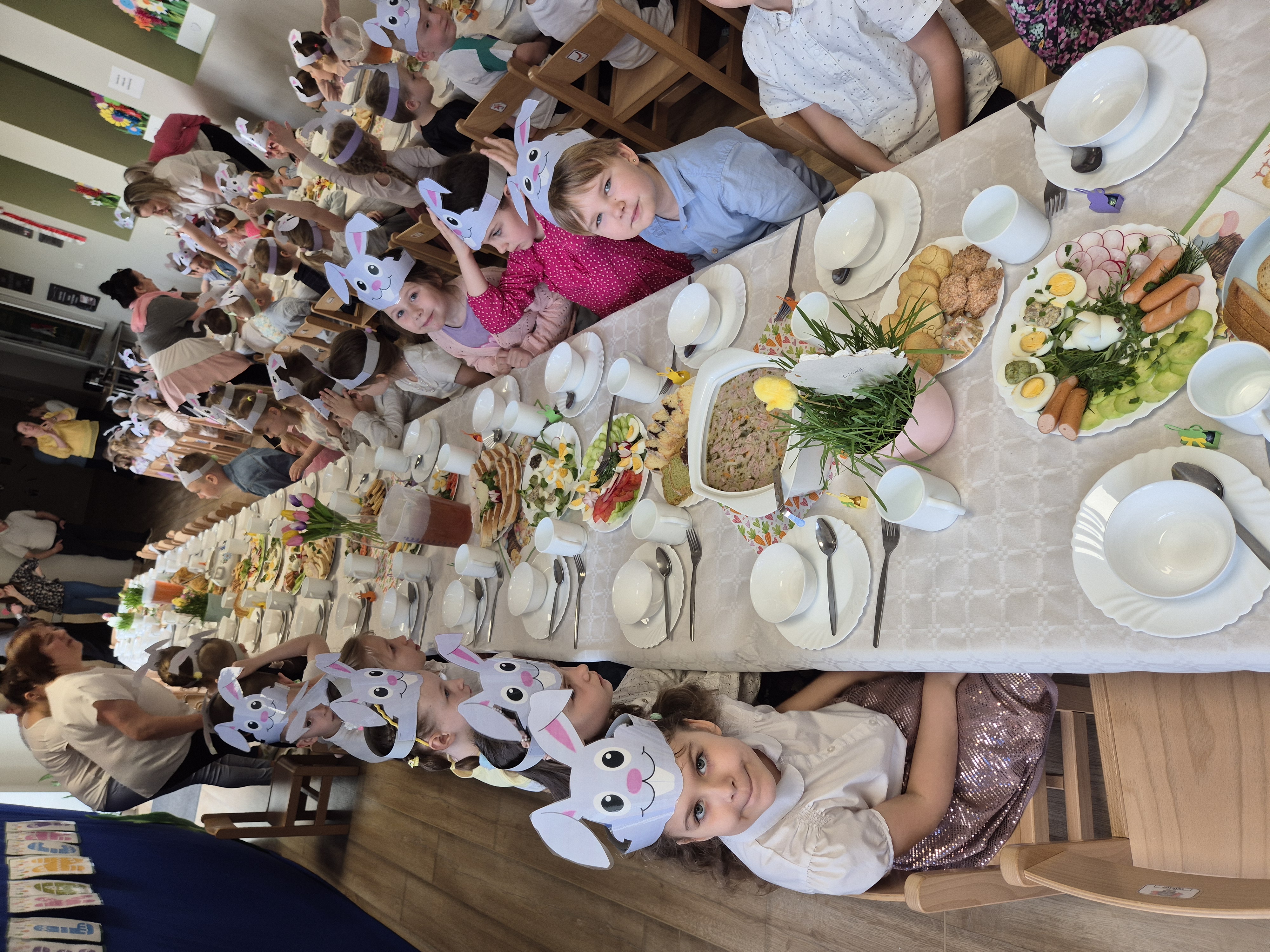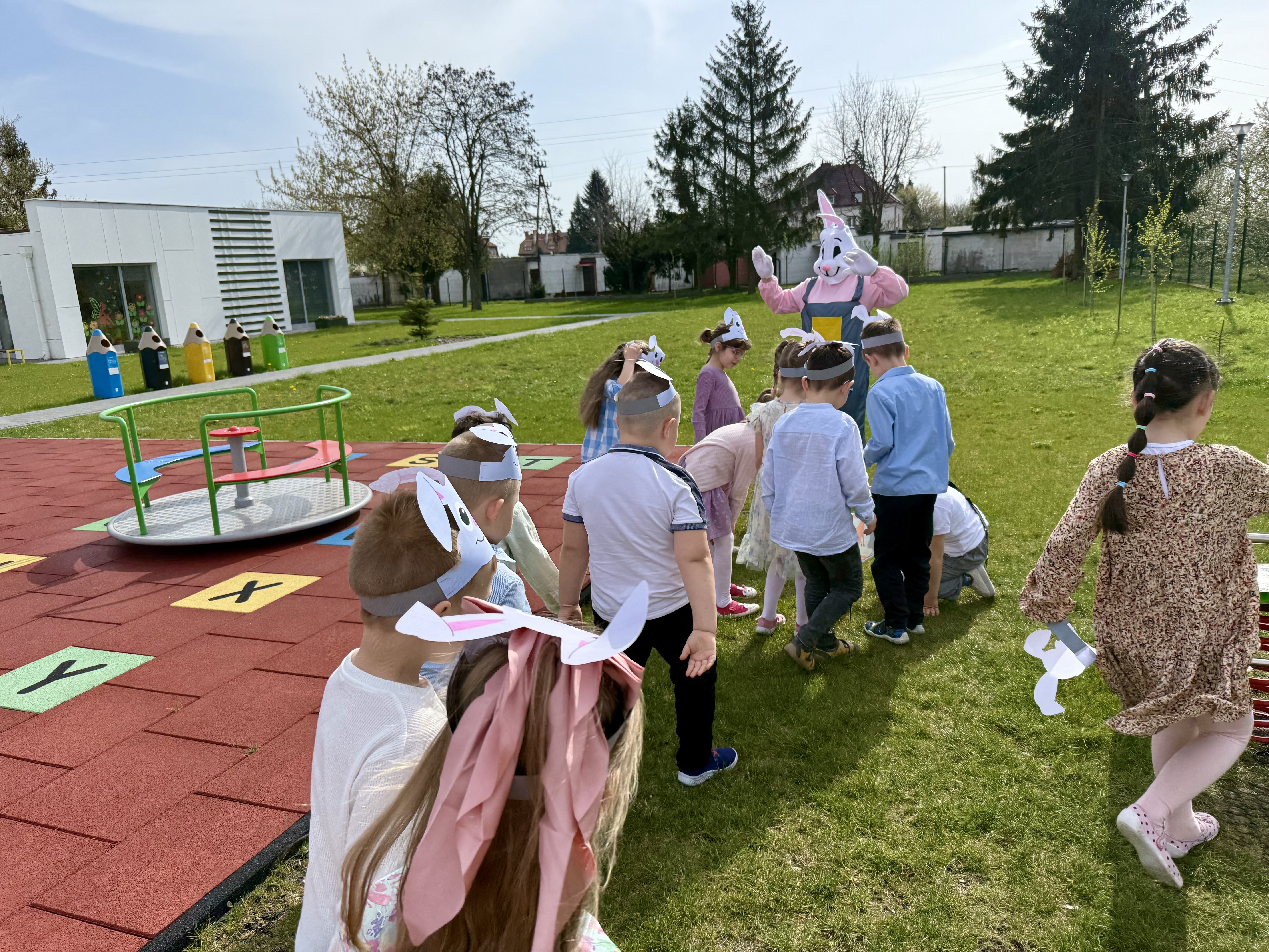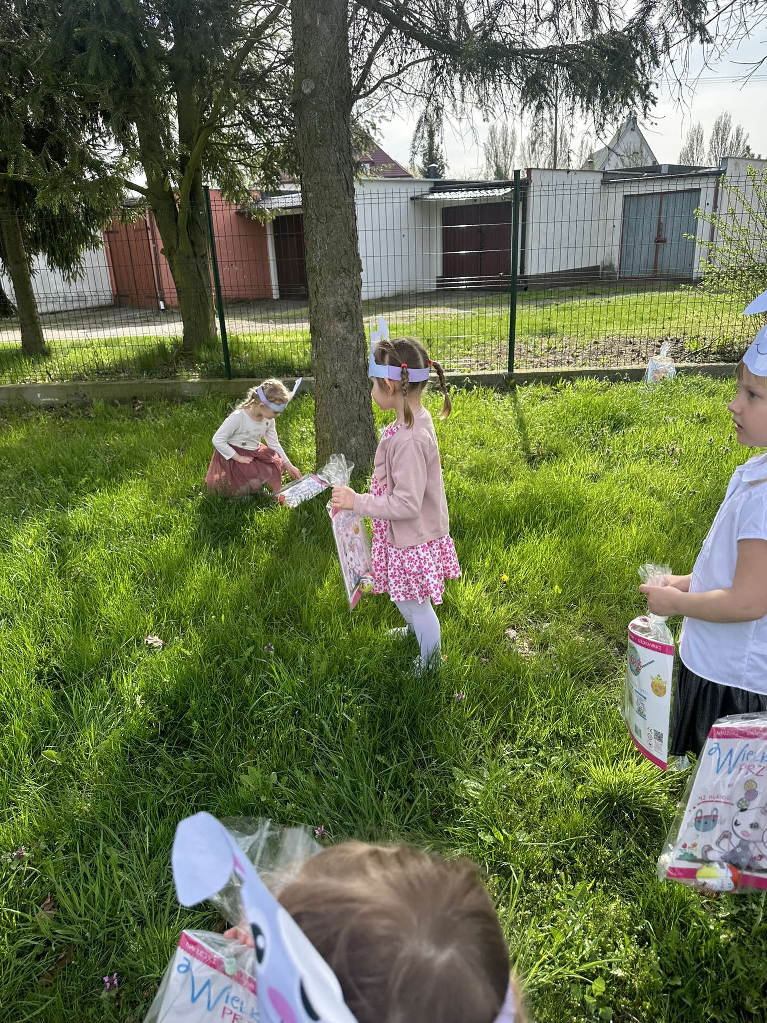 Wielkanoc to święto pełne tradycji i obyczajów. Tradycje wielkanocne sprawiają, że to święto staje się wyjątkowe, a świąteczne dni są pełne radości. Dnia 17 kwietnia w naszym przedszkolu odbył się uroczysty Poranek Wielkanocny. Dzieci wraz z wychowawcami zebrały się na holu, gdzie wspólnie zasiadły do świątecznego śniadanka. Na świątecznym stole nie zabrakło jajka, żurku, szynki i baranka. Pani Dyrektor powitała wszystkich i złożyła serdeczne wielkanocne życzenia. Po śniadaniu pojawił się wyjątkowy gość – Zajączek Wielkanocny. Dzieci z radością przywitały go piosenką. Następnie wszyscy udaliśmy się do ogrodu, gdzie Zajączek przygotował specjalne zadania do rozwiązania oraz pochował prezenty. Dzieci z wielkim zaangażowaniem szukały ukrytych niespodzianek. Na zakończenie pełnego emocji poranka wszyscy zrobili sobie wspólne pamiątkowe zdjęcie z zajączkiem. To był radosny czas pełen uśmiechu, zabawy i świątecznej atmosfery!