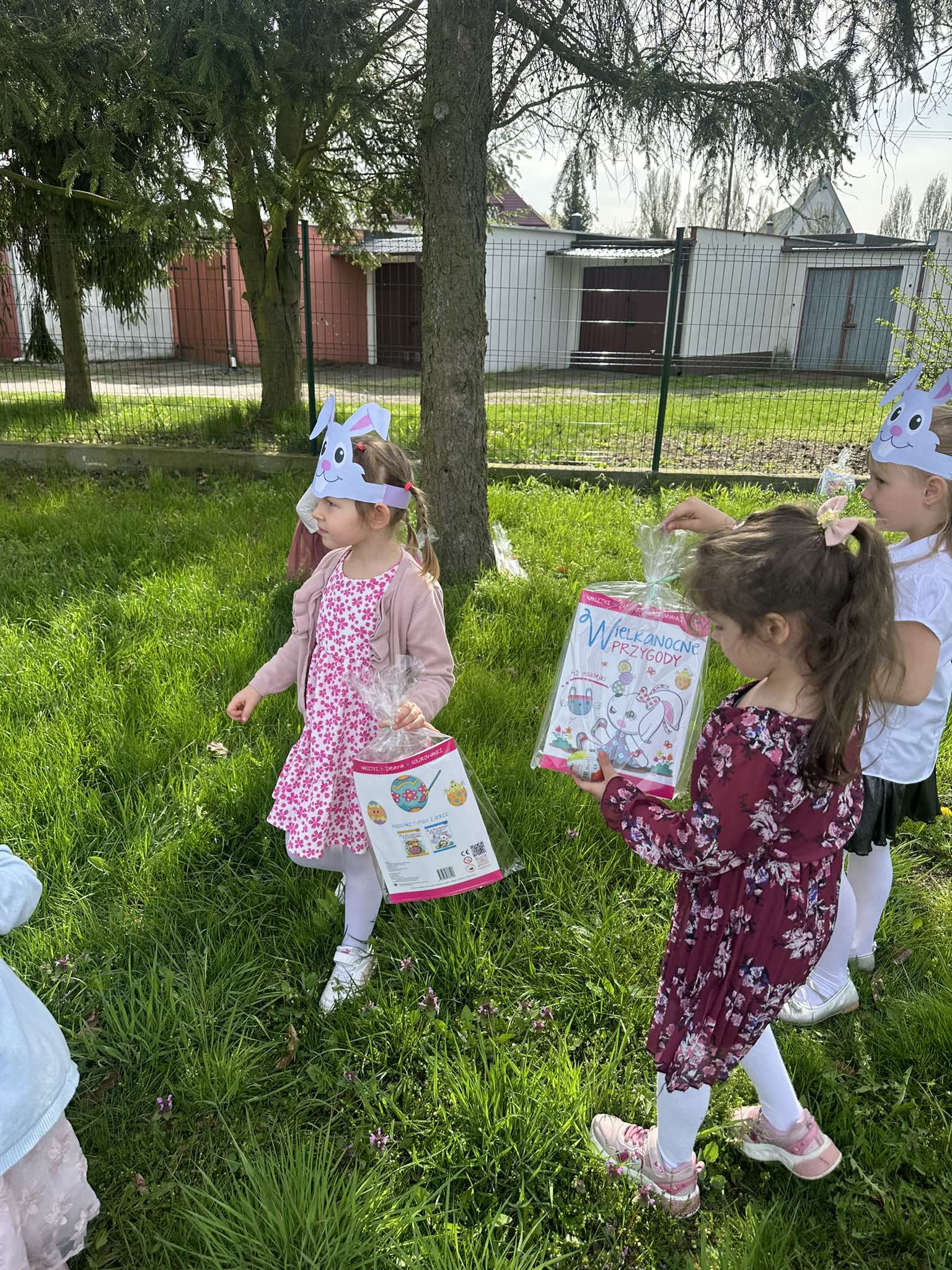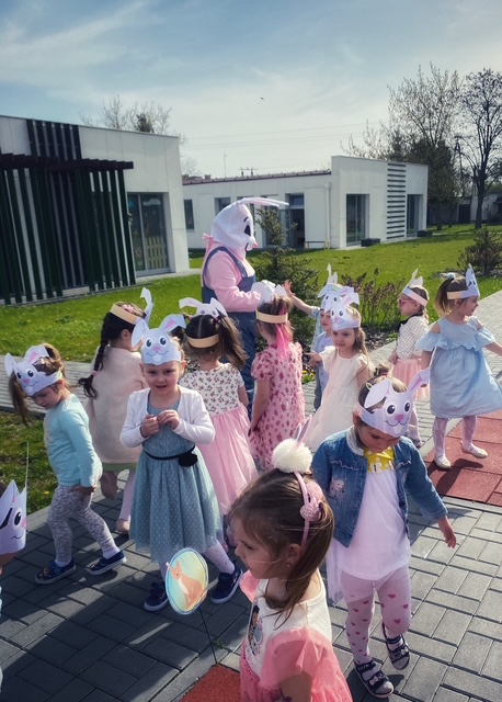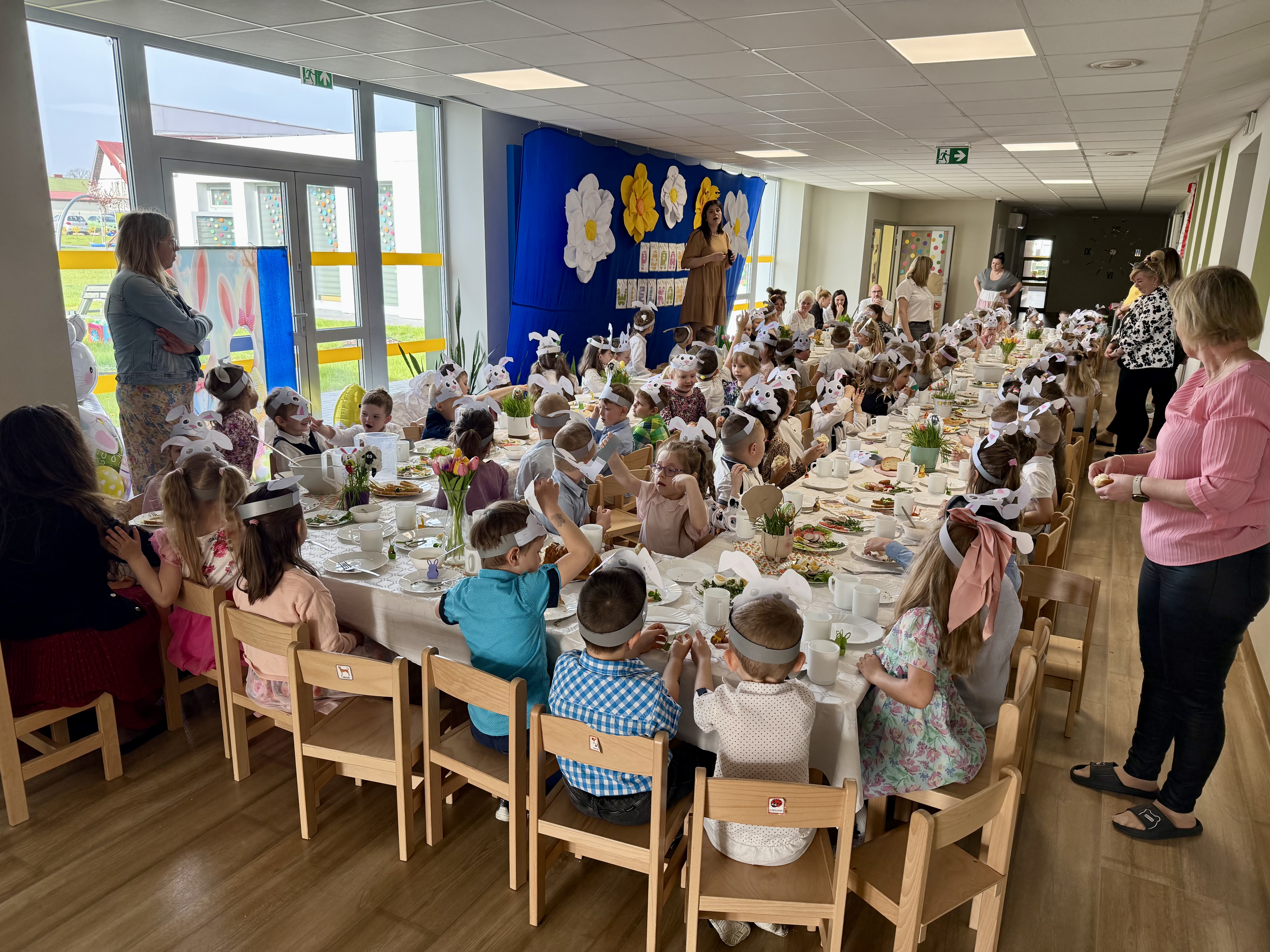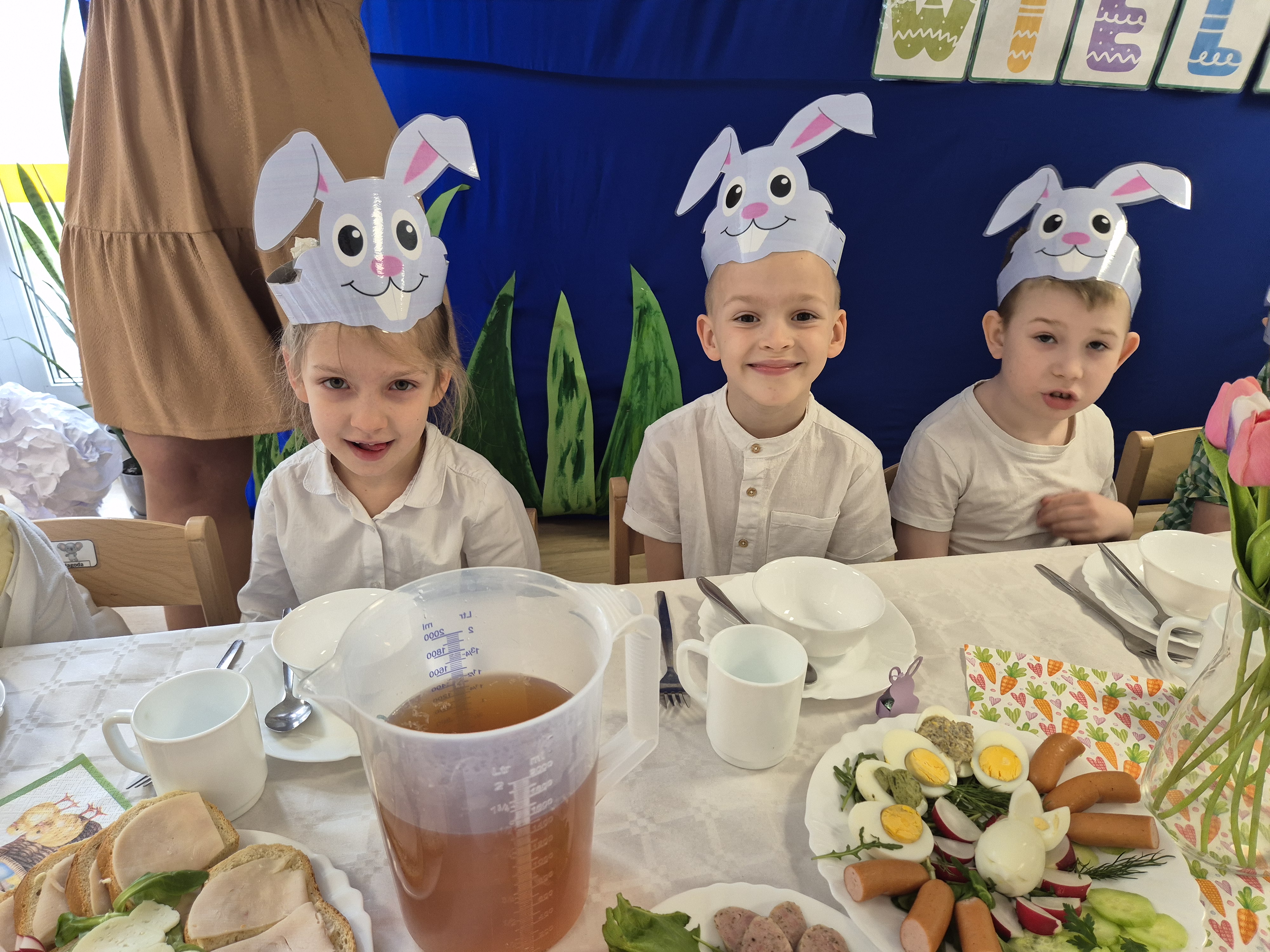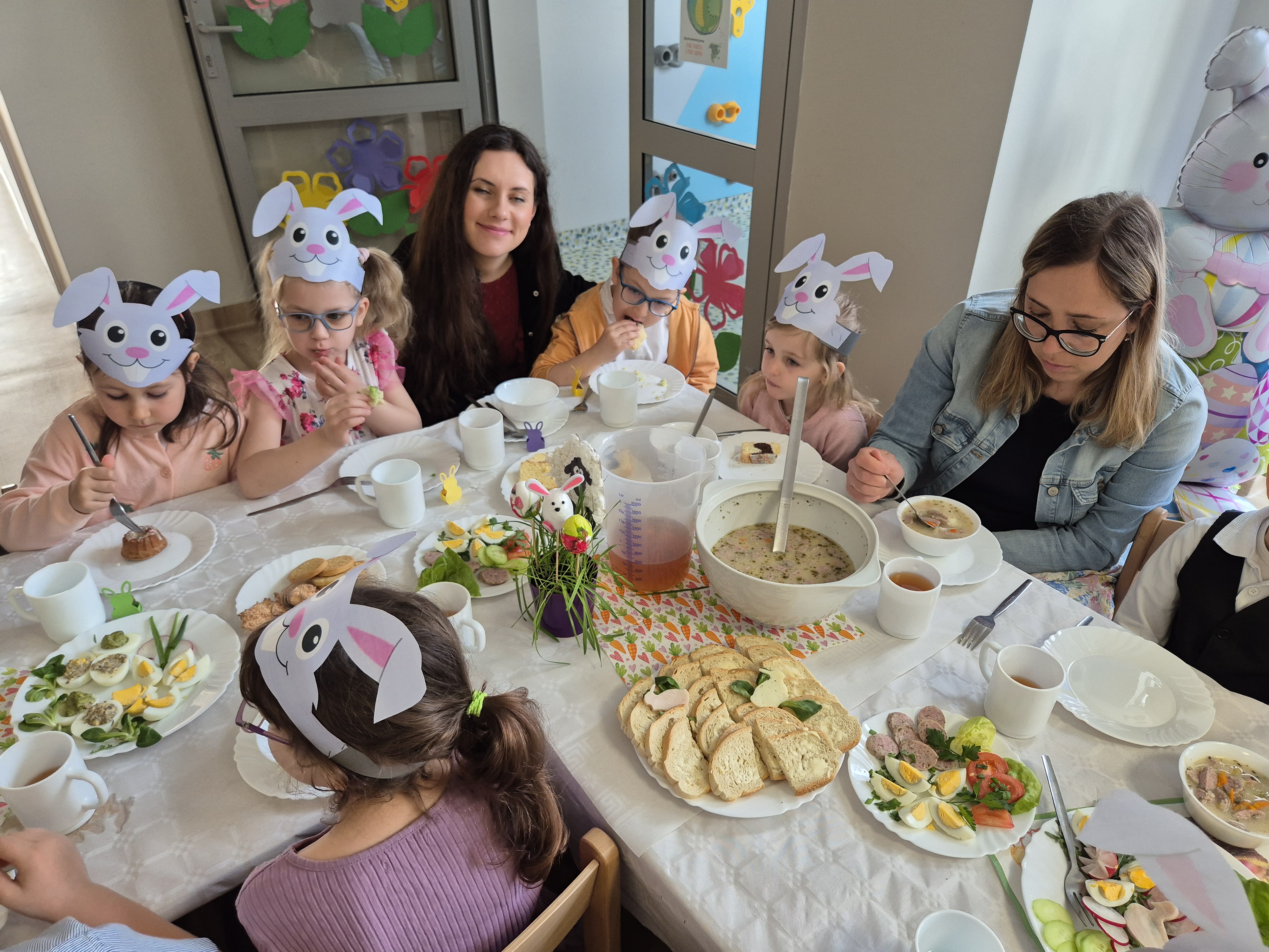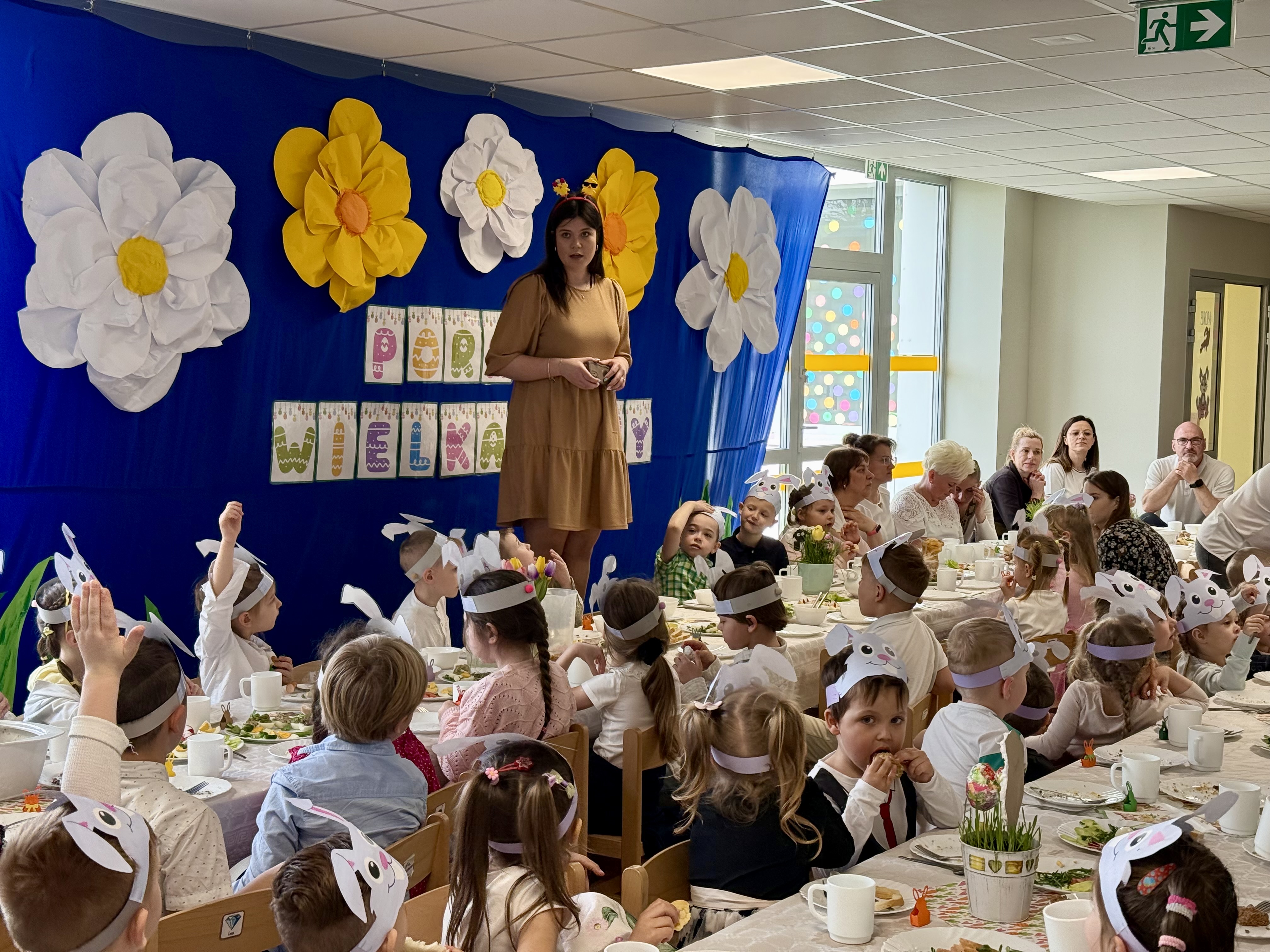 Wielkanoc to święto pełne tradycji i obyczajów. Tradycje wielkanocne sprawiają, że to święto staje się wyjątkowe, a świąteczne dni są pełne radości. Dnia 17 kwietnia w naszym przedszkolu odbył się uroczysty Poranek Wielkanocny. Dzieci wraz z wychowawcami zebrały się na holu, gdzie wspólnie zasiadły do świątecznego śniadanka. Na świątecznym stole nie zabrakło jajka, żurku, szynki i baranka. Pani Dyrektor powitała wszystkich i złożyła serdeczne wielkanocne życzenia. Po śniadaniu pojawił się wyjątkowy gość – Zajączek Wielkanocny. Dzieci z radością przywitały go piosenką. Następnie wszyscy udaliśmy się do ogrodu, gdzie Zajączek przygotował specjalne zadania do rozwiązania oraz pochował prezenty. Dzieci z wielkim zaangażowaniem szukały ukrytych niespodzianek. Na zakończenie pełnego emocji poranka wszyscy zrobili sobie wspólne pamiątkowe zdjęcie z zajączkiem. To był radosny czas pełen uśmiechu, zabawy i świątecznej atmosfery!