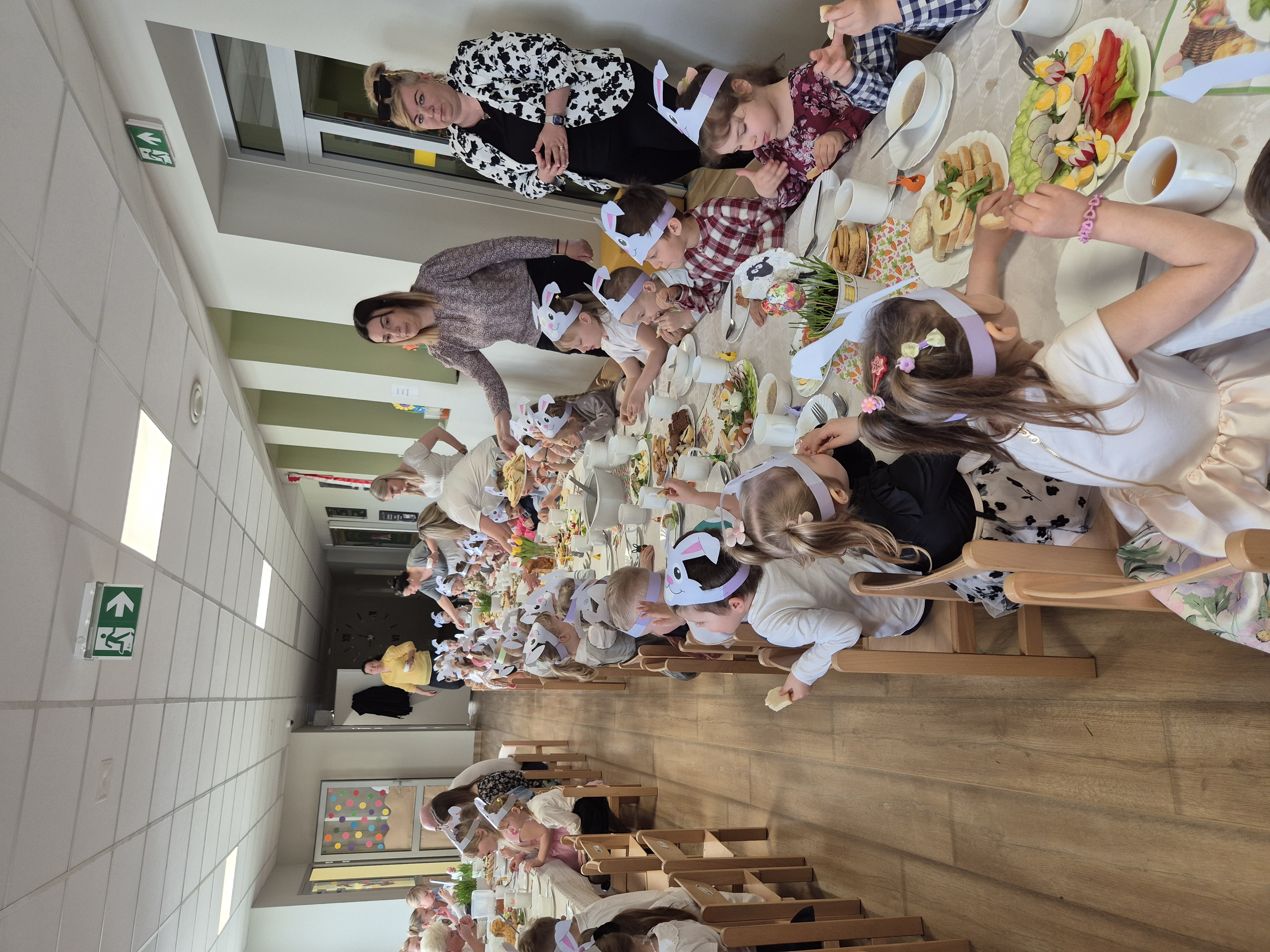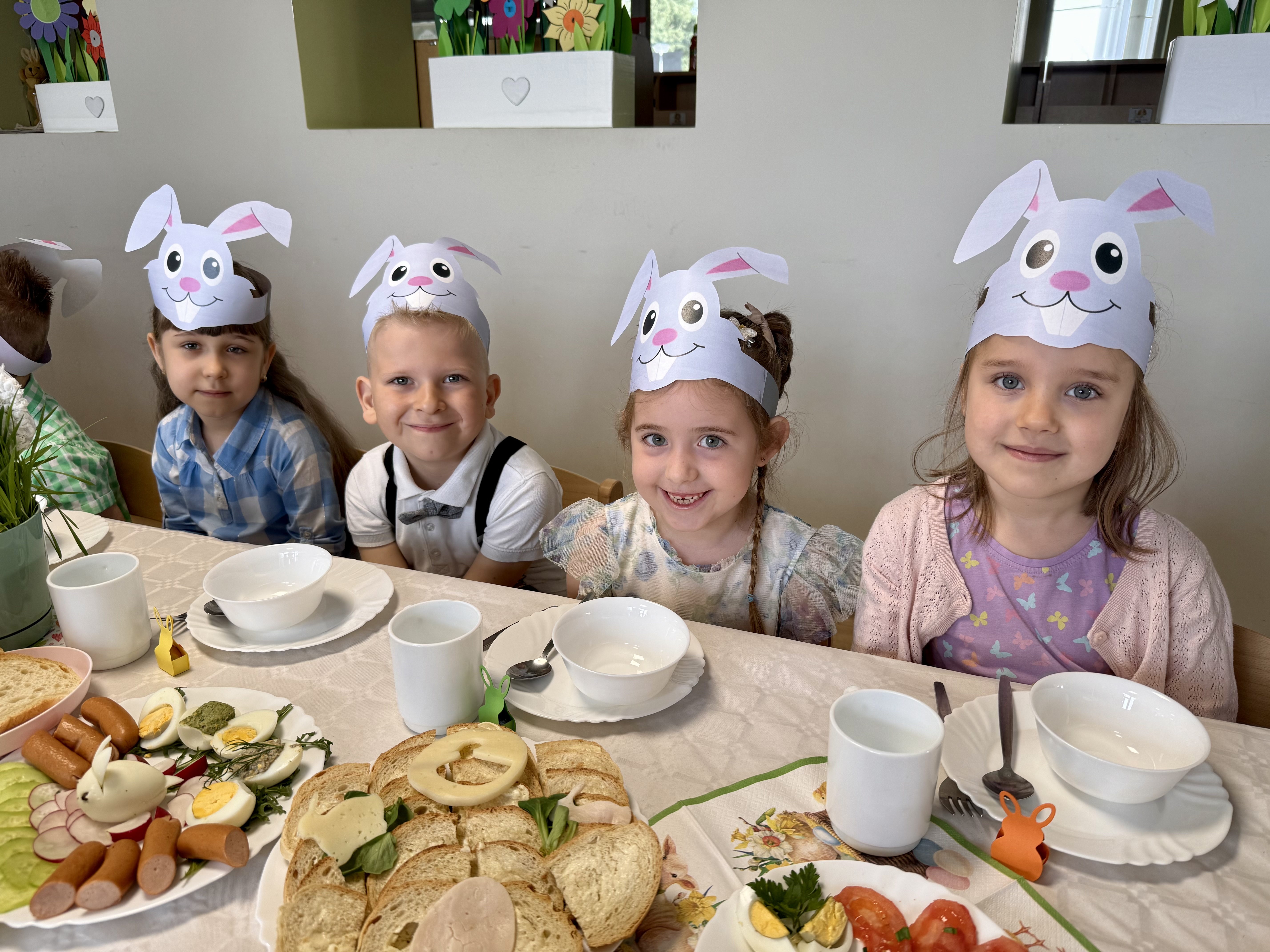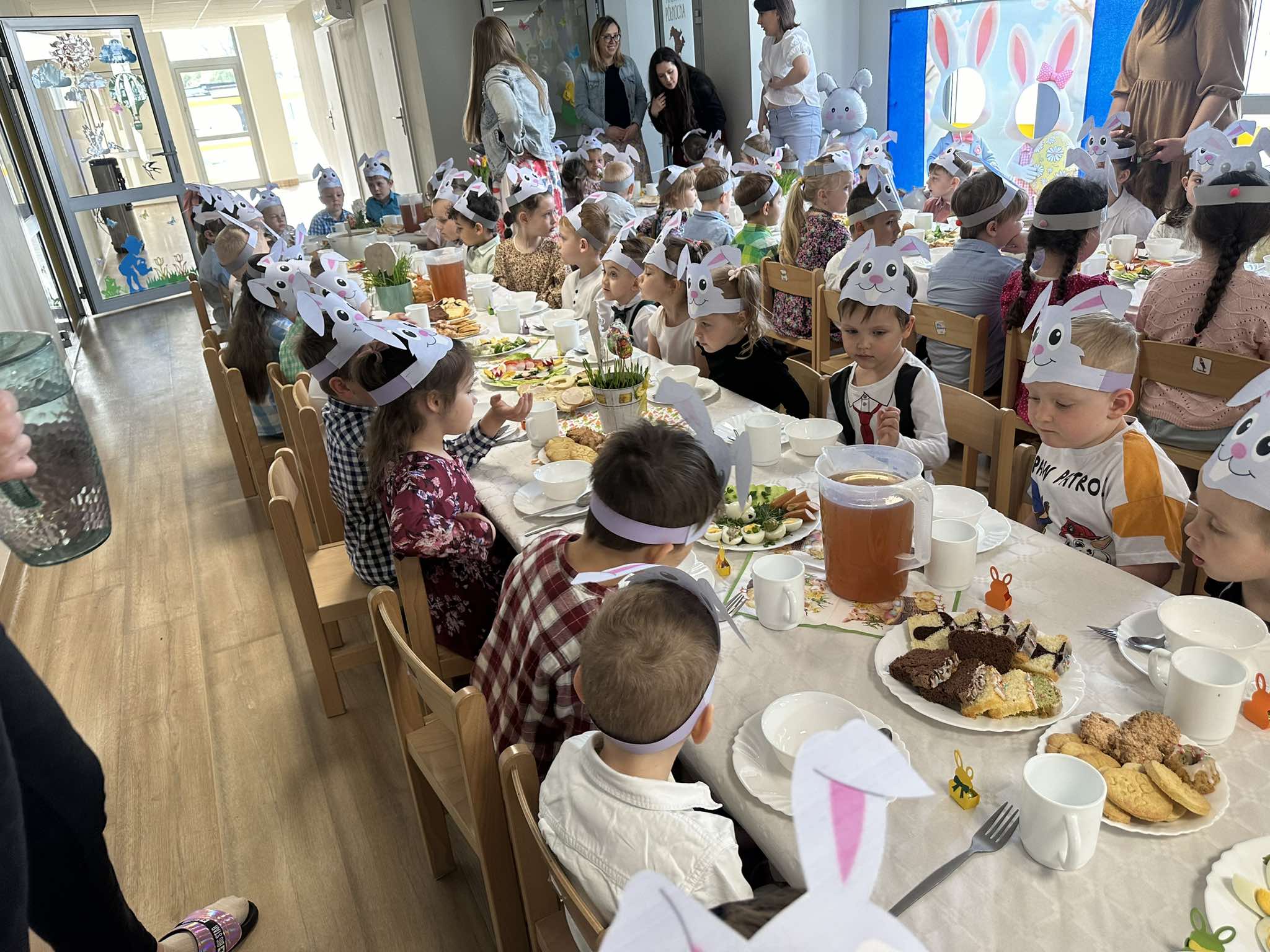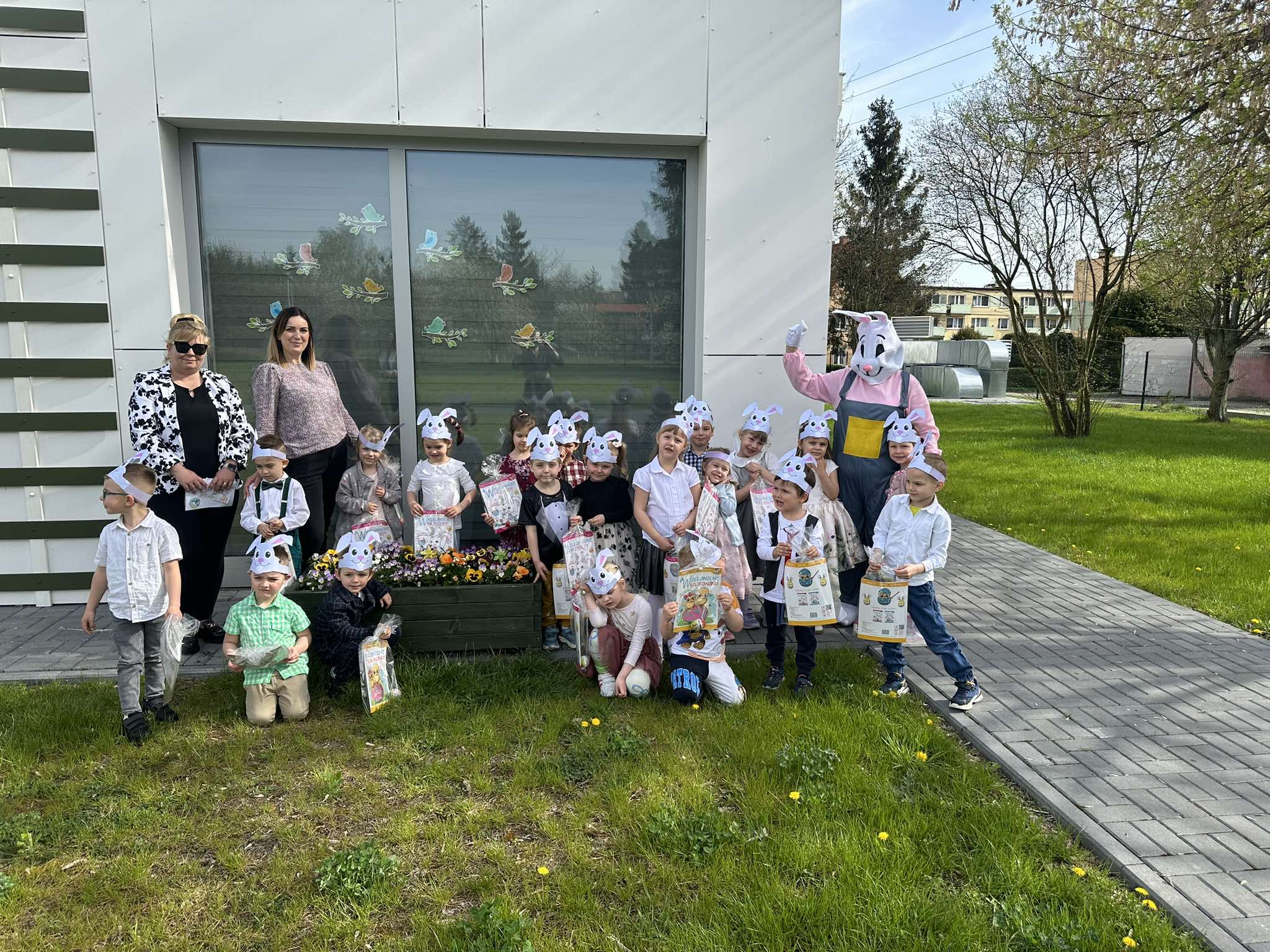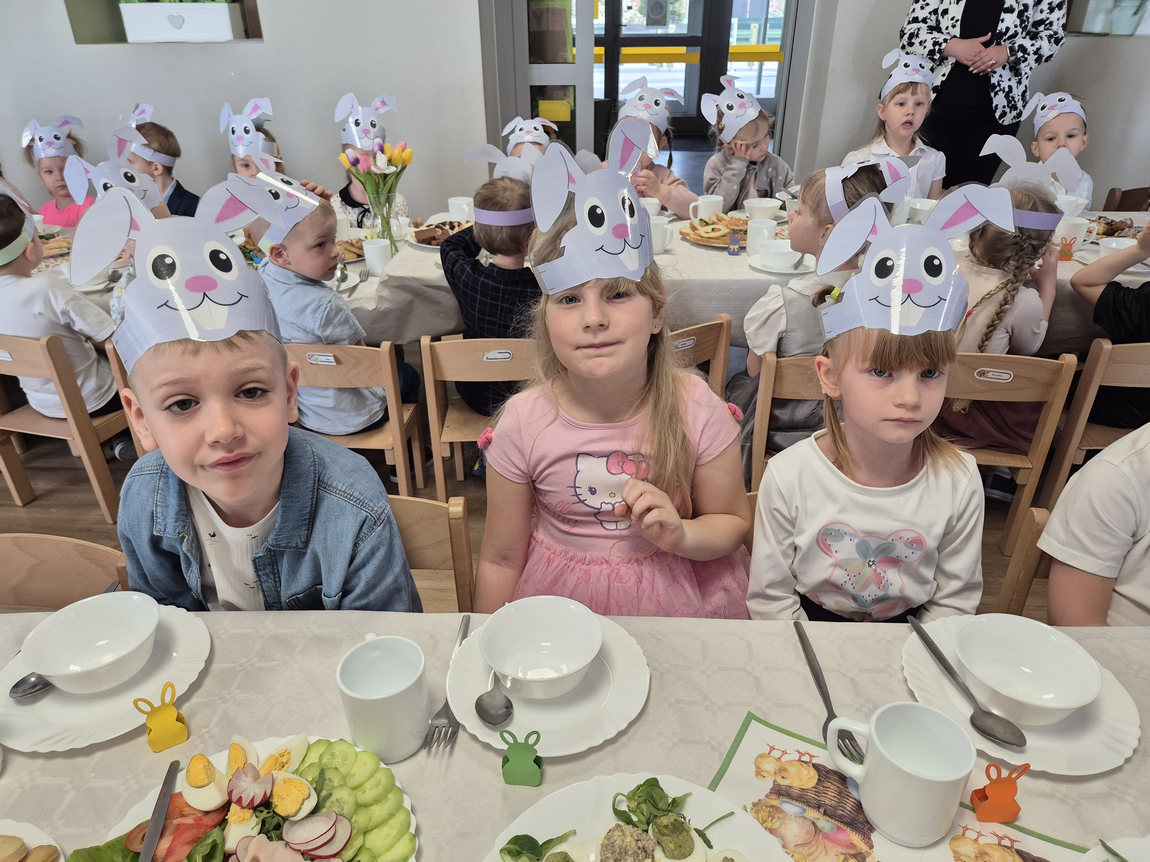 Wielkanoc to święto pełne tradycji i obyczajów. Tradycje wielkanocne sprawiają, że to święto staje się wyjątkowe, a świąteczne dni są pełne radości. Dnia 17 kwietnia w naszym przedszkolu odbył się uroczysty Poranek Wielkanocny. Dzieci wraz z wychowawcami zebrały się na holu, gdzie wspólnie zasiadły do świątecznego śniadanka. Na świątecznym stole nie zabrakło jajka, żurku, szynki i baranka. Pani Dyrektor powitała wszystkich i złożyła serdeczne wielkanocne życzenia. Po śniadaniu pojawił się wyjątkowy gość – Zajączek Wielkanocny. Dzieci z radością przywitały go piosenką. Następnie wszyscy udaliśmy się do ogrodu, gdzie Zajączek przygotował specjalne zadania do rozwiązania oraz pochował prezenty. Dzieci z wielkim zaangażowaniem szukały ukrytych niespodzianek. Na zakończenie pełnego emocji poranka wszyscy zrobili sobie wspólne pamiątkowe zdjęcie z zajączkiem. To był radosny czas pełen uśmiechu, zabawy i świątecznej atmosfery!