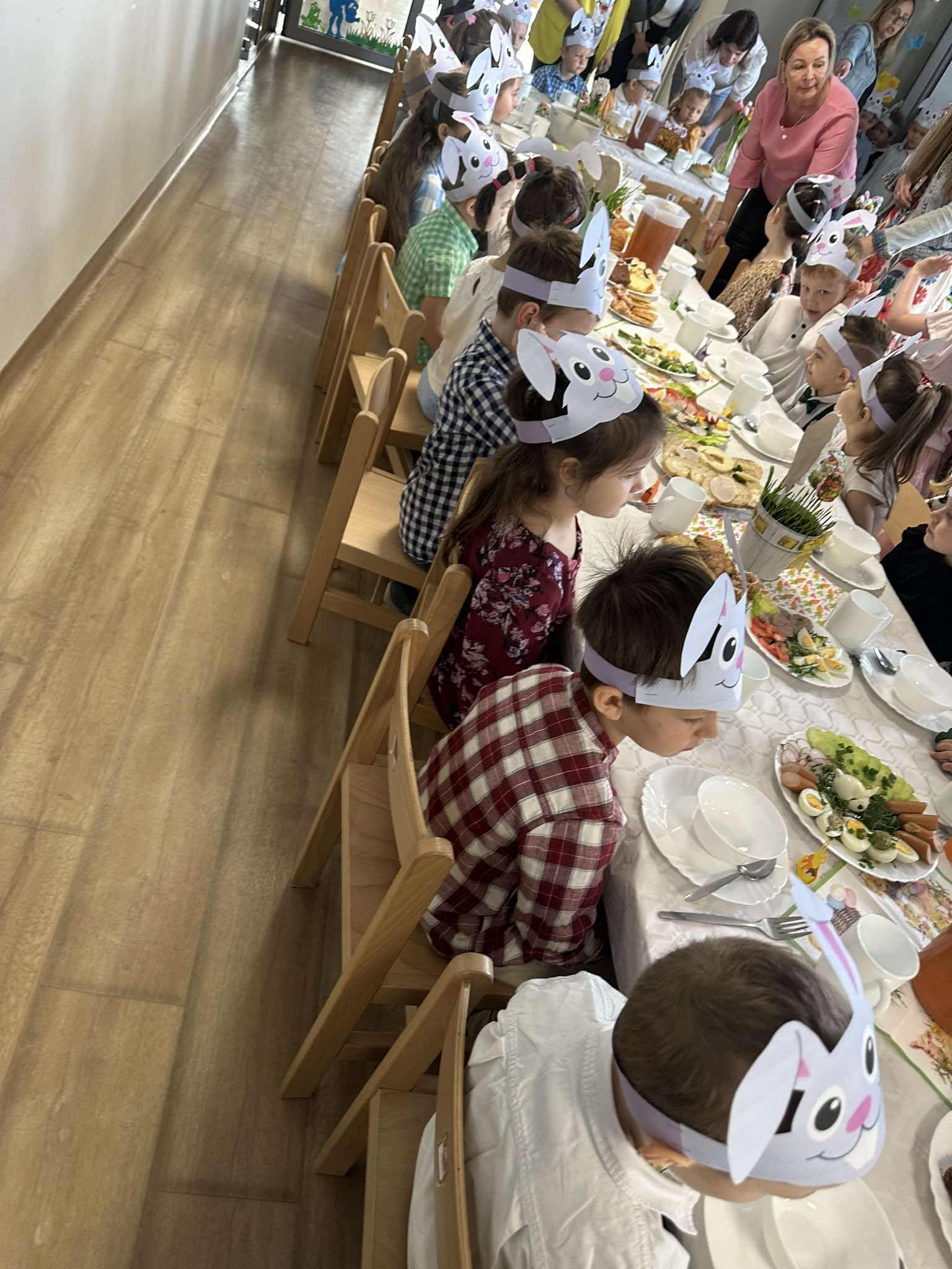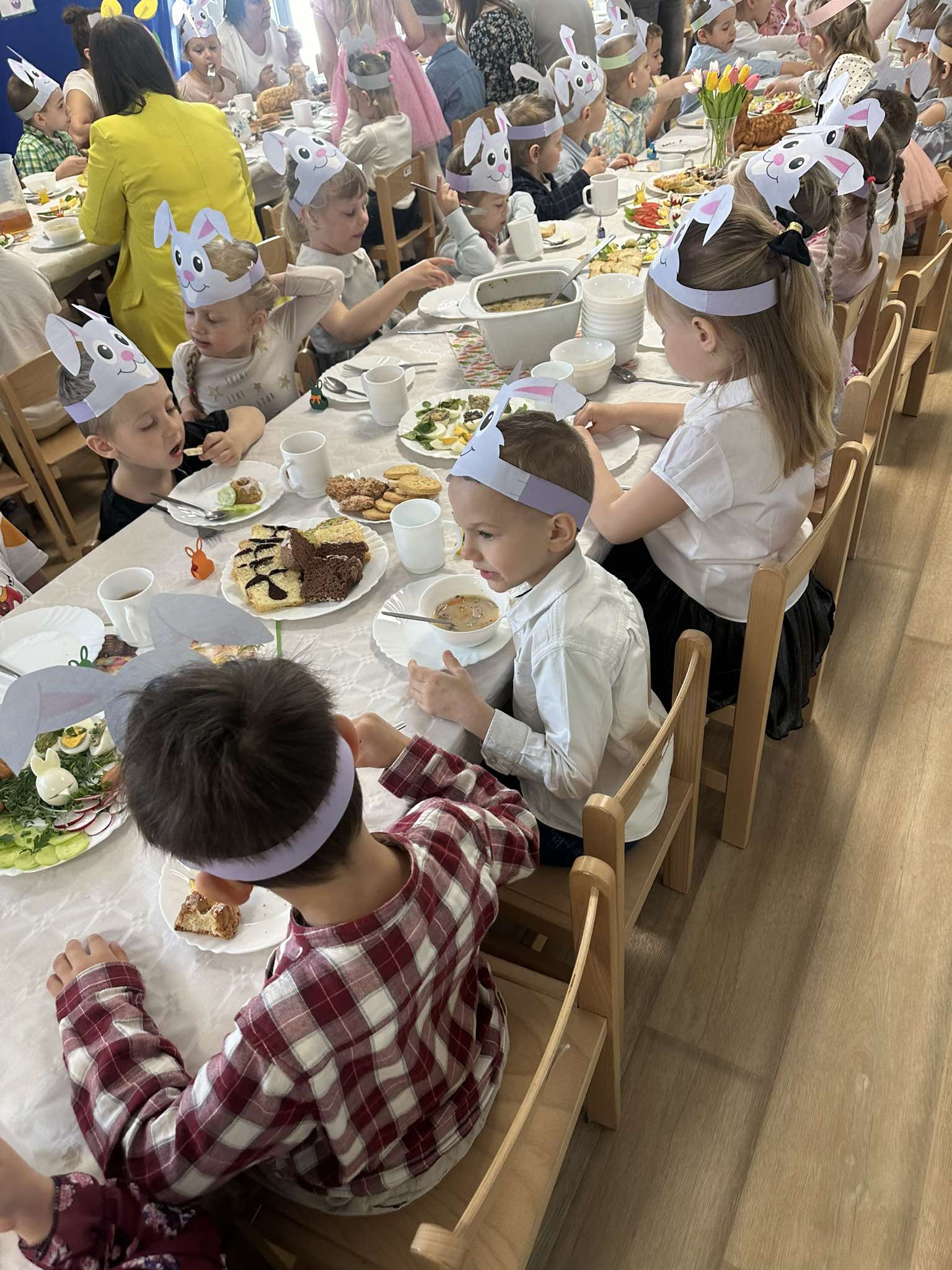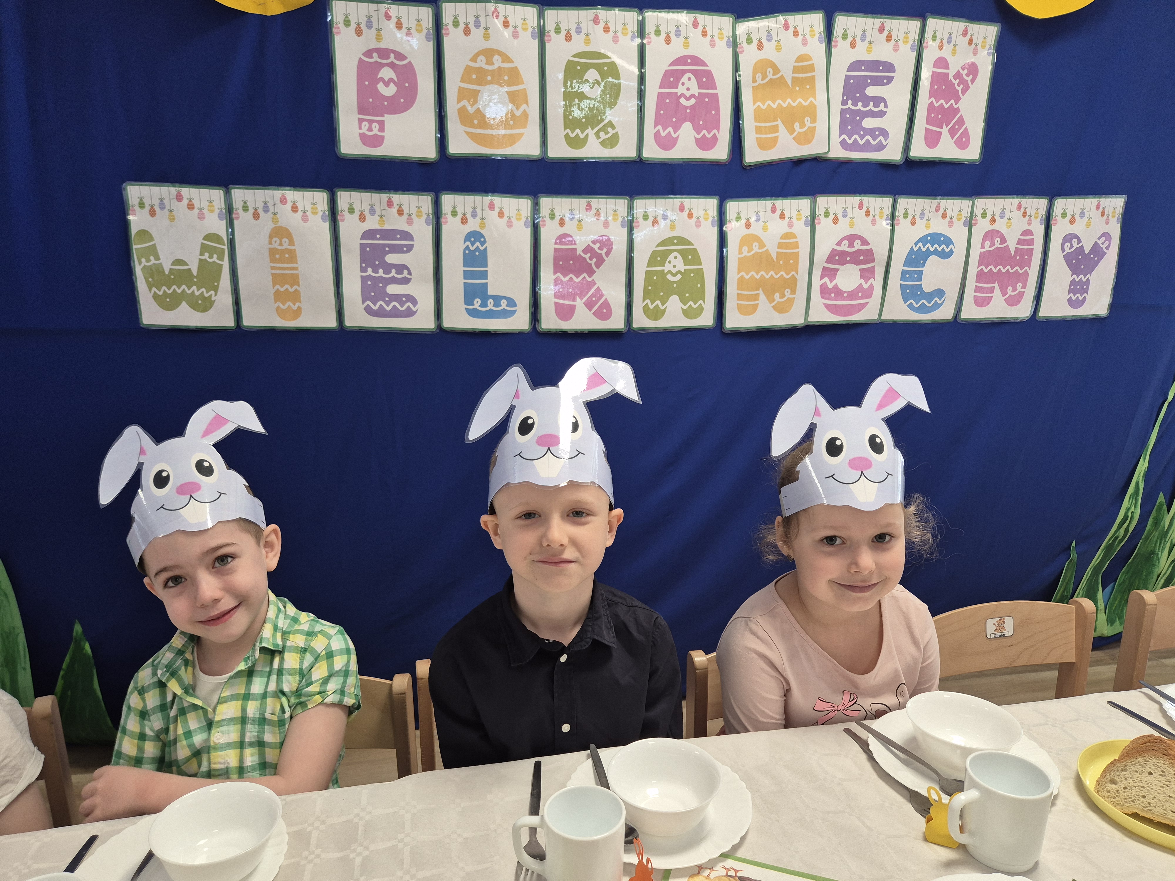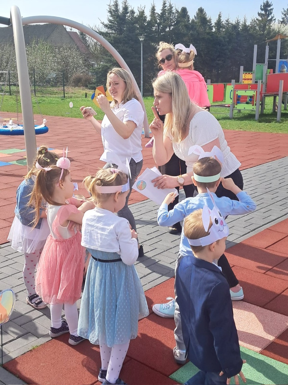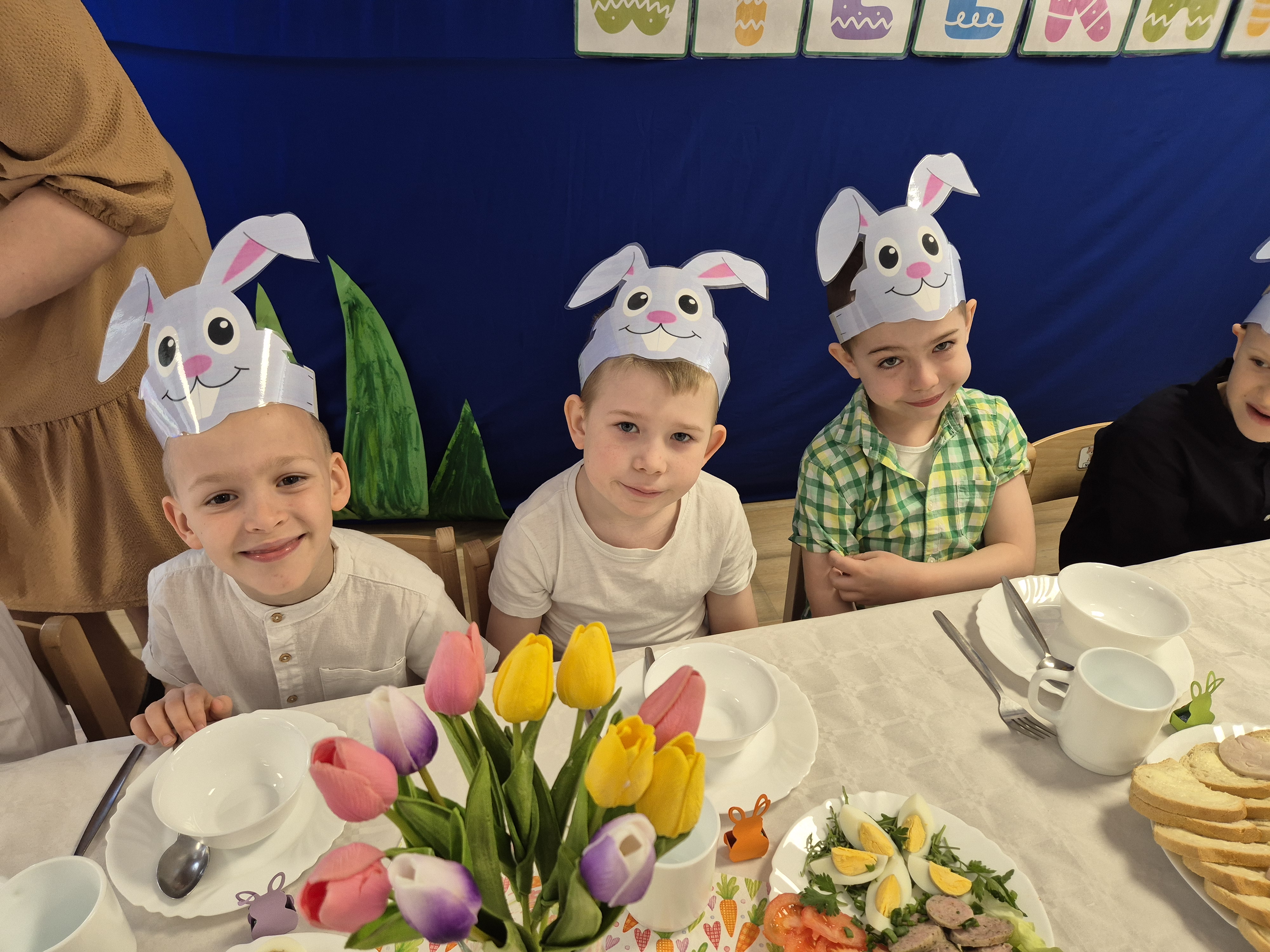 Wielkanoc to święto pełne tradycji i obyczajów. Tradycje wielkanocne sprawiają, że to święto staje się wyjątkowe, a świąteczne dni są pełne radości. Dnia 17 kwietnia w naszym przedszkolu odbył się uroczysty Poranek Wielkanocny. Dzieci wraz z wychowawcami zebrały się na holu, gdzie wspólnie zasiadły do świątecznego śniadanka. Na świątecznym stole nie zabrakło jajka, żurku, szynki i baranka. Pani Dyrektor powitała wszystkich i złożyła serdeczne wielkanocne życzenia. Po śniadaniu pojawił się wyjątkowy gość – Zajączek Wielkanocny. Dzieci z radością przywitały go piosenką. Następnie wszyscy udaliśmy się do ogrodu, gdzie Zajączek przygotował specjalne zadania do rozwiązania oraz pochował prezenty. Dzieci z wielkim zaangażowaniem szukały ukrytych niespodzianek. Na zakończenie pełnego emocji poranka wszyscy zrobili sobie wspólne pamiątkowe zdjęcie z zajączkiem. To był radosny czas pełen uśmiechu, zabawy i świątecznej atmosfery!