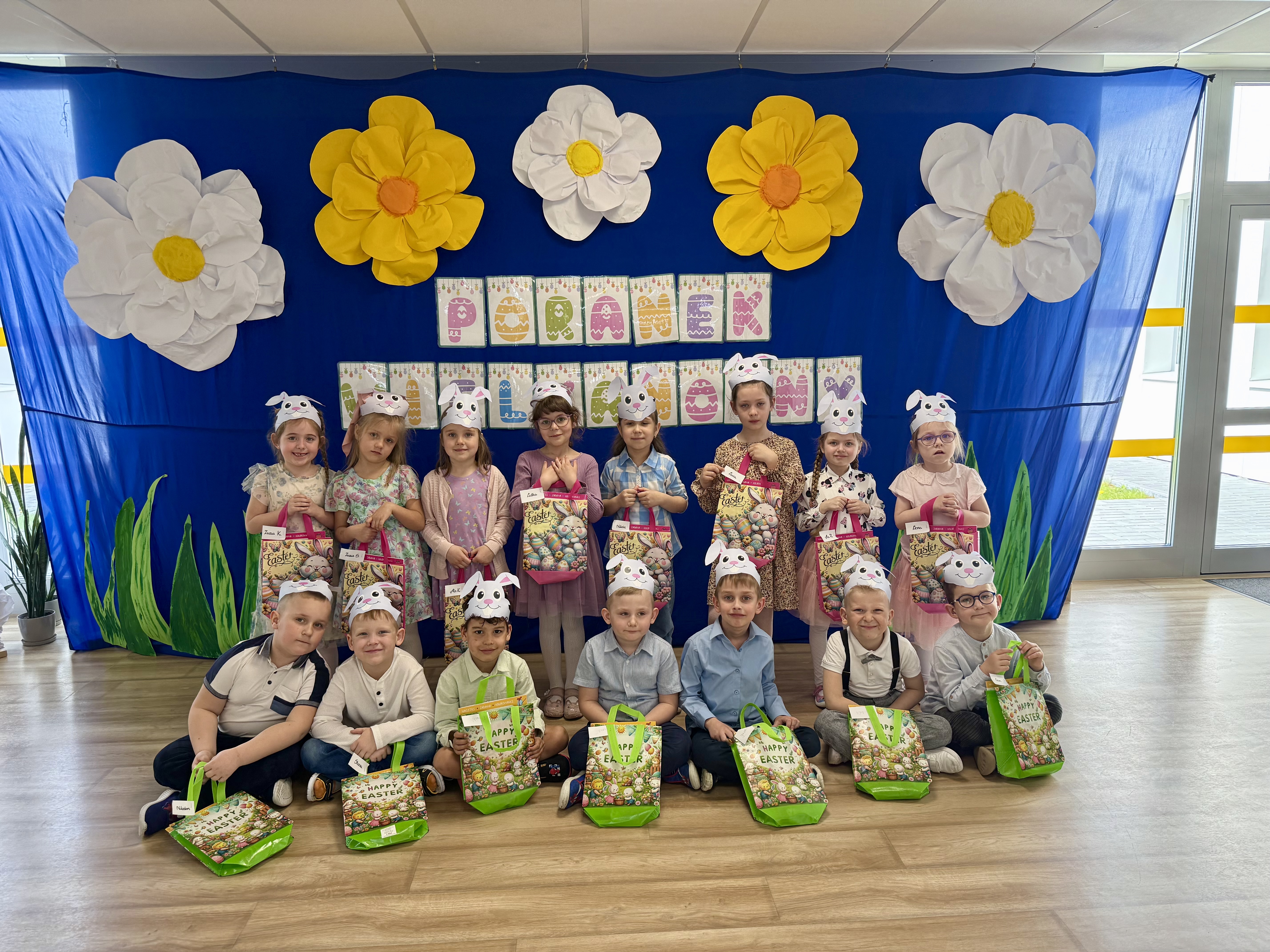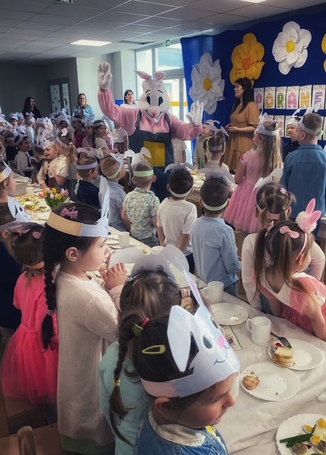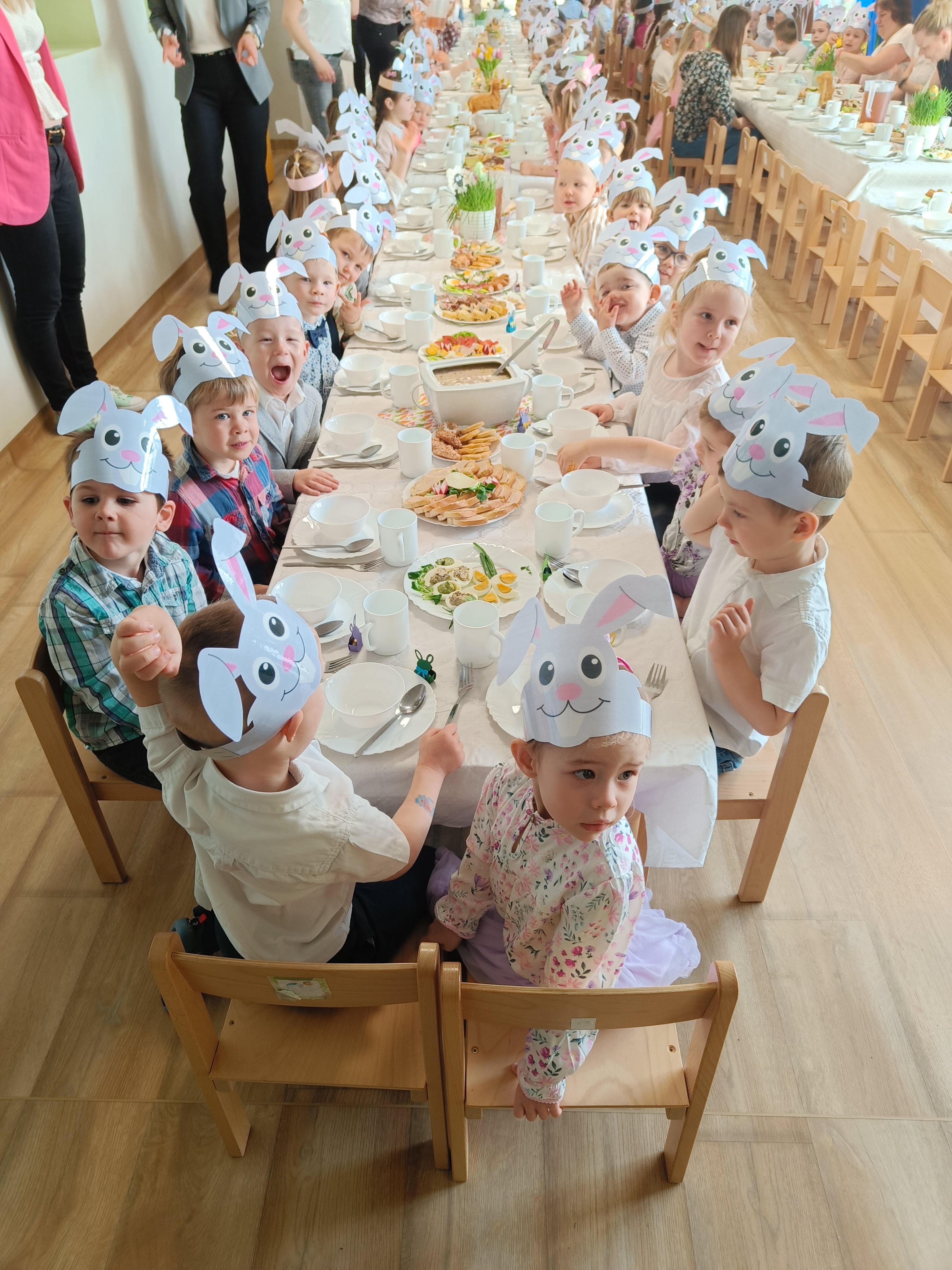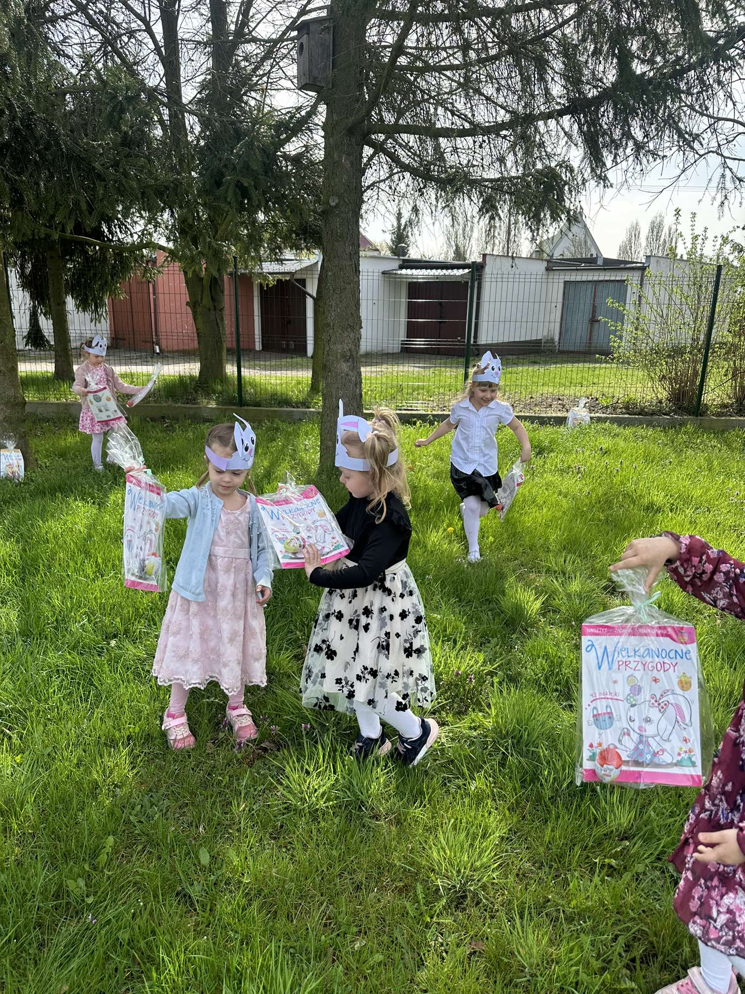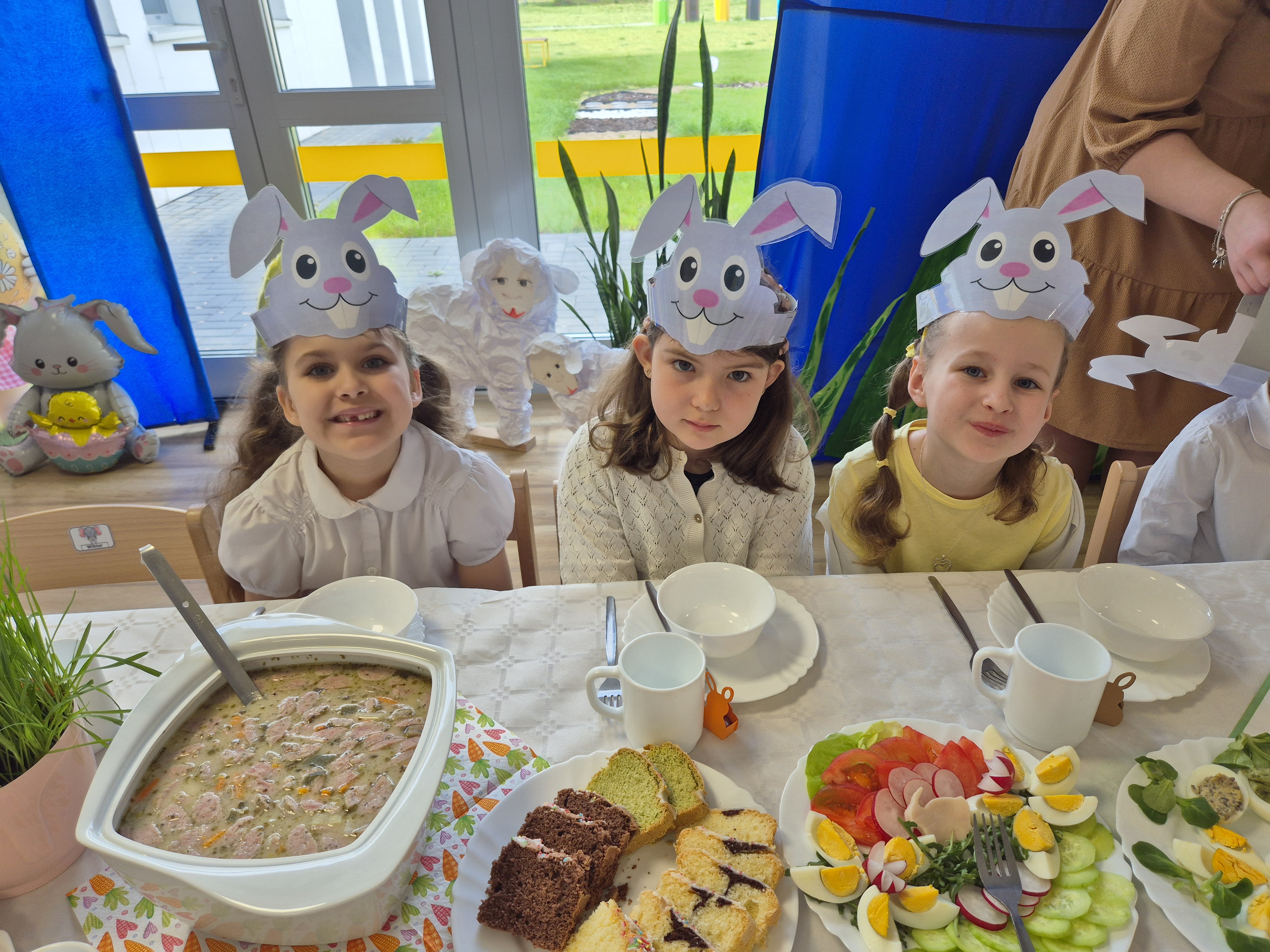 Wielkanoc to święto pełne tradycji i obyczajów. Tradycje wielkanocne sprawiają, że to święto staje się wyjątkowe, a świąteczne dni są pełne radości. Dnia 17 kwietnia w naszym przedszkolu odbył się uroczysty Poranek Wielkanocny. Dzieci wraz z wychowawcami zebrały się na holu, gdzie wspólnie zasiadły do świątecznego śniadanka. Na świątecznym stole nie zabrakło jajka, żurku, szynki i baranka. Pani Dyrektor powitała wszystkich i złożyła serdeczne wielkanocne życzenia. Po śniadaniu pojawił się wyjątkowy gość – Zajączek Wielkanocny. Dzieci z radością przywitały go piosenką. Następnie wszyscy udaliśmy się do ogrodu, gdzie Zajączek przygotował specjalne zadania do rozwiązania oraz pochował prezenty. Dzieci z wielkim zaangażowaniem szukały ukrytych niespodzianek. Na zakończenie pełnego emocji poranka wszyscy zrobili sobie wspólne pamiątkowe zdjęcie z zajączkiem. To był radosny czas pełen uśmiechu, zabawy i świątecznej atmosfery!