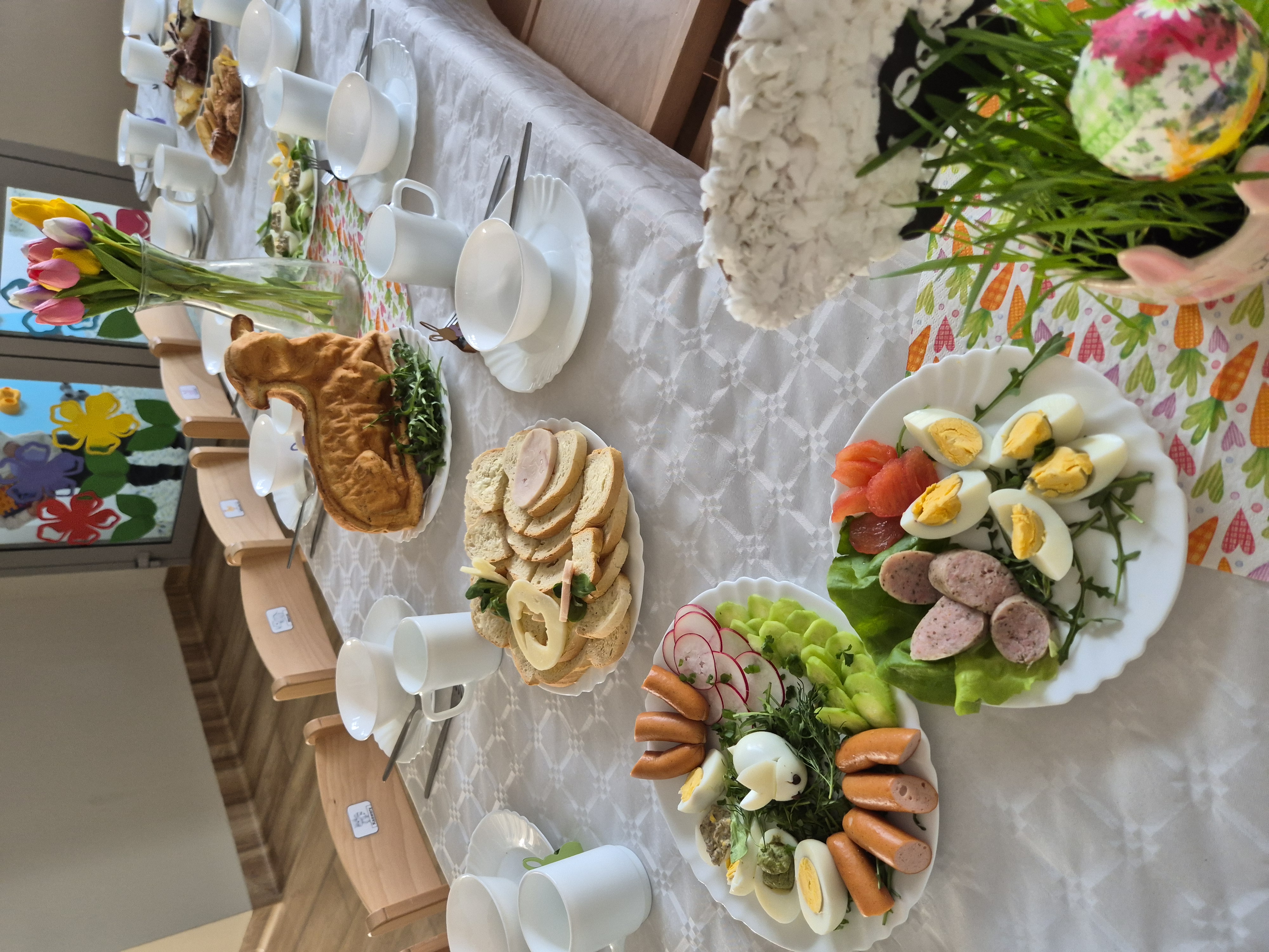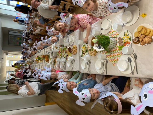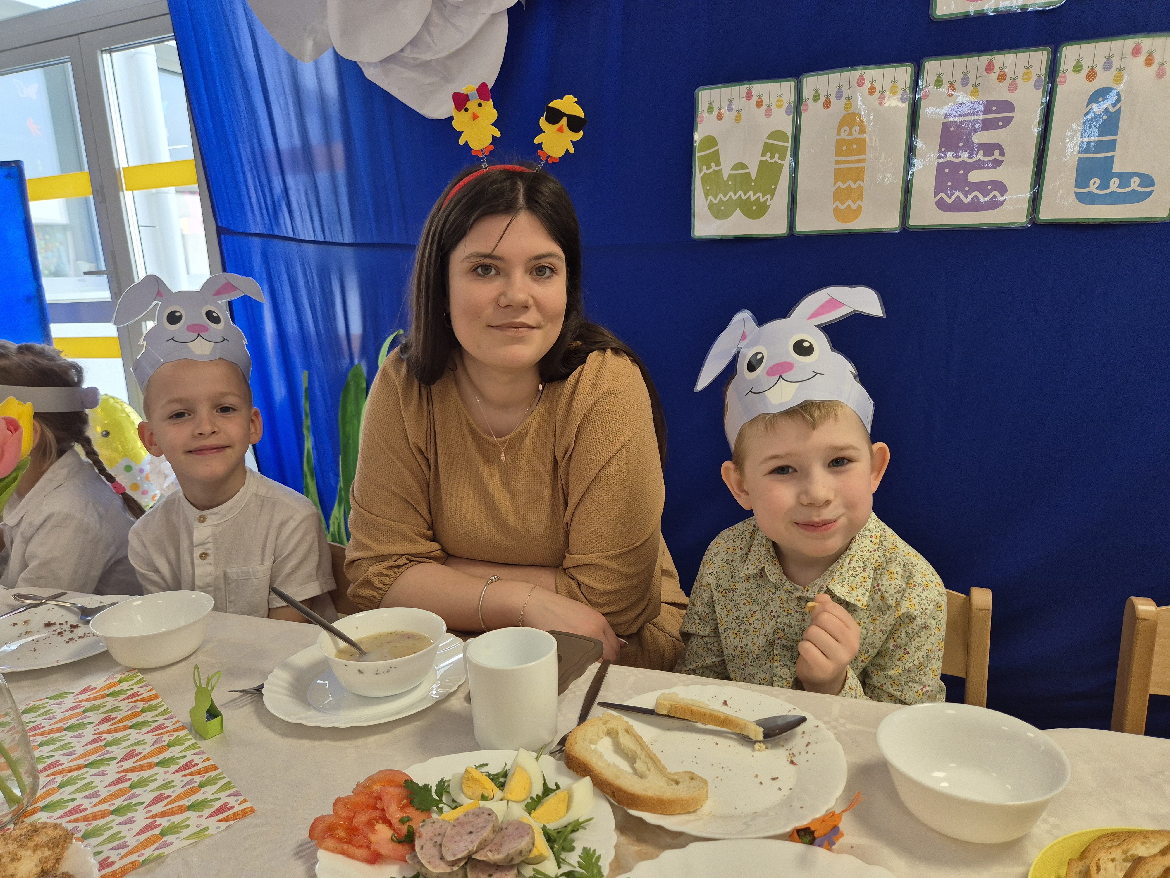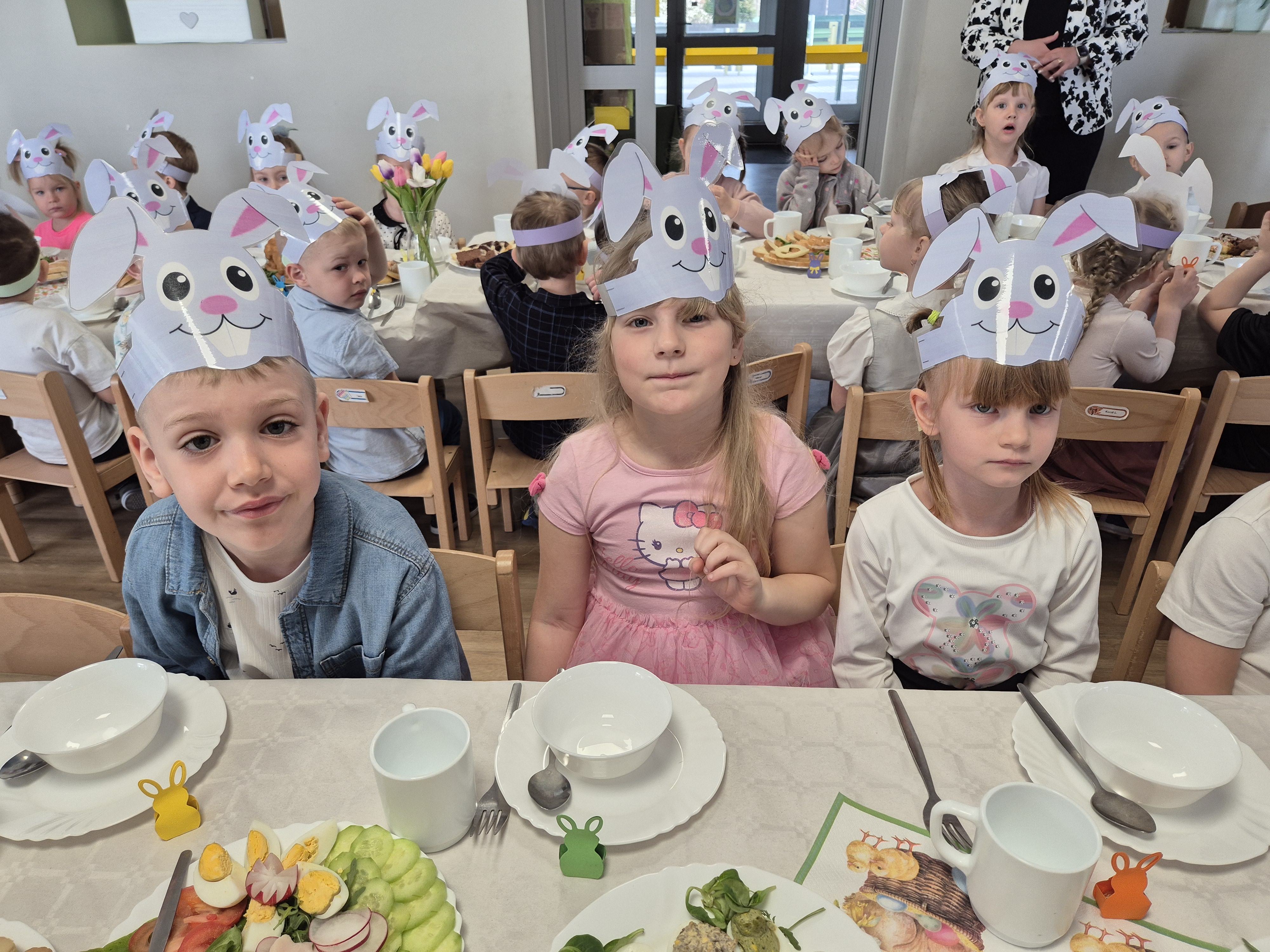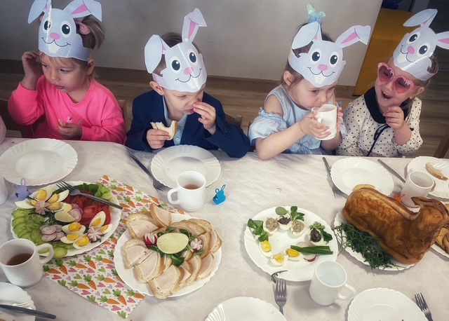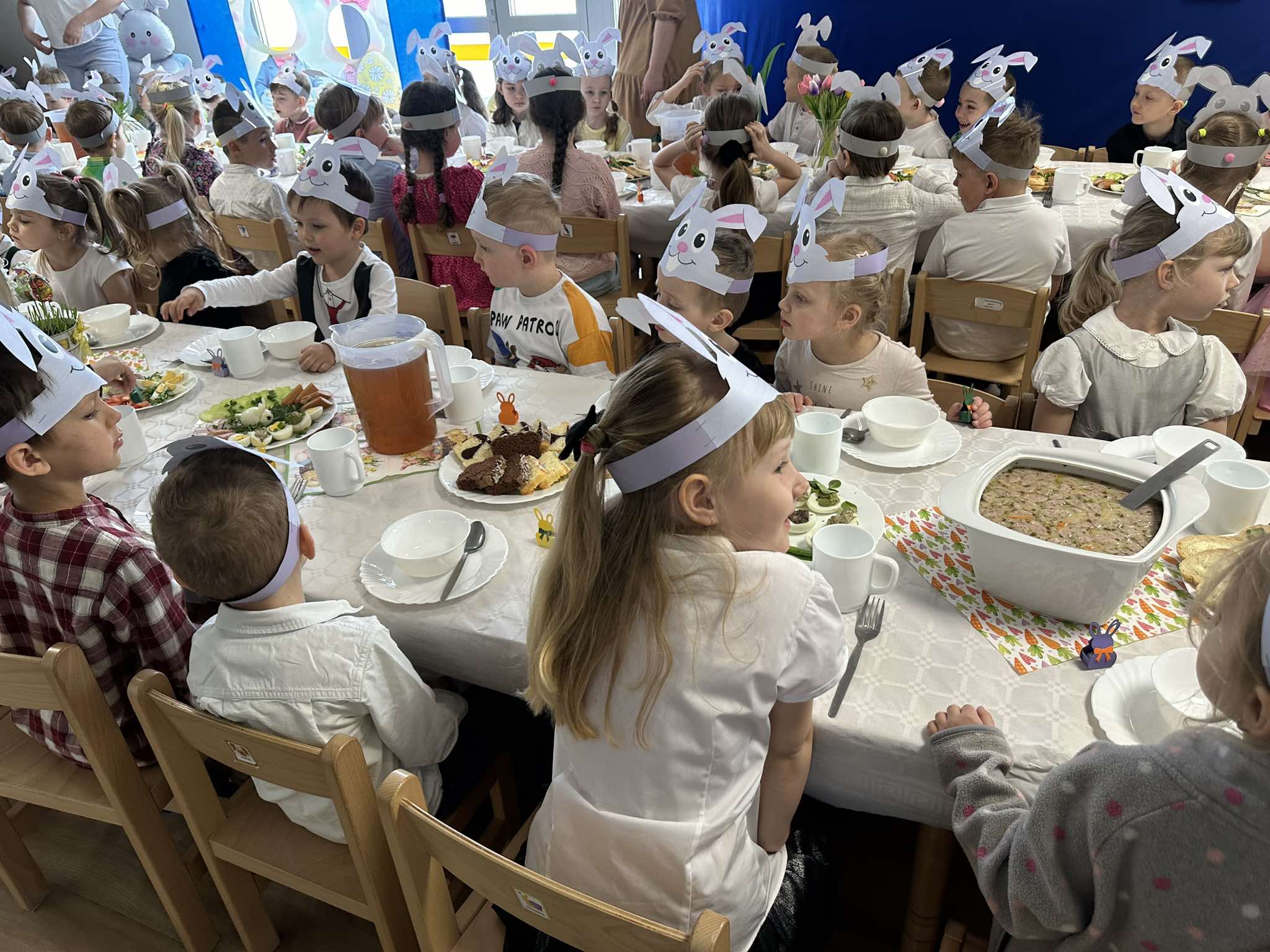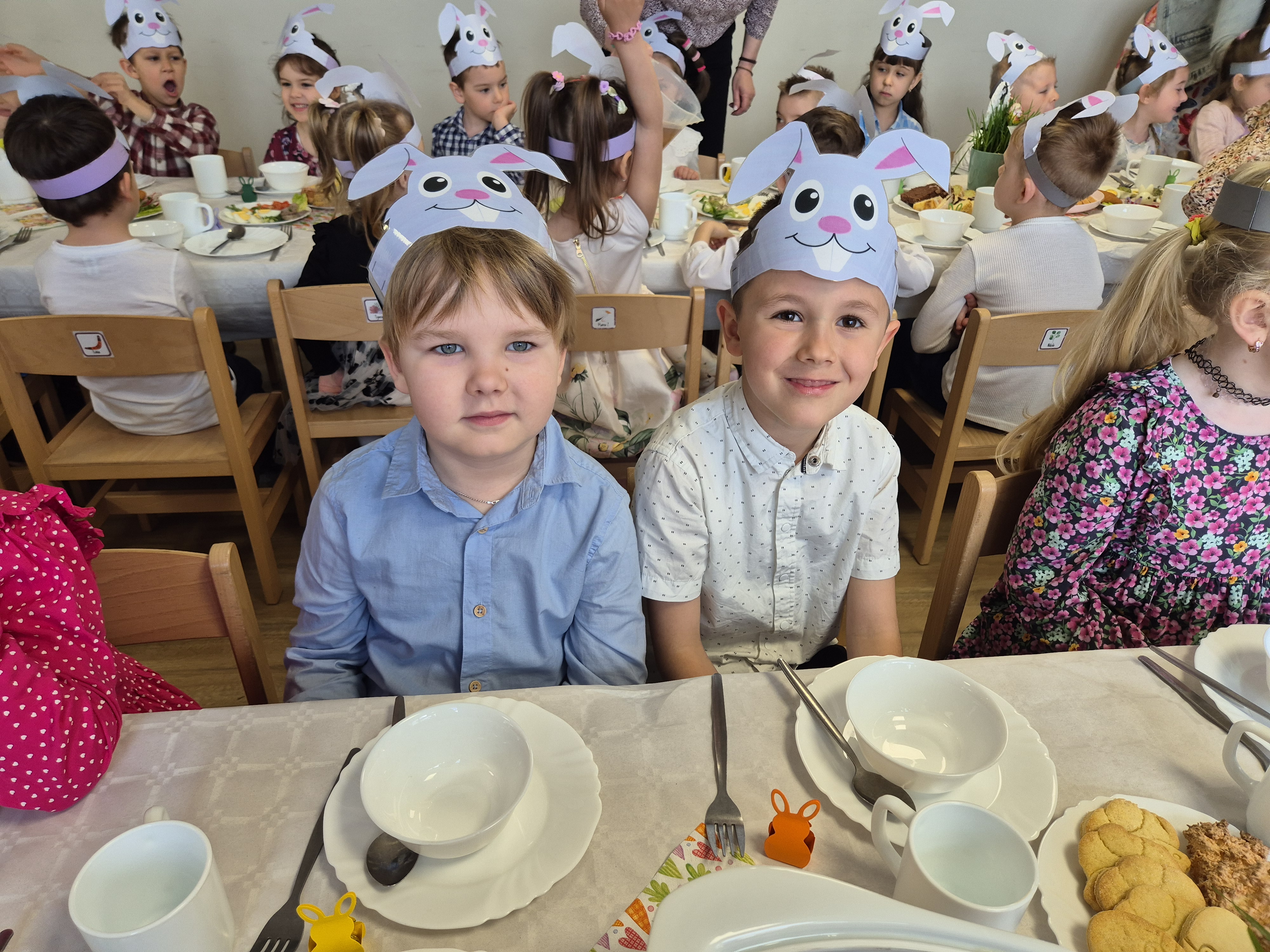 Wielkanoc to święto pełne tradycji i obyczajów. Tradycje wielkanocne sprawiają, że to święto staje się wyjątkowe, a świąteczne dni są pełne radości. Dnia 17 kwietnia w naszym przedszkolu odbył się uroczysty Poranek Wielkanocny. Dzieci wraz z wychowawcami zebrały się na holu, gdzie wspólnie zasiadły do świątecznego śniadanka. Na świątecznym stole nie zabrakło jajka, żurku, szynki i baranka. Pani Dyrektor powitała wszystkich i złożyła serdeczne wielkanocne życzenia. Po śniadaniu pojawił się wyjątkowy gość – Zajączek Wielkanocny. Dzieci z radością przywitały go piosenką. Następnie wszyscy udaliśmy się do ogrodu, gdzie Zajączek przygotował specjalne zadania do rozwiązania oraz pochował prezenty. Dzieci z wielkim zaangażowaniem szukały ukrytych niespodzianek. Na zakończenie pełnego emocji poranka wszyscy zrobili sobie wspólne pamiątkowe zdjęcie z zajączkiem. To był radosny czas pełen uśmiechu, zabawy i świątecznej atmosfery!