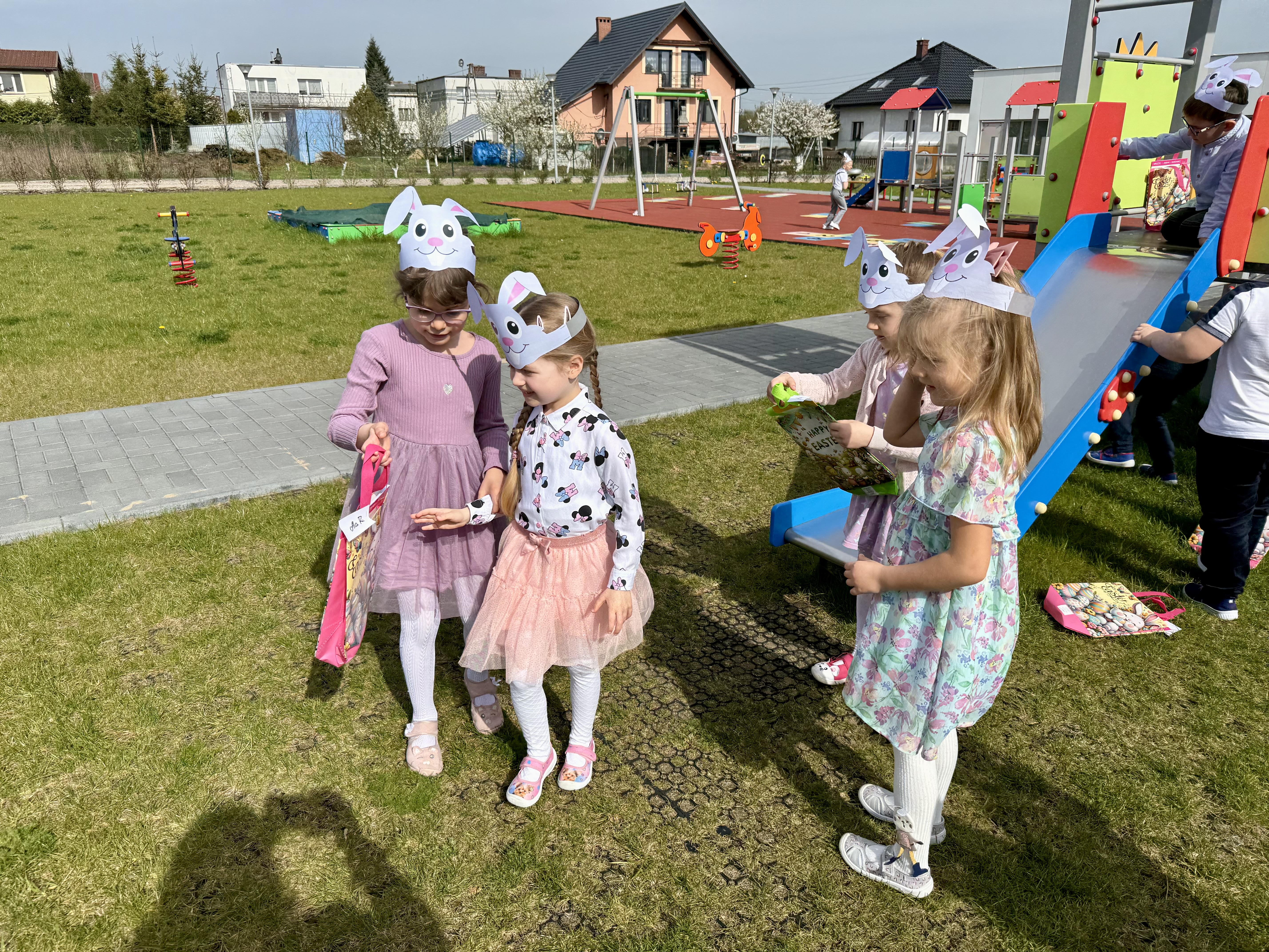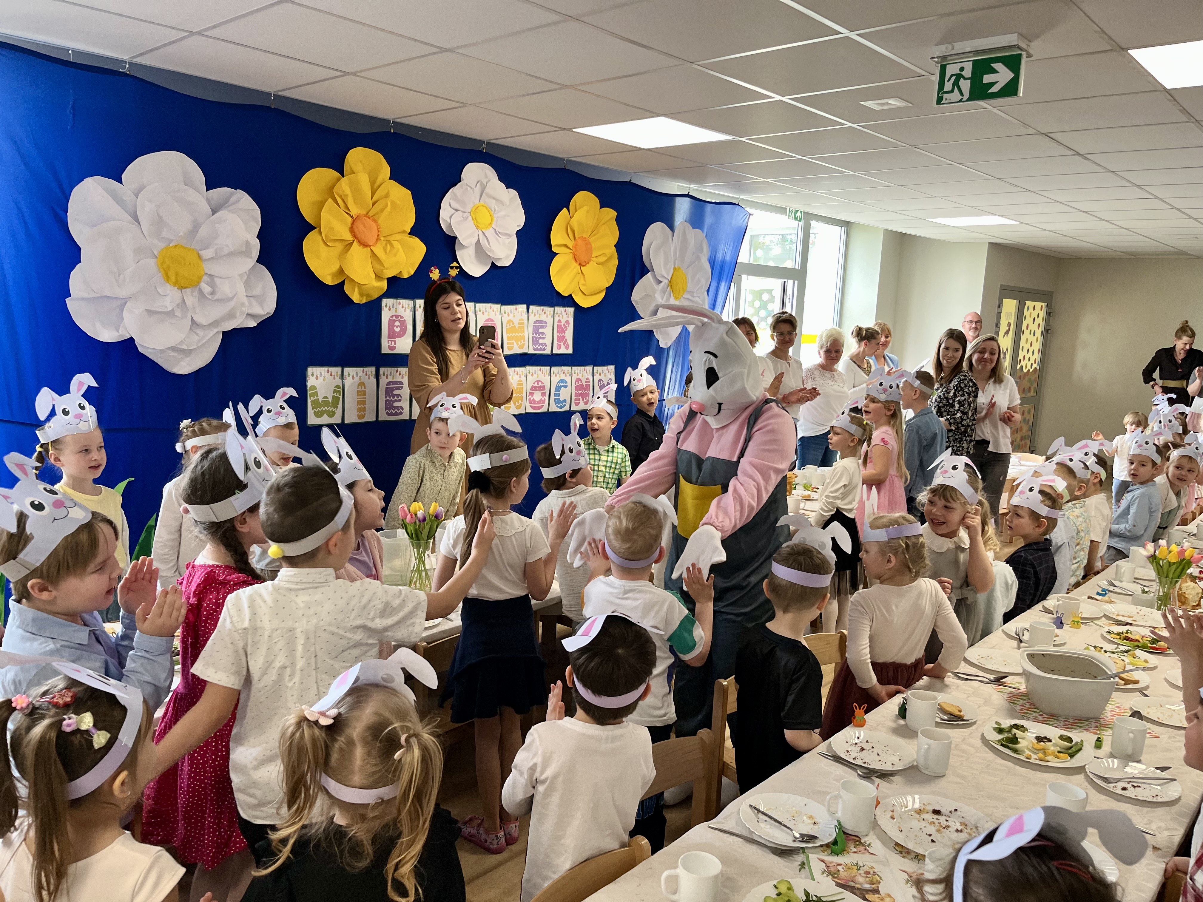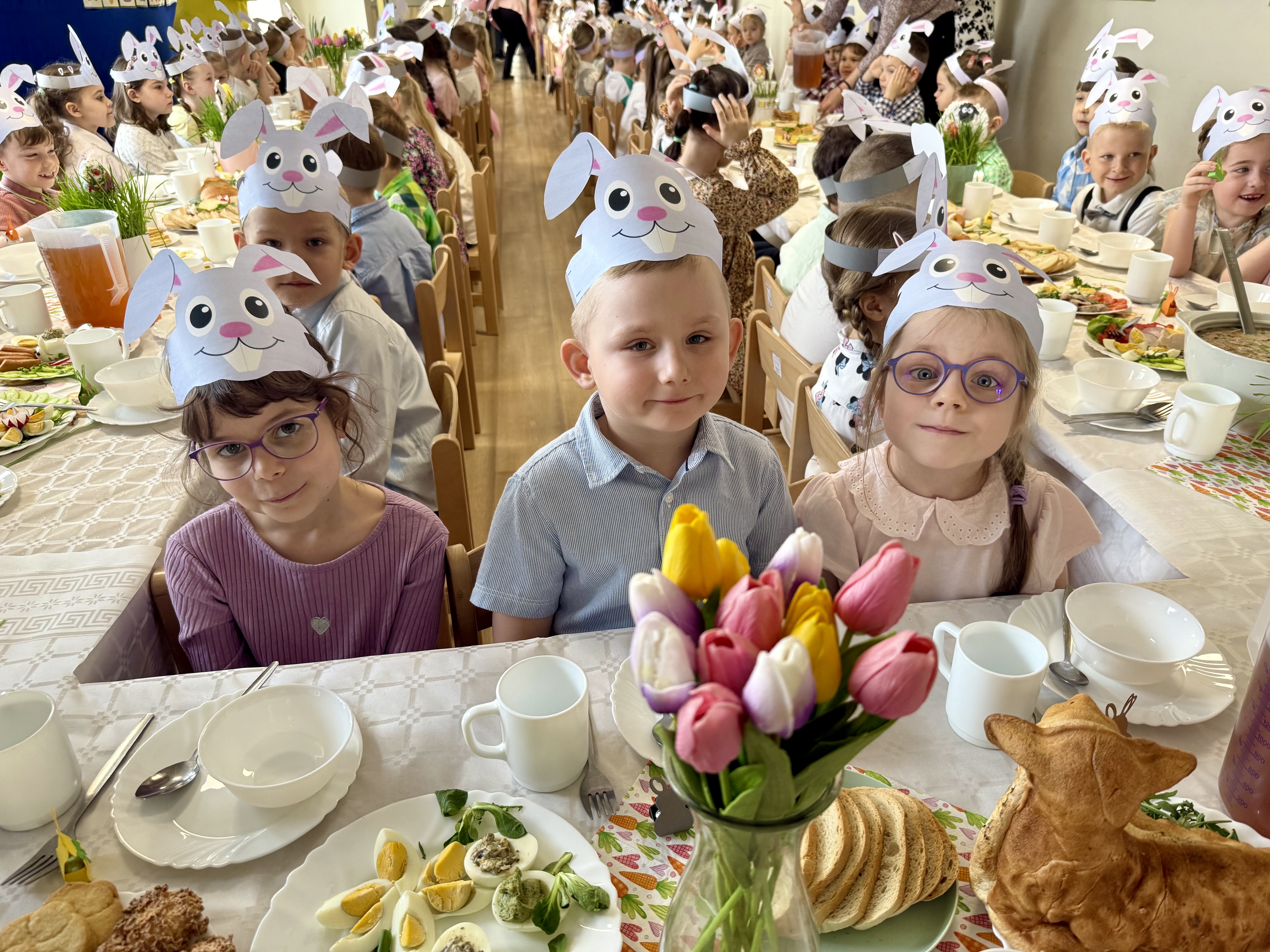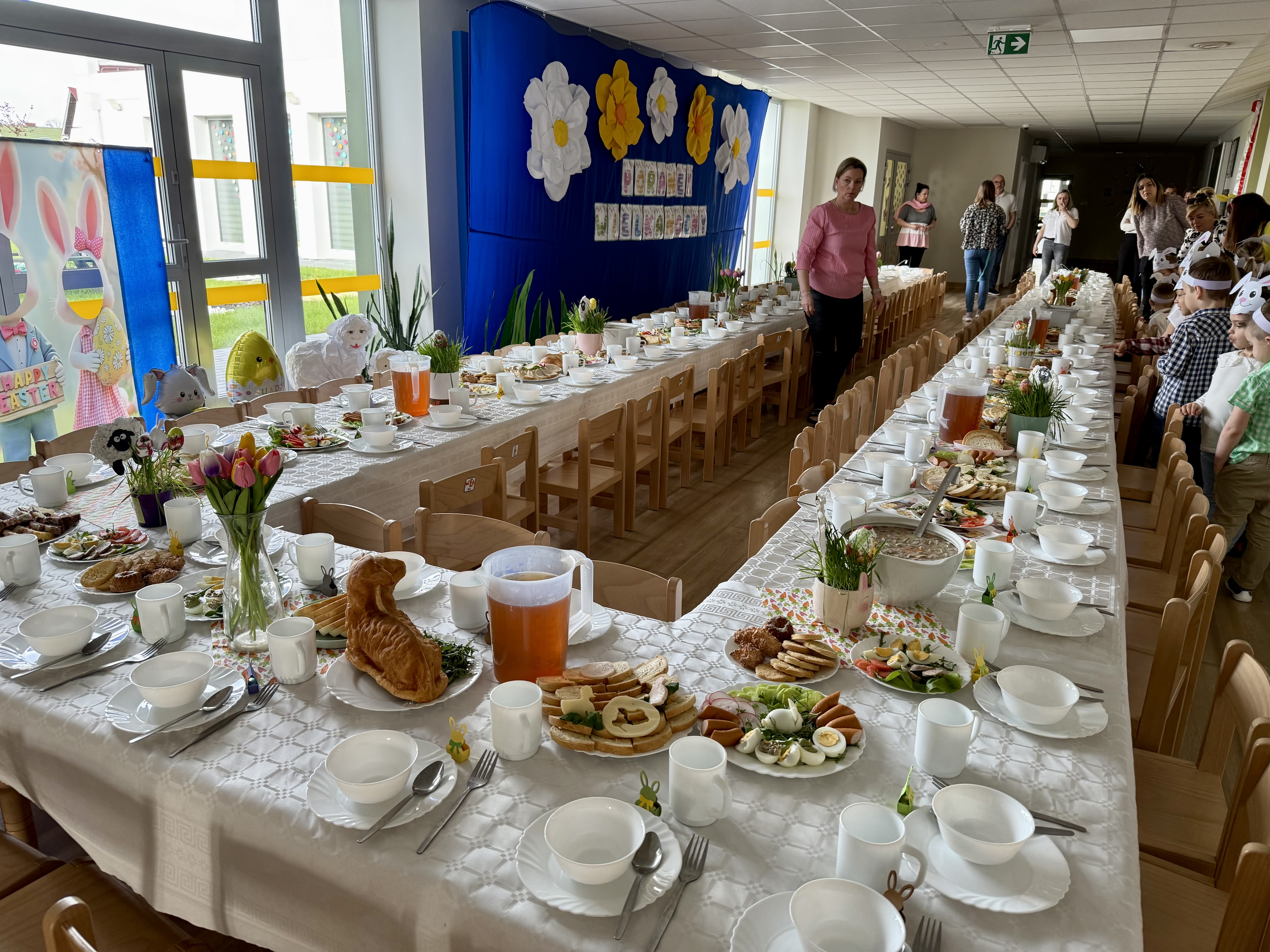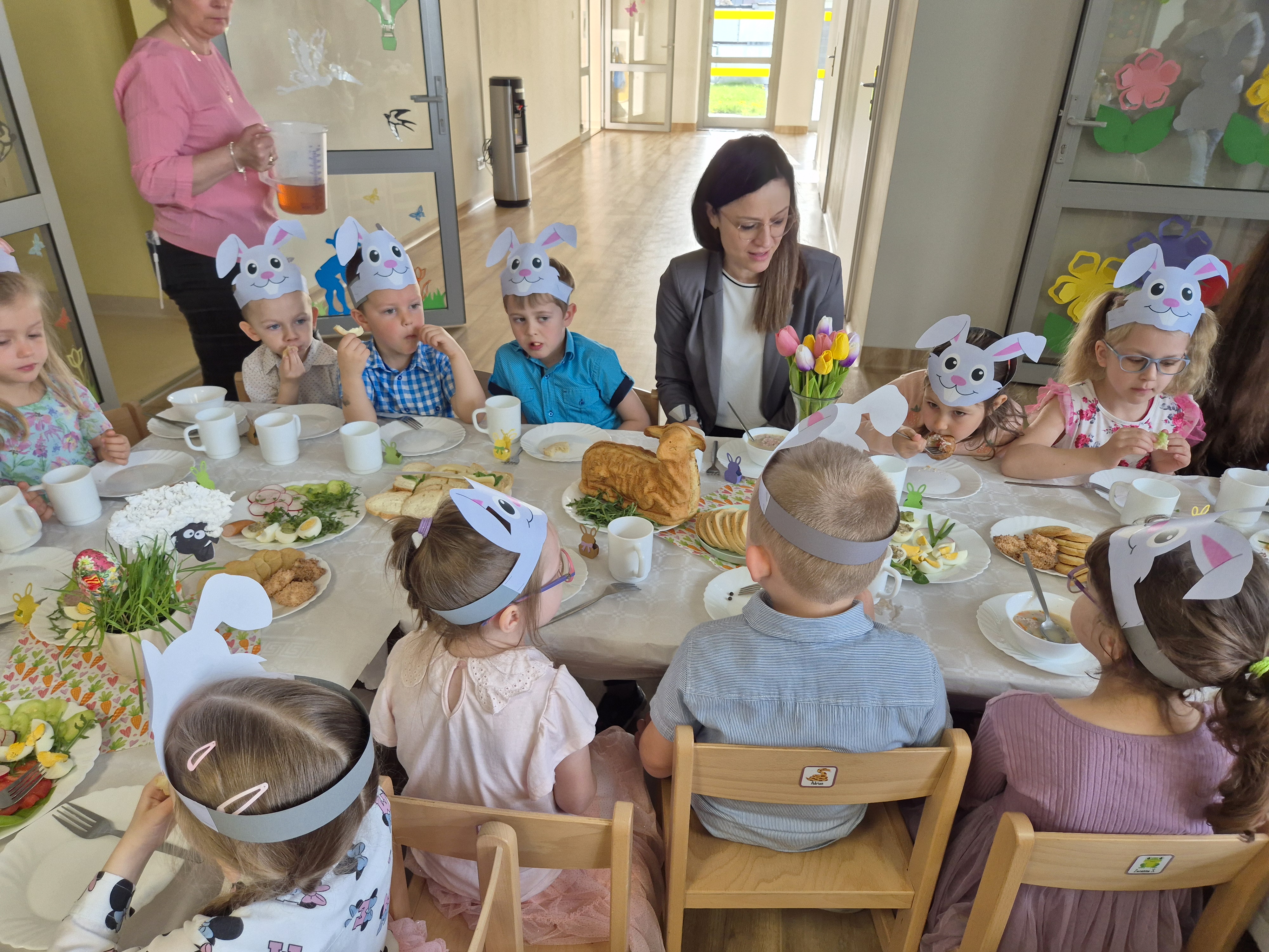 Wielkanoc to święto pełne tradycji i obyczajów. Tradycje wielkanocne sprawiają, że to święto staje się wyjątkowe, a świąteczne dni są pełne radości. Dnia 17 kwietnia w naszym przedszkolu odbył się uroczysty Poranek Wielkanocny. Dzieci wraz z wychowawcami zebrały się na holu, gdzie wspólnie zasiadły do świątecznego śniadanka. Na świątecznym stole nie zabrakło jajka, żurku, szynki i baranka. Pani Dyrektor powitała wszystkich i złożyła serdeczne wielkanocne życzenia. Po śniadaniu pojawił się wyjątkowy gość – Zajączek Wielkanocny. Dzieci z radością przywitały go piosenką. Następnie wszyscy udaliśmy się do ogrodu, gdzie Zajączek przygotował specjalne zadania do rozwiązania oraz pochował prezenty. Dzieci z wielkim zaangażowaniem szukały ukrytych niespodzianek. Na zakończenie pełnego emocji poranka wszyscy zrobili sobie wspólne pamiątkowe zdjęcie z zajączkiem. To był radosny czas pełen uśmiechu, zabawy i świątecznej atmosfery!