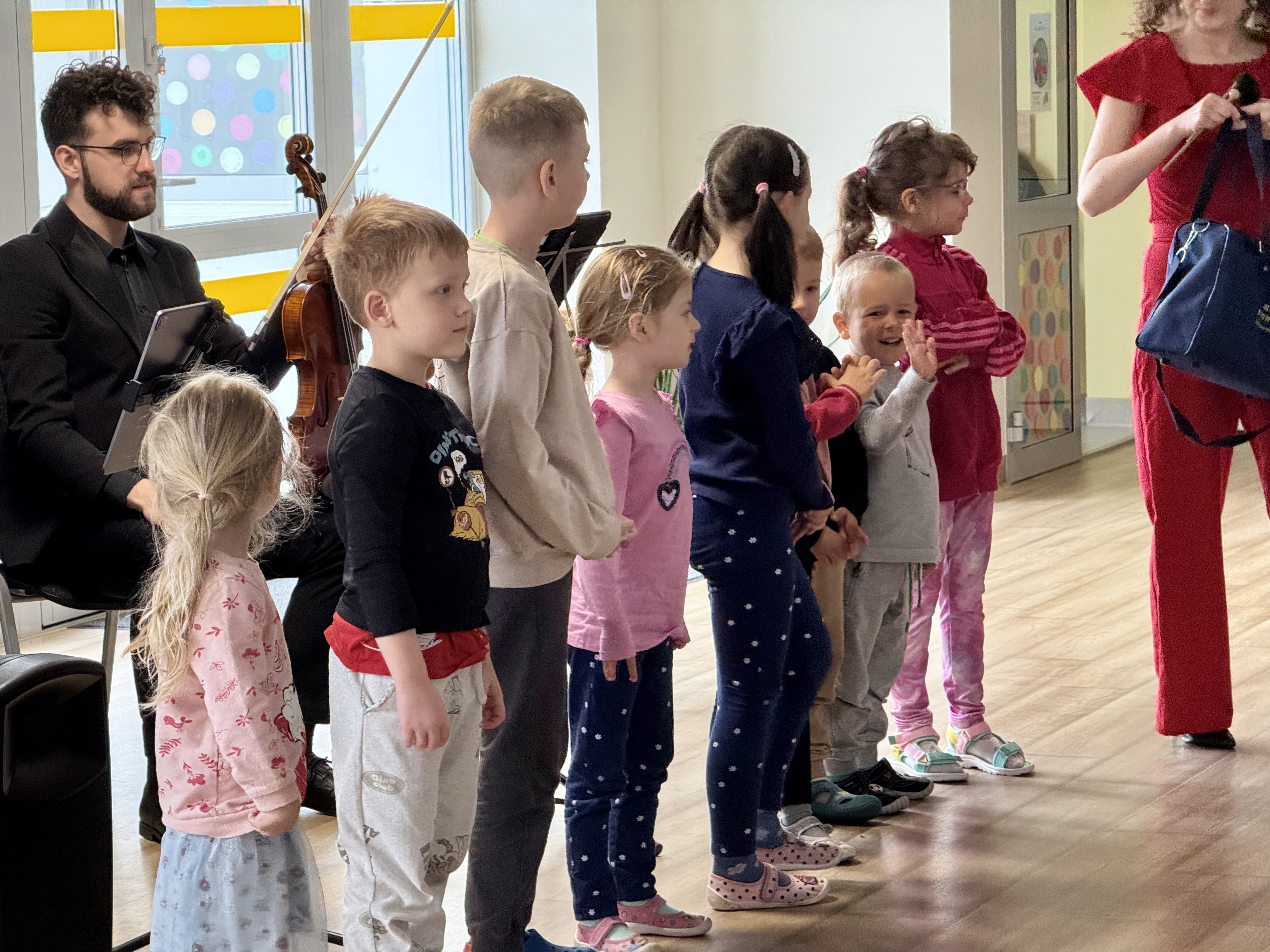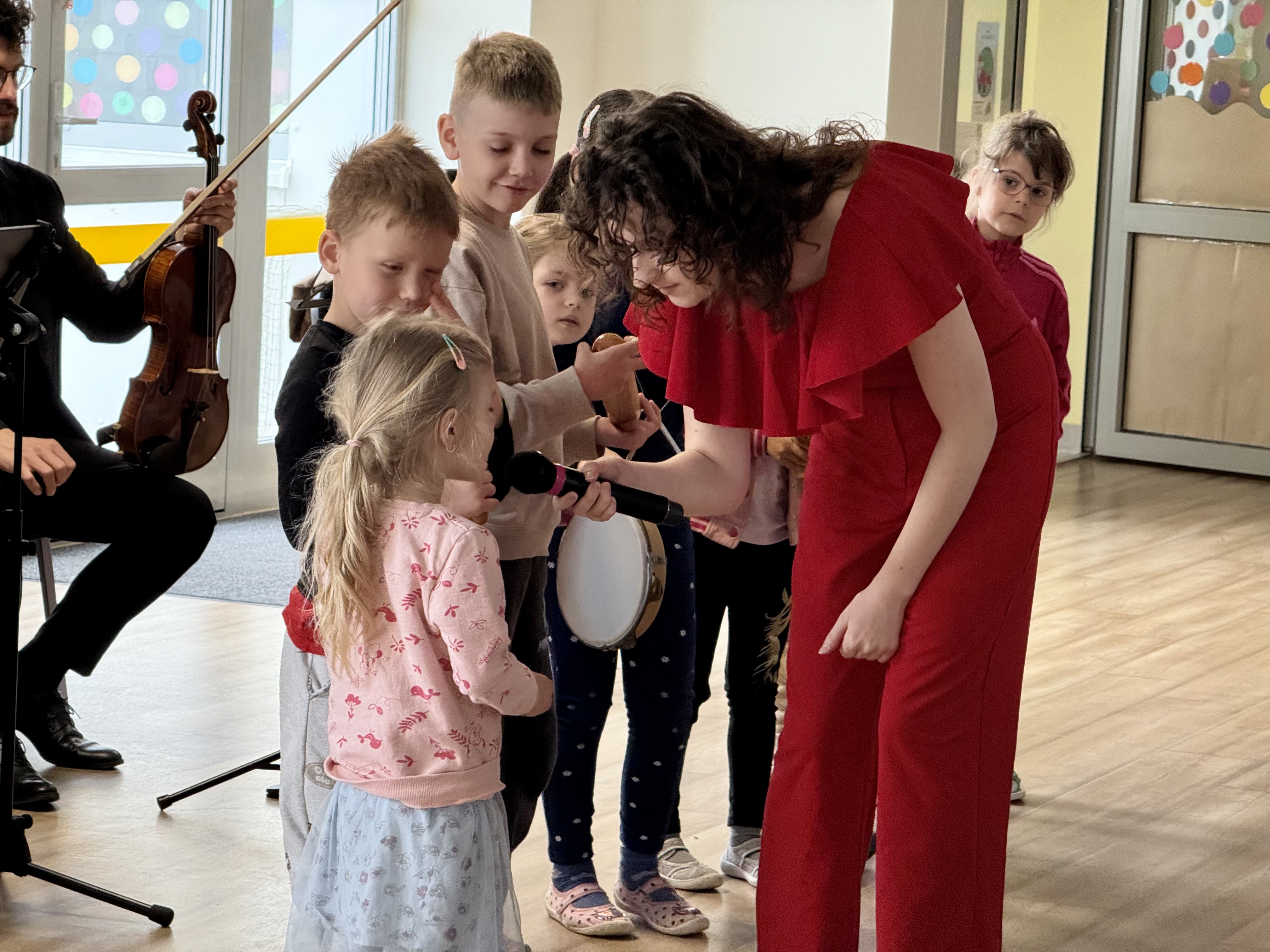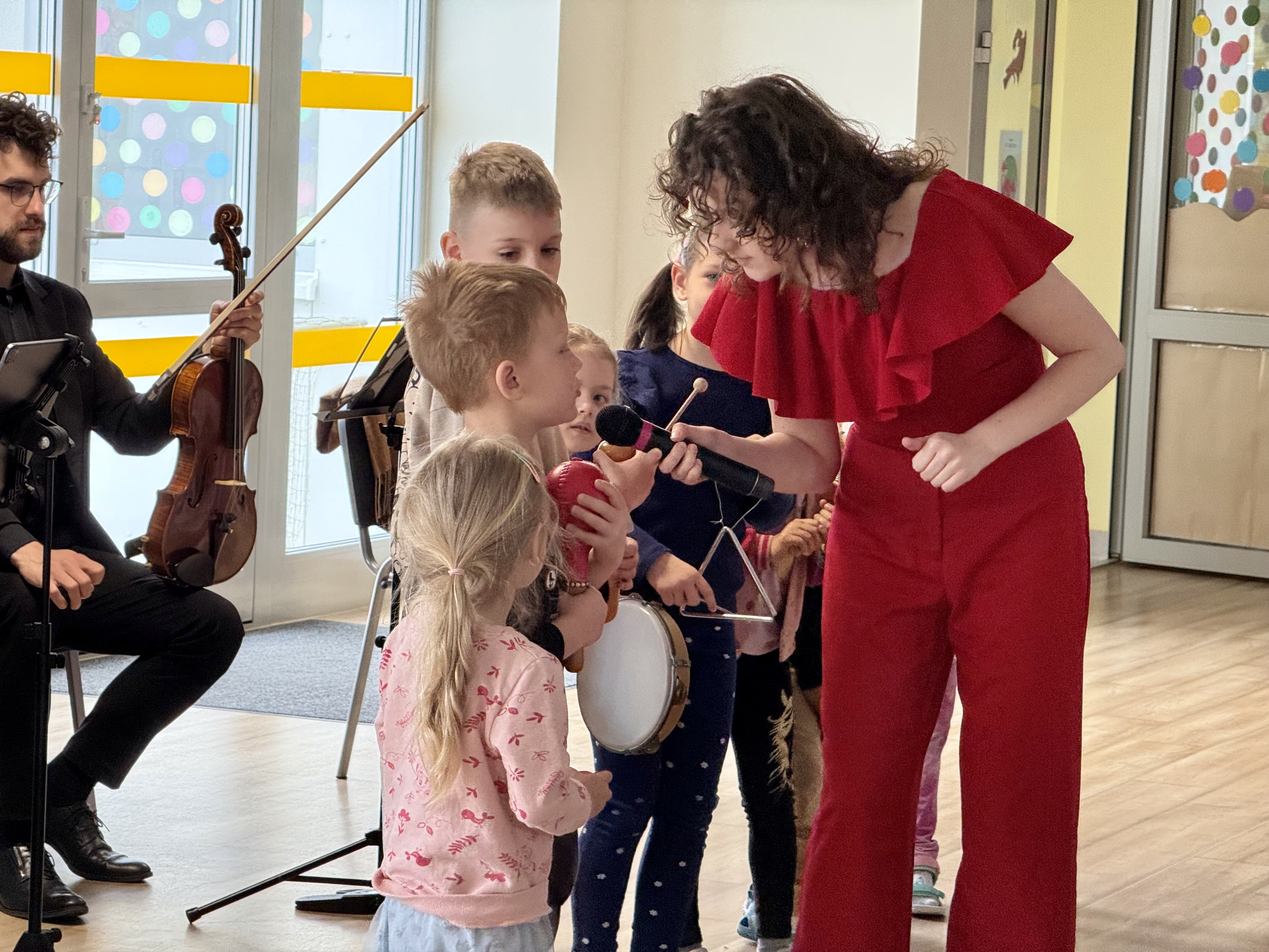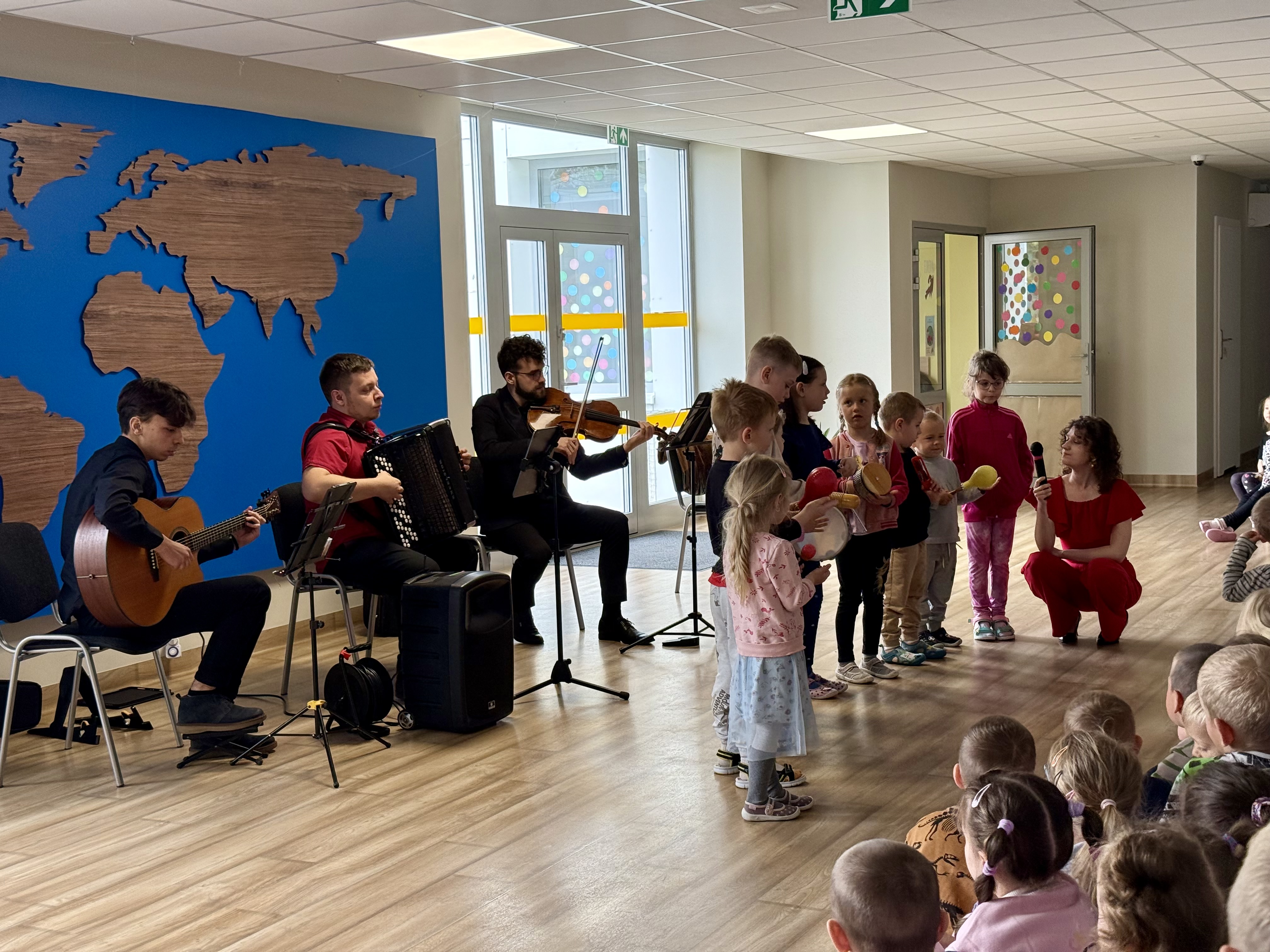 Dnia 15 maja 2025 roku gościliśmy w naszym przedszkolu muzyków z Filharmonii Pomorskiej w Bydgoszczy. Czteroosobowa grupa artystów zapoznała dzieci z instrumentami muzycznymi takimi jak: skrzypce, gitara i akordeon oraz twórczością kompozytorów. Koncert pt. „Sałatka włoska” był dostosowany do wieku dzieci i prowadzony w zabawowej formie, aby rozbudzić ich wyobraźnię muzyczną i zainteresowanie muzyką. Artyści zaprezentowali przedszkolakom „mieszaninę włoskich nazw” – oznaczeń tempa, dynamiki, artykulacji. Poznaliśmy znaczenie tych słów i dowiedzieliśmy się, jak wielki wpływ mają one na wykonanie i odbiór muzyki. Na zakończenie dzieci miały możliwość razem z muzykami zagrać na instrumentach. Był to niezwykły koncert.
