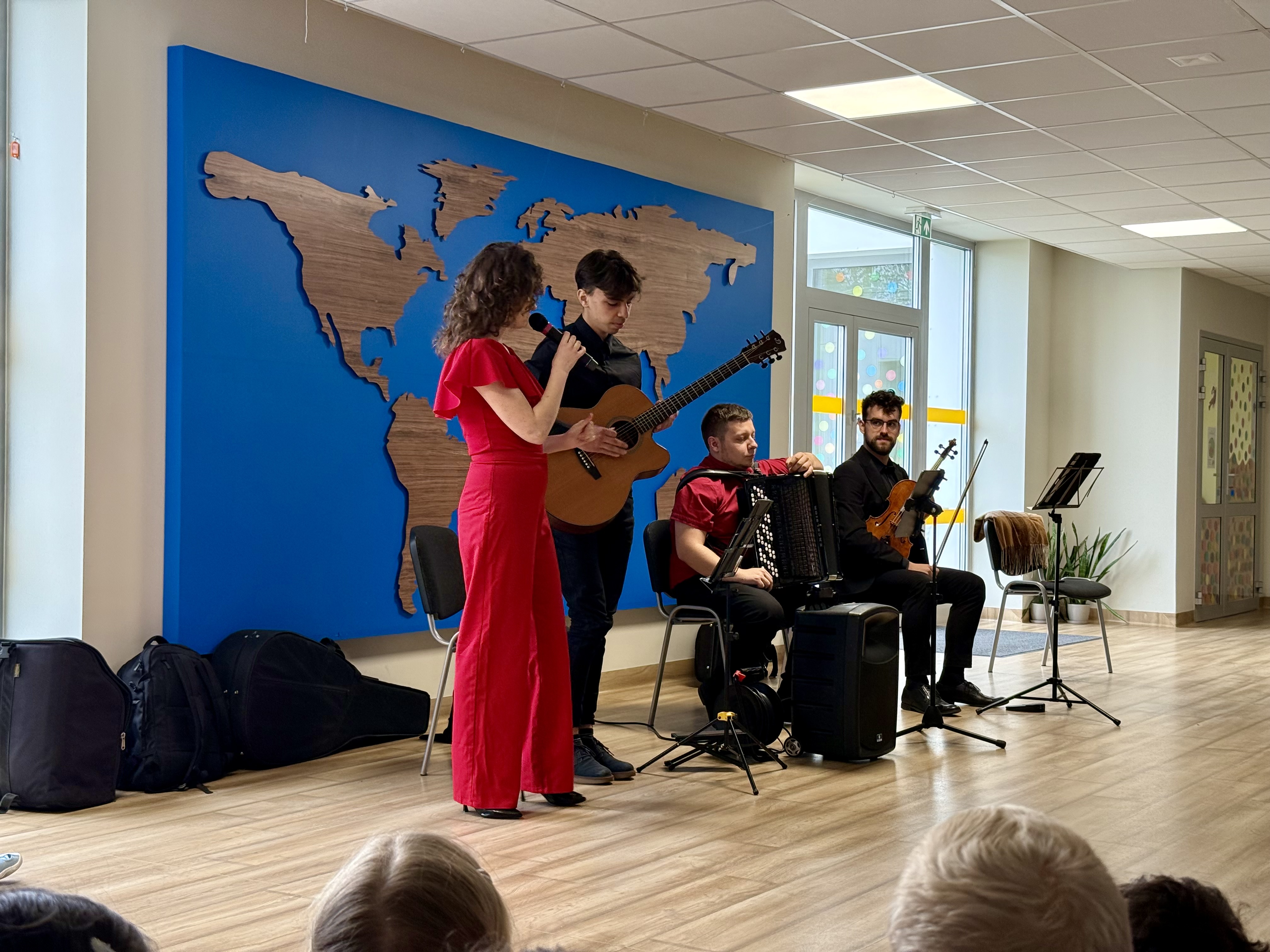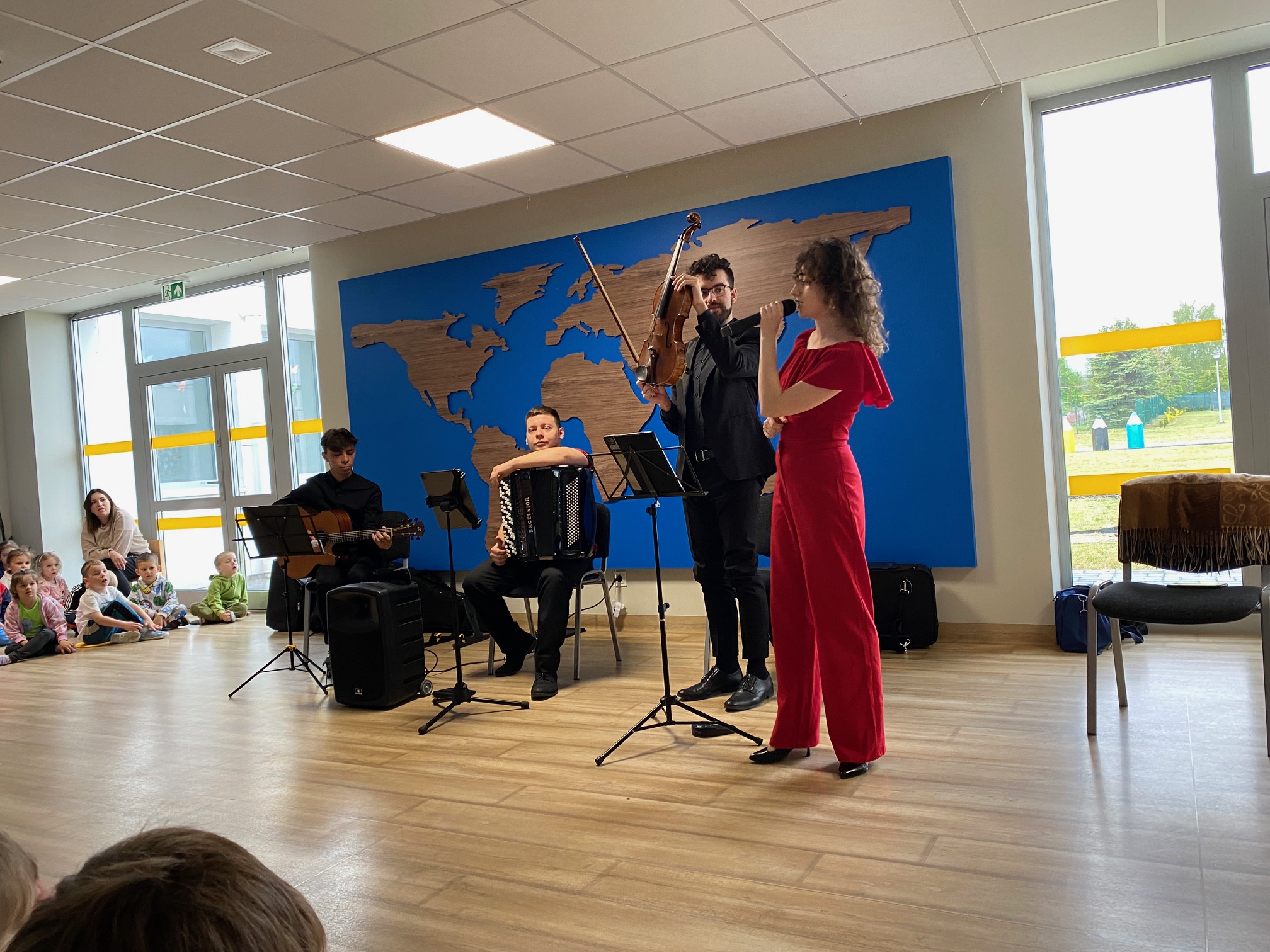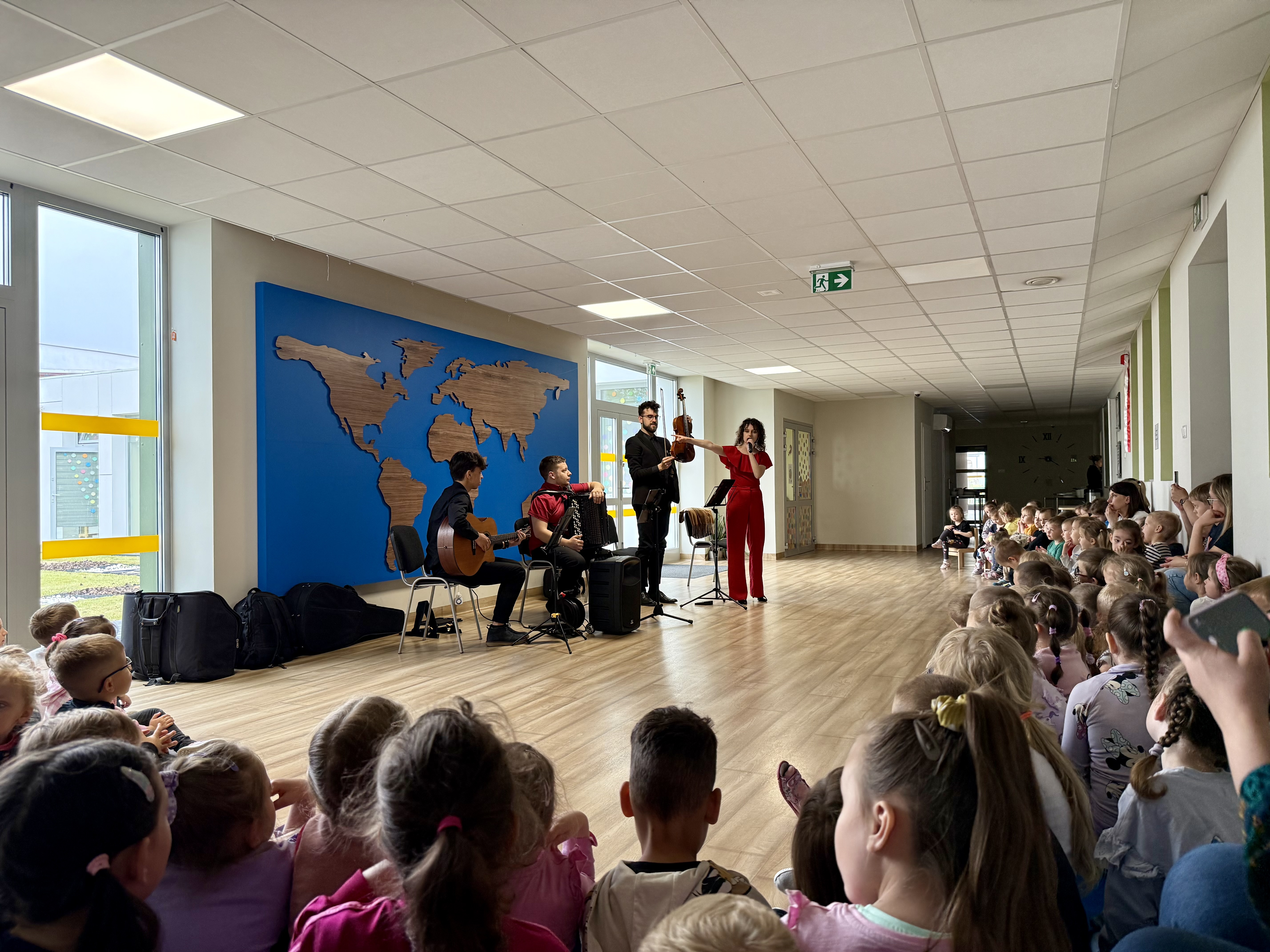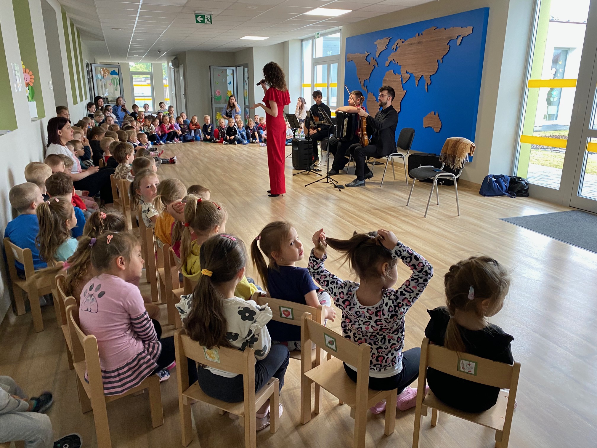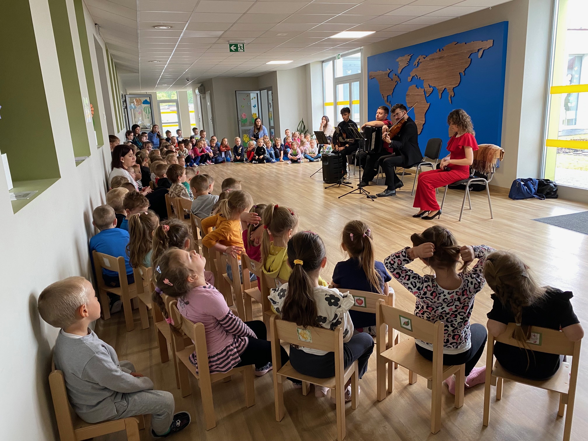 Dnia 15 maja 2025 roku gościliśmy w naszym przedszkolu muzyków z Filharmonii Pomorskiej w Bydgoszczy. Czteroosobowa grupa artystów zapoznała dzieci z instrumentami muzycznymi takimi jak: skrzypce, gitara i akordeon oraz twórczością kompozytorów. Koncert pt. „Sałatka włoska” był dostosowany do wieku dzieci i prowadzony w zabawowej formie, aby rozbudzić ich wyobraźnię muzyczną i zainteresowanie muzyką. Artyści zaprezentowali przedszkolakom „mieszaninę włoskich nazw” – oznaczeń tempa, dynamiki, artykulacji. Poznaliśmy znaczenie tych słów i dowiedzieliśmy się, jak wielki wpływ mają one na wykonanie i odbiór muzyki. Na zakończenie dzieci miały możliwość razem z muzykami zagrać na instrumentach. Był to niezwykły koncert.