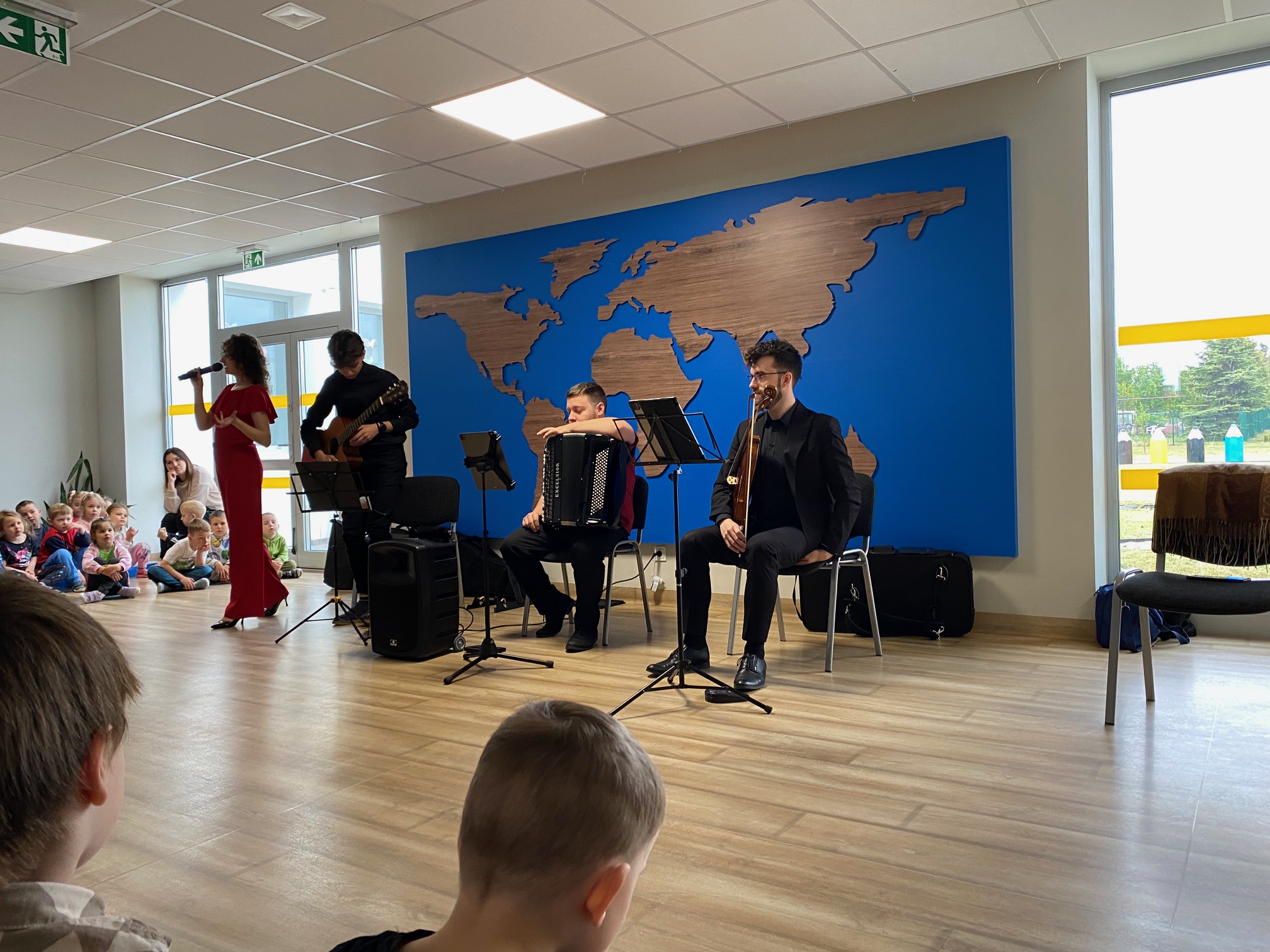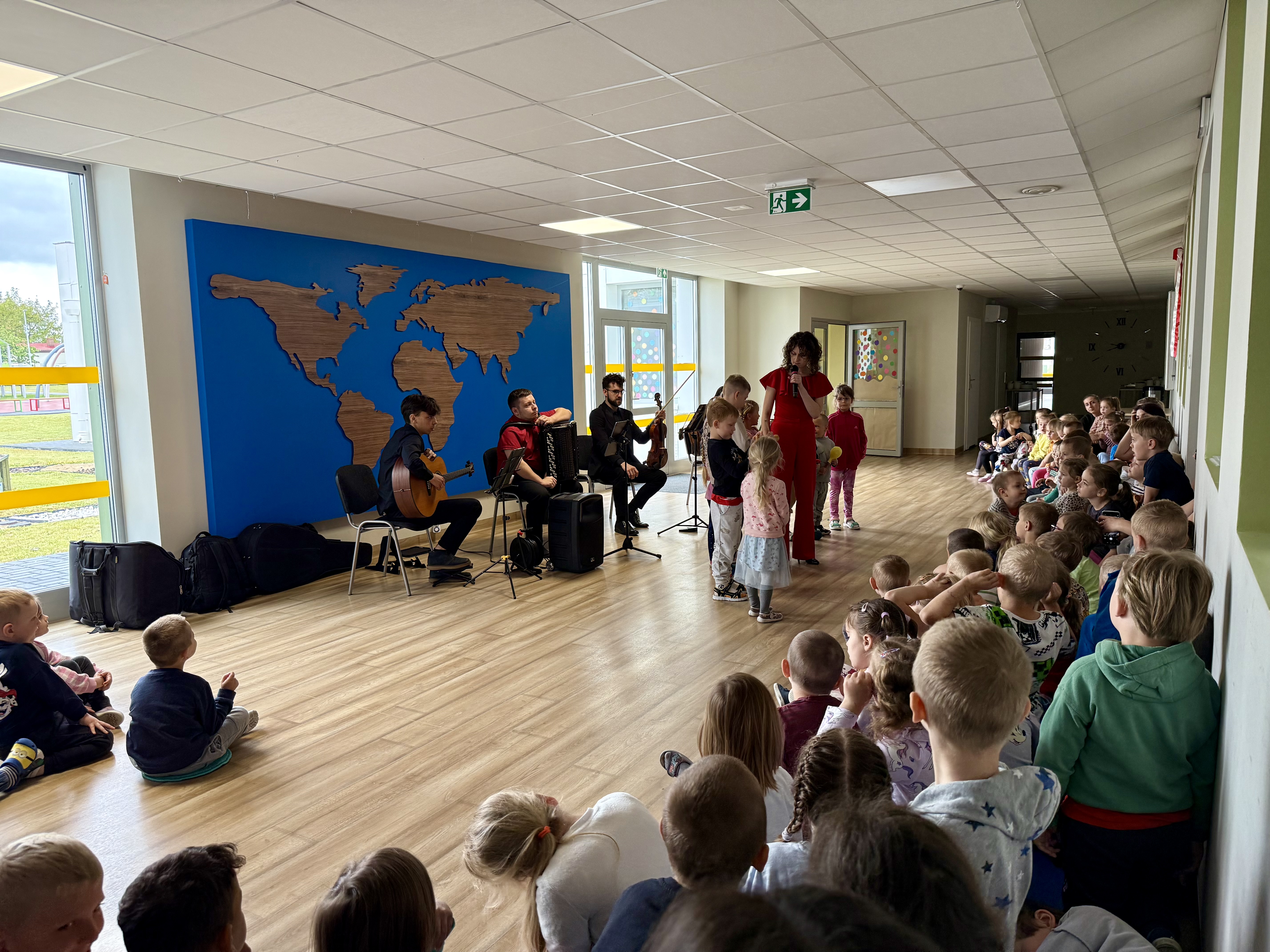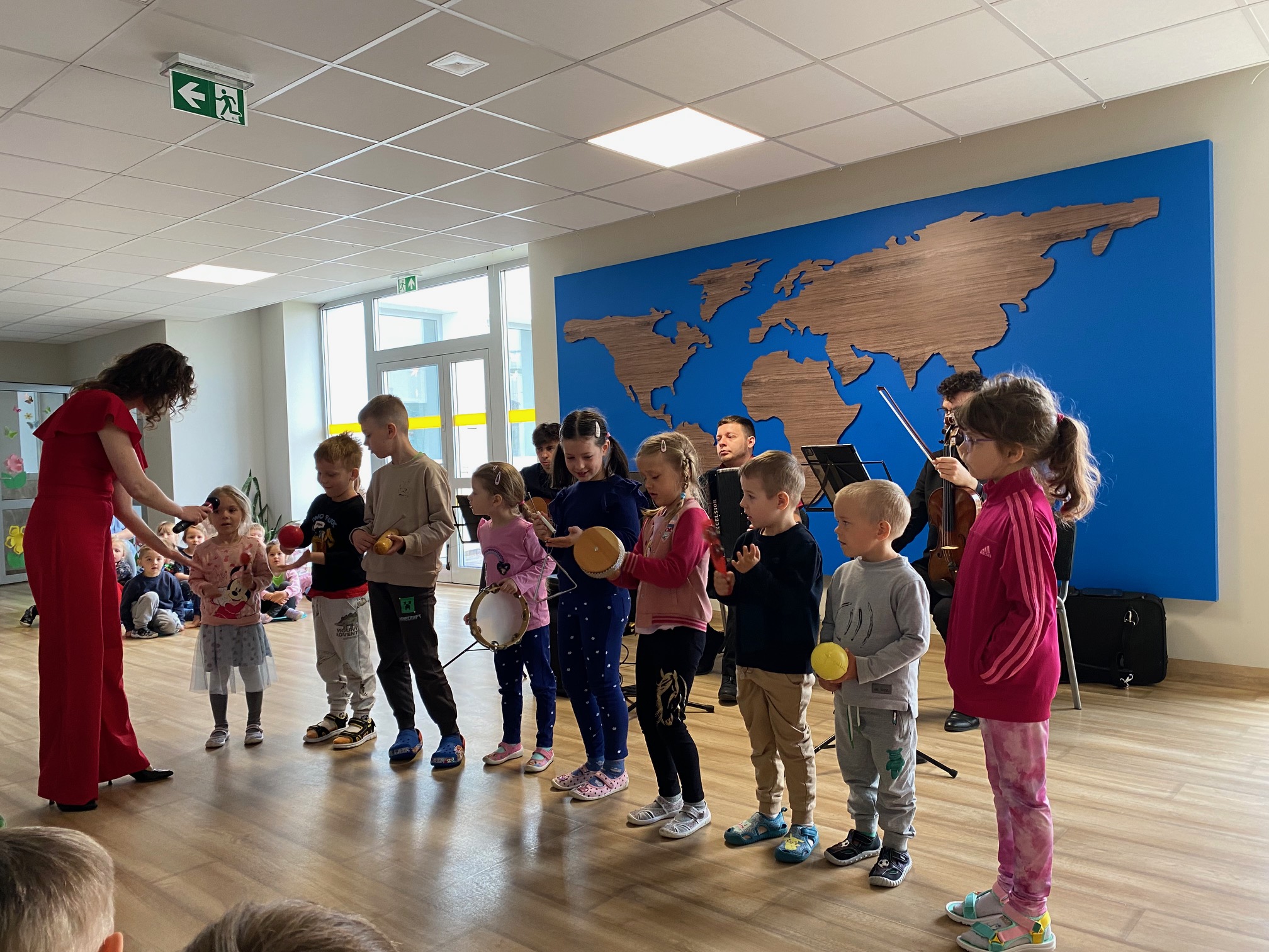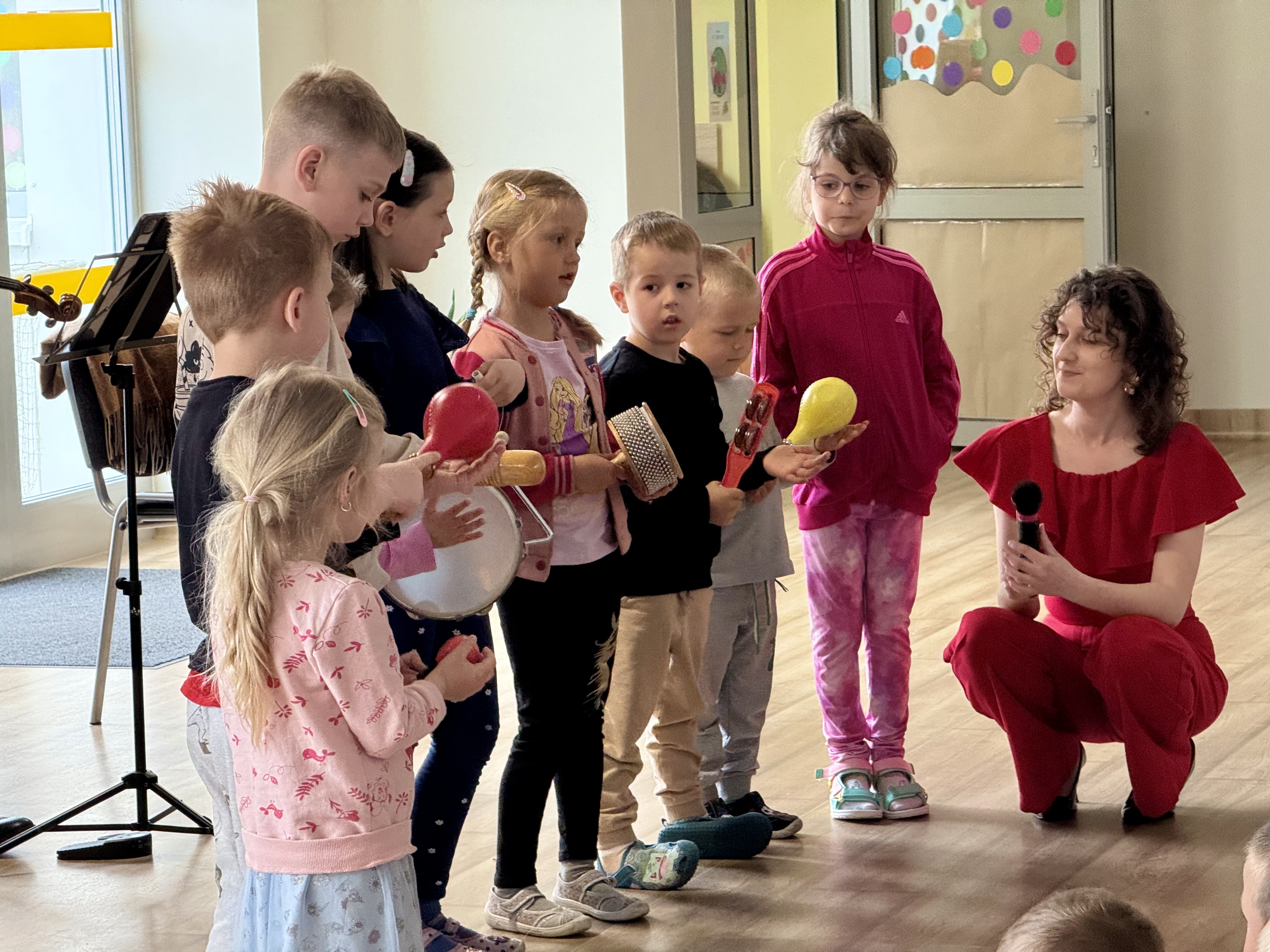 Dnia 15 maja 2025 roku gościliśmy w naszym przedszkolu muzyków z Filharmonii Pomorskiej w Bydgoszczy. Czteroosobowa grupa artystów zapoznała dzieci z instrumentami muzycznymi takimi jak: skrzypce, gitara i akordeon oraz twórczością kompozytorów. Koncert pt. „Sałatka włoska” był dostosowany do wieku dzieci i prowadzony w zabawowej formie, aby rozbudzić ich wyobraźnię muzyczną i zainteresowanie muzyką. Artyści zaprezentowali przedszkolakom „mieszaninę włoskich nazw” – oznaczeń tempa, dynamiki, artykulacji. Poznaliśmy znaczenie tych słów i dowiedzieliśmy się, jak wielki wpływ mają one na wykonanie i odbiór muzyki. Na zakończenie dzieci miały możliwość razem z muzykami zagrać na instrumentach. Był to niezwykły koncert.