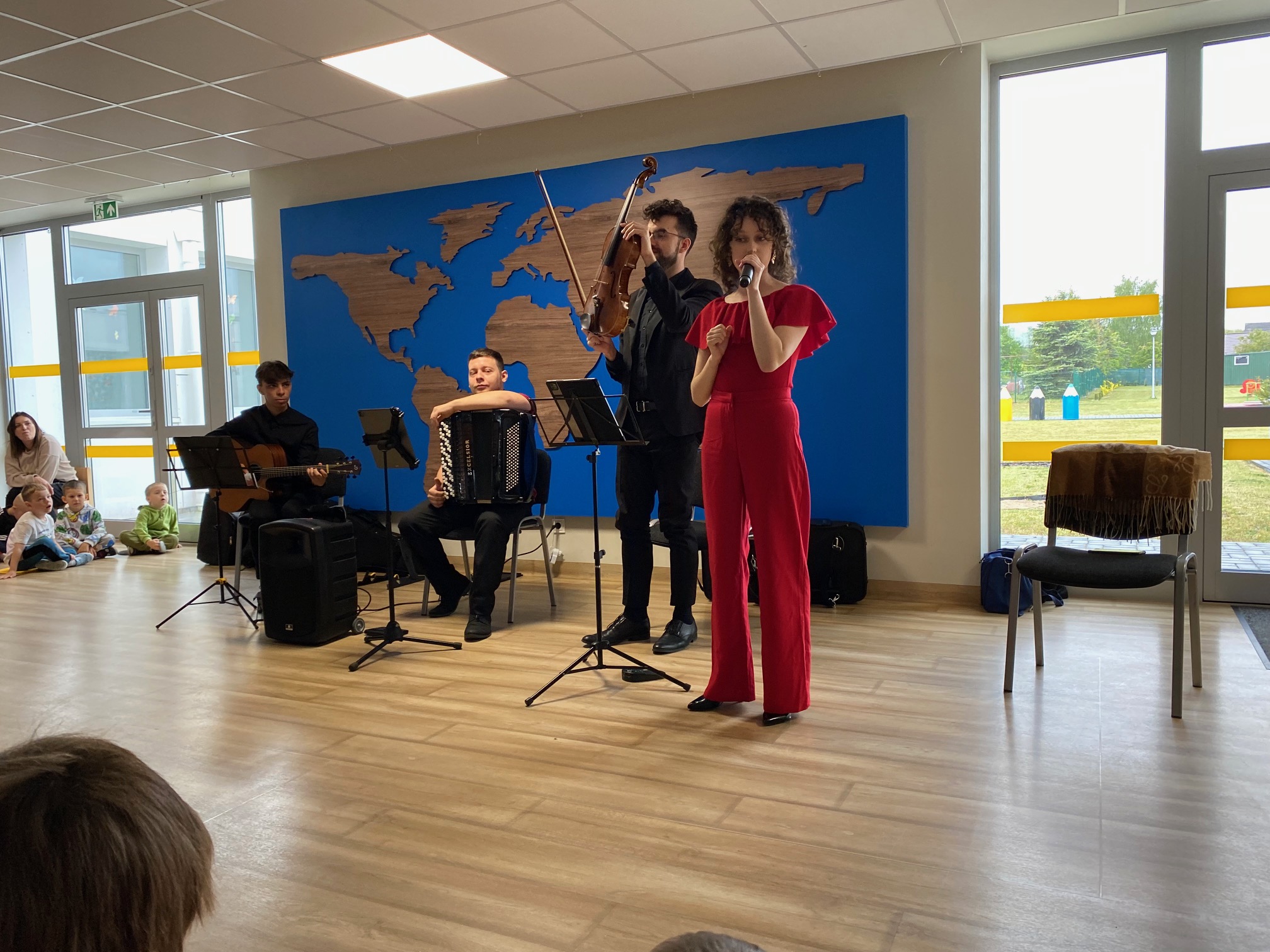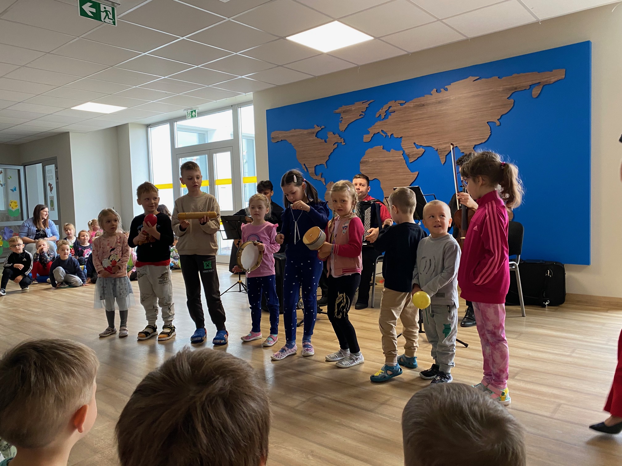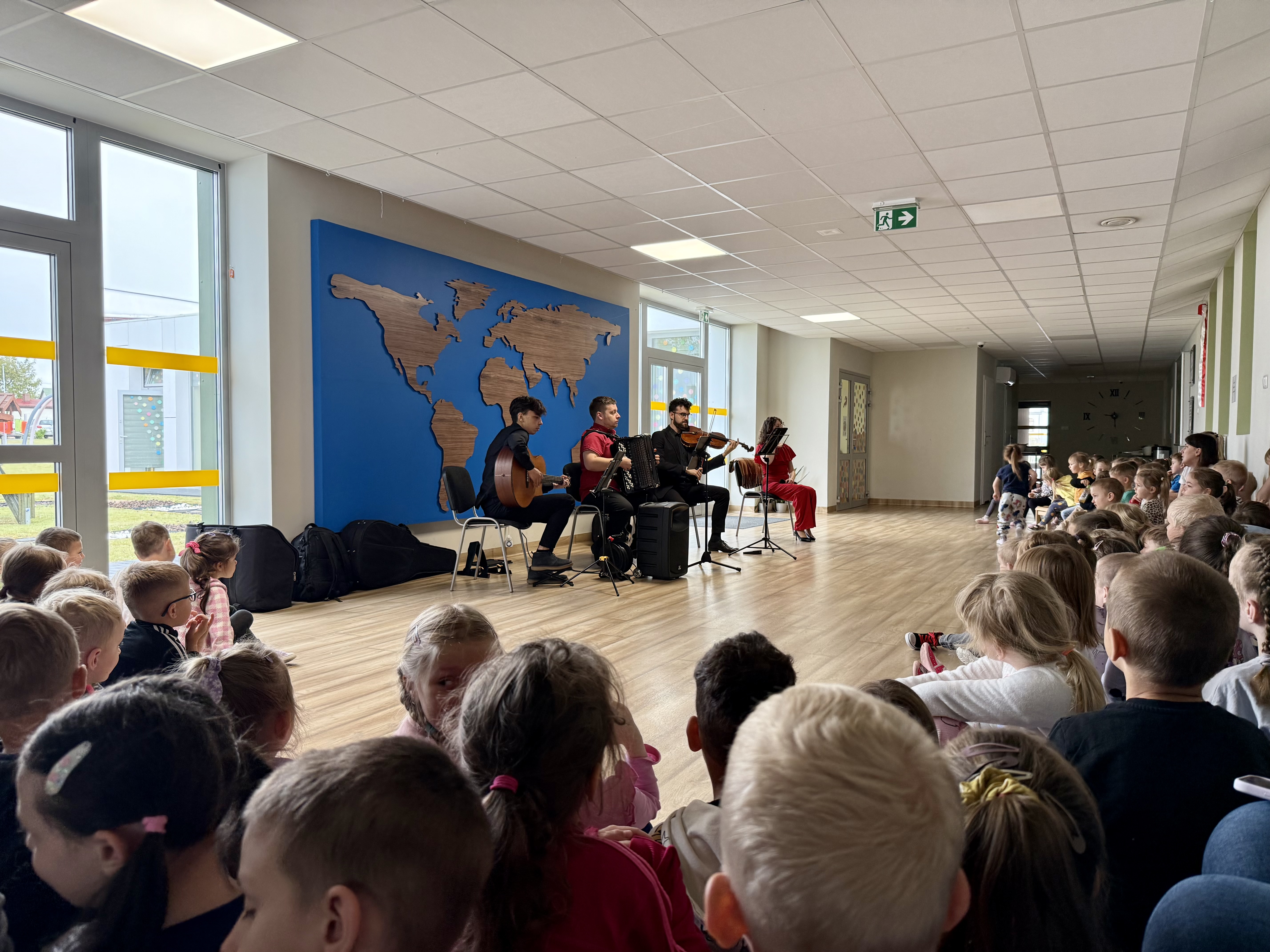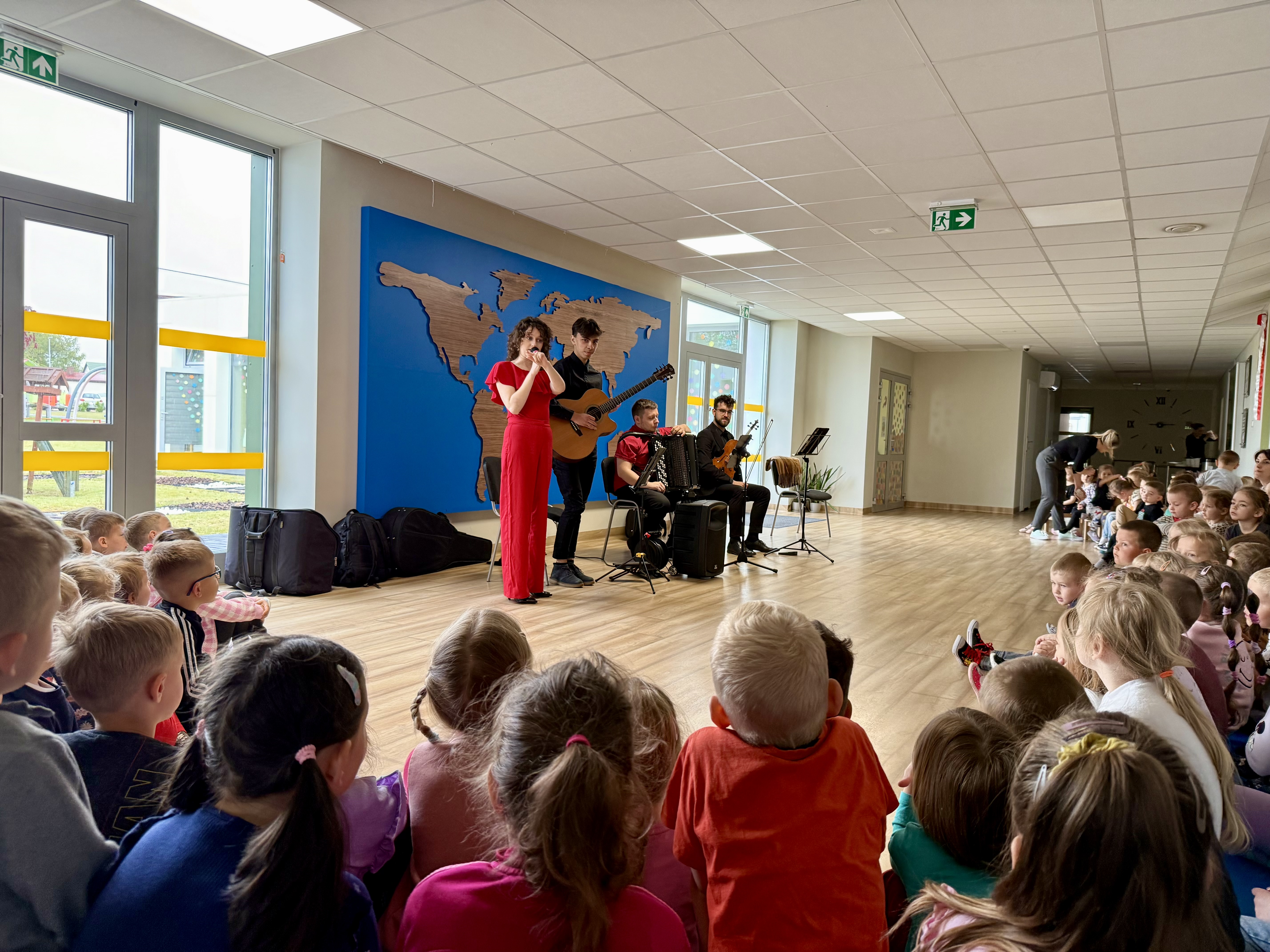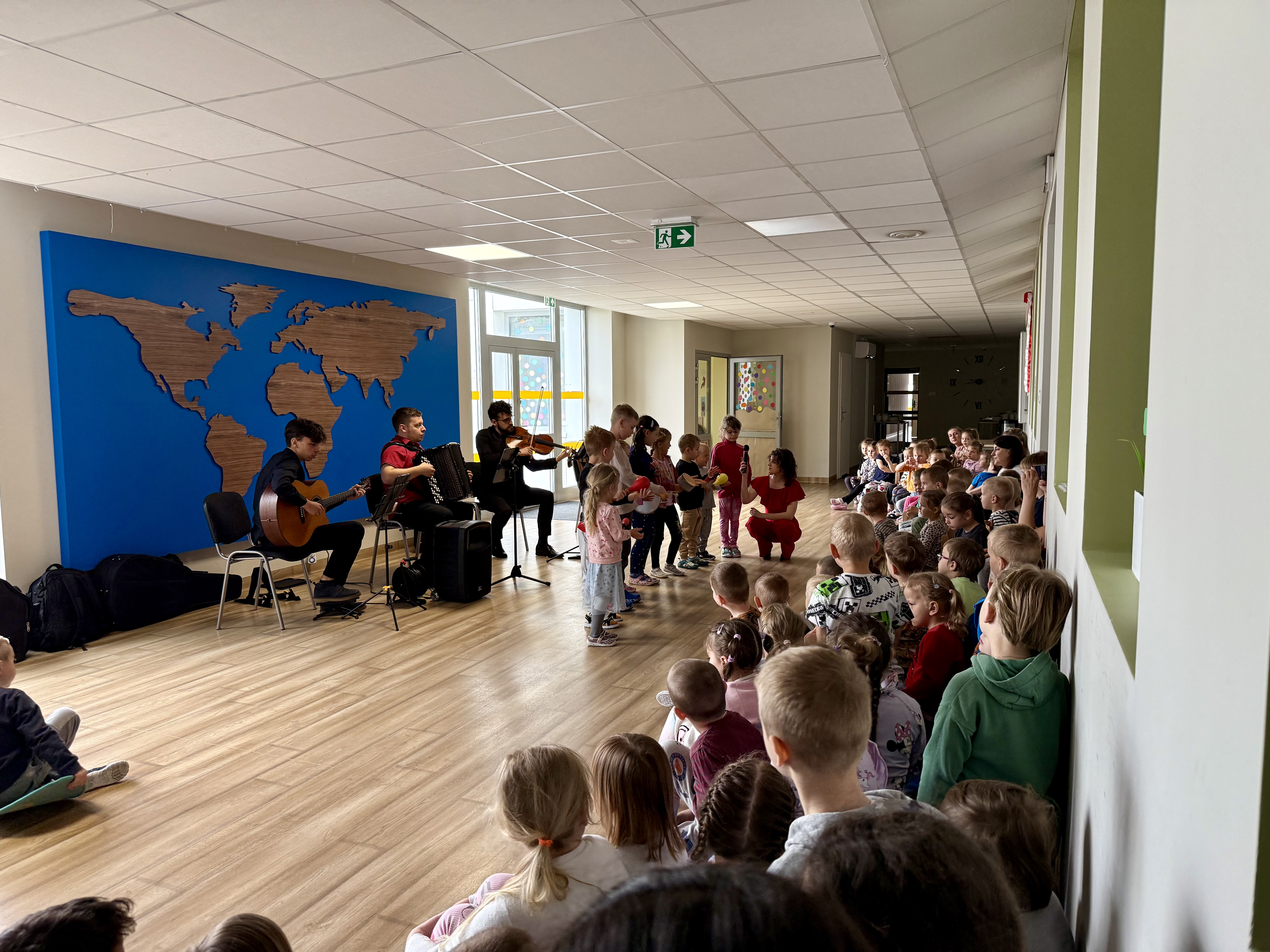 Dnia 15 maja 2025 roku gościliśmy w naszym przedszkolu muzyków z Filharmonii Pomorskiej w Bydgoszczy. Czteroosobowa grupa artystów zapoznała dzieci z instrumentami muzycznymi takimi jak: skrzypce, gitara i akordeon oraz twórczością kompozytorów. Koncert pt. „Sałatka włoska” był dostosowany do wieku dzieci i prowadzony w zabawowej formie, aby rozbudzić ich wyobraźnię muzyczną i zainteresowanie muzyką. Artyści zaprezentowali przedszkolakom „mieszaninę włoskich nazw” – oznaczeń tempa, dynamiki, artykulacji. Poznaliśmy znaczenie tych słów i dowiedzieliśmy się, jak wielki wpływ mają one na wykonanie i odbiór muzyki. Na zakończenie dzieci miały możliwość razem z muzykami zagrać na instrumentach. Był to niezwykły koncert.