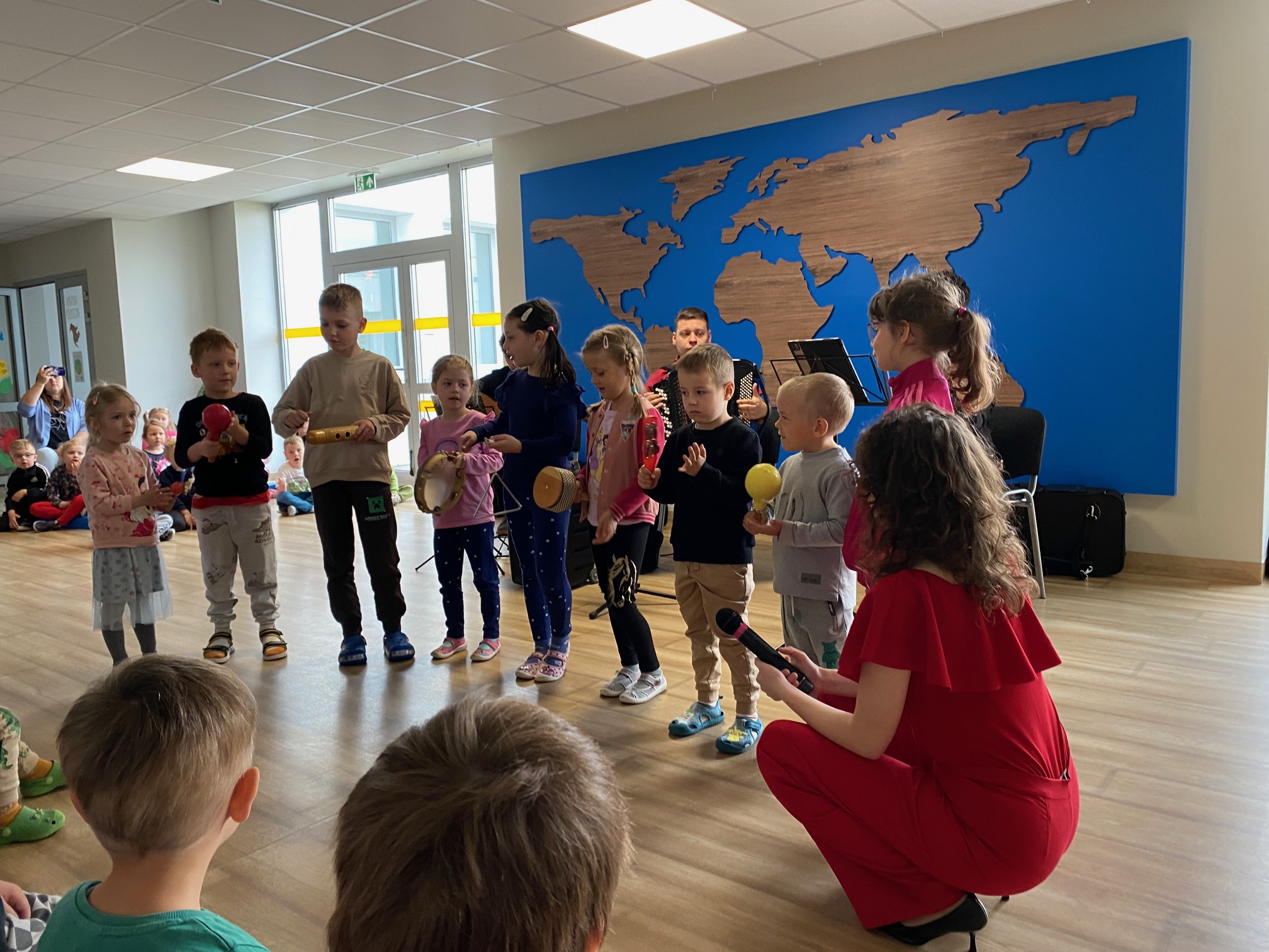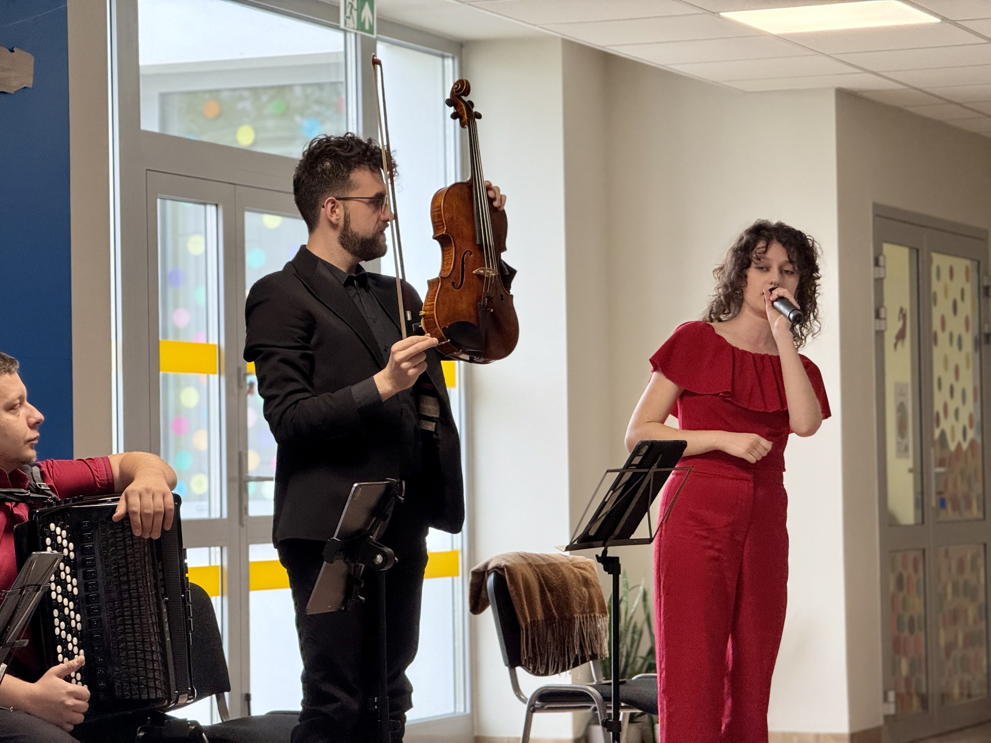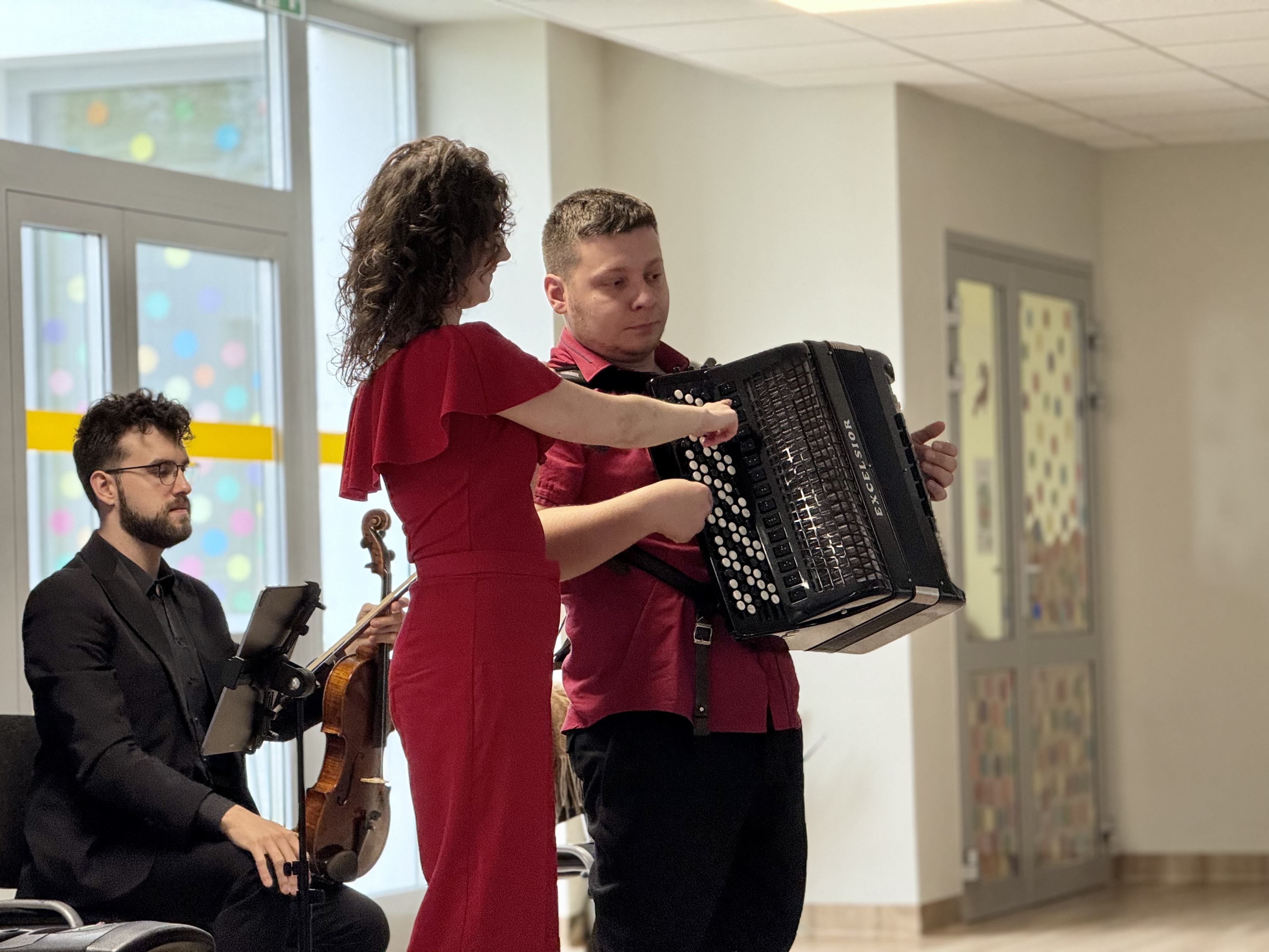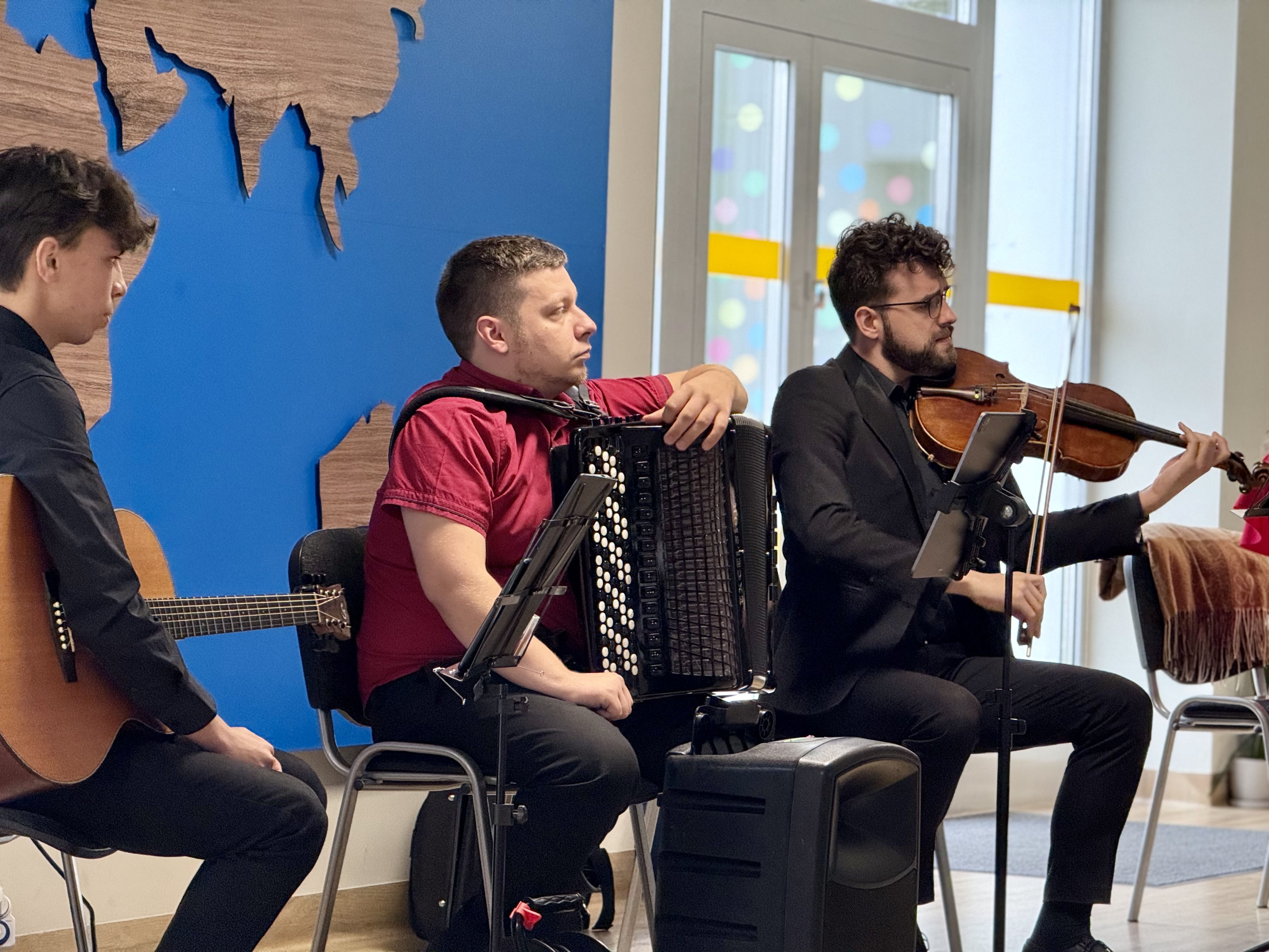 Dnia 15 maja 2025 roku gościliśmy w naszym przedszkolu muzyków z Filharmonii Pomorskiej w Bydgoszczy. Czteroosobowa grupa artystów zapoznała dzieci z instrumentami muzycznymi takimi jak: skrzypce, gitara i akordeon oraz twórczością kompozytorów. Koncert pt. „Sałatka włoska” był dostosowany do wieku dzieci i prowadzony w zabawowej formie, aby rozbudzić ich wyobraźnię muzyczną i zainteresowanie muzyką. Artyści zaprezentowali przedszkolakom „mieszaninę włoskich nazw” – oznaczeń tempa, dynamiki, artykulacji. Poznaliśmy znaczenie tych słów i dowiedzieliśmy się, jak wielki wpływ mają one na wykonanie i odbiór muzyki. Na zakończenie dzieci miały możliwość razem z muzykami zagrać na instrumentach. Był to niezwykły koncert.