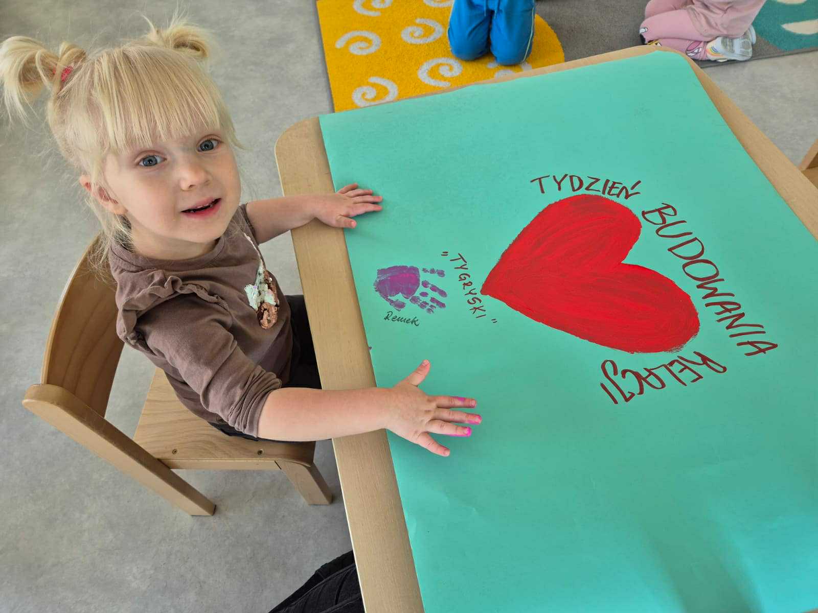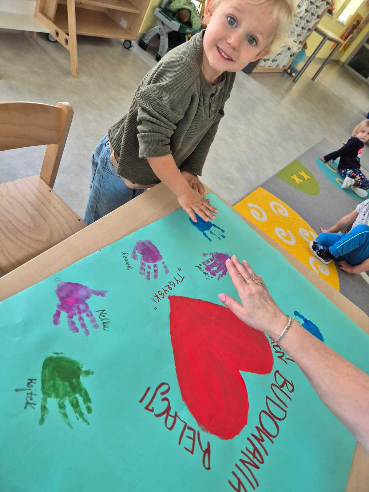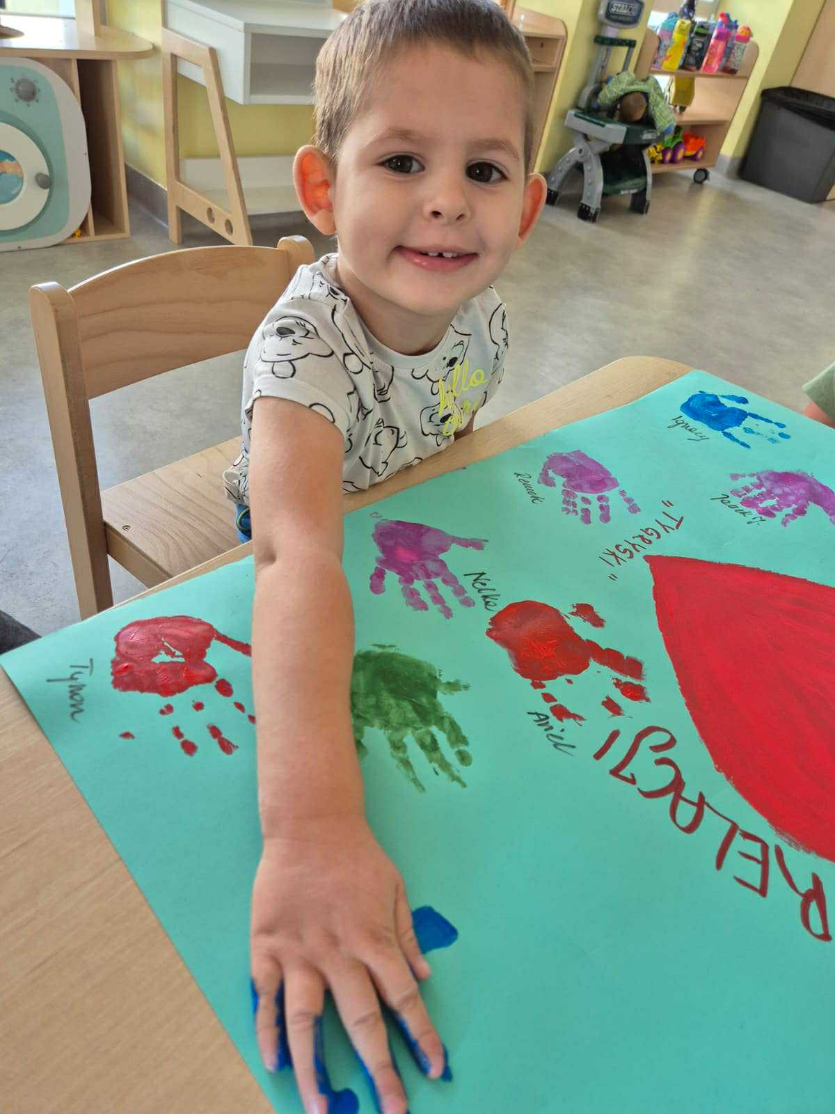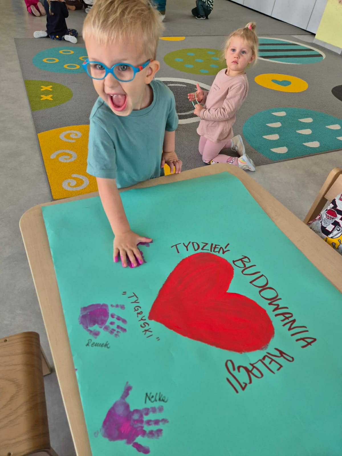 Na zakoÅ„czenie Tygodnia Budowania Relacji Tygryski wykonaÅ‚y wspólnÄ… pracÄ™ plastycznÄ… „Nasze dÅ‚onie”, dzieci odbijaÅ‚y na dużym arkuszu papieru kolorowe rÄ…czki, tworzÄ…c symbol wspólnoty