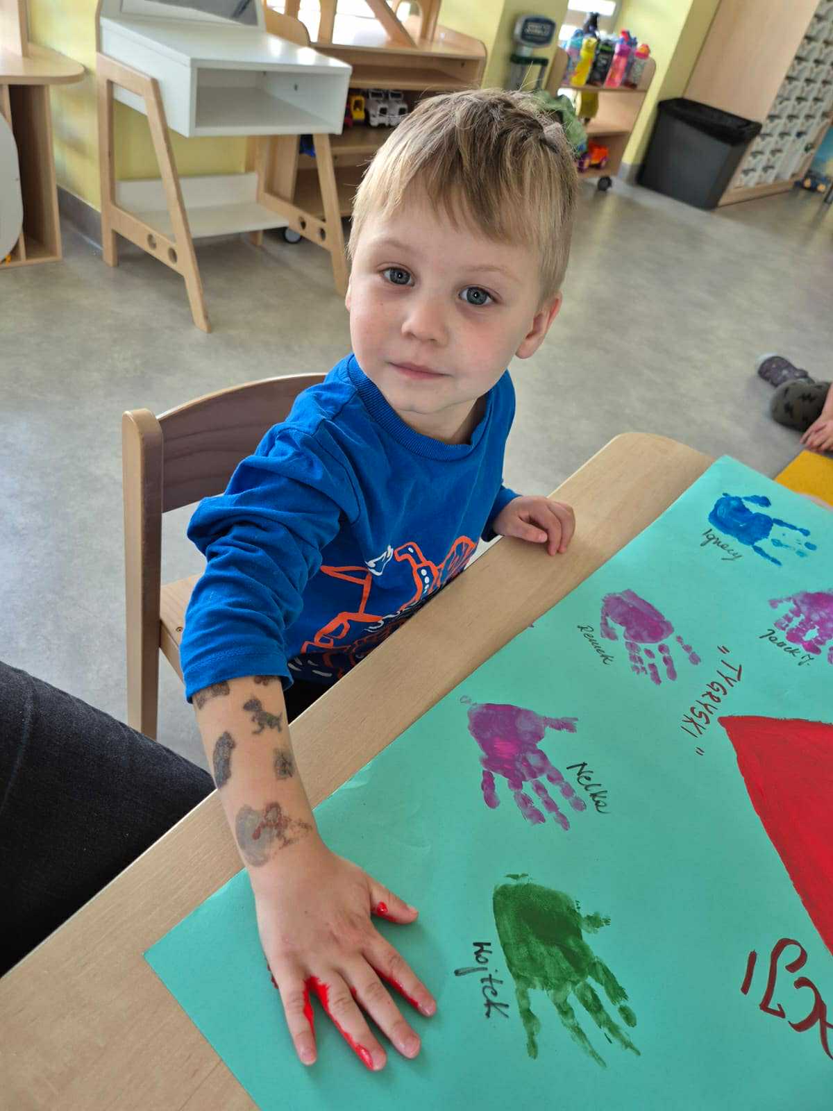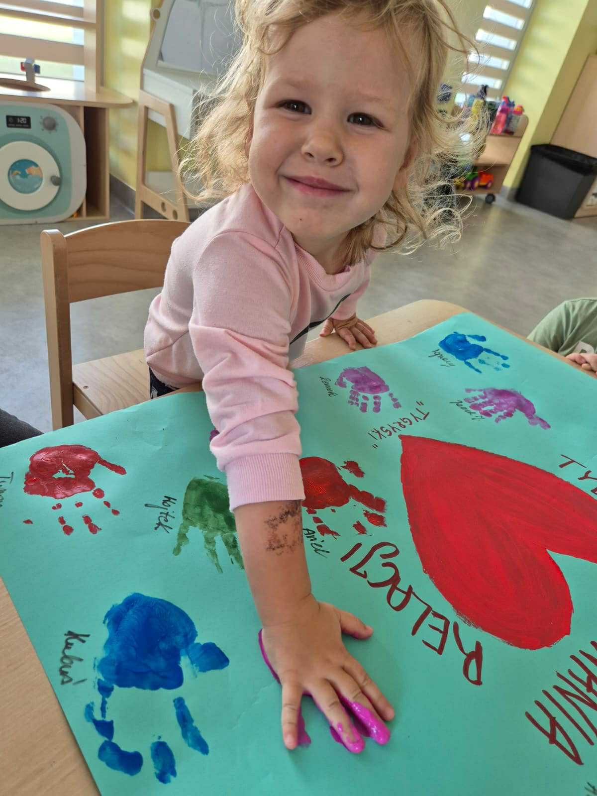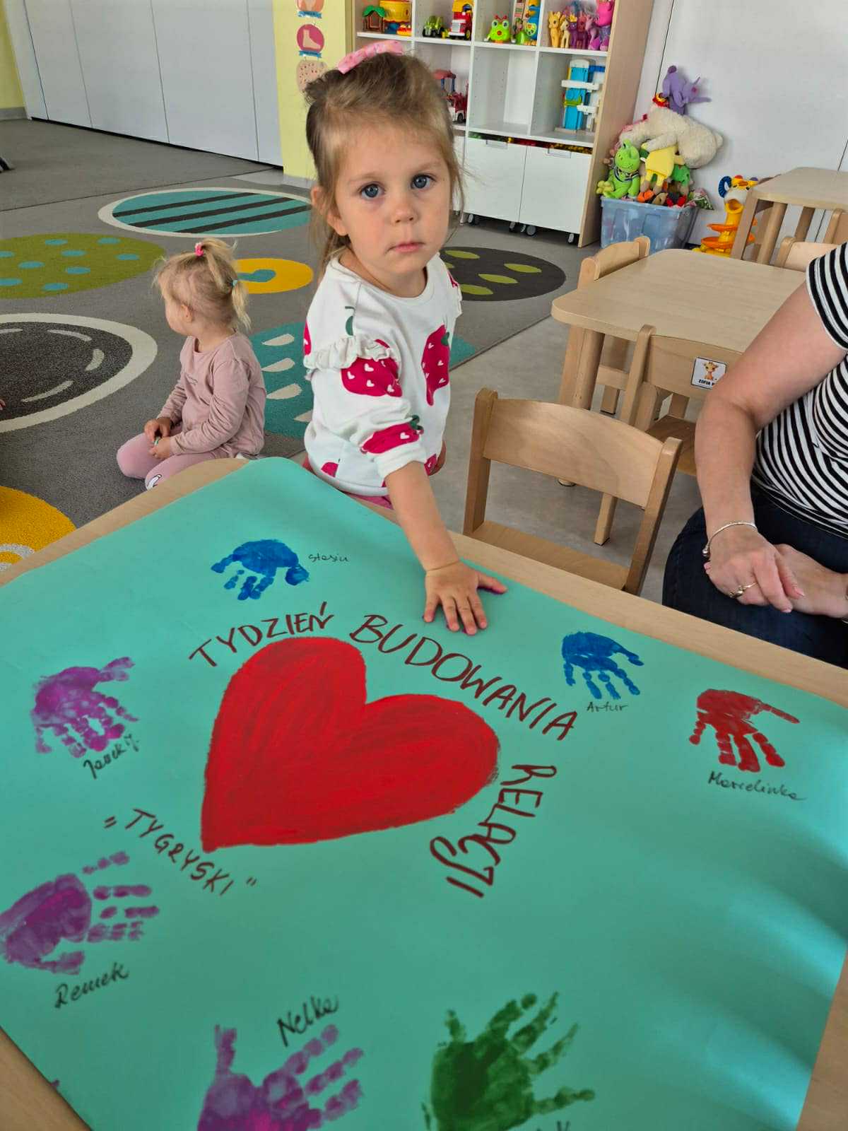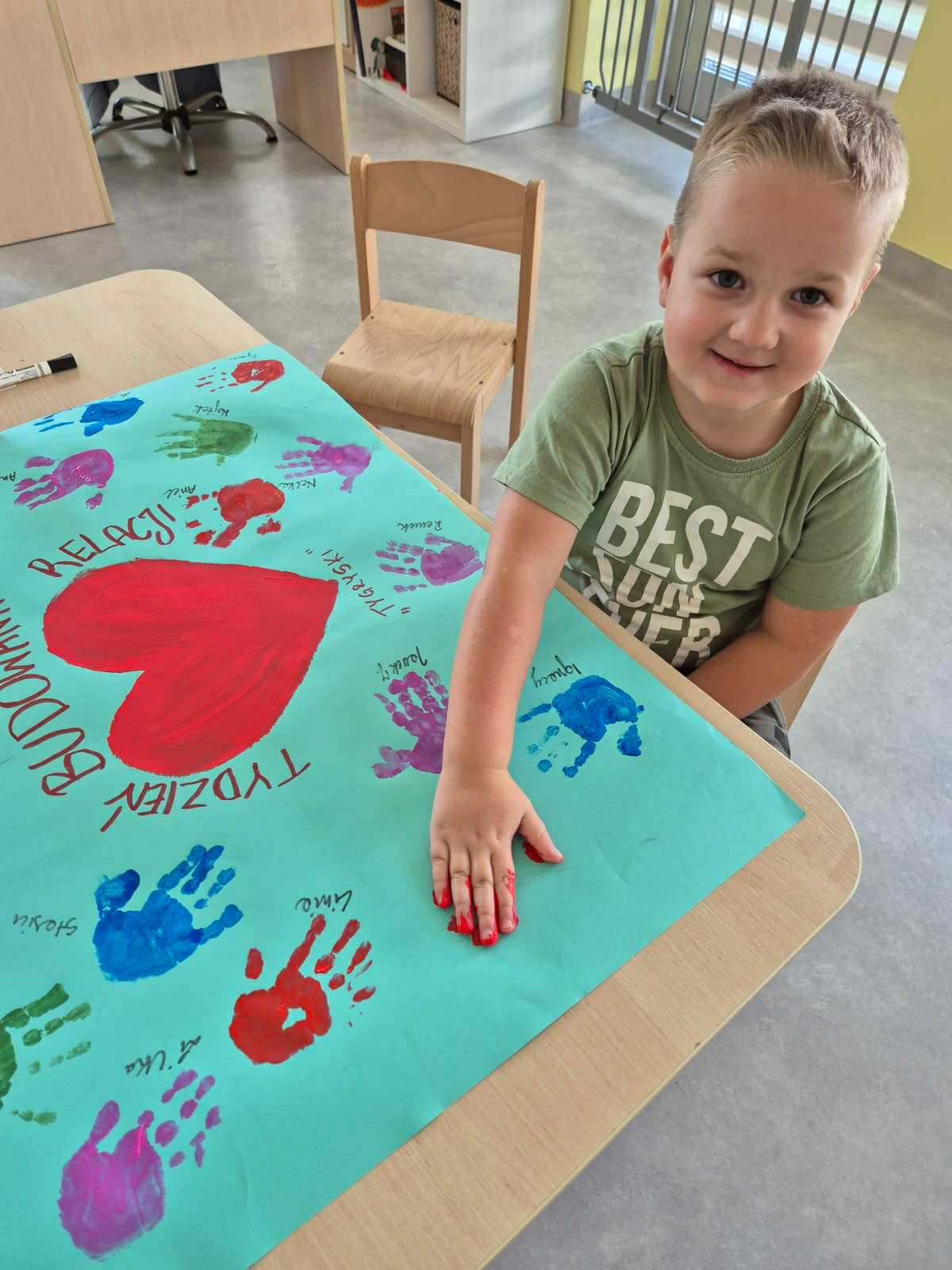 Na zakoÅ„czenie Tygodnia Budowania Relacji Tygryski wykonaÅ‚y wspólnÄ… pracÄ™ plastycznÄ… „Nasze dÅ‚onie”, dzieci odbijaÅ‚y na dużym arkuszu papieru kolorowe rÄ…czki, tworzÄ…c symbol wspólnoty