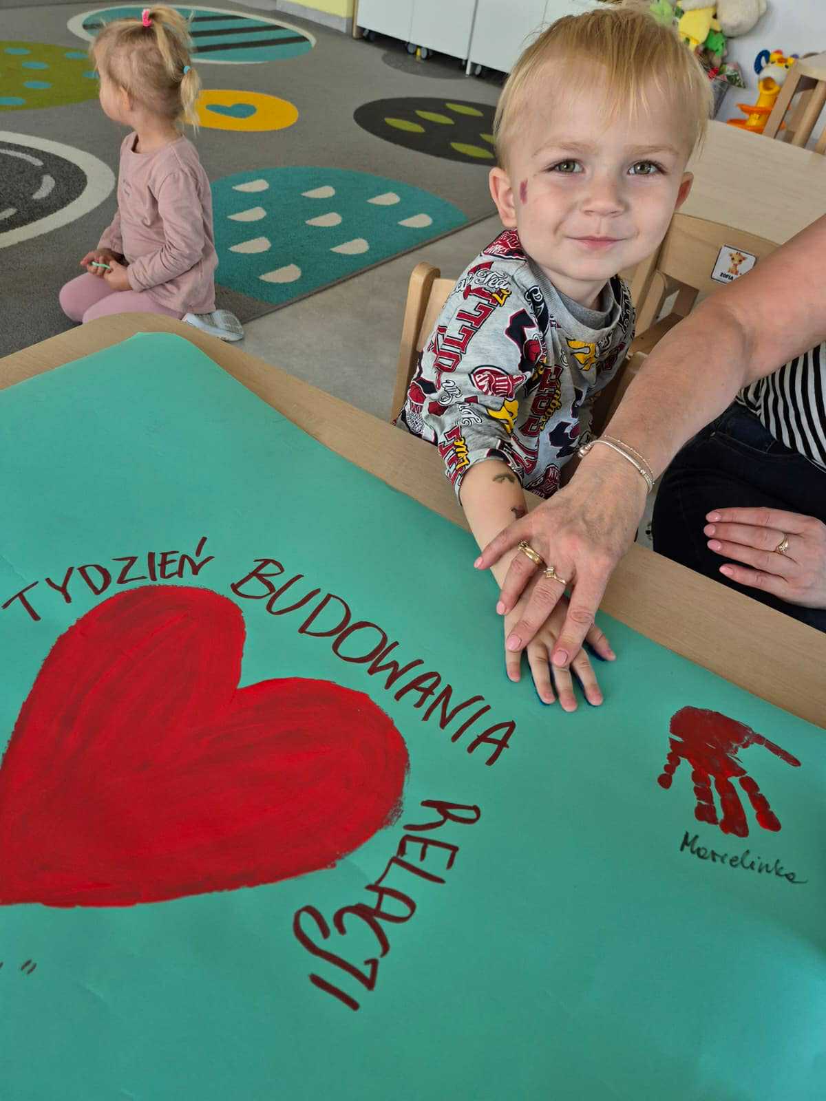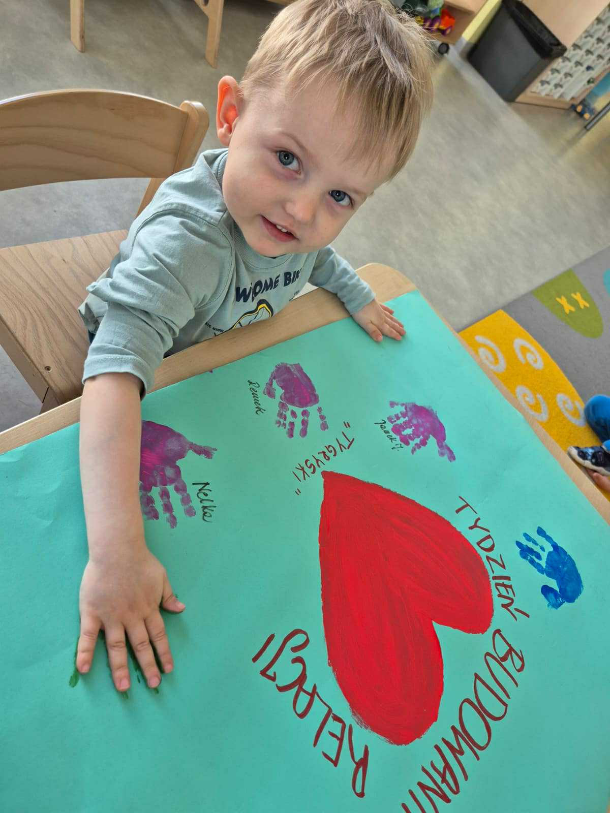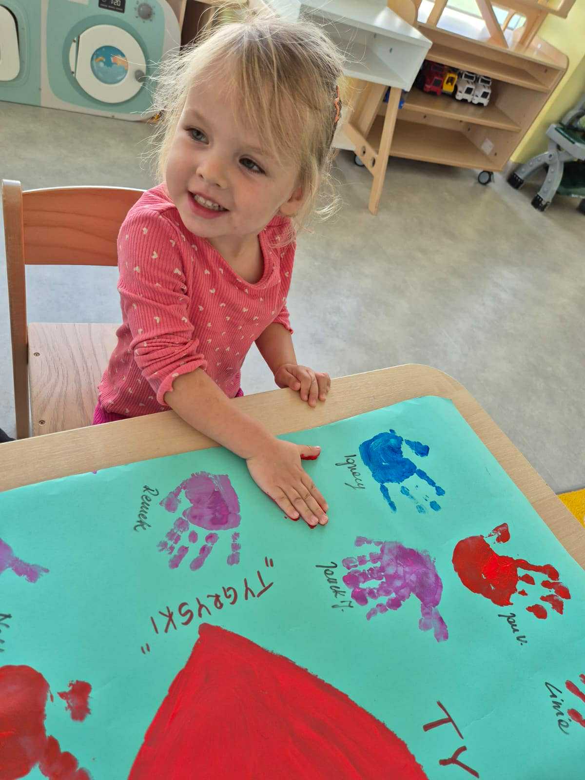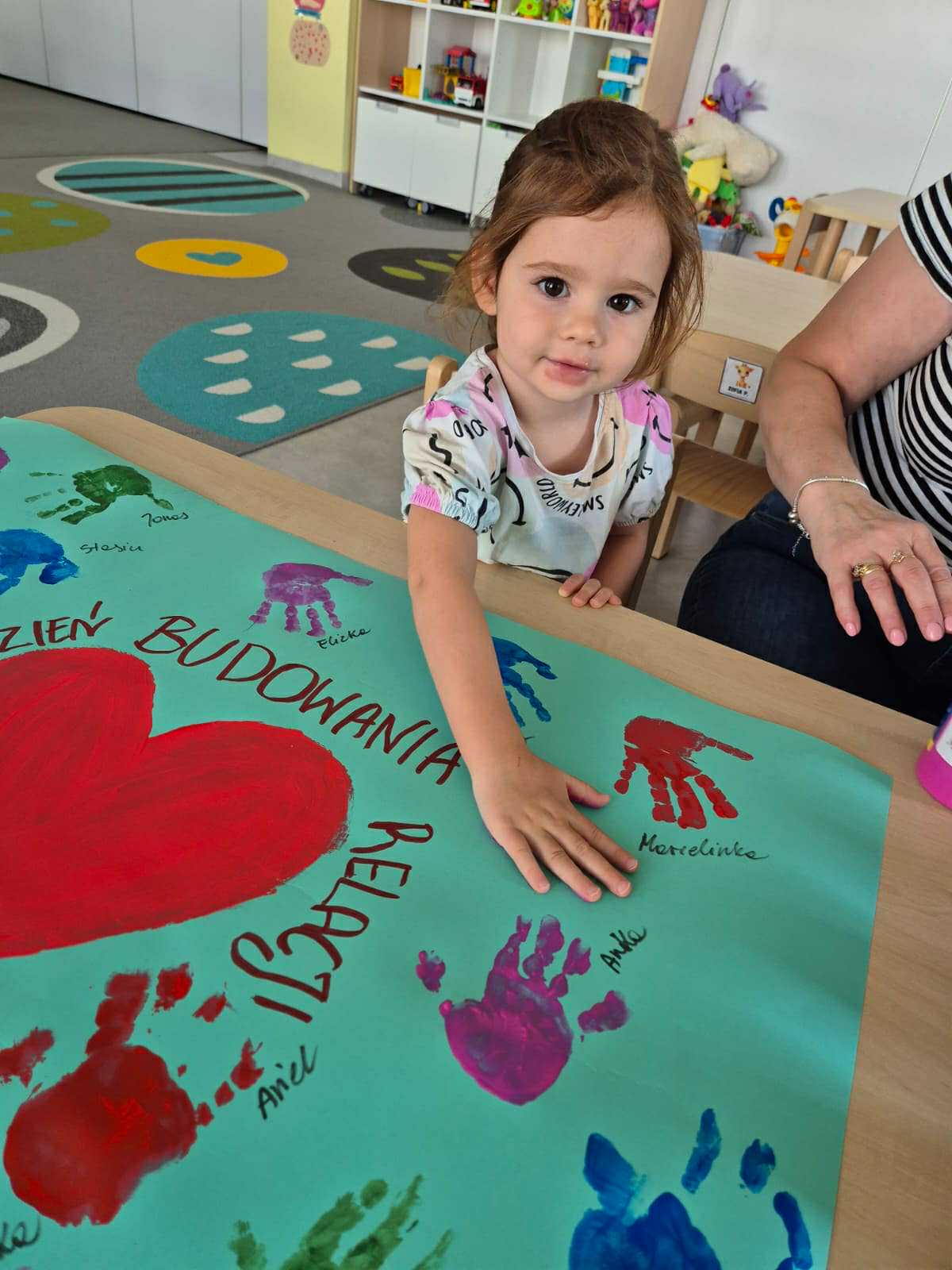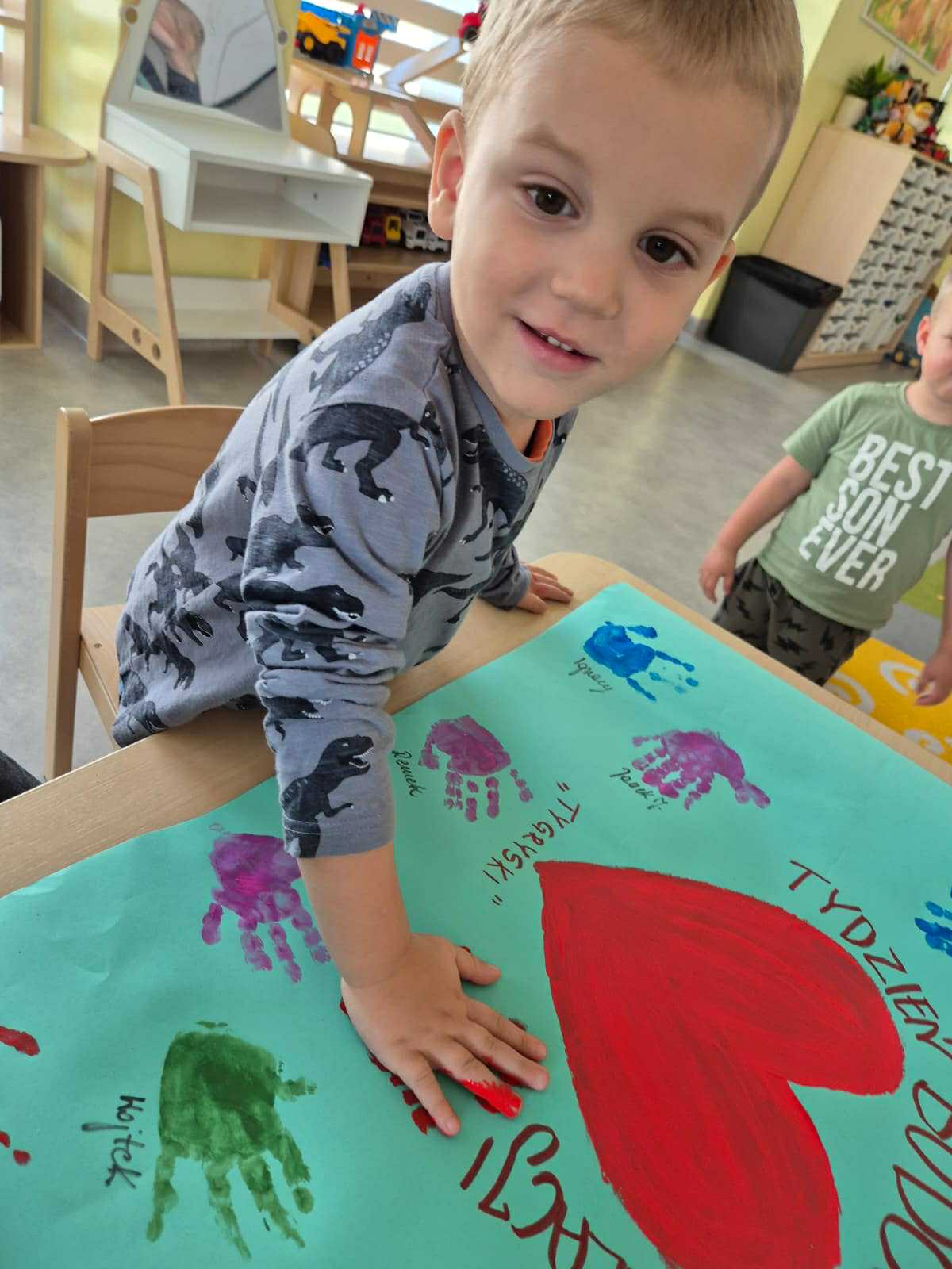 Na zakoÅ„czenie Tygodnia Budowania Relacji Tygryski wykonaÅ‚y wspólnÄ… pracÄ™ plastycznÄ… „Nasze dÅ‚onie”, dzieci odbijaÅ‚y na dużym arkuszu papieru kolorowe rÄ…czki, tworzÄ…c symbol wspólnoty
