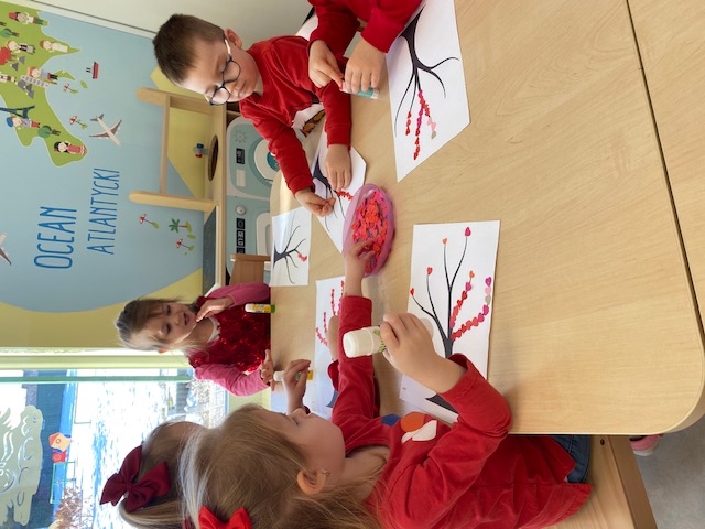 W chwilach twórczego uniesienia dzieci przelewały swoje emocje na papier, tworząc „drzewka miłości” zdobione barwnymi listkami w kształcie serc oraz wyklejając plasteliną małe dzieła sztuki. Nawet zadania logopedyczne ukryte w czarodziejskim koszyczku oraz walentynkowe łamigłówki stały się okazją do wspólnego pokonywania trudności i dzielenia się uśmiechem.