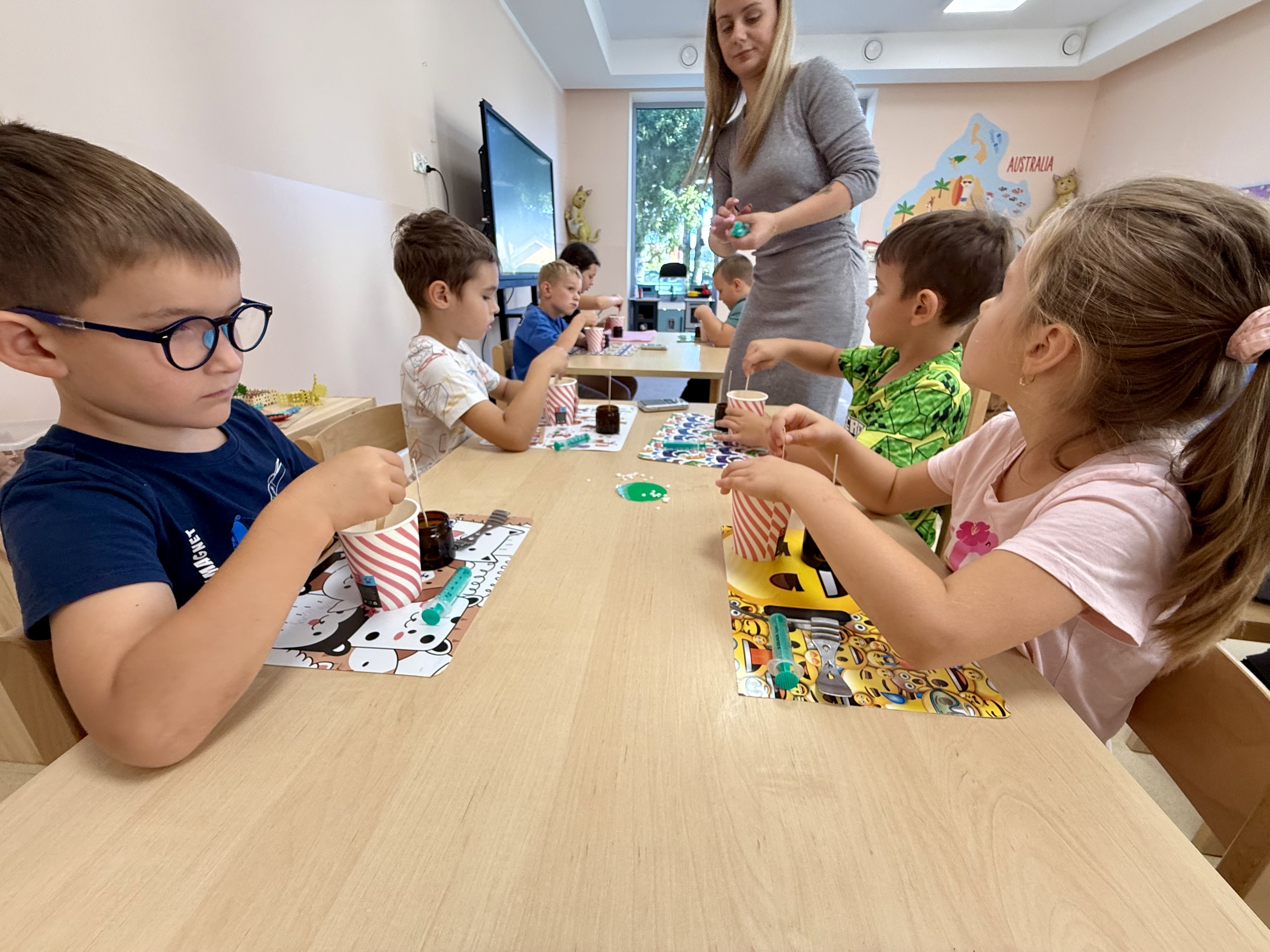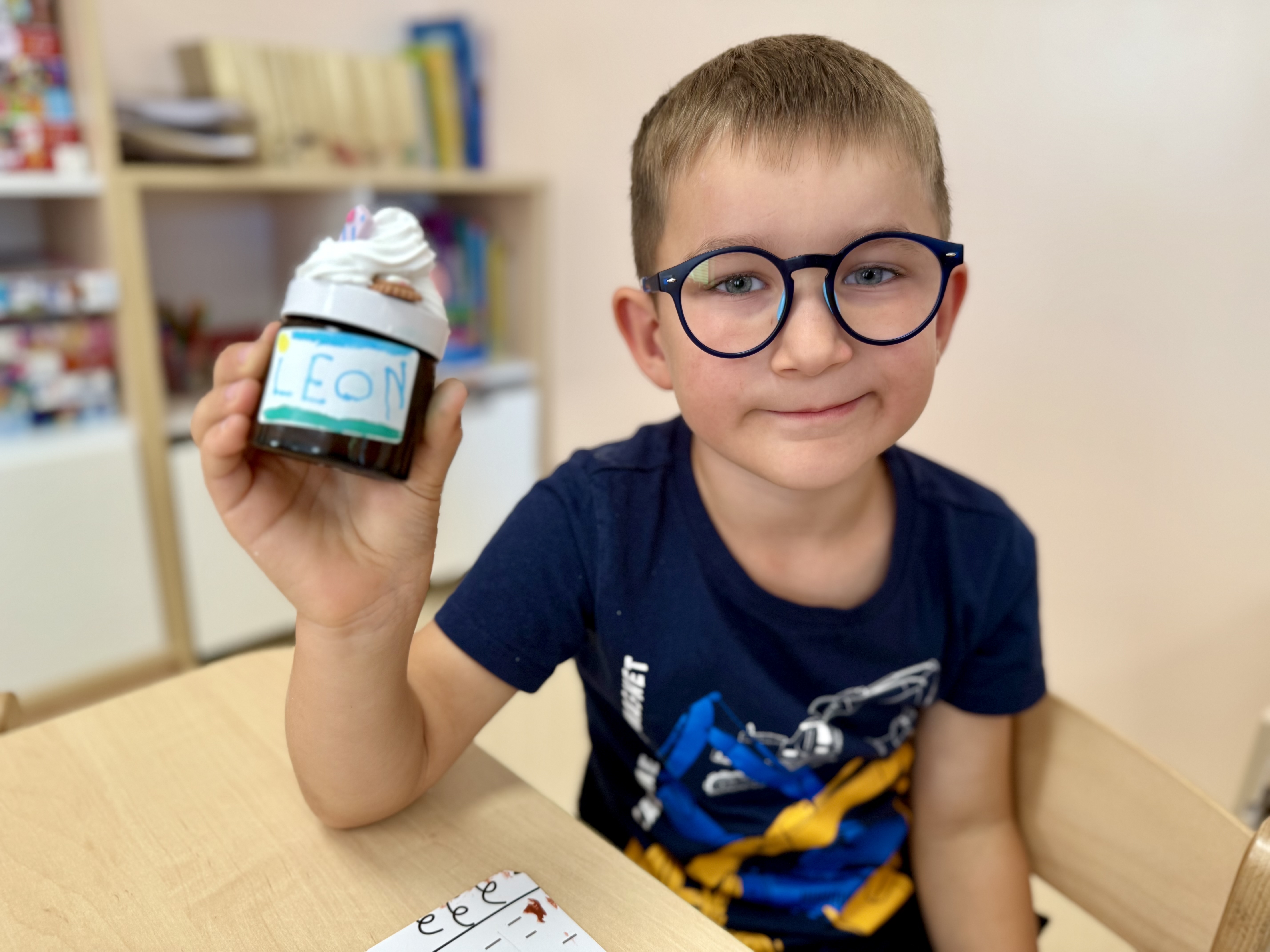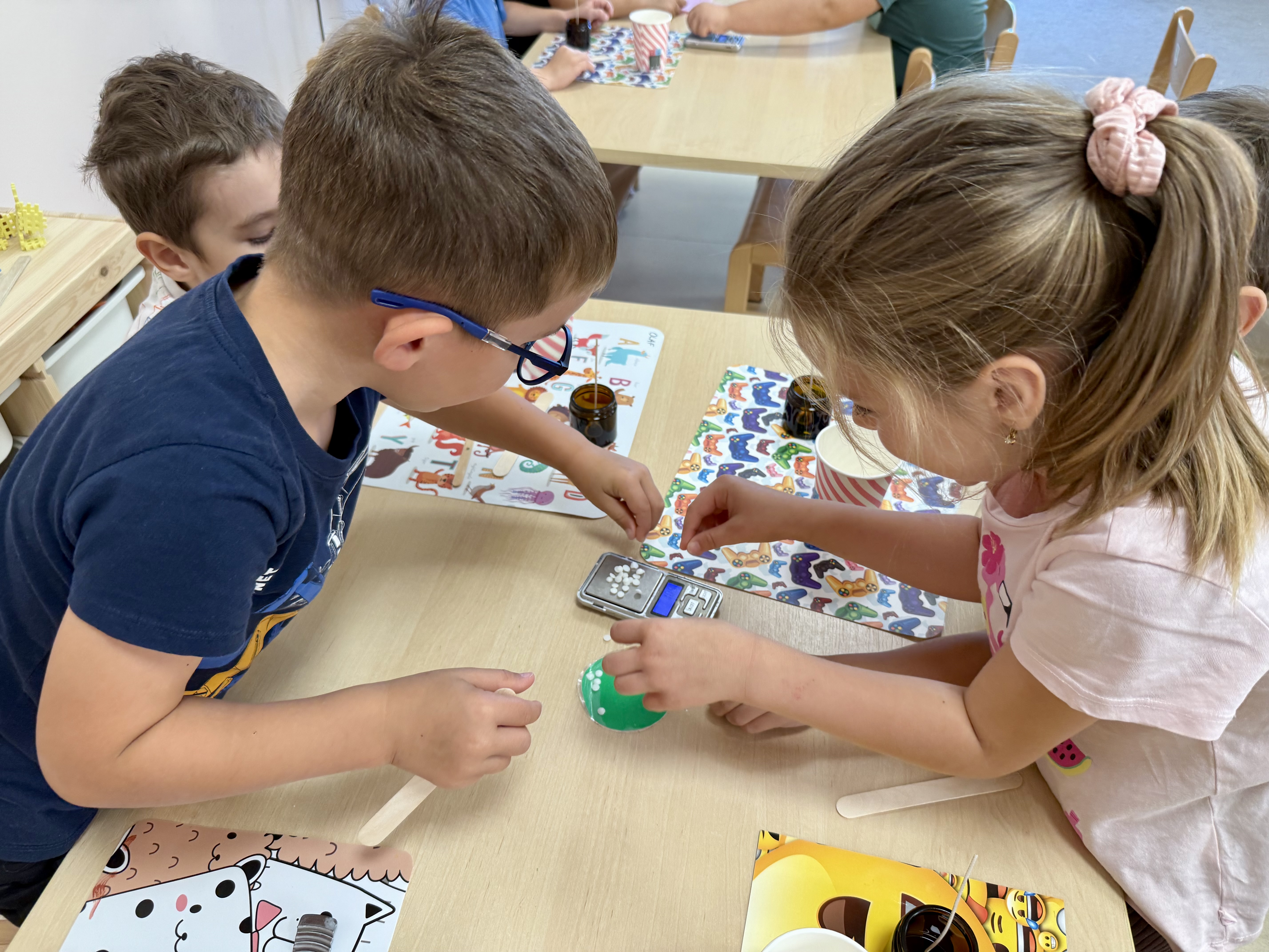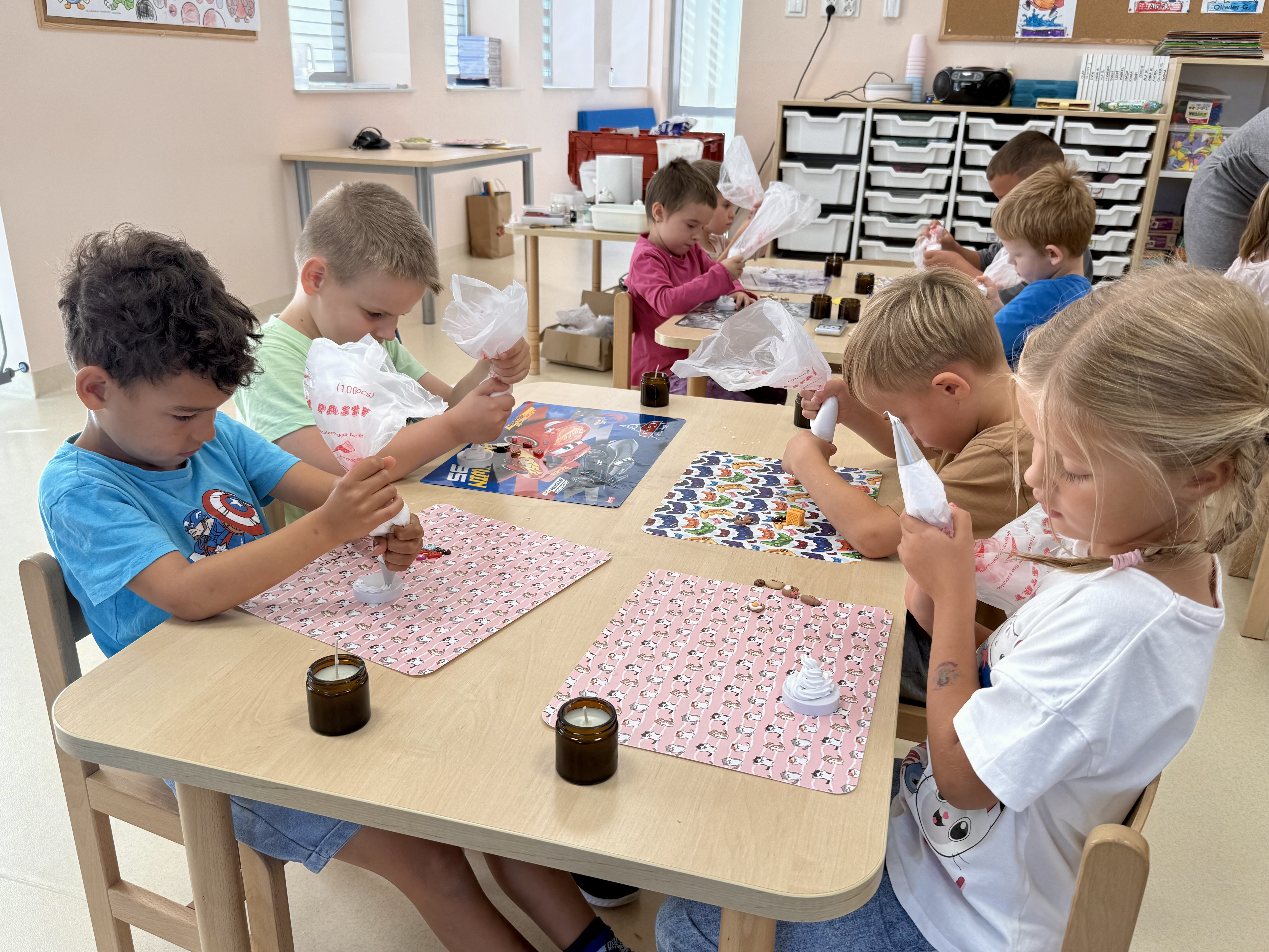 Pierwszym etapem było przygotowanie wosku z olejkiem, a zaraz potem dzieci – niczym prawdziwi dekoratorzy – przygotowały ozdobne wieczka z akrylu. Było na nich miejsce na kolorowe i fantazyjne dodatki, dzięki czemu powstały prawdziwe małe dzieła sztuki. Na koniec dzieci zaprojektowały własne etykietki, które nadały świeczkom niepowtarzalnego charakteru.
