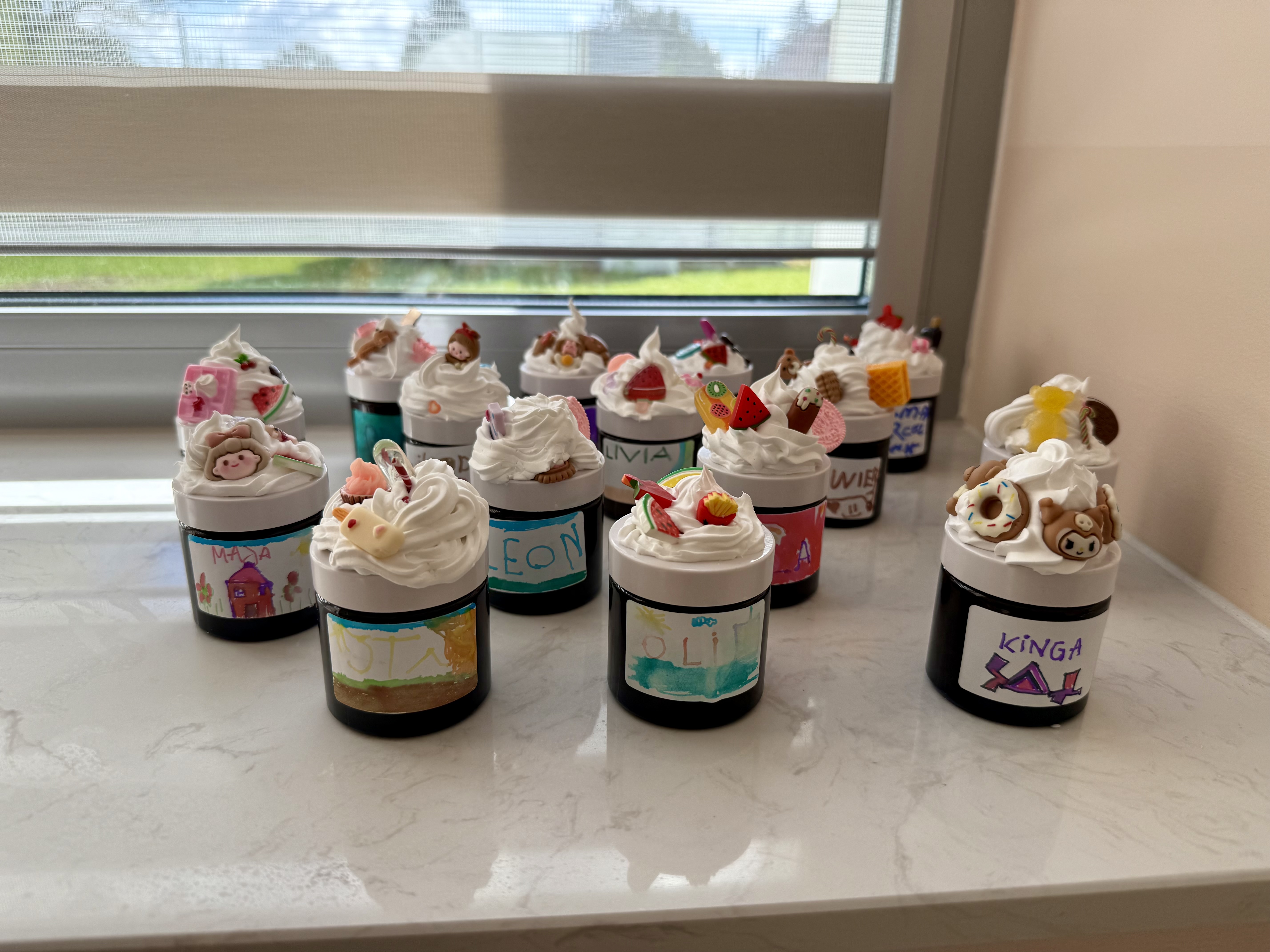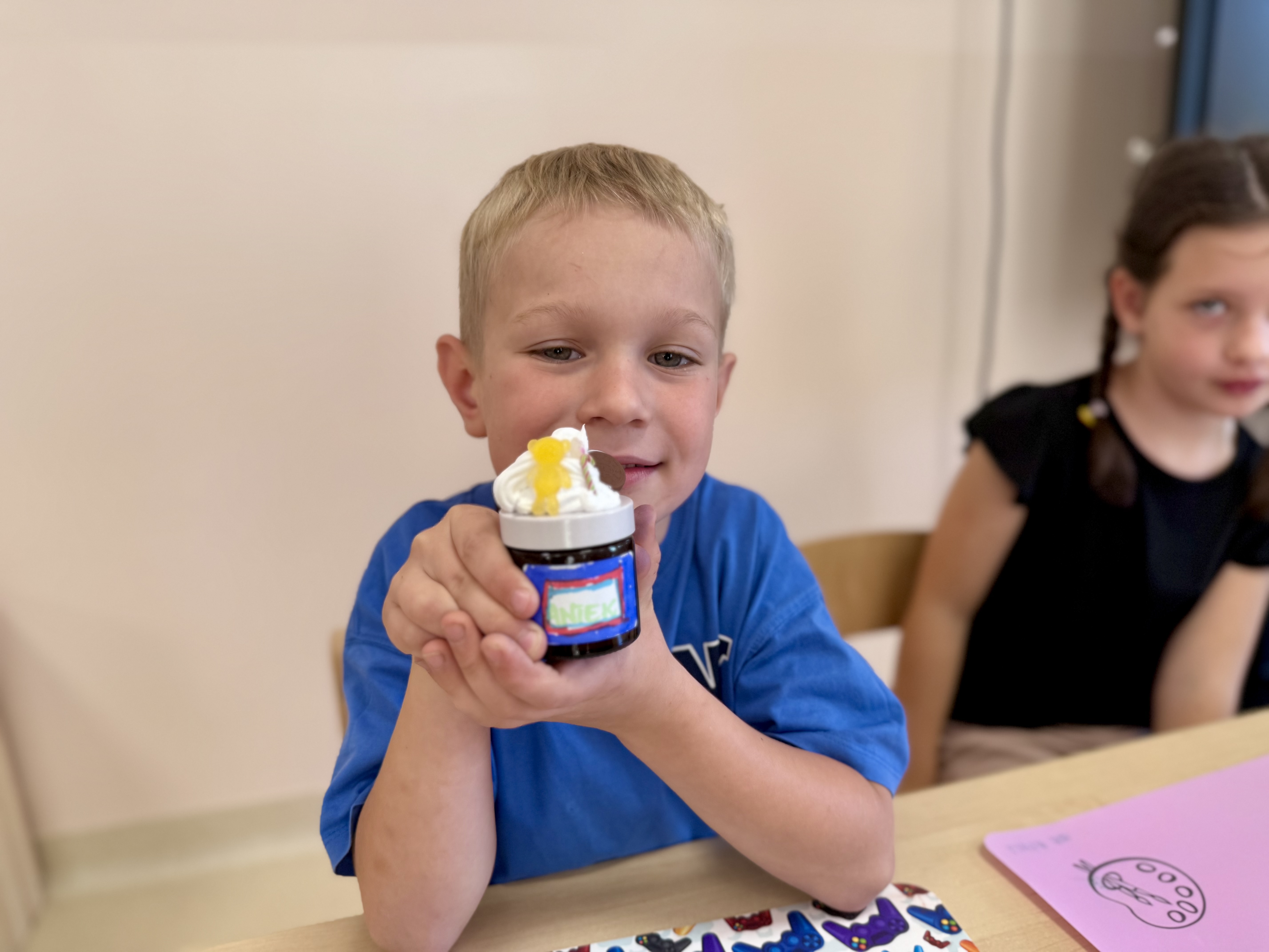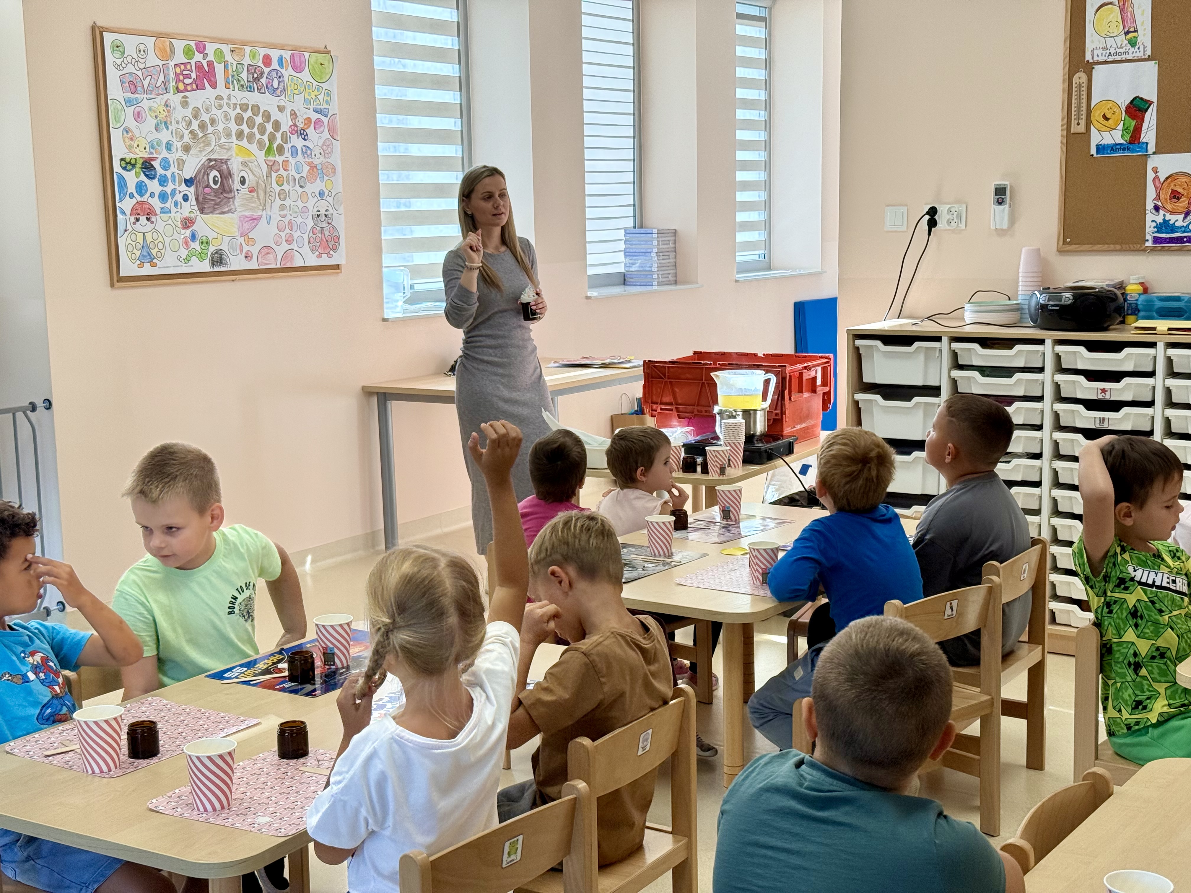 Pierwszym etapem było przygotowanie wosku z olejkiem, a zaraz potem dzieci – niczym prawdziwi dekoratorzy – przygotowały ozdobne wieczka z akrylu. Było na nich miejsce na kolorowe i fantazyjne dodatki, dzięki czemu powstały prawdziwe małe dzieła sztuki. Na koniec dzieci zaprojektowały własne etykietki, które nadały świeczkom niepowtarzalnego charakteru.