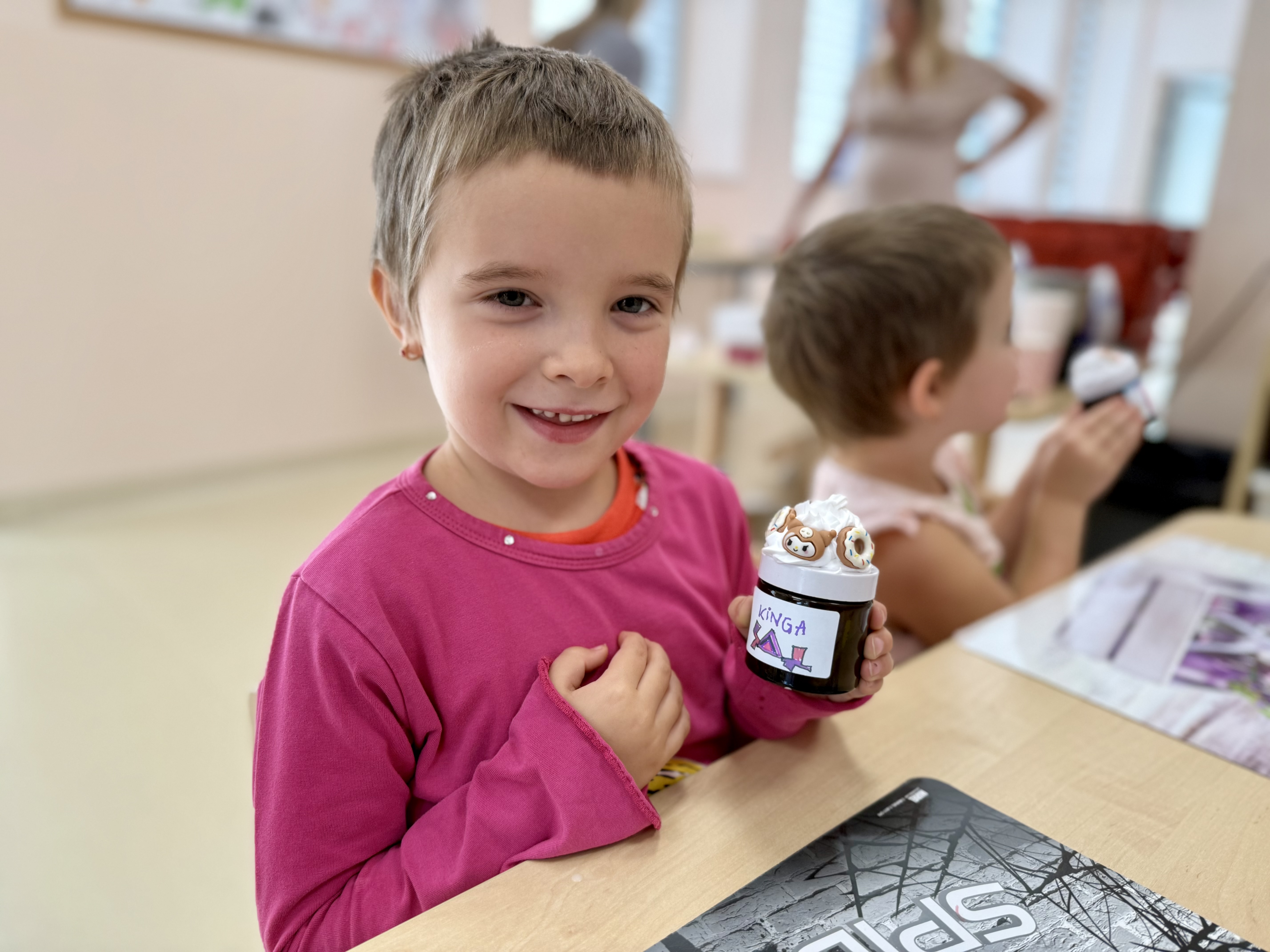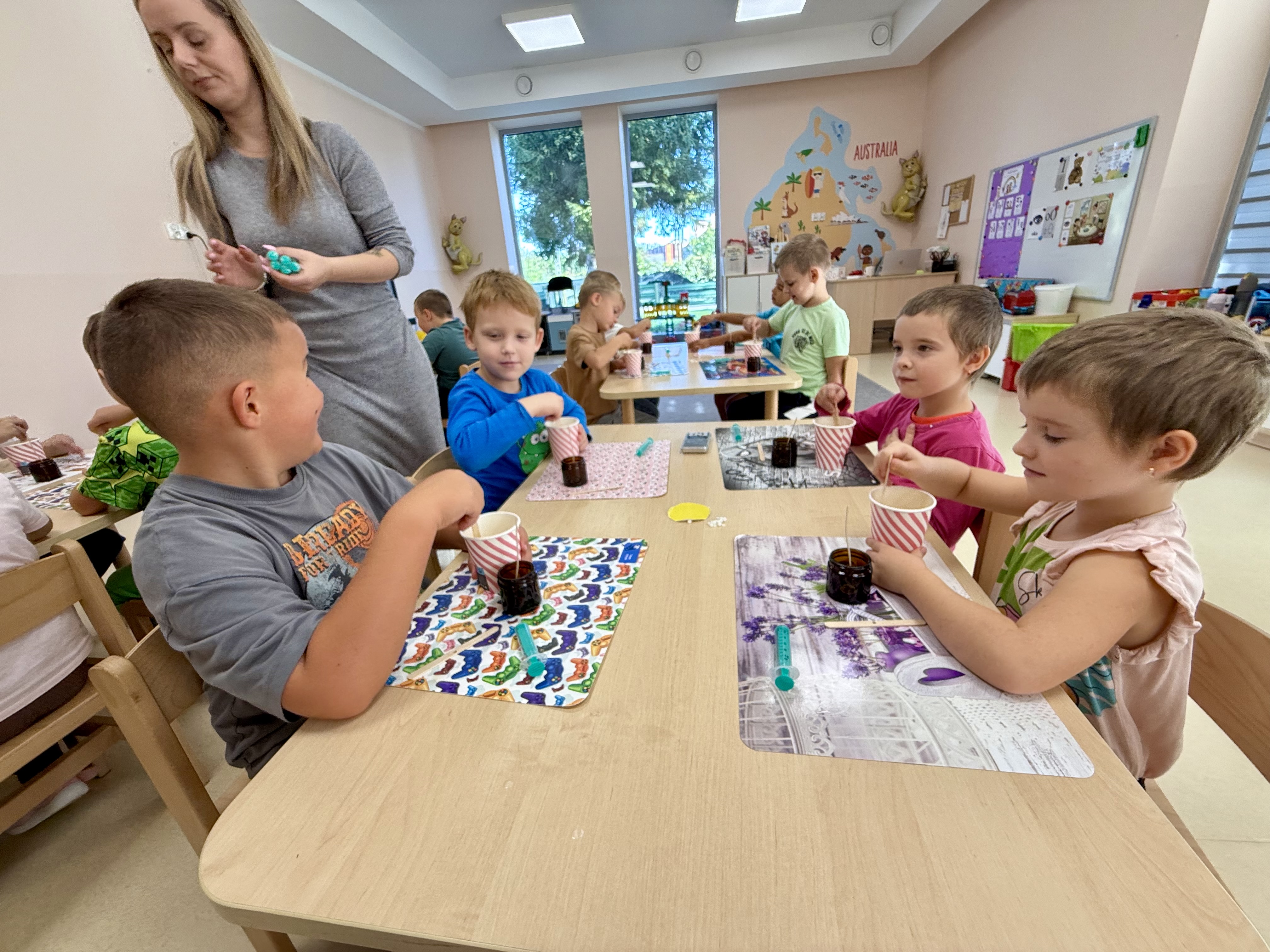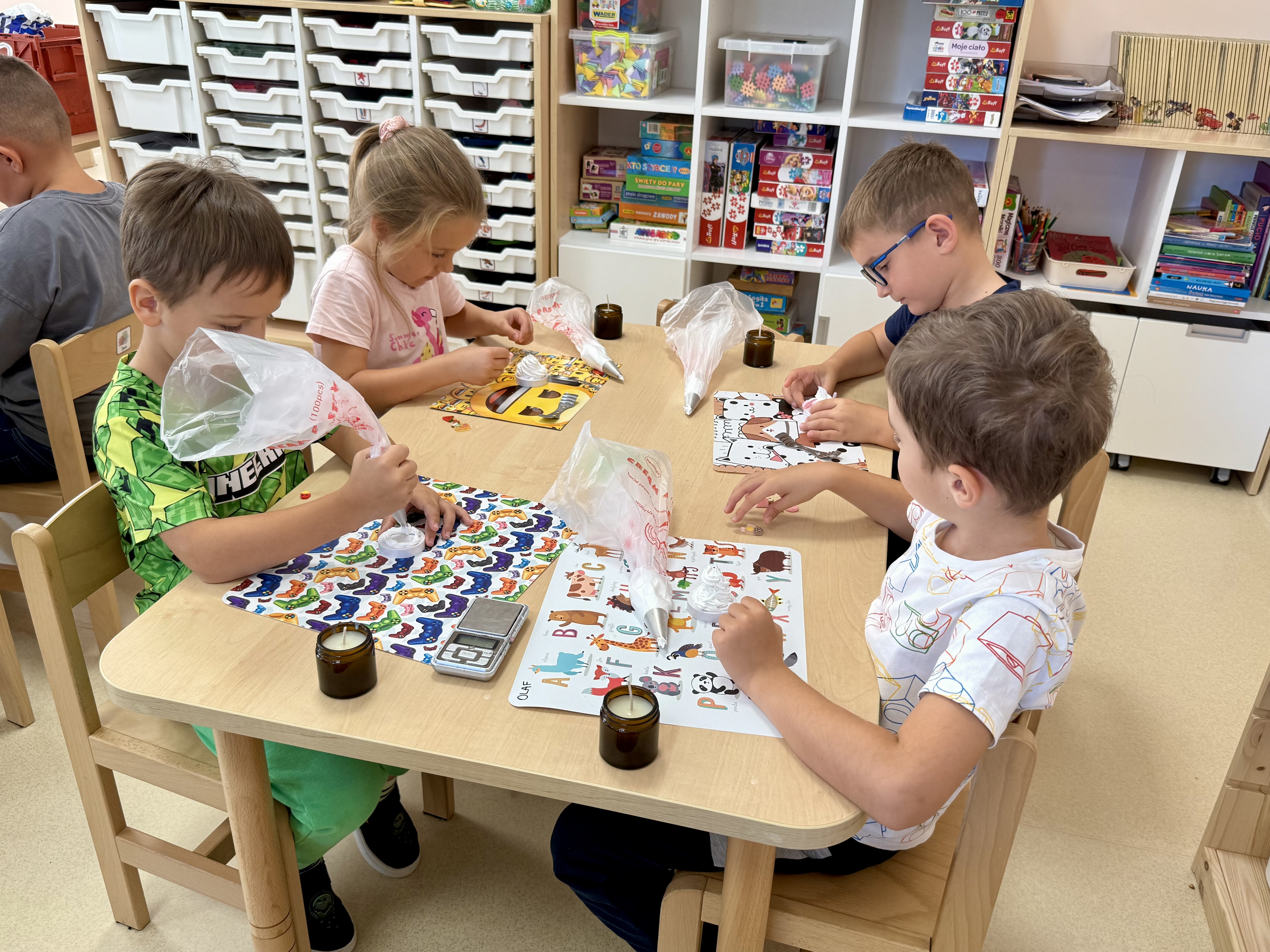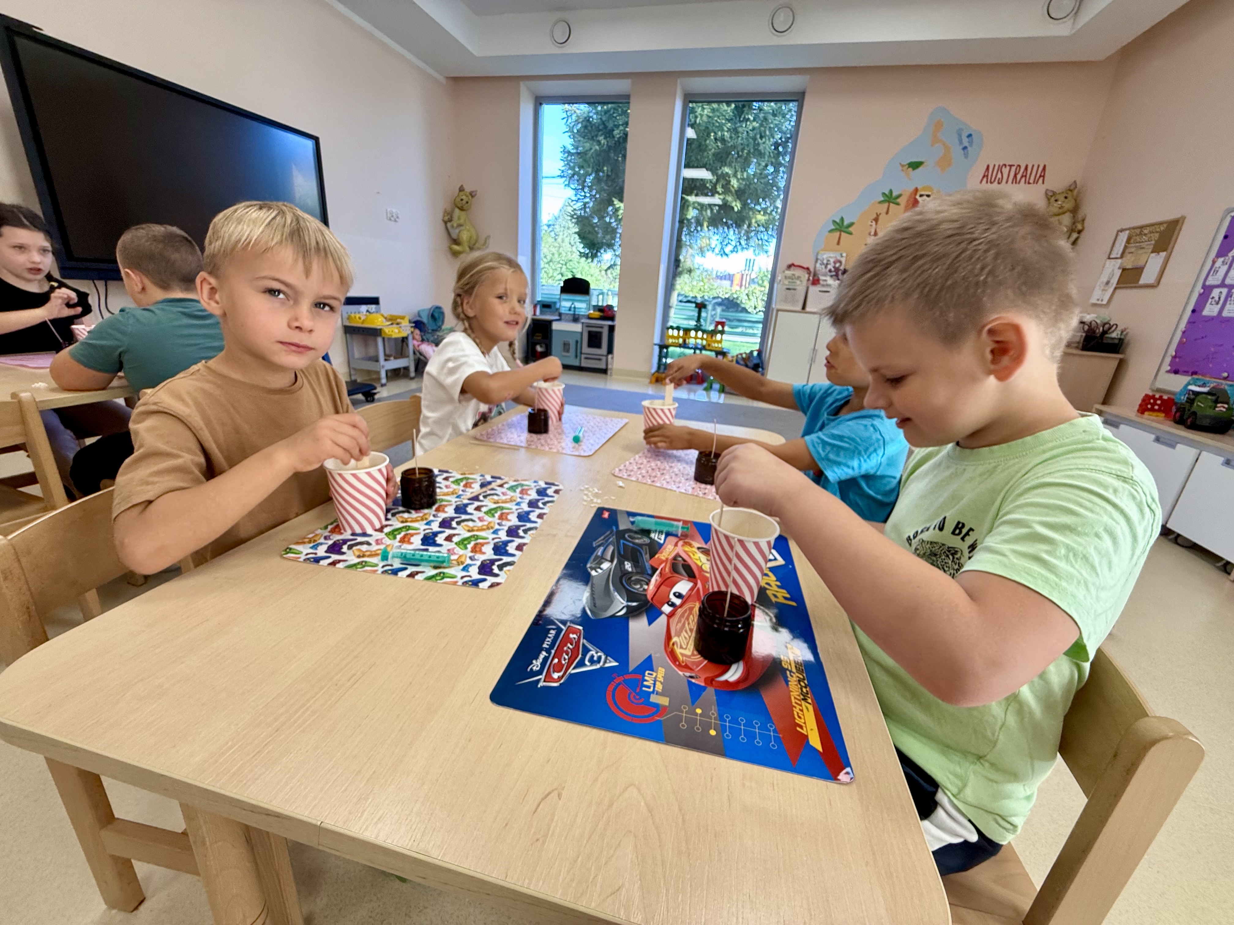 Czy świeczka może być dziełem sztuki? „Kangury” udowodniły, że tak! Dnia 23 września 2025 r. dzieci z tej grupy uczestniczyły w warsztatach woskowych przygotowanych przez firmę Looks Yummy. Przedszkolaki poznały proces powstawania świec i własnoręcznie wykonały zapachowe świeczki w słoiczkach.