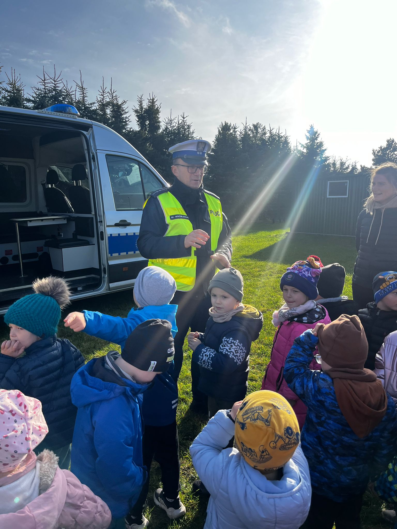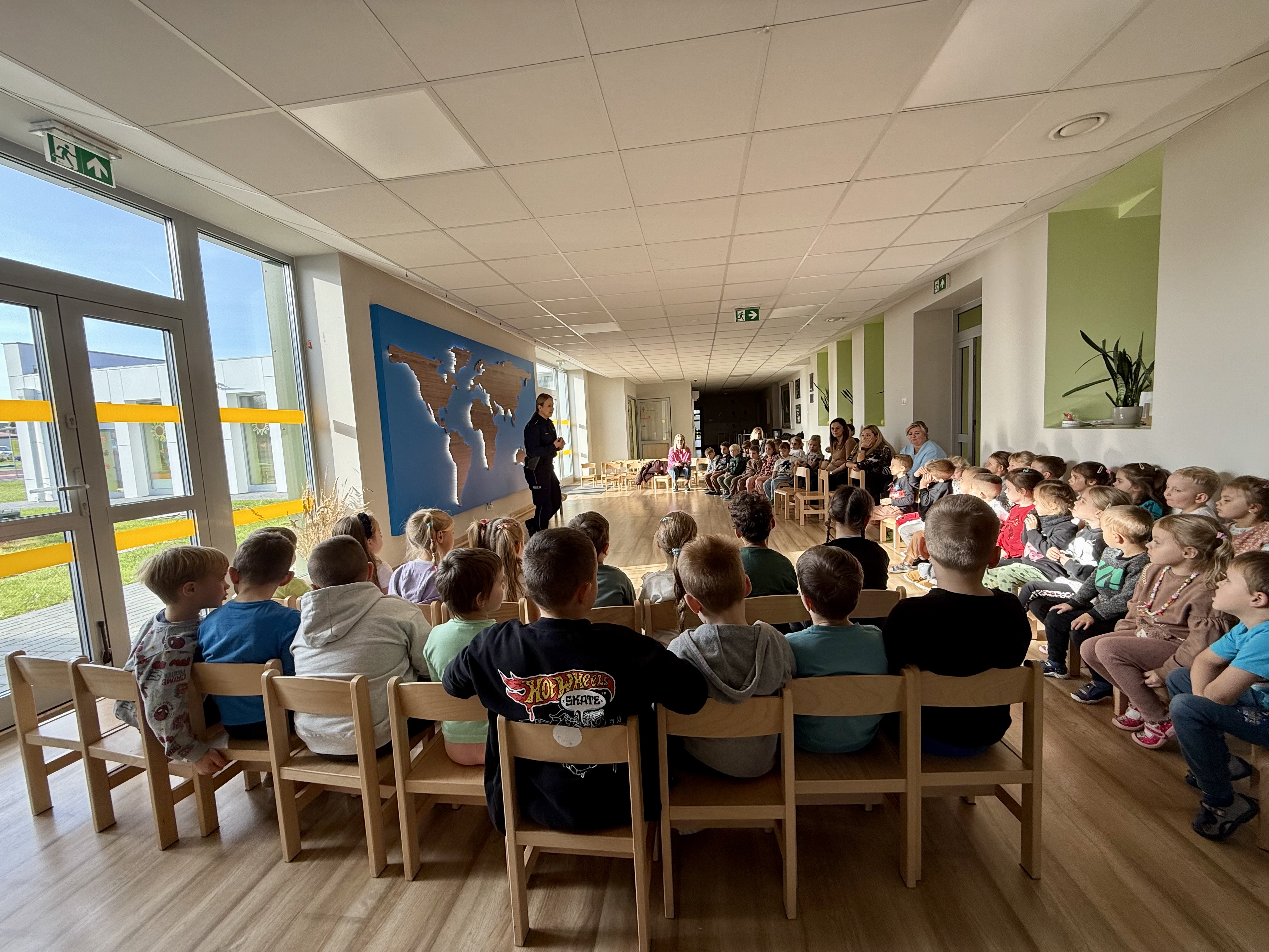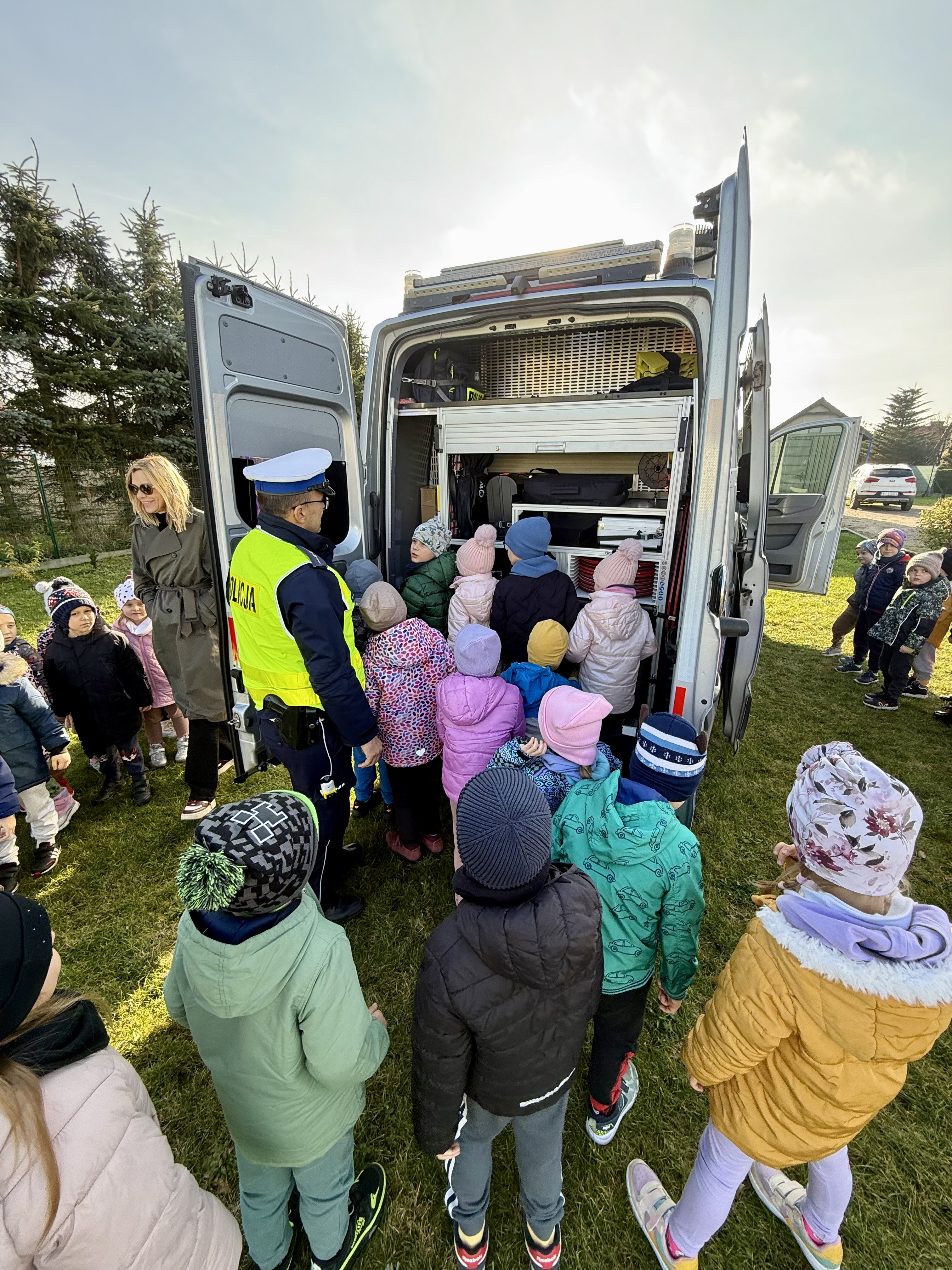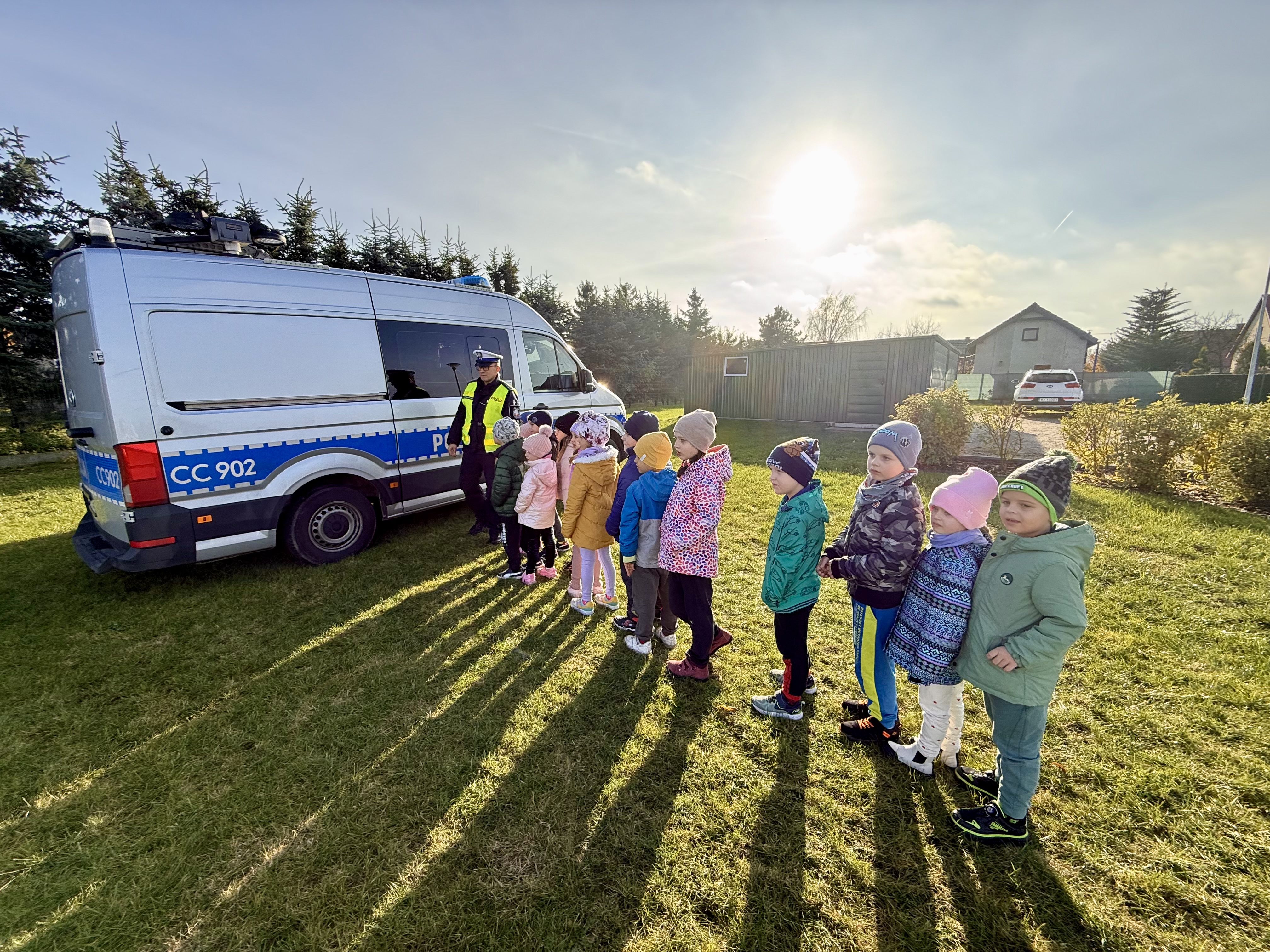 Policjanci z Komendy Powiatowej Policji w Świeciu dnia 04.11.2025r. odwiedzili nasze Przedszkole Samorządowe ,, Pod Kasztankiem” w Laskowicach. Spotkanie miało charakter edukacyjno-profilaktyczny. Celem było przypomnienie dzieciom zasad bezpiecznego zachowania w różnych sytuacjach, zarówno w drodze do przedszkola jak i podczas zabawy. Na zakończenie spotkania dzieci mogły obejrzeć radiowóz policyjny oraz sprzęt używany w codziennej pracy funkcjonariuszy.