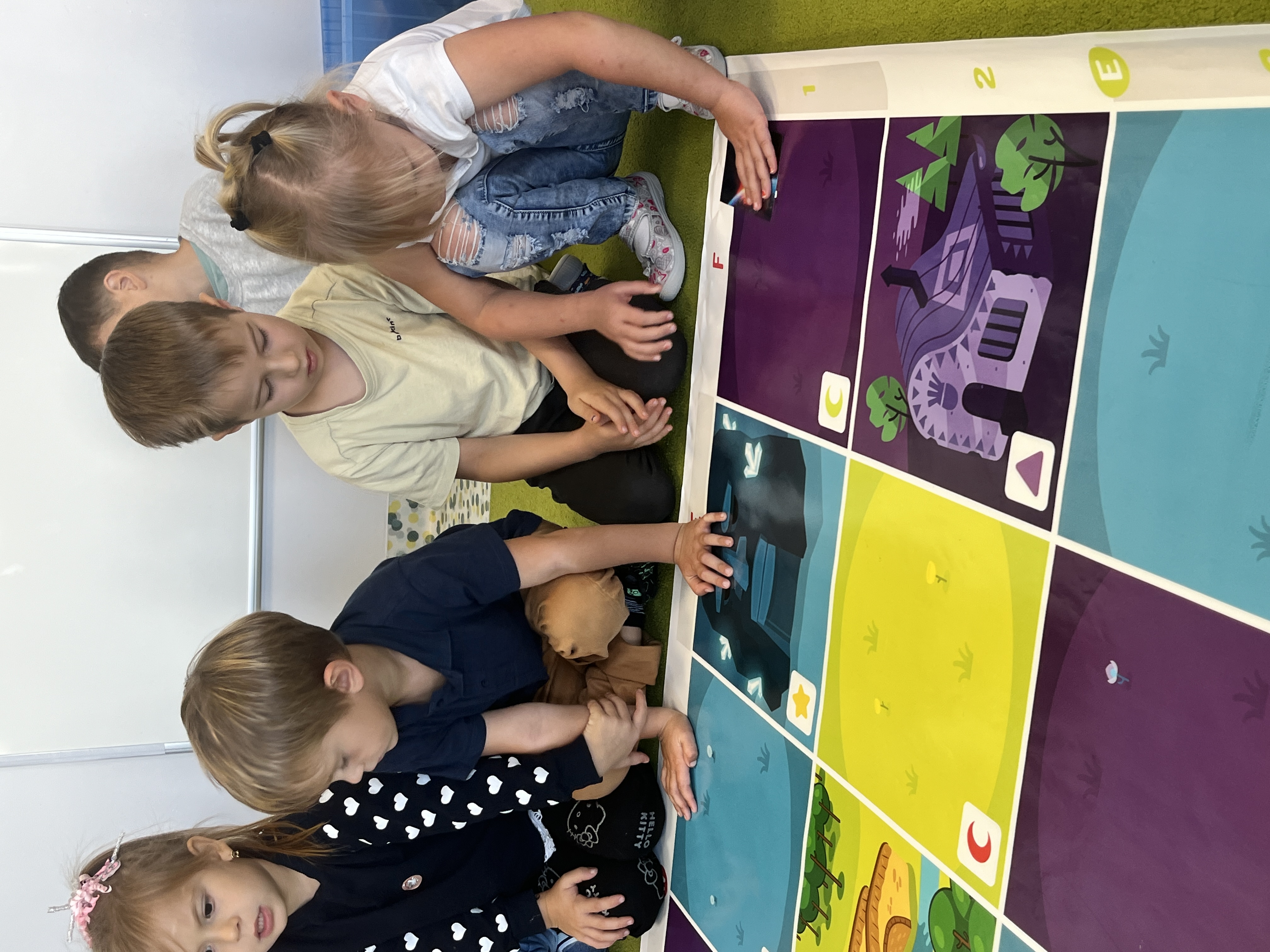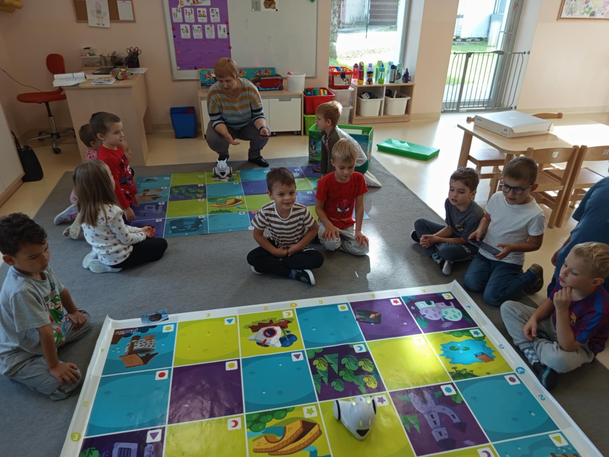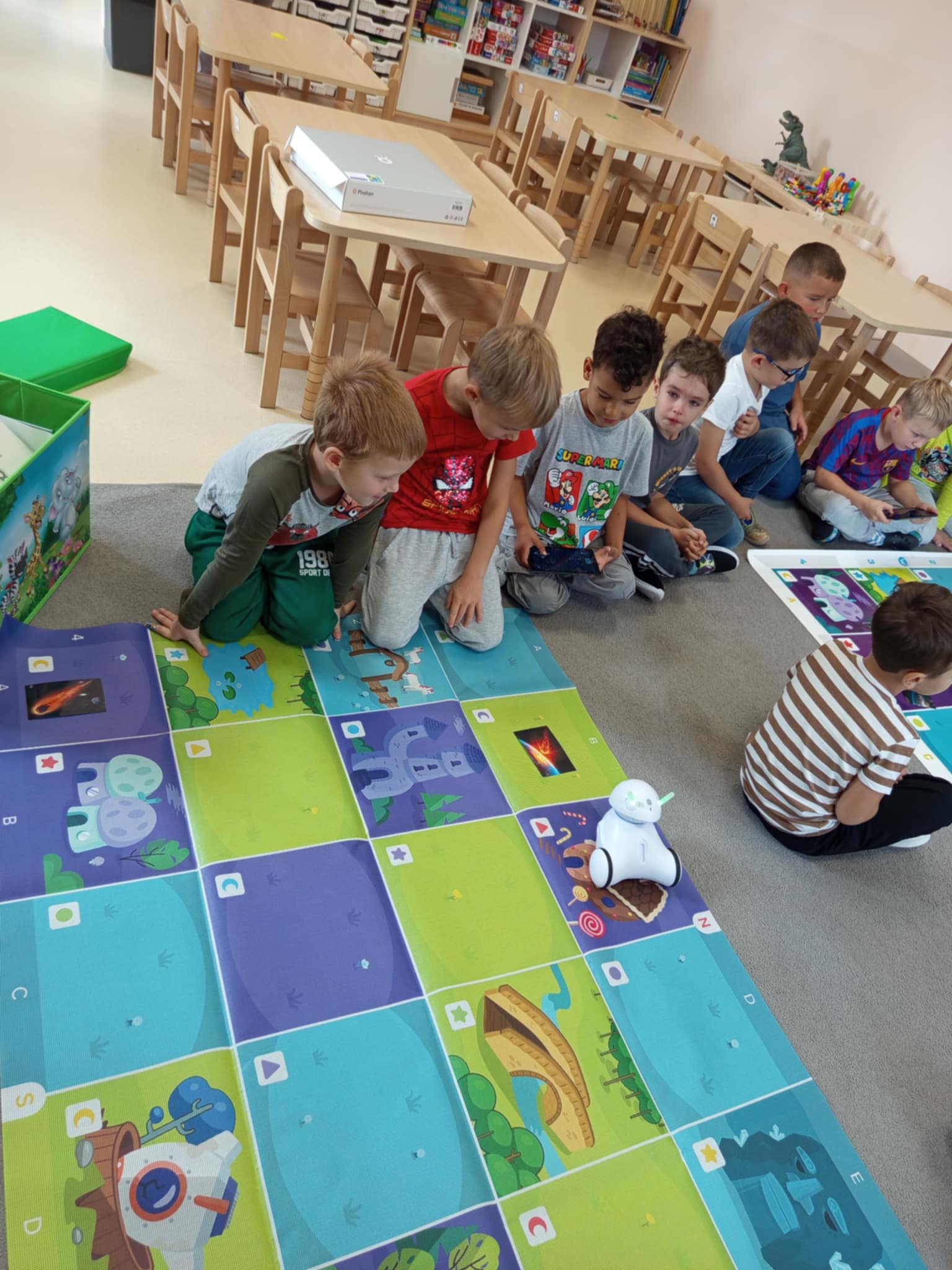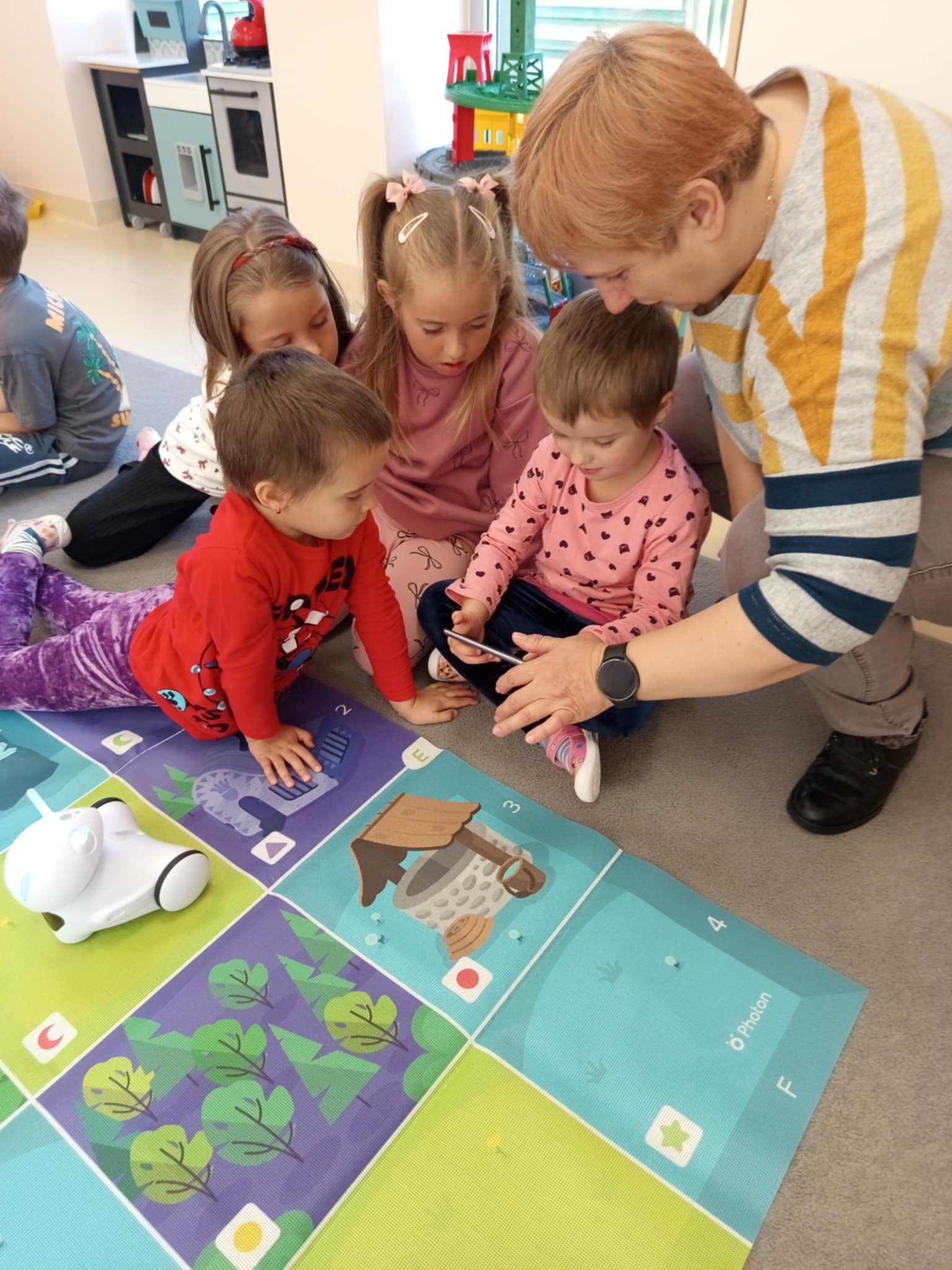 Dnia 16 i 17.09.2025 w naszym przedszkolu odbyły się pierwsze zajęcia - kodowania na dywanie z Panią Ewą Koniarską z Centrum Biblioteki i Kultury w Gminie Jeżewo. Dzieci mogły przypomnieć sobie podstawy działania robota- Photona, jak nim sterować w prosty i zabawny sposób. Każde dziecko miało możliwość prowadzenia urządzenia, według wskazówek Pani Ewy. Wspólna zabawa pozwoliła dzieciom rozwijać kreatywność oraz logiczne myślenie, zajęcia dostarczyły dzieciom wiele radości. Na koniec Pani Ewa rozdała dzieciom kolorowanki robota. Dzieci z niecierpliwością czekają na kolejne zajęcia.