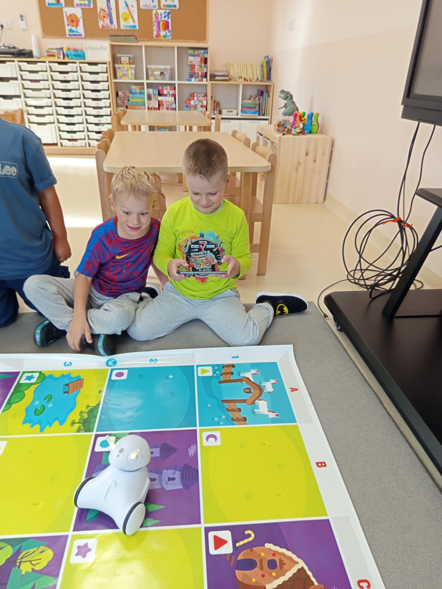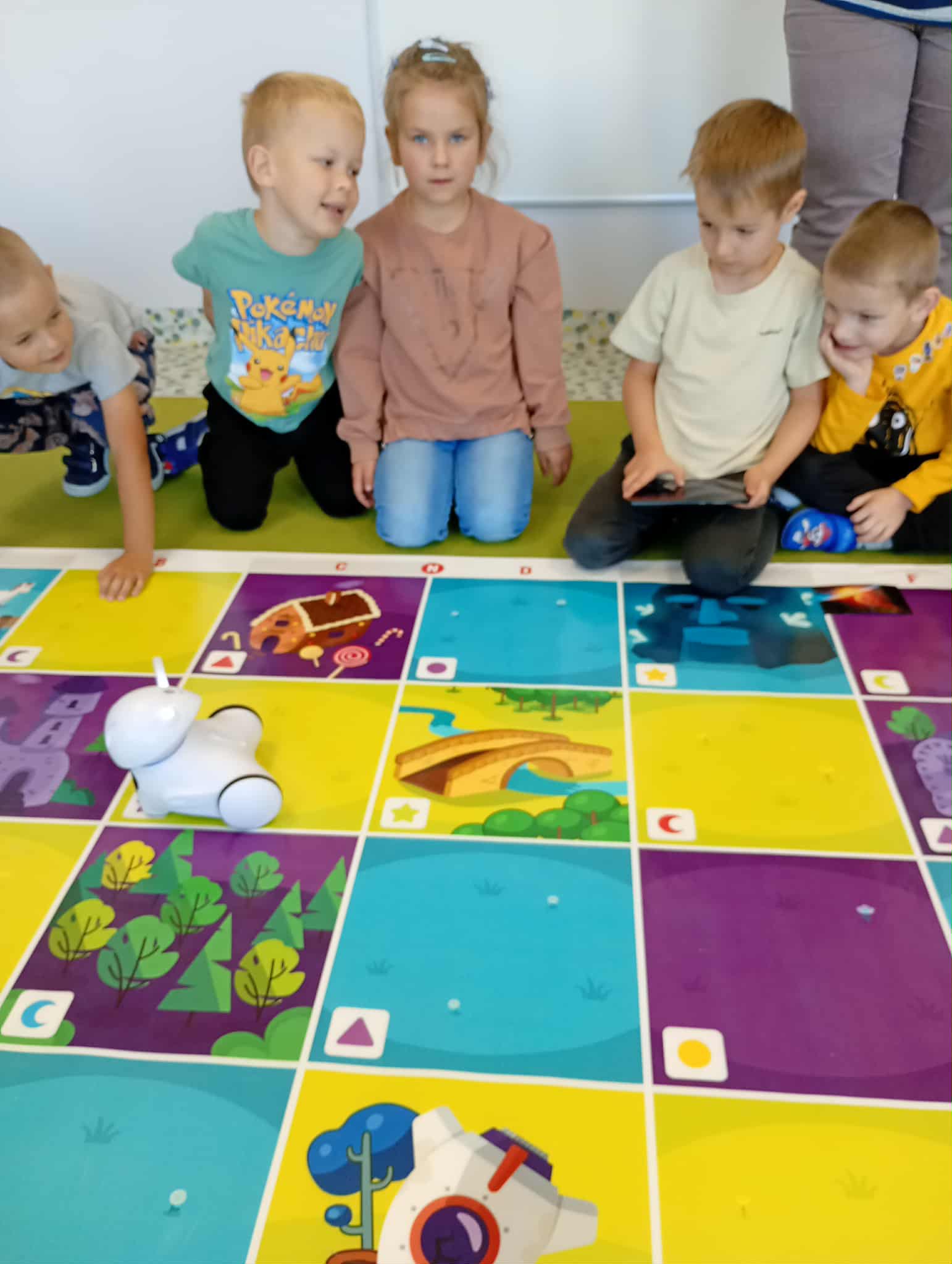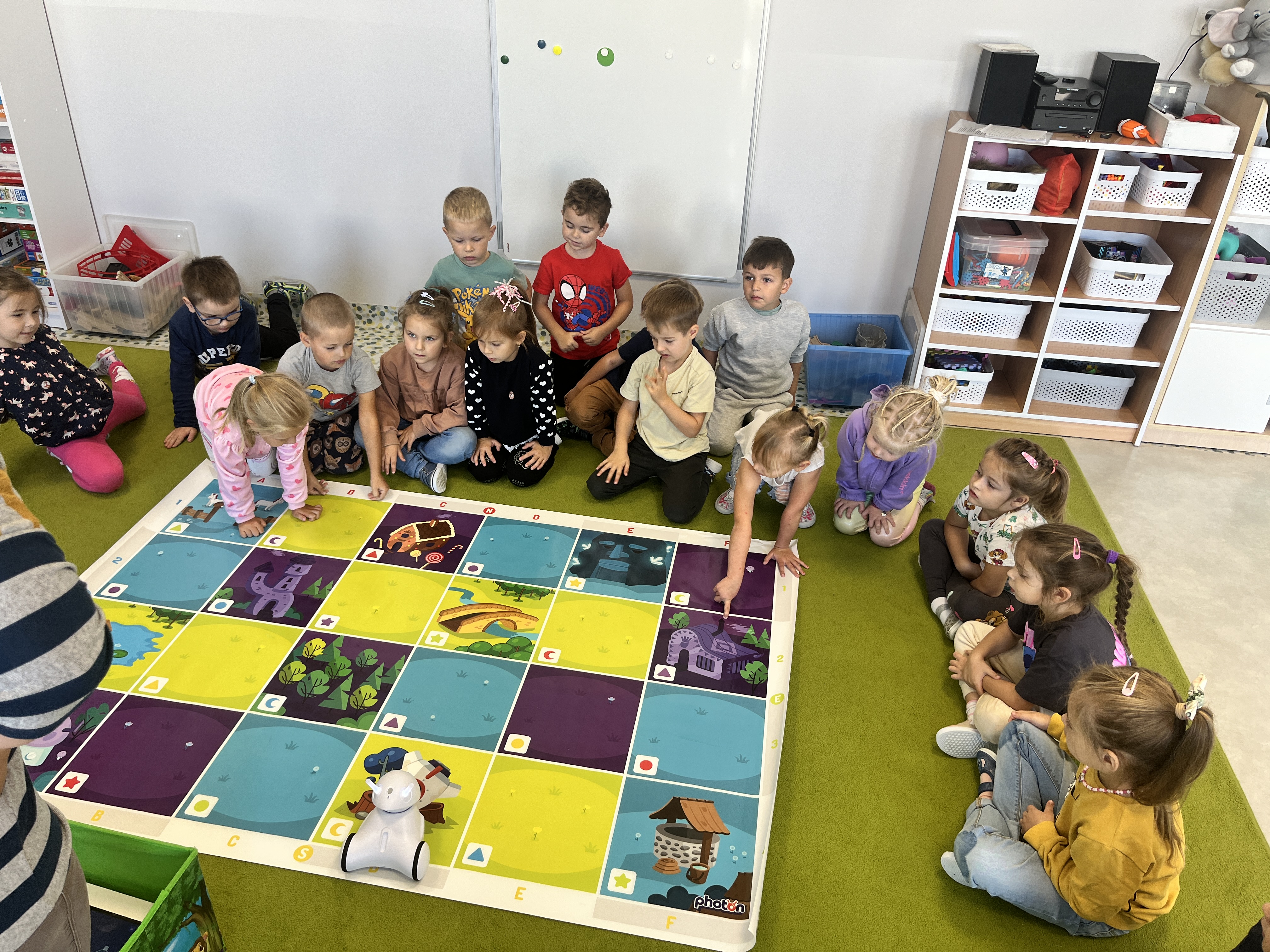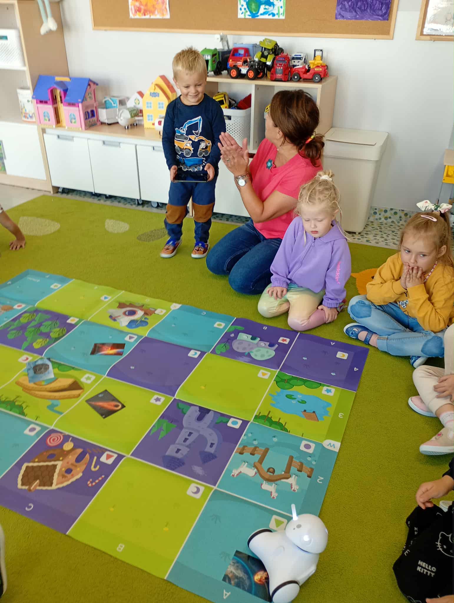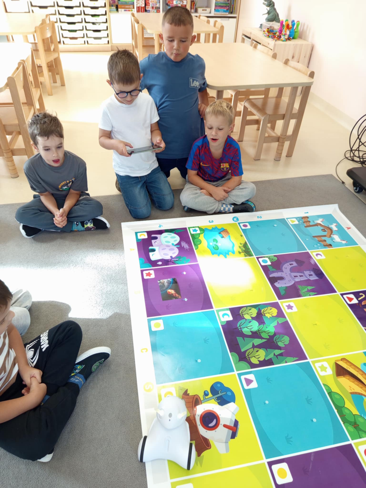 Dnia 16 i 17.09.2025 w naszym przedszkolu odbyły się pierwsze zajęcia - kodowania na dywanie z Panią Ewą Koniarską z Centrum Biblioteki i Kultury w Gminie Jeżewo. Dzieci mogły przypomnieć sobie podstawy działania robota- Photona, jak nim sterować w prosty i zabawny sposób. Każde dziecko miało możliwość prowadzenia urządzenia, według wskazówek Pani Ewy. Wspólna zabawa pozwoliła dzieciom rozwijać kreatywność oraz logiczne myślenie, zajęcia dostarczyły dzieciom wiele radości. Na koniec Pani Ewa rozdała dzieciom kolorowanki robota. Dzieci z niecierpliwością czekają na kolejne zajęcia.