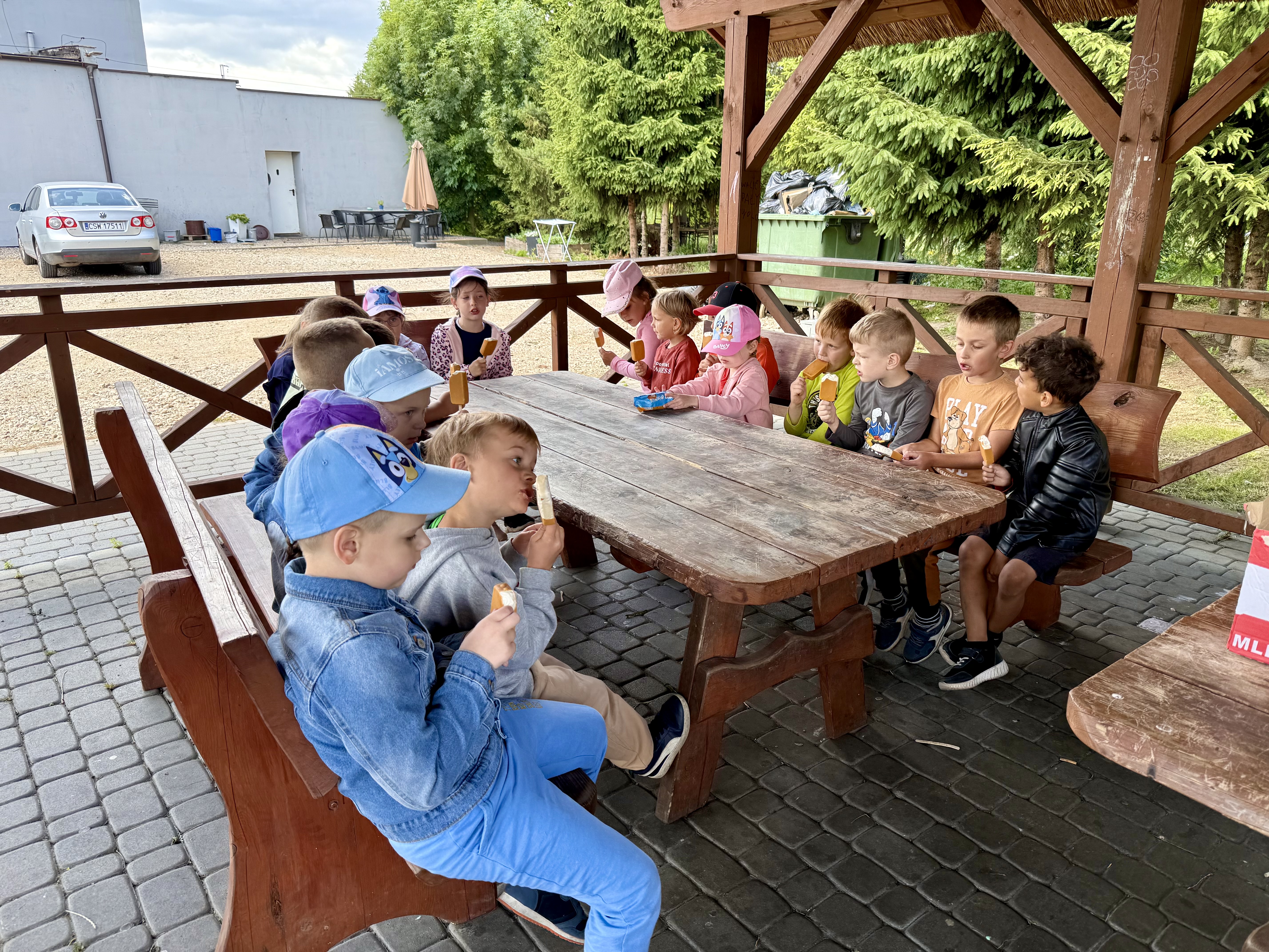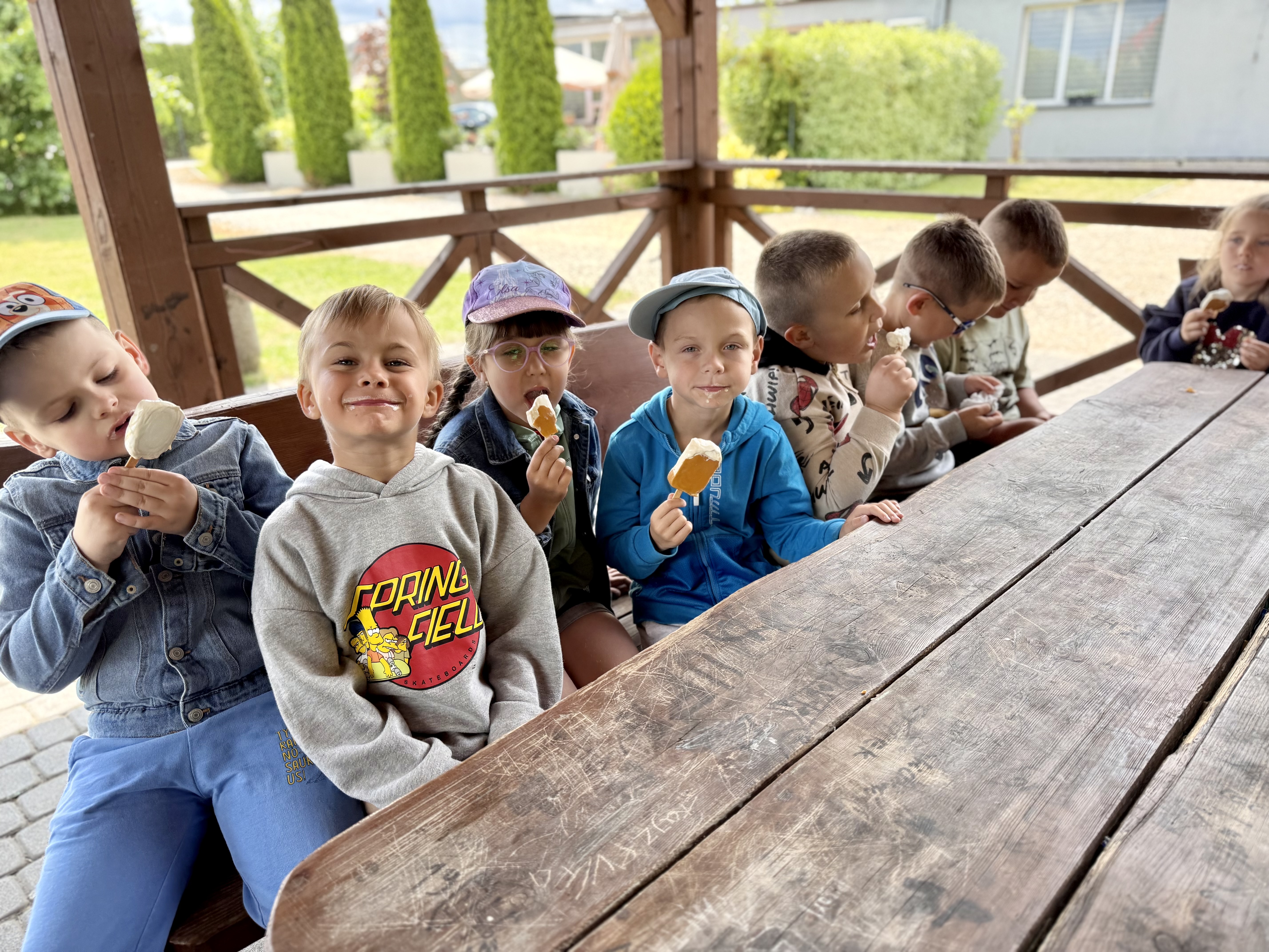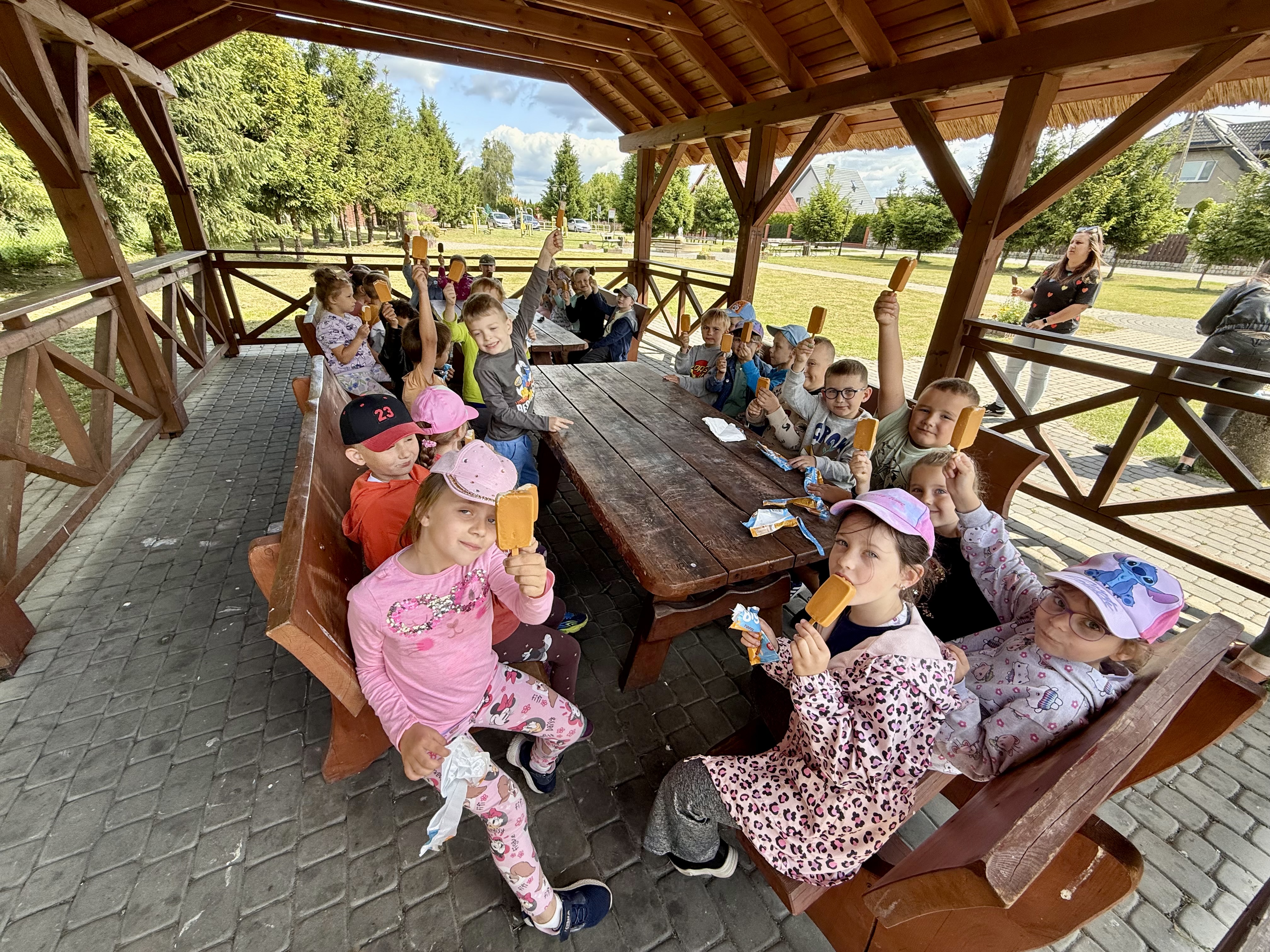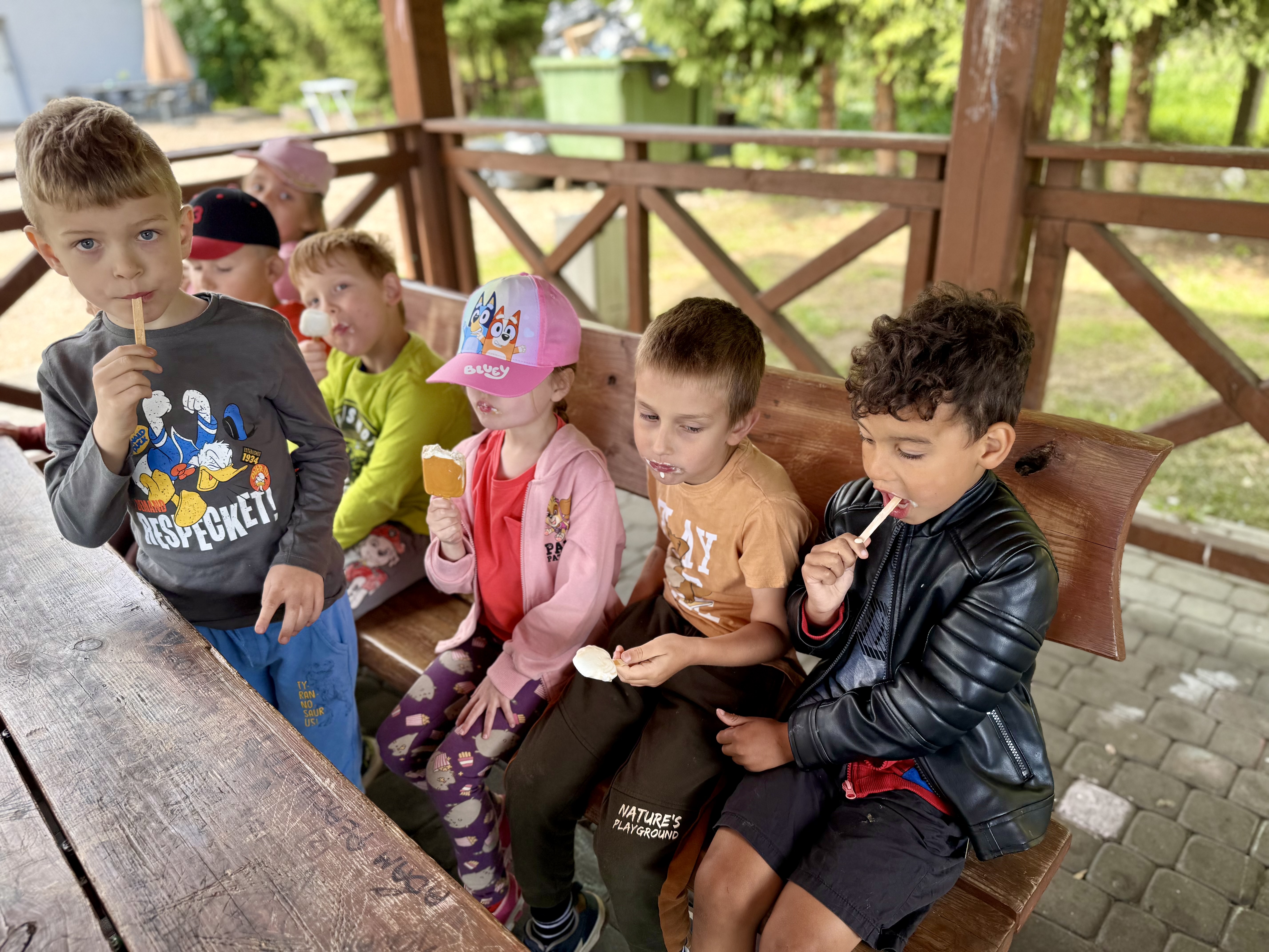 Dnia 24 czerwca 2025 r. dzieci z grup „Kangury” i „Żyrafy” wybrały się na słodki, przedwakacyjny spacer! Dzieci wraz z paniami udały się do sklepu po pyszne lody. Chwilę później przedszkolaki zajadały się orzeźwiającym przysmakiem na świeżym powietrzu, jednocześnie ciesząc się wspólnie spędzonym czasem. To był słodki, radosny sposób na zakończenie roku przedszkolnego i rozpoczęcie letnich przygód!
