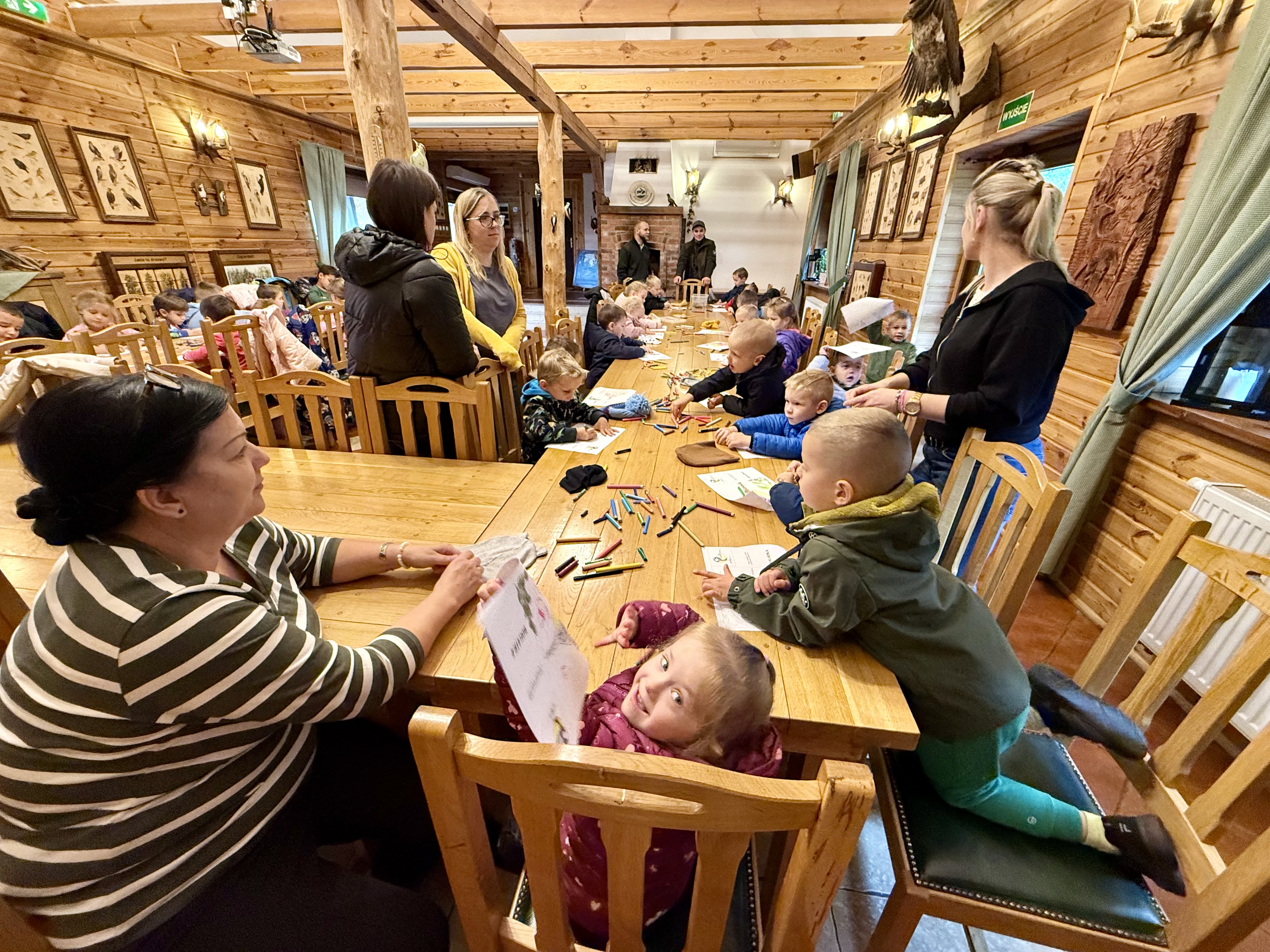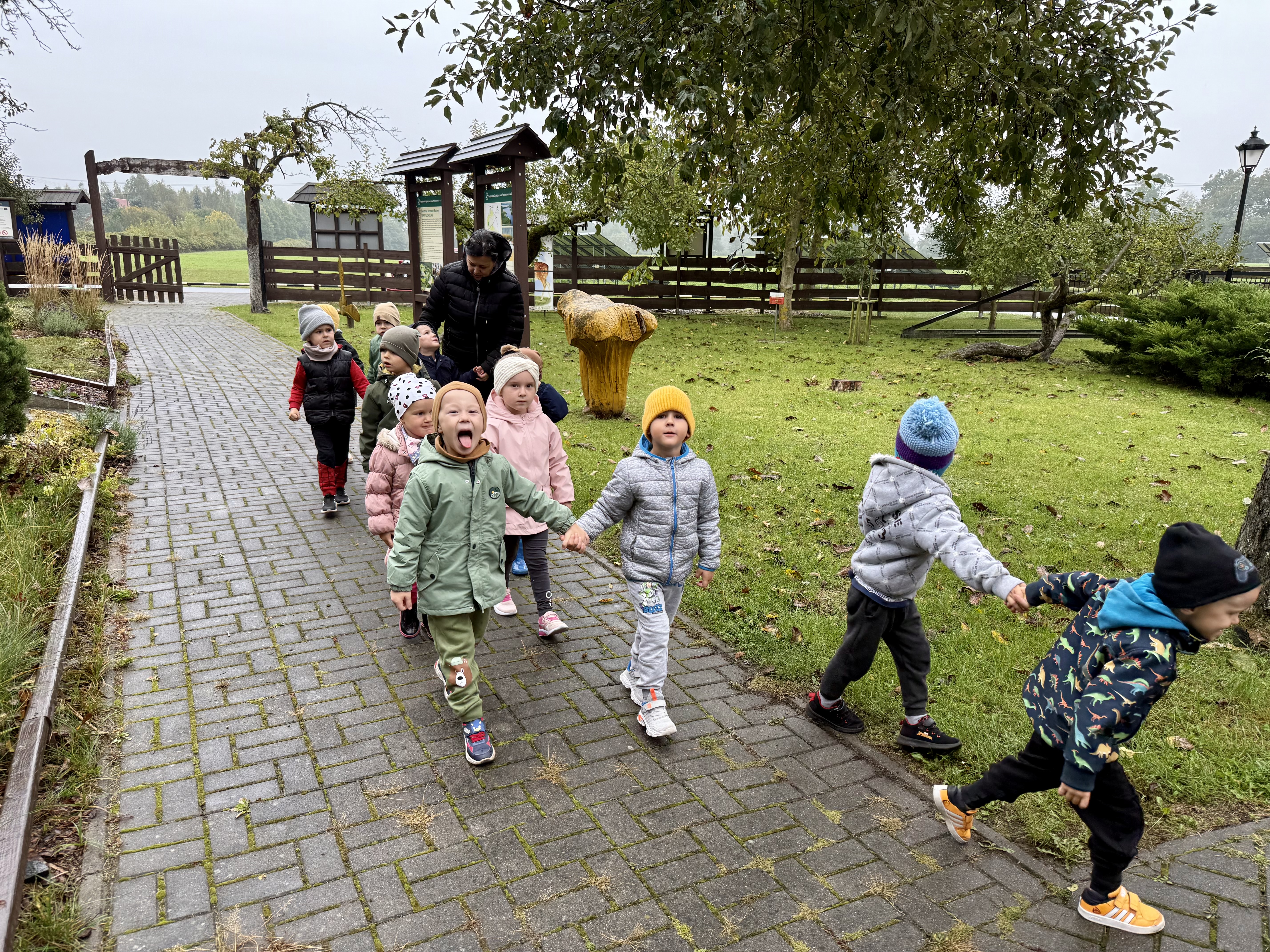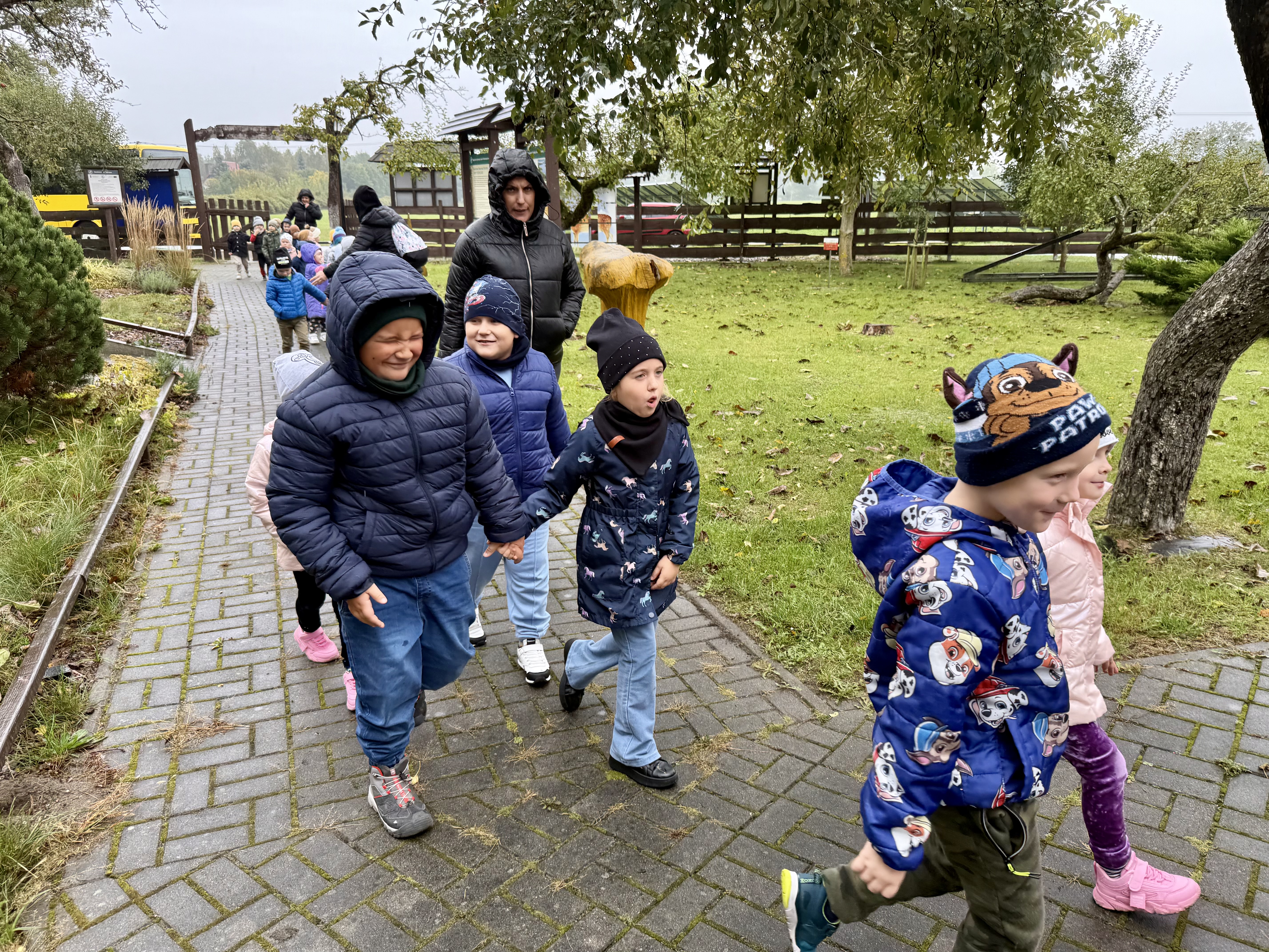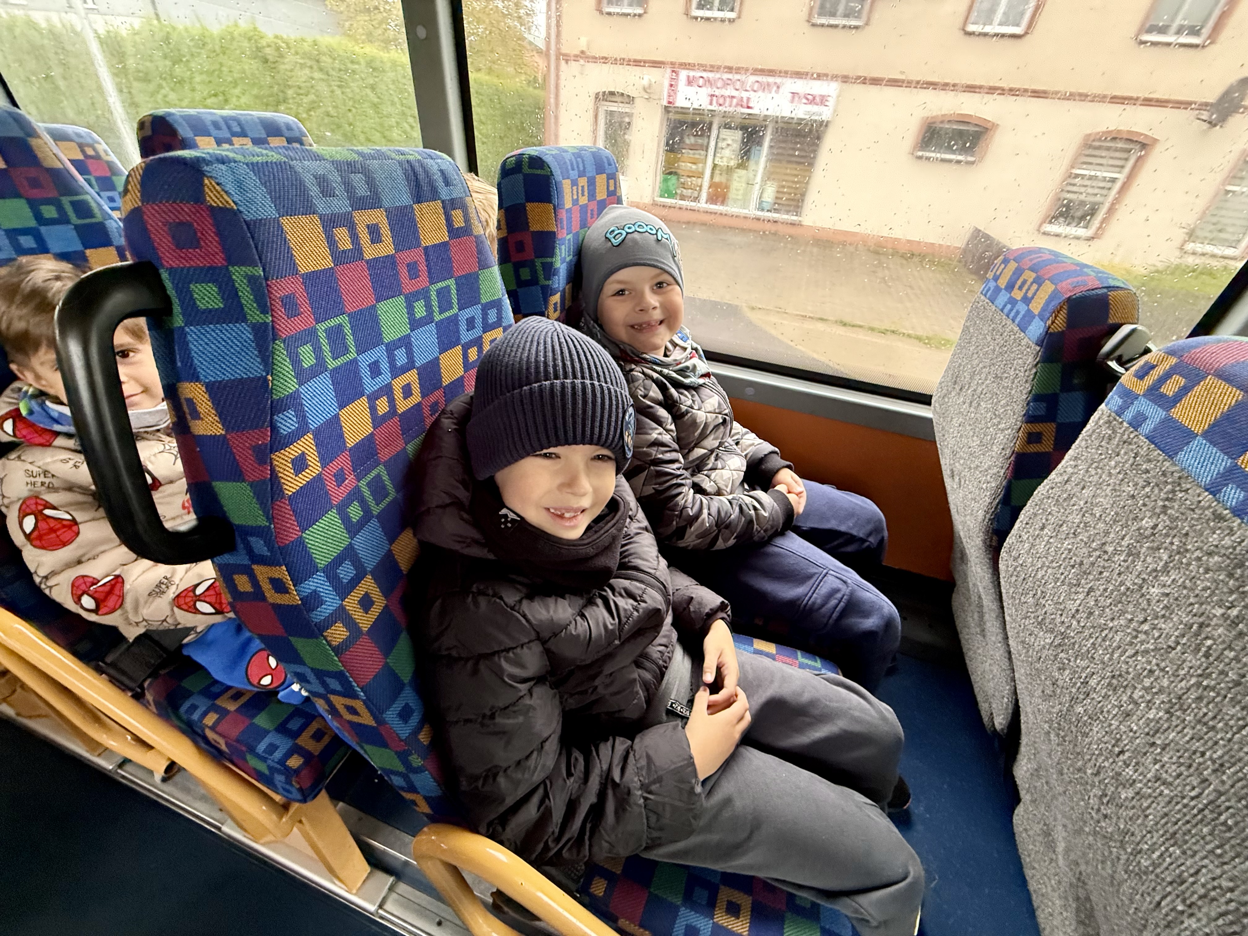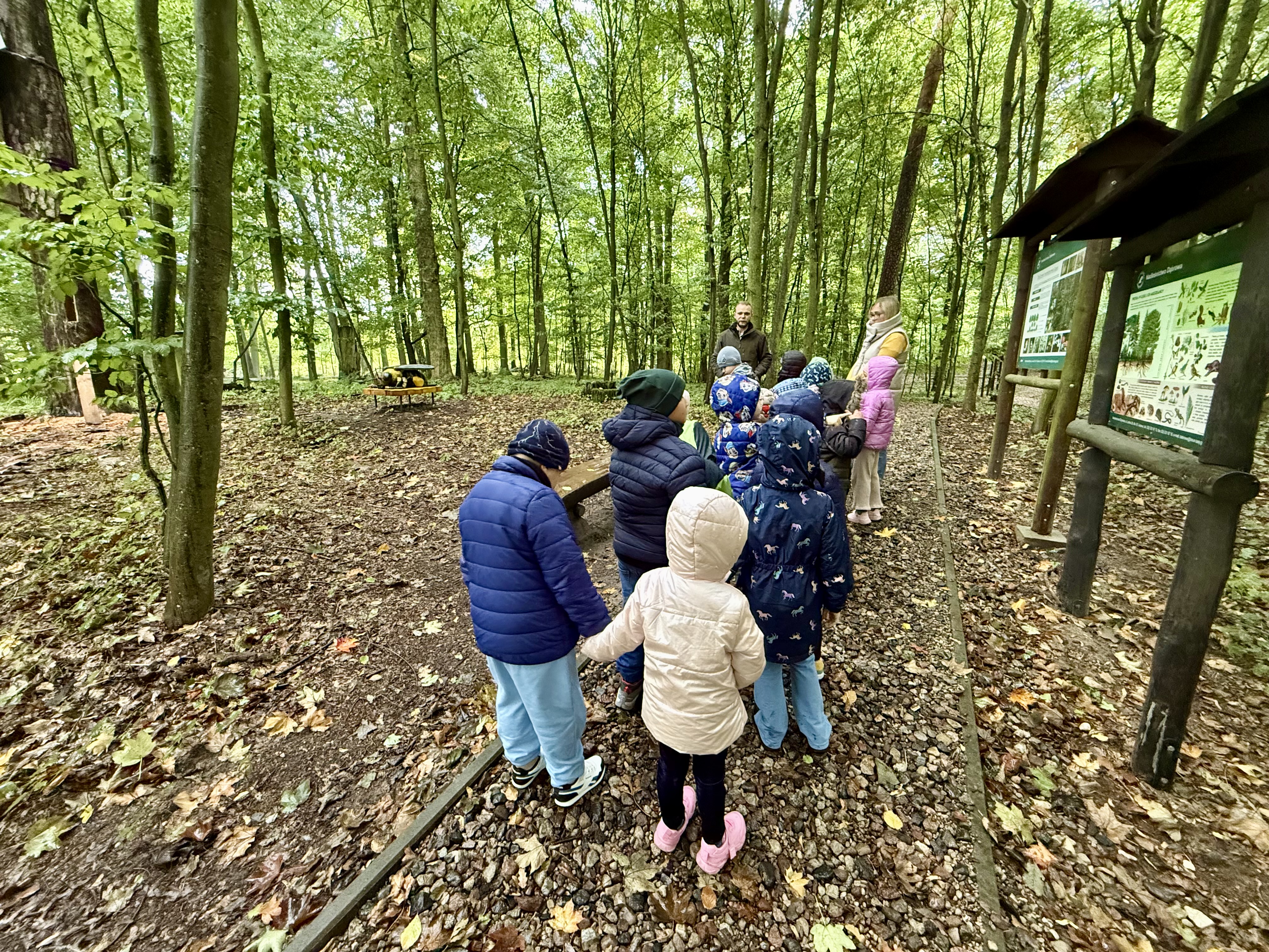 Już sam wyjazd autokarem był dla dzieci atrakcją, ale to, co czekało na miejscu, okazało się prawdziwą przygodą. Mimo deszczu udało nam się wyruszyć na leśną ścieżkę edukacyjną, gdzie dowiedzieliśmy się nieco więcej o życiu lasu, jego mieszkańcach i znaczeniu drzew w przyrodzie. Podziwialiśmy przyrodę w jesiennej, deszczowej aurze – las wyglądał wtedy zupełnie inaczej, cicho, tajemniczo i niezwykle pięknie.