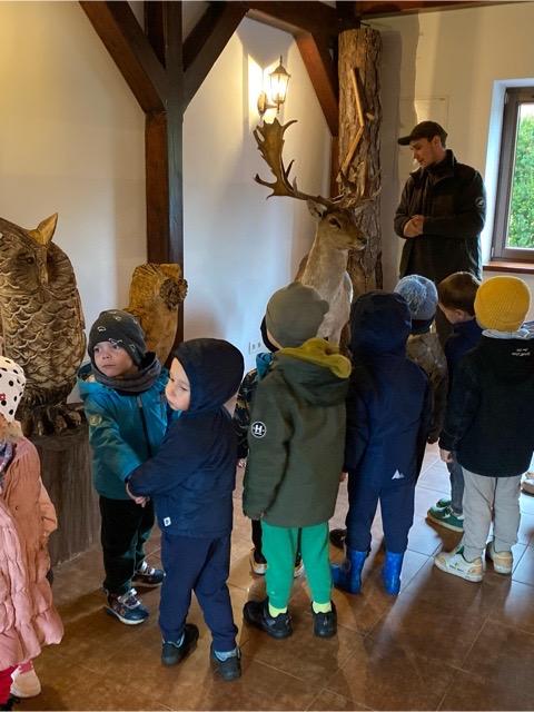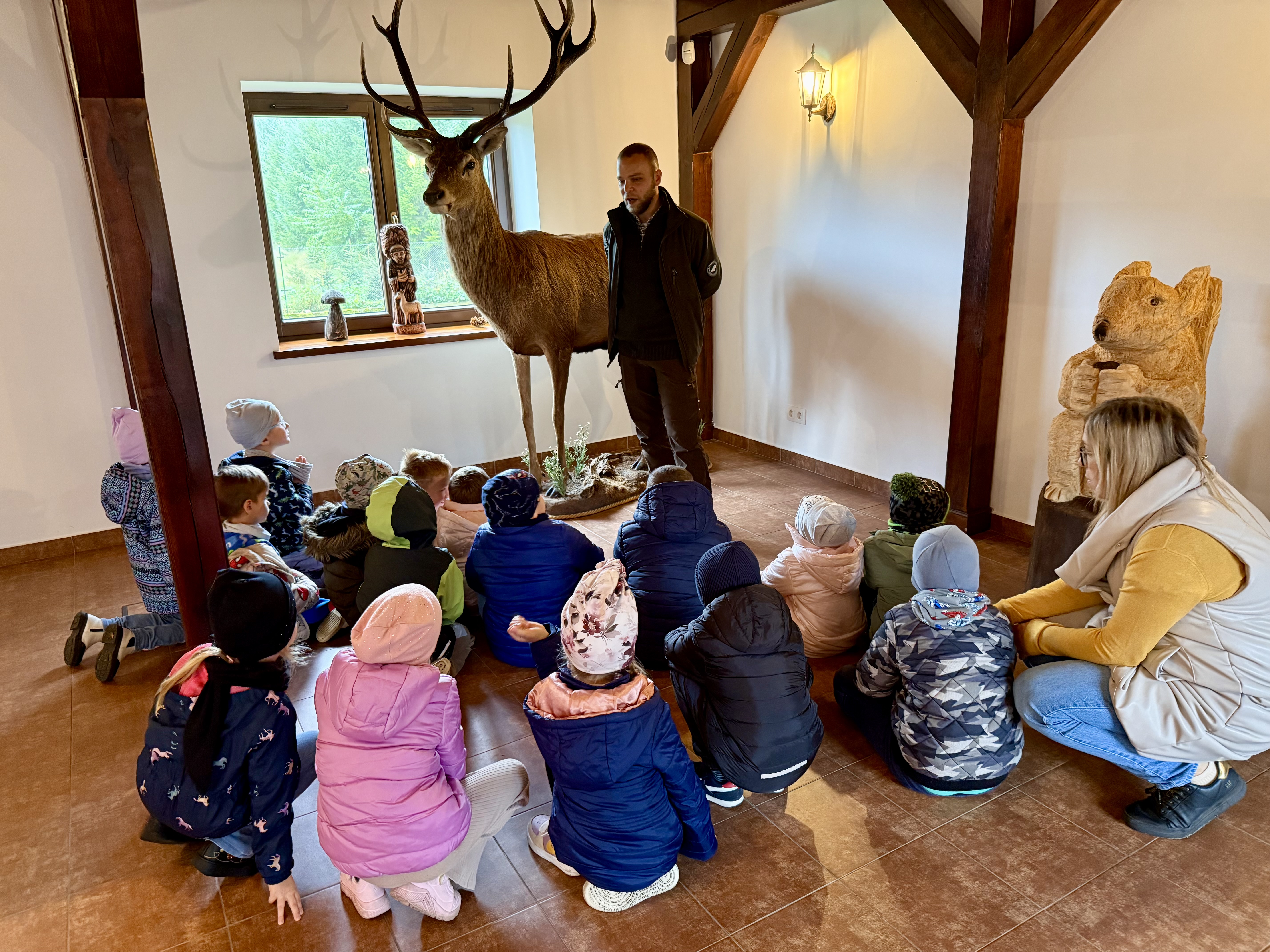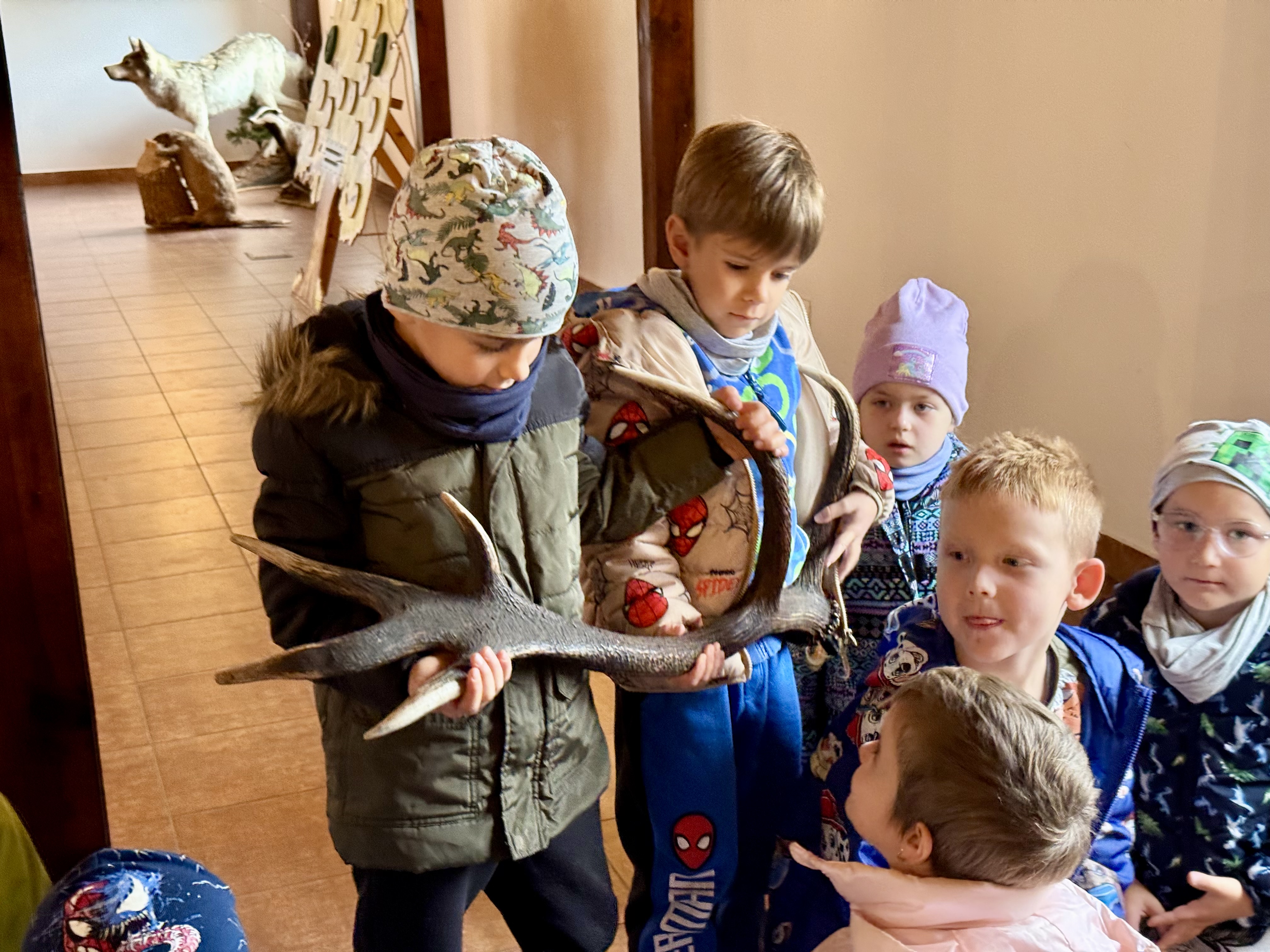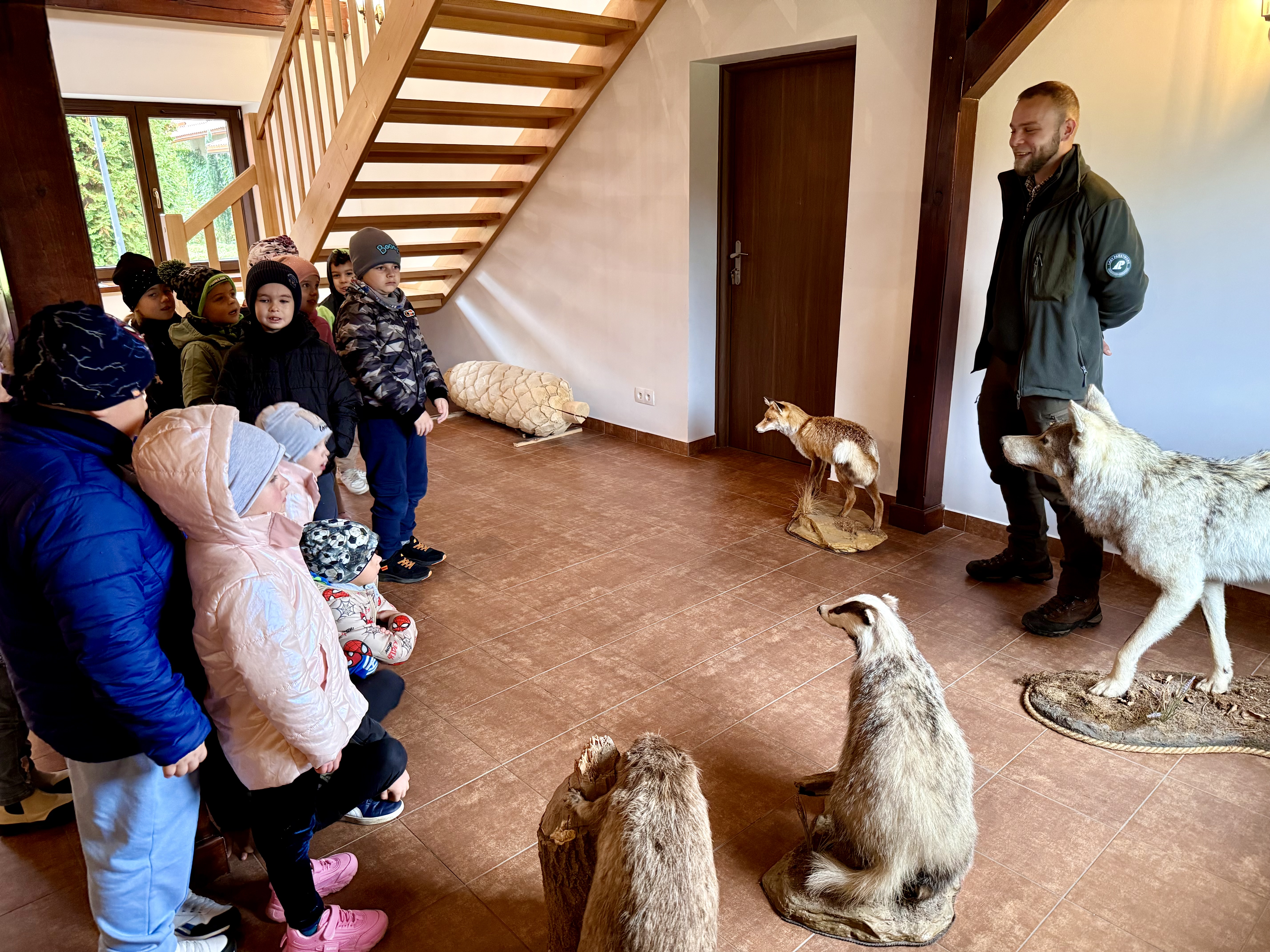 Podczas zajęć mieliśmy też okazję zobaczyć naturalne okazy zwierząt leśnych – wśród nich lisa, wilka, borsuka, bobra i jelenia. Dzięki temu przedszkolaki mogły z bliska przyjrzeć się, jak wyglądają te zwierzęta, dowiedzieć się, gdzie mieszkają i czym się żywią.