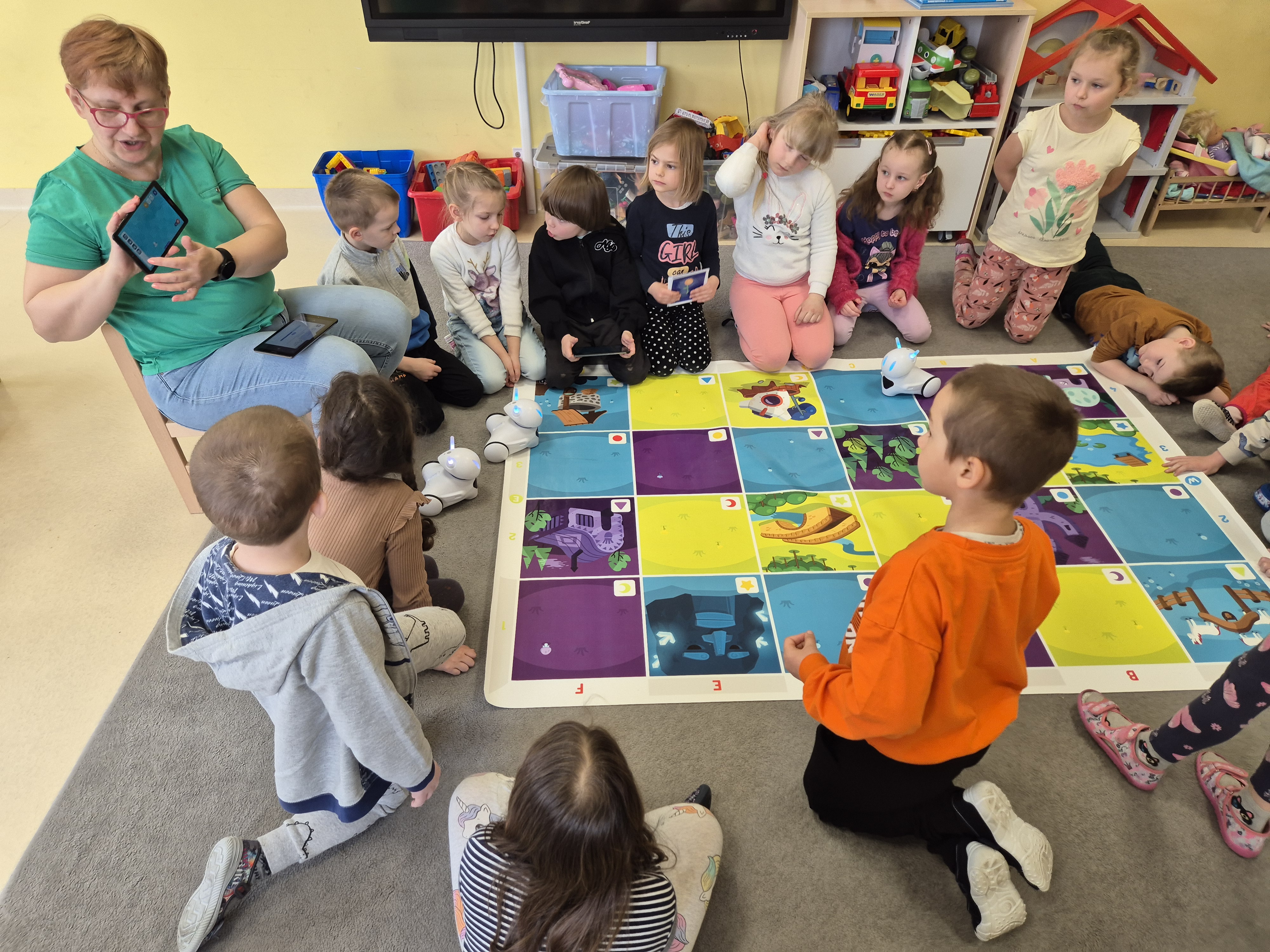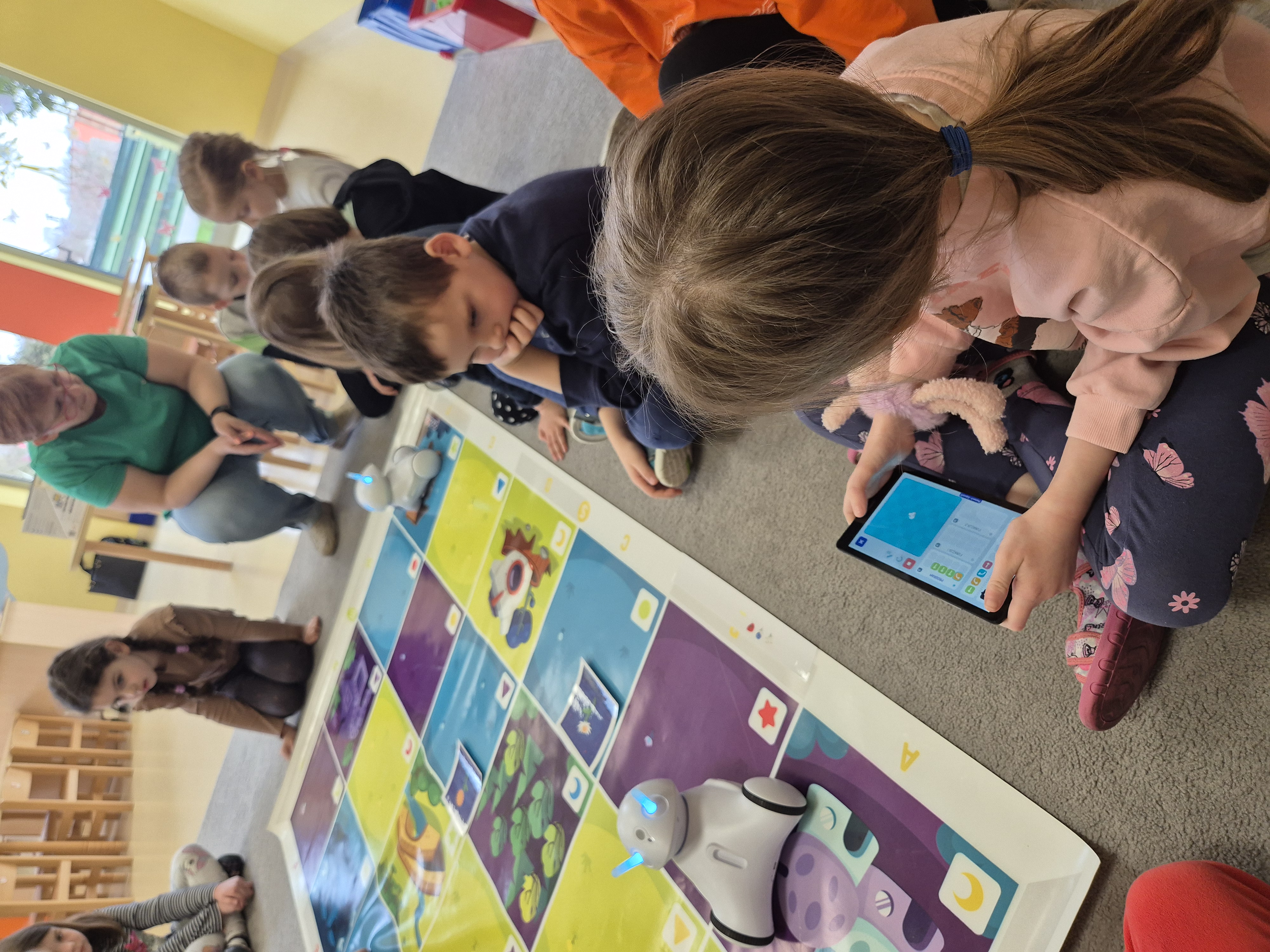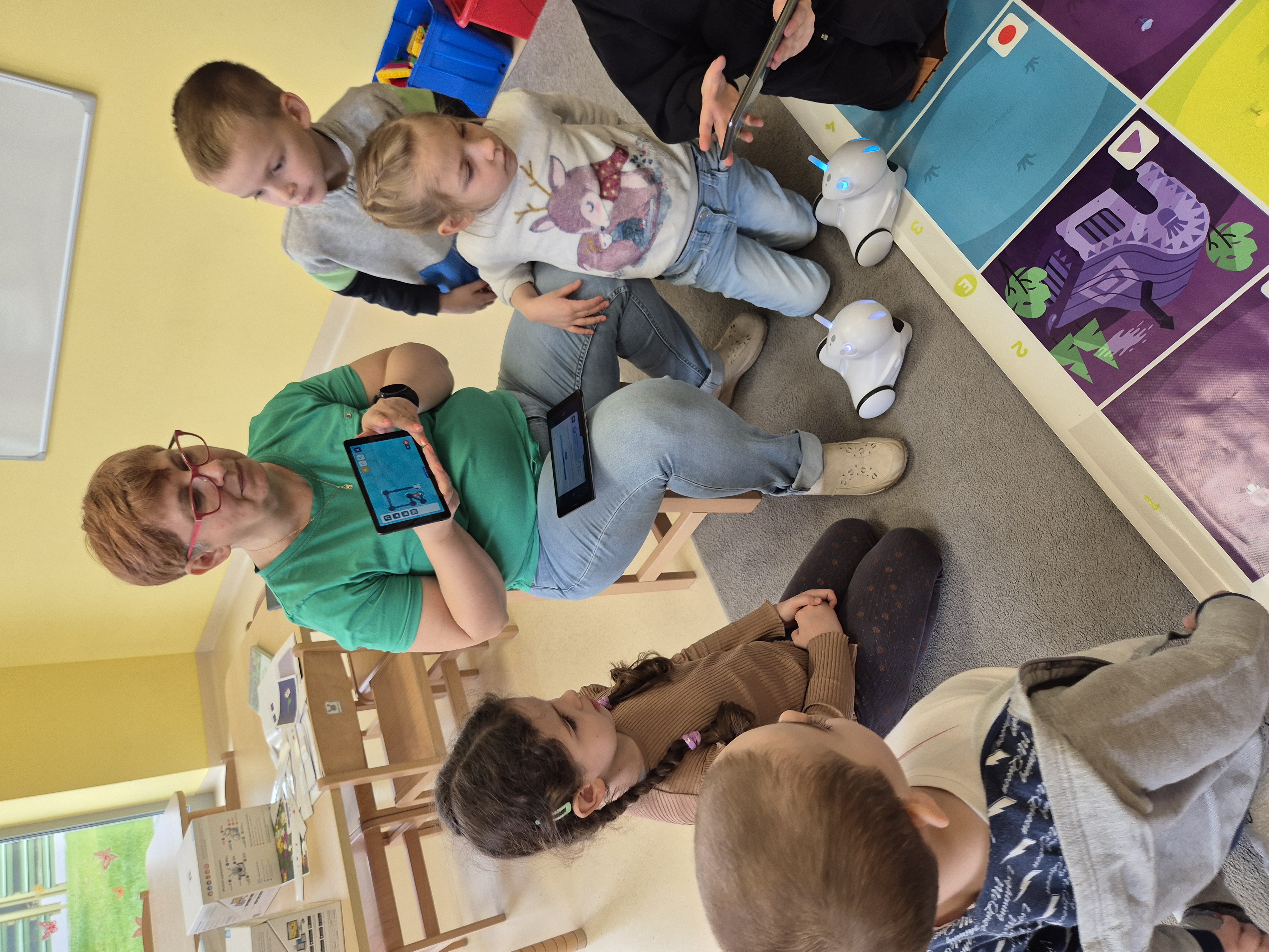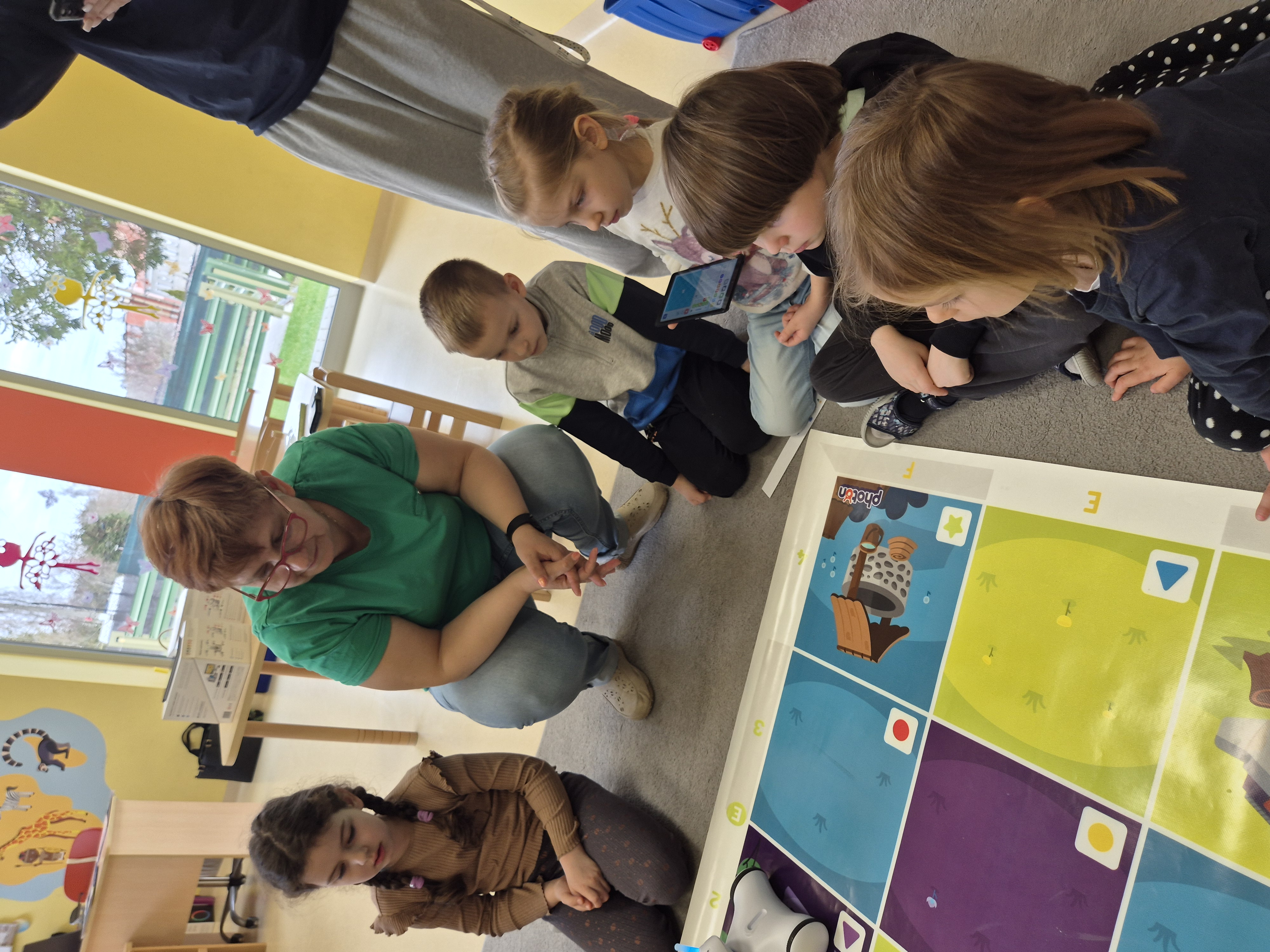 Dnia 9 kwietnia odwiedziła nas Pani Ewa Koniarska z Centrum Biblioteki i Kultury w Gminie Jeżewo. W grupie "Żyrafy" odbyły się wyjątkowe zajęcia z robotami - Photonami. Spotkanie rozpoczęło się od krótkiej pogadanki o kwiatach. Zadaniem dzieci było zaprogramowanie robota tak, aby przeszedł wiosenną trasę po kwiatach i "zbierał" napotkane kwiaty. Dzieci miały okazję poznać podstawy programowania, ucząc się w prosty i zabawny sposób, jak sterować robotami. Wspólna praca sprawiła dzieciom ogromną radość i pozwoliła rozwijać kreatywność oraz logiczne myślenie. Na zakończenie zajęć dzieci wręczyły Pani Ewie podziękowania, a w nagrodę otrzymały kolorowanki z wizerunkiem robota. Były to zajęcia pełne nauki i radości, które na długo zostaną w pamięci naszych przedszkolaków!
