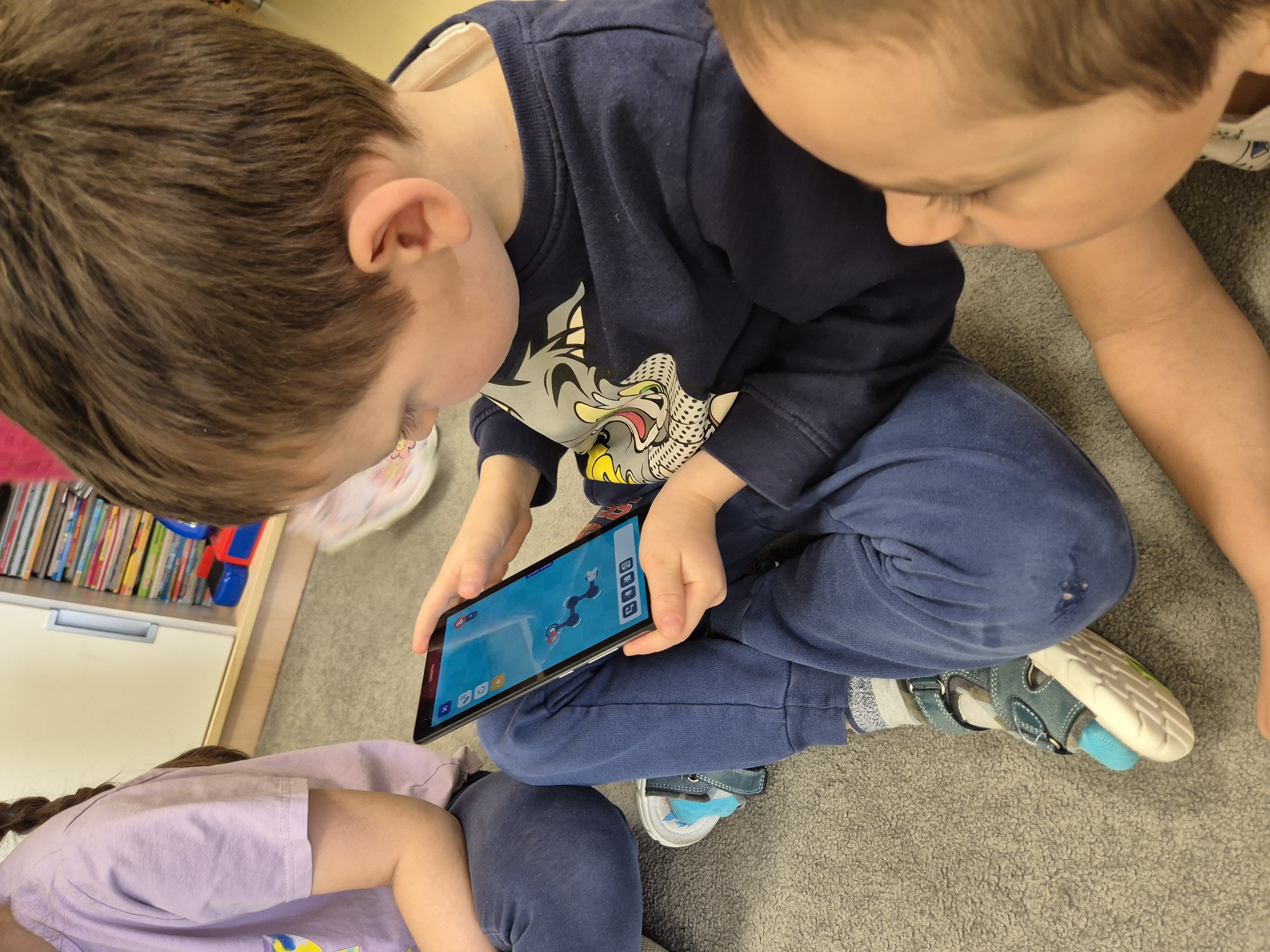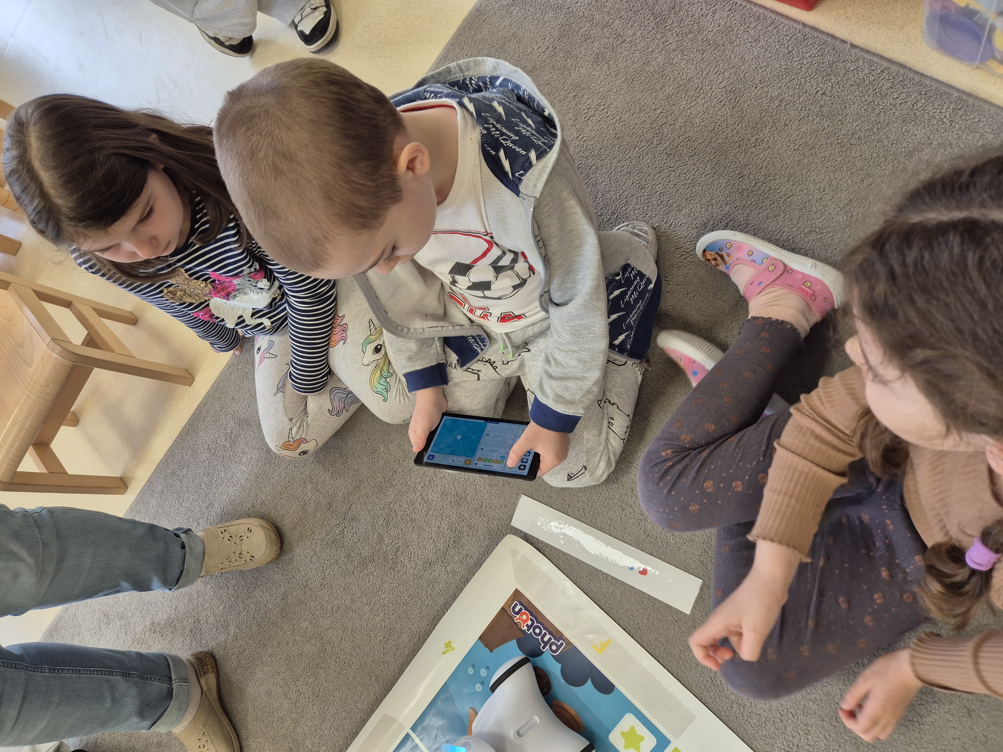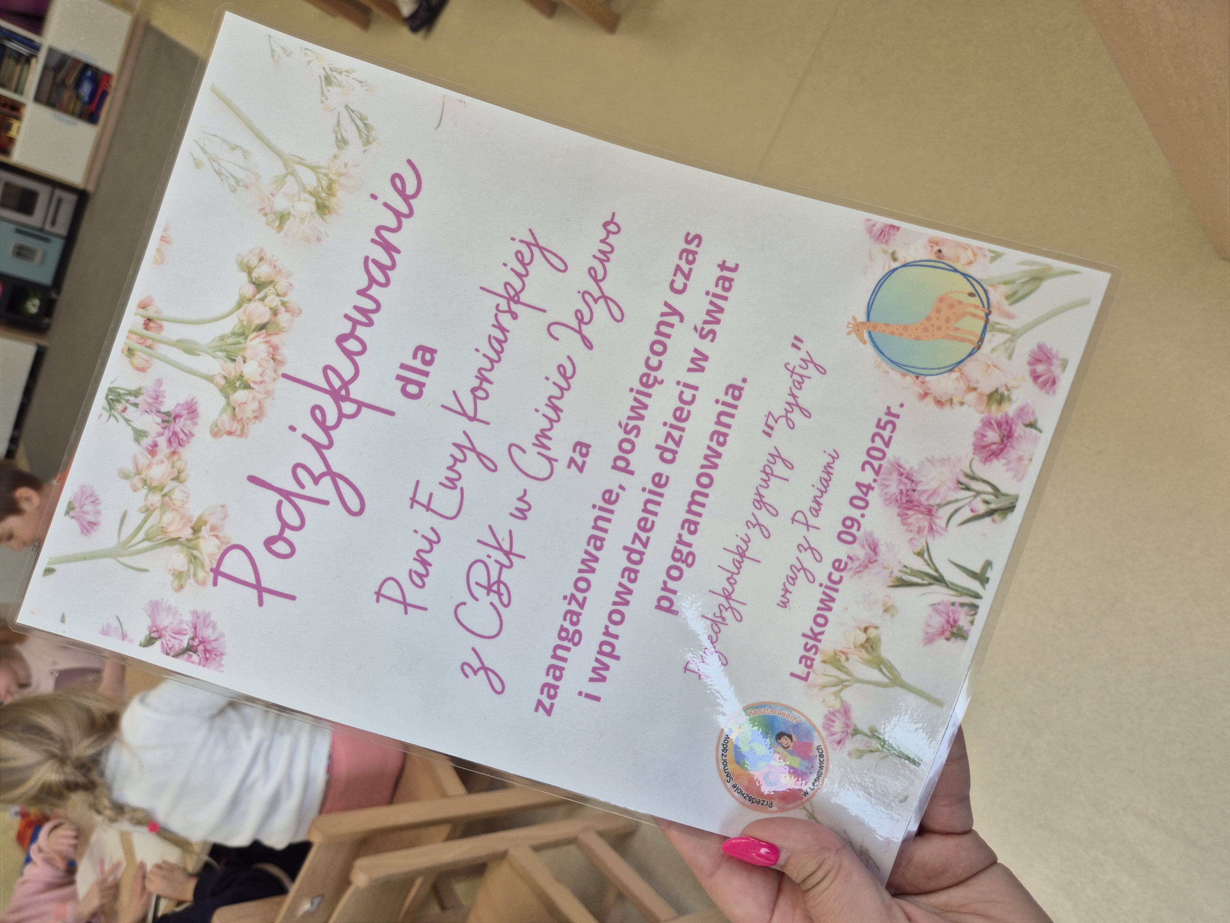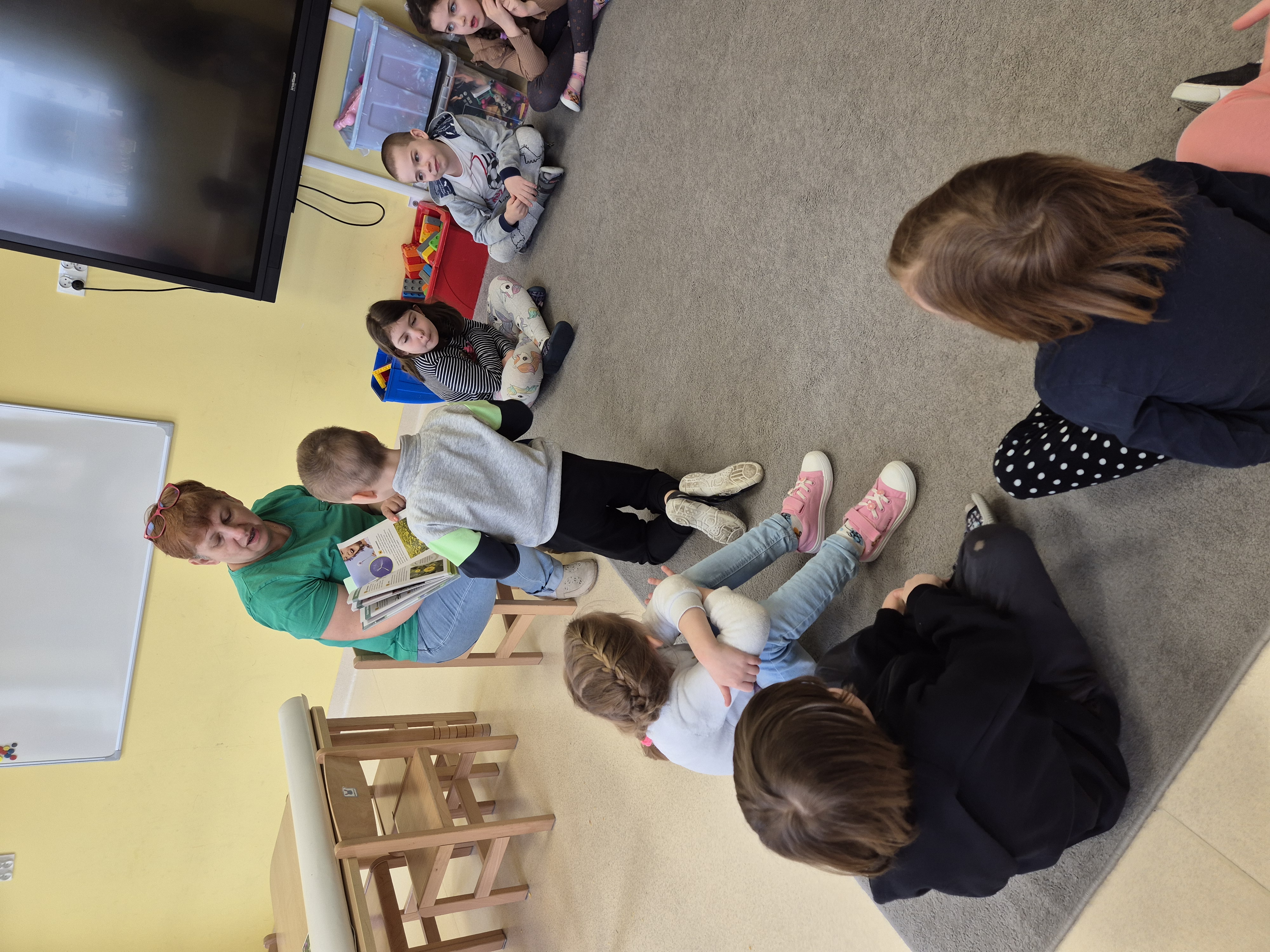 Dnia 9 kwietnia odwiedziła nas Pani Ewa Koniarska z Centrum Biblioteki i Kultury w Gminie Jeżewo. W grupie "Żyrafy" odbyły się wyjątkowe zajęcia z robotami - Photonami. Spotkanie rozpoczęło się od krótkiej pogadanki o kwiatach. Zadaniem dzieci było zaprogramowanie robota tak, aby przeszedł wiosenną trasę po kwiatach i "zbierał" napotkane kwiaty. Dzieci miały okazję poznać podstawy programowania, ucząc się w prosty i zabawny sposób, jak sterować robotami. Wspólna praca sprawiła dzieciom ogromną radość i pozwoliła rozwijać kreatywność oraz logiczne myślenie. Na zakończenie zajęć dzieci wręczyły Pani Ewie podziękowania, a w nagrodę otrzymały kolorowanki z wizerunkiem robota. Były to zajęcia pełne nauki i radości, które na długo zostaną w pamięci naszych przedszkolaków!